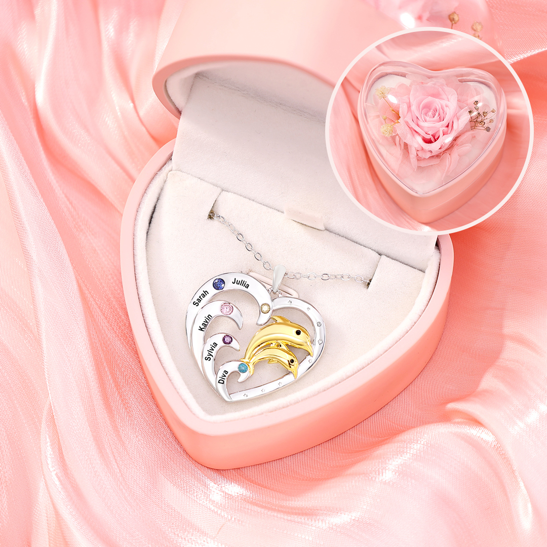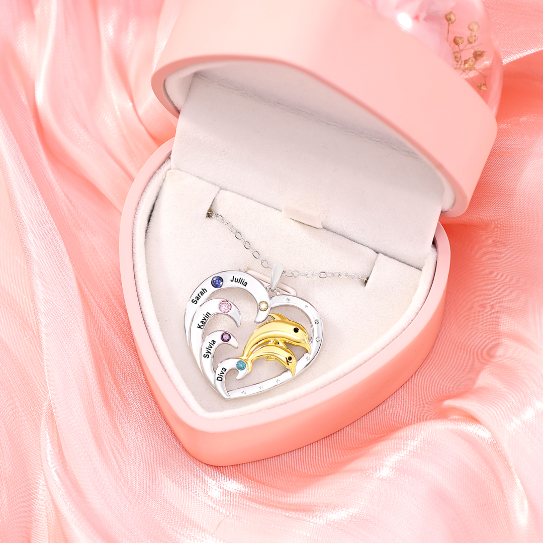 Collana cuore con delfino d'oro personalizzata con 5 nomi e 5 pietre di nascita personalizzati