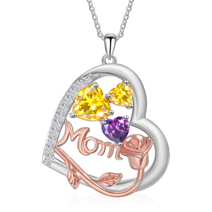 Collana cuore e mamma rosa con 3 cuore pietre di nascita e 3 nomi personalizzabili per donna