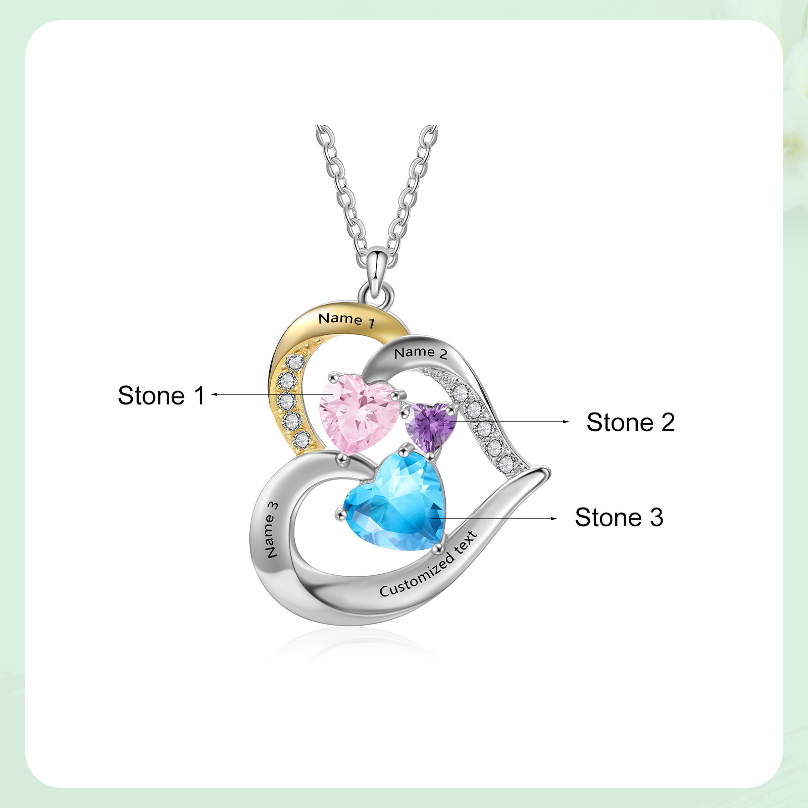 Collana cuore con 3 cuore pietre di nascita e 3 nomi e 1 testo personalizzabili per donna