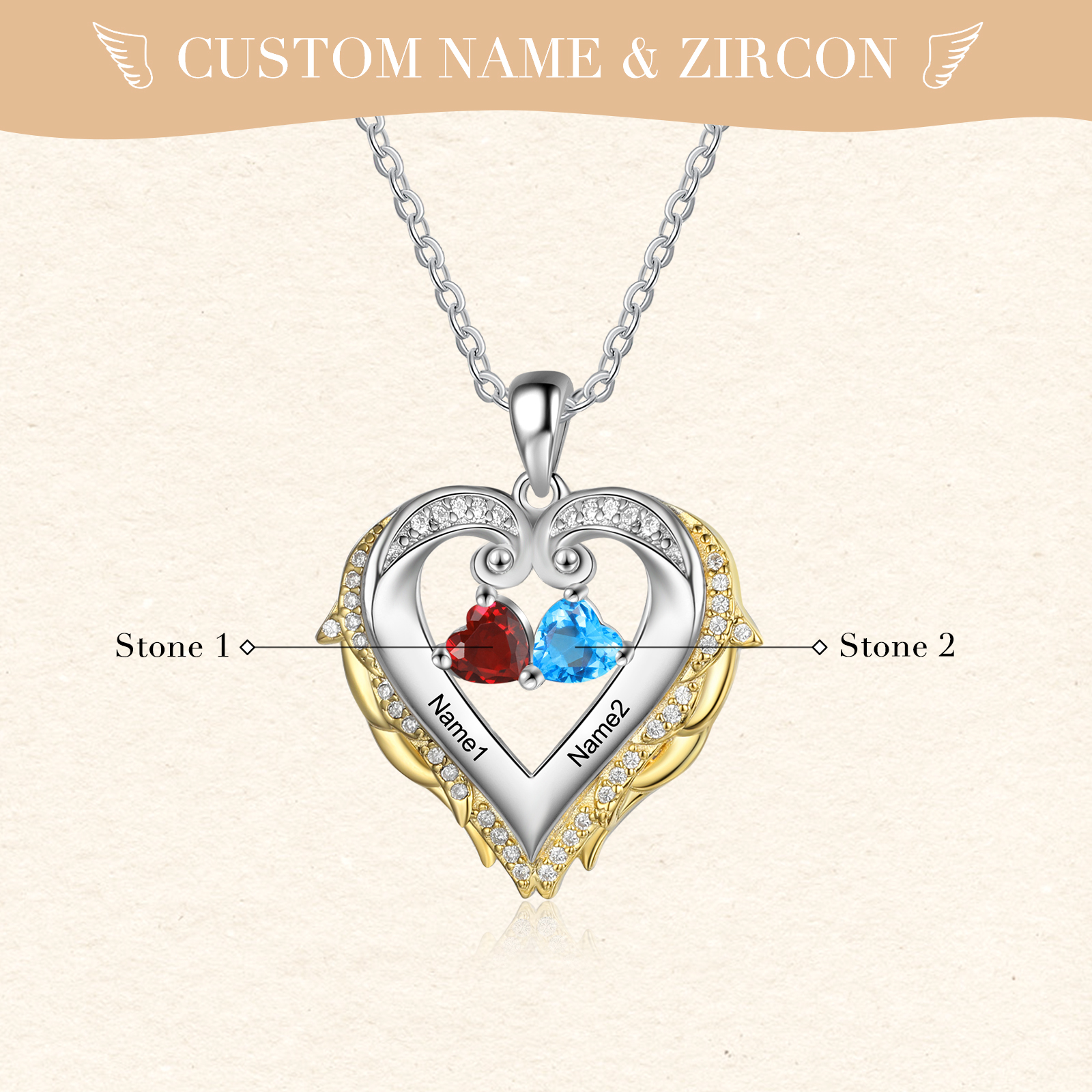Collana d'argento Cuore con ali con 2 pietre di nascita e 2 nomi regalo per mamma