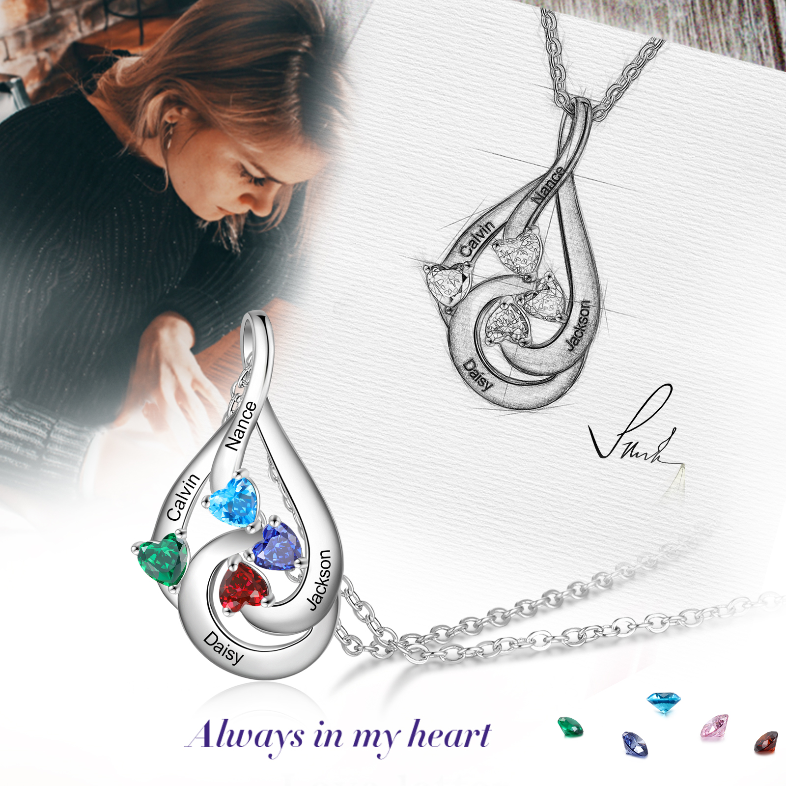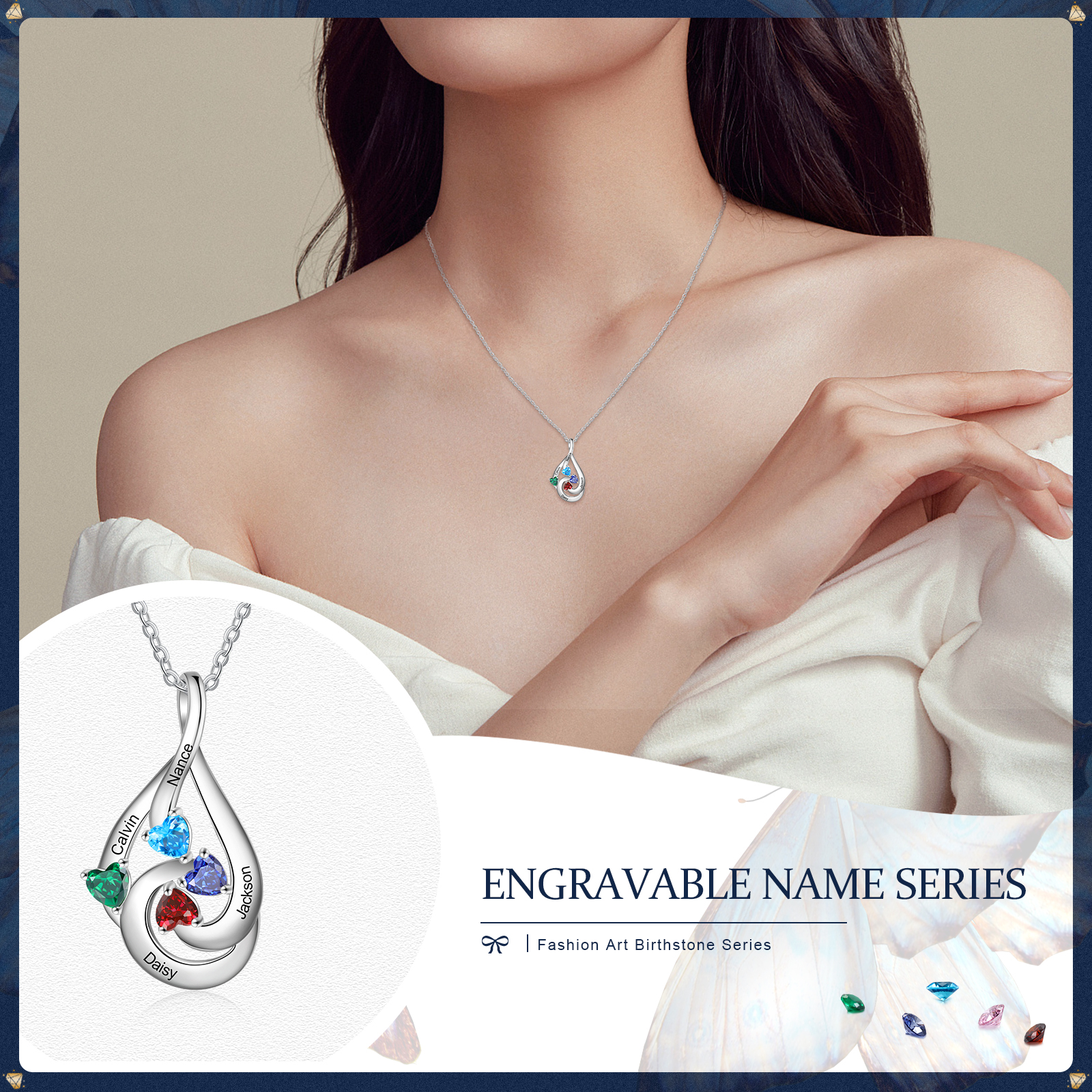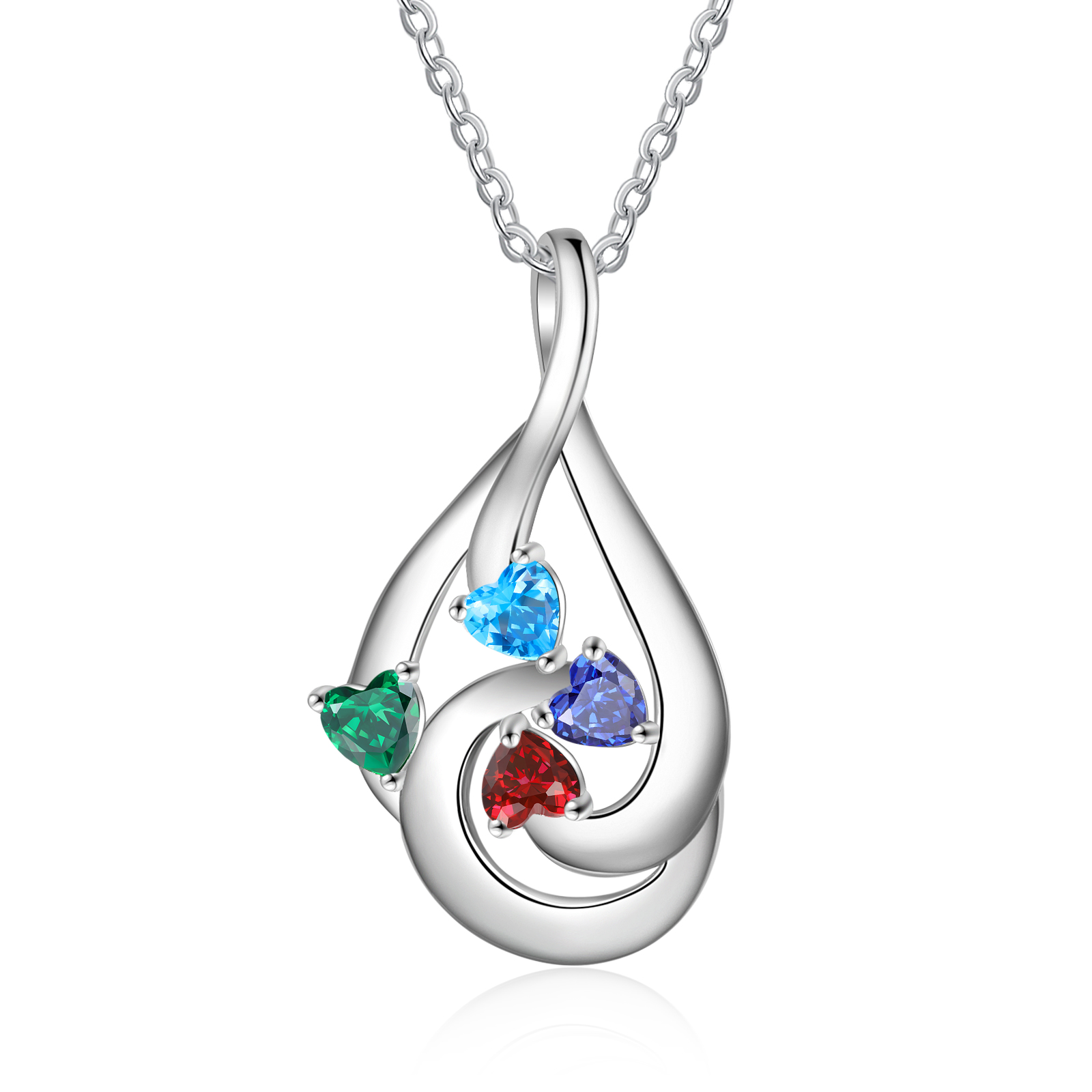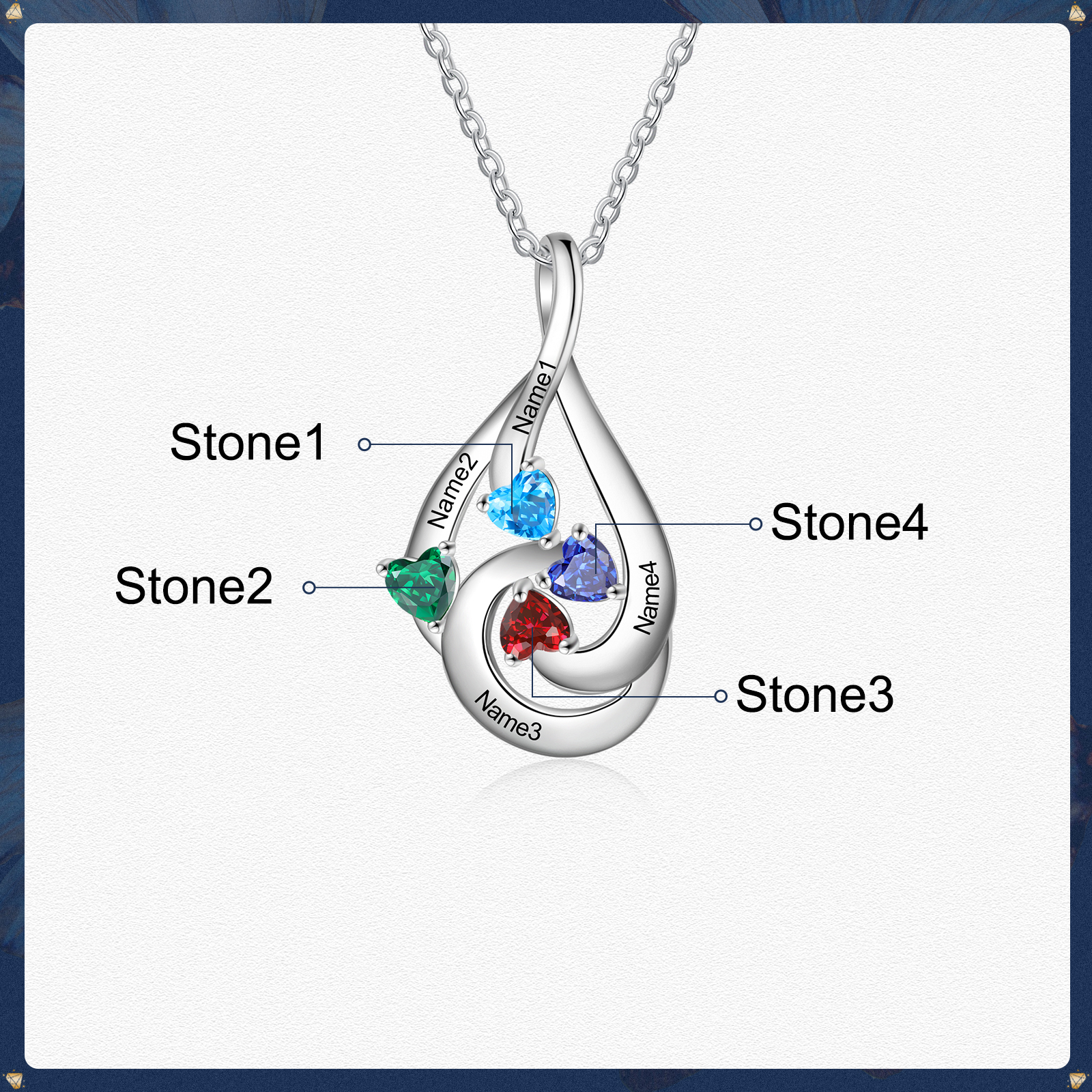 Collana goccia d'acqua con 4 pietre di nascita e 4 nomi regalo per donna