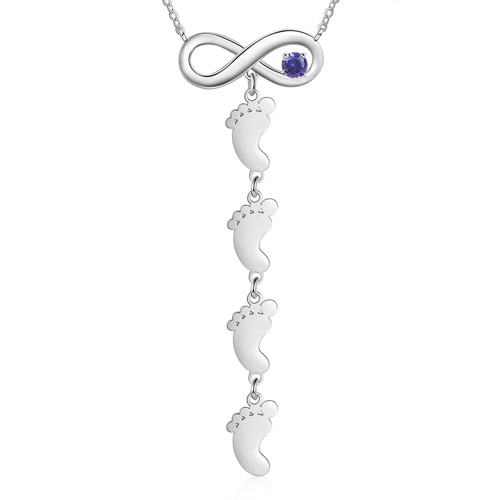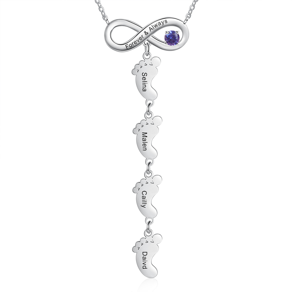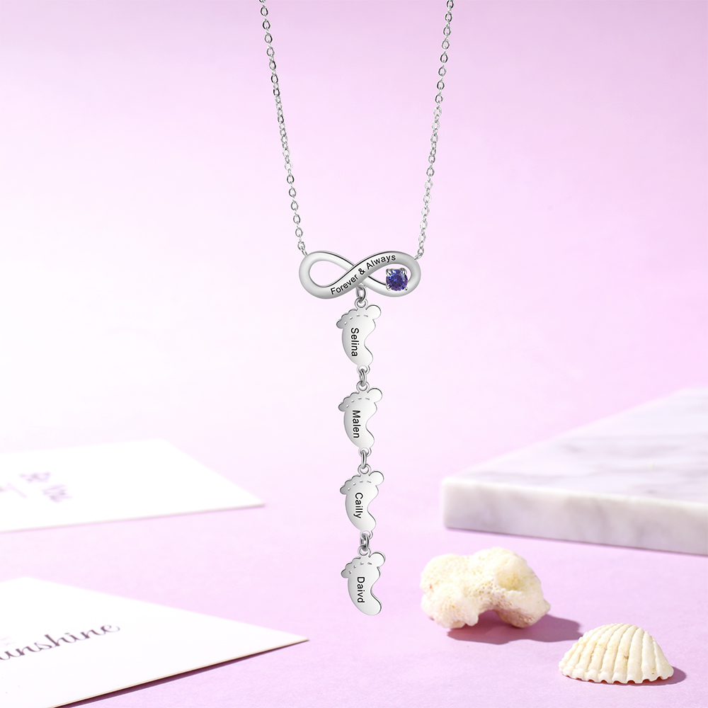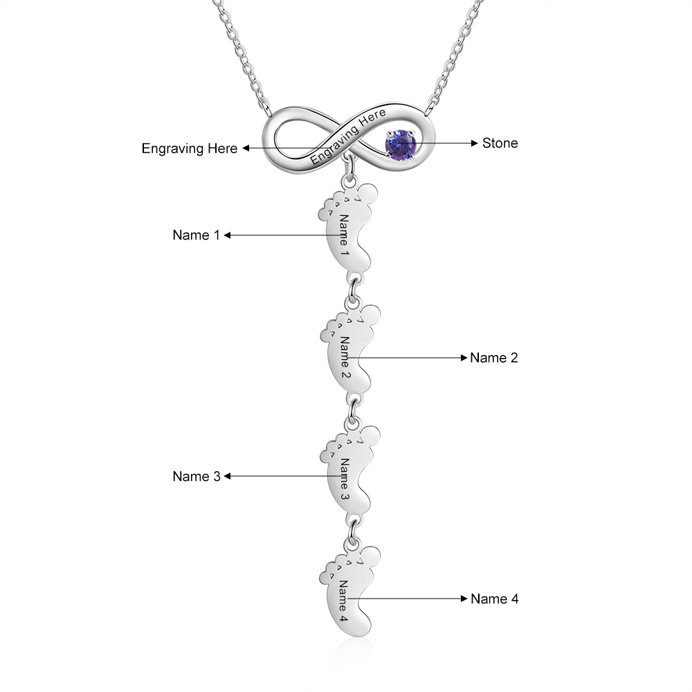 Collana infinito con un ciondolo di piede 4 nomi e 1 pietra e 1 testo personalizzabile