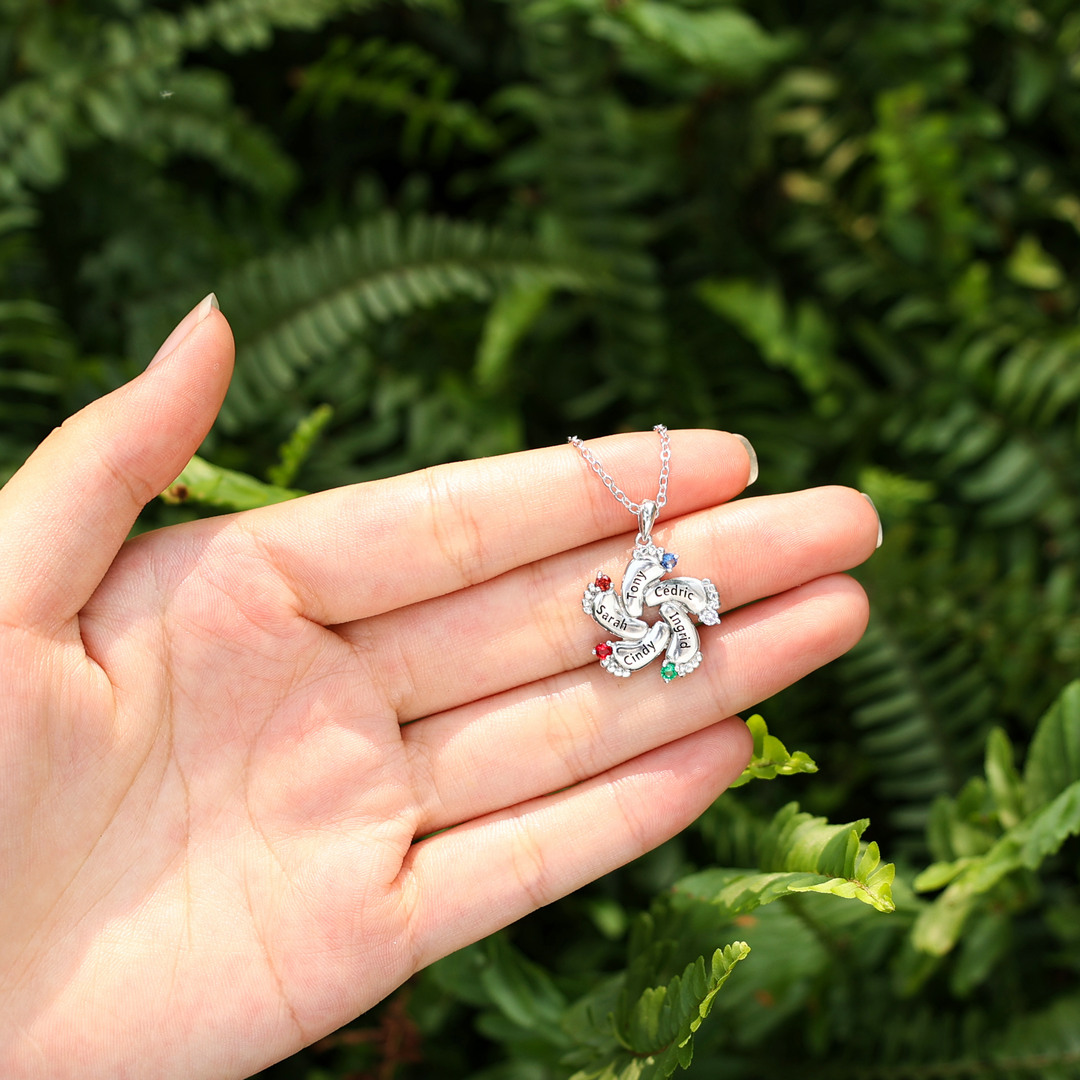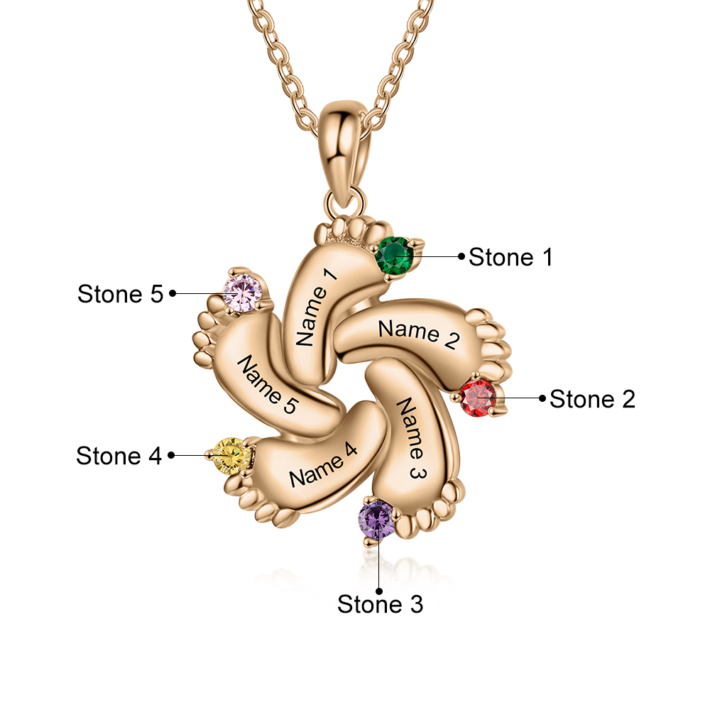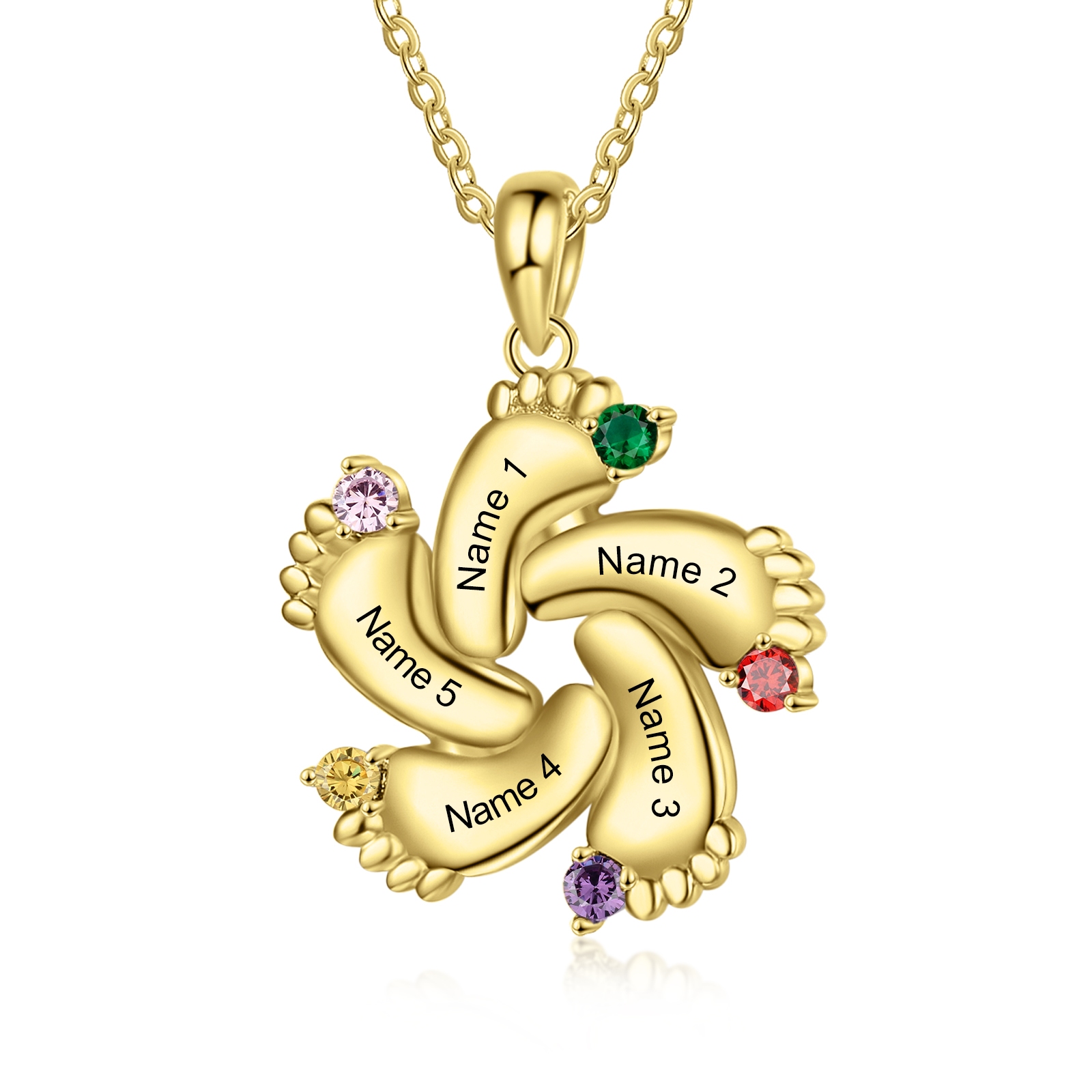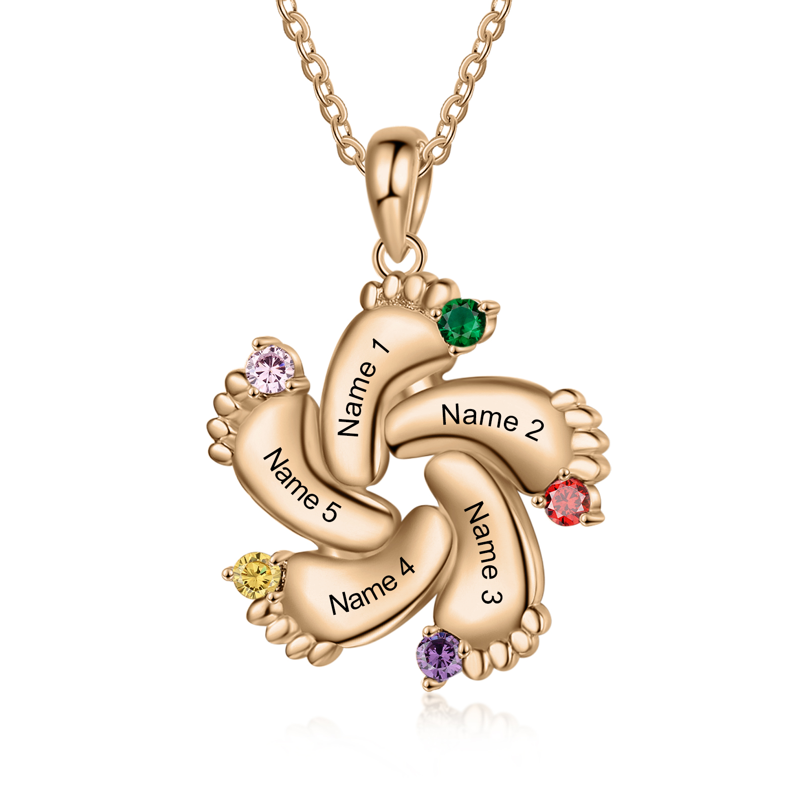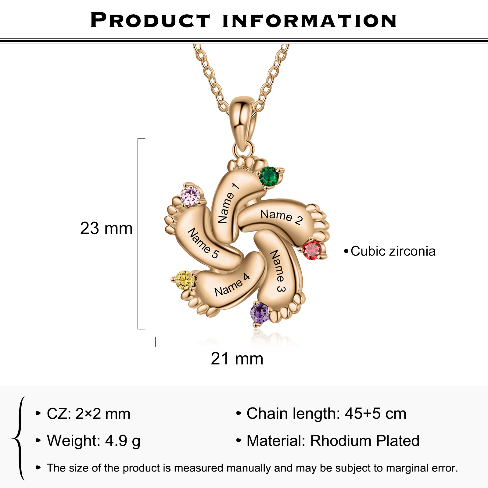 Collana piede di bambino con 5 nomi e 5 pietre di nascita personalizzati con scatola rosa