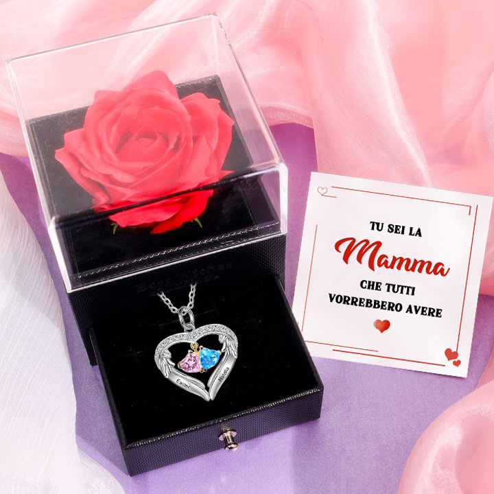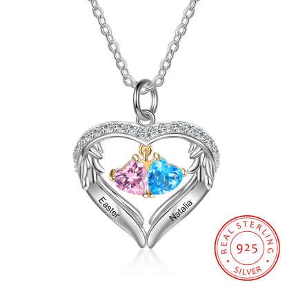 Collana Cuore con ali d'Argento S925 personalizzata 2 nomi e 2 cuore pietre di nascita per donna