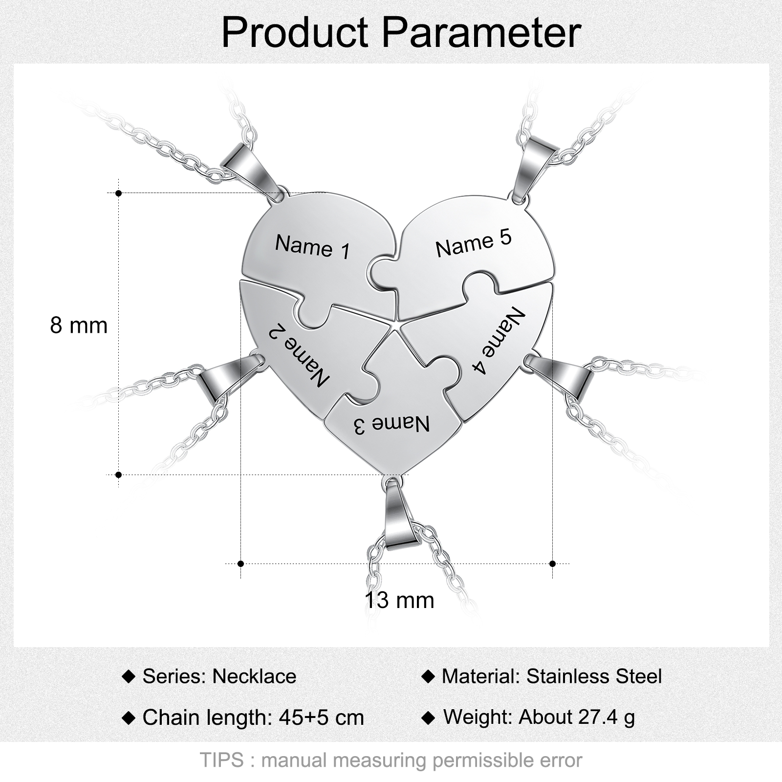 Collana a cuore personalizzata con 5 nomi e 5 puzzle per donna famiglia uomo