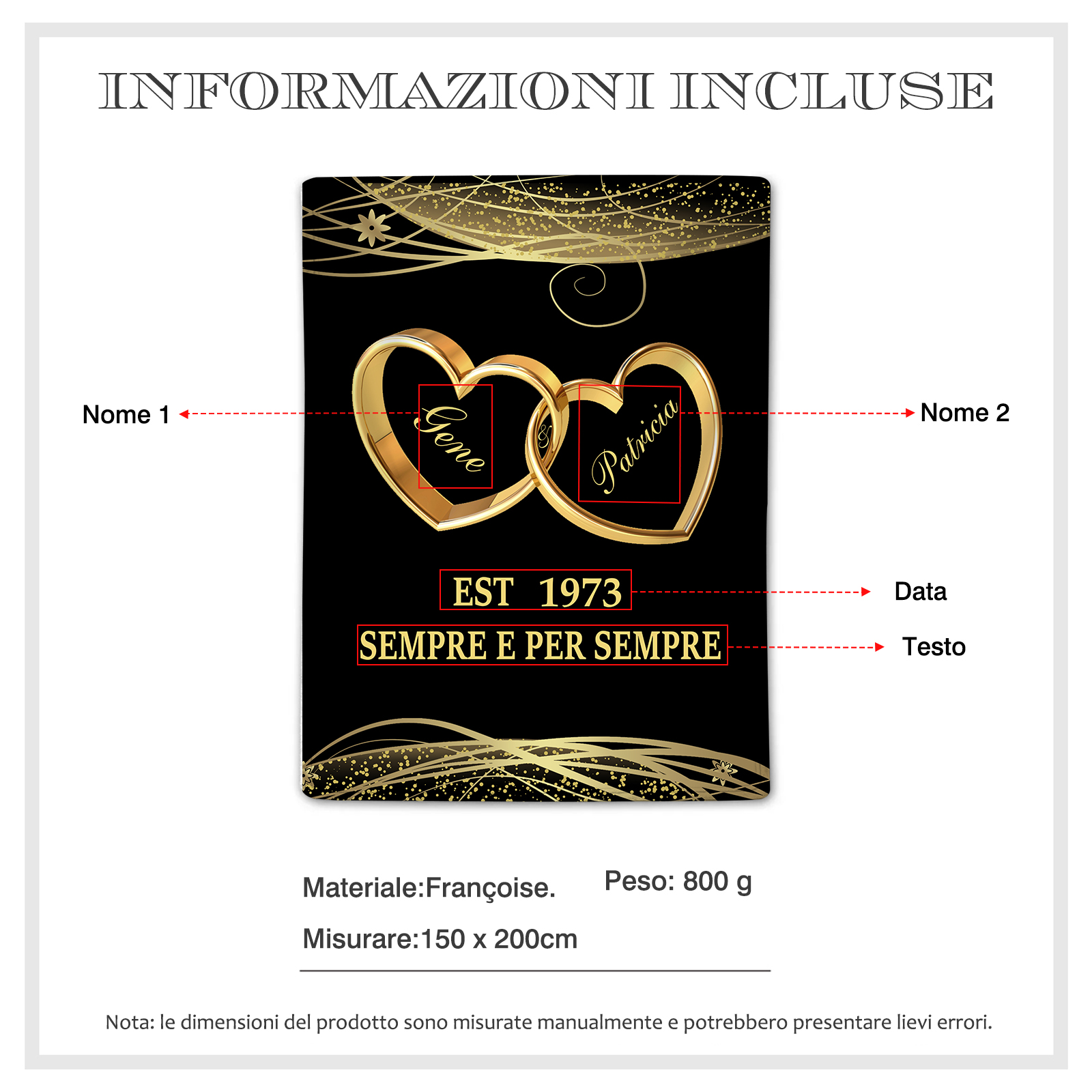 Coperta con cuore oro per coppia 2 nomi 1 data e testo personalizzabile