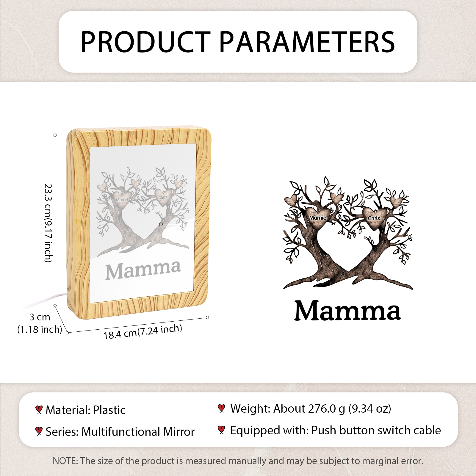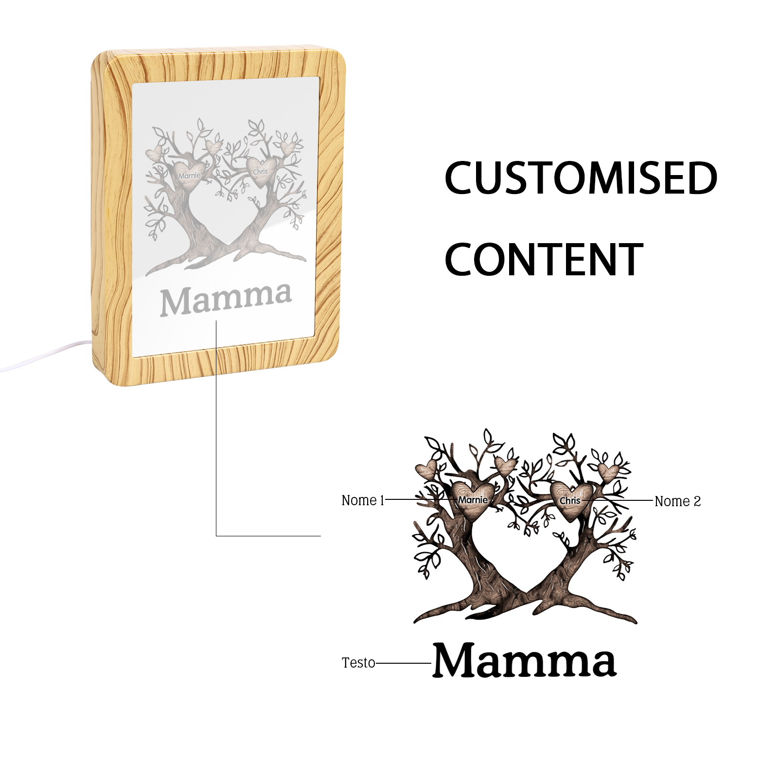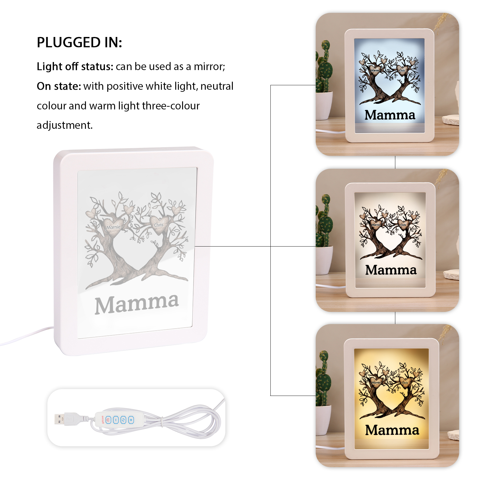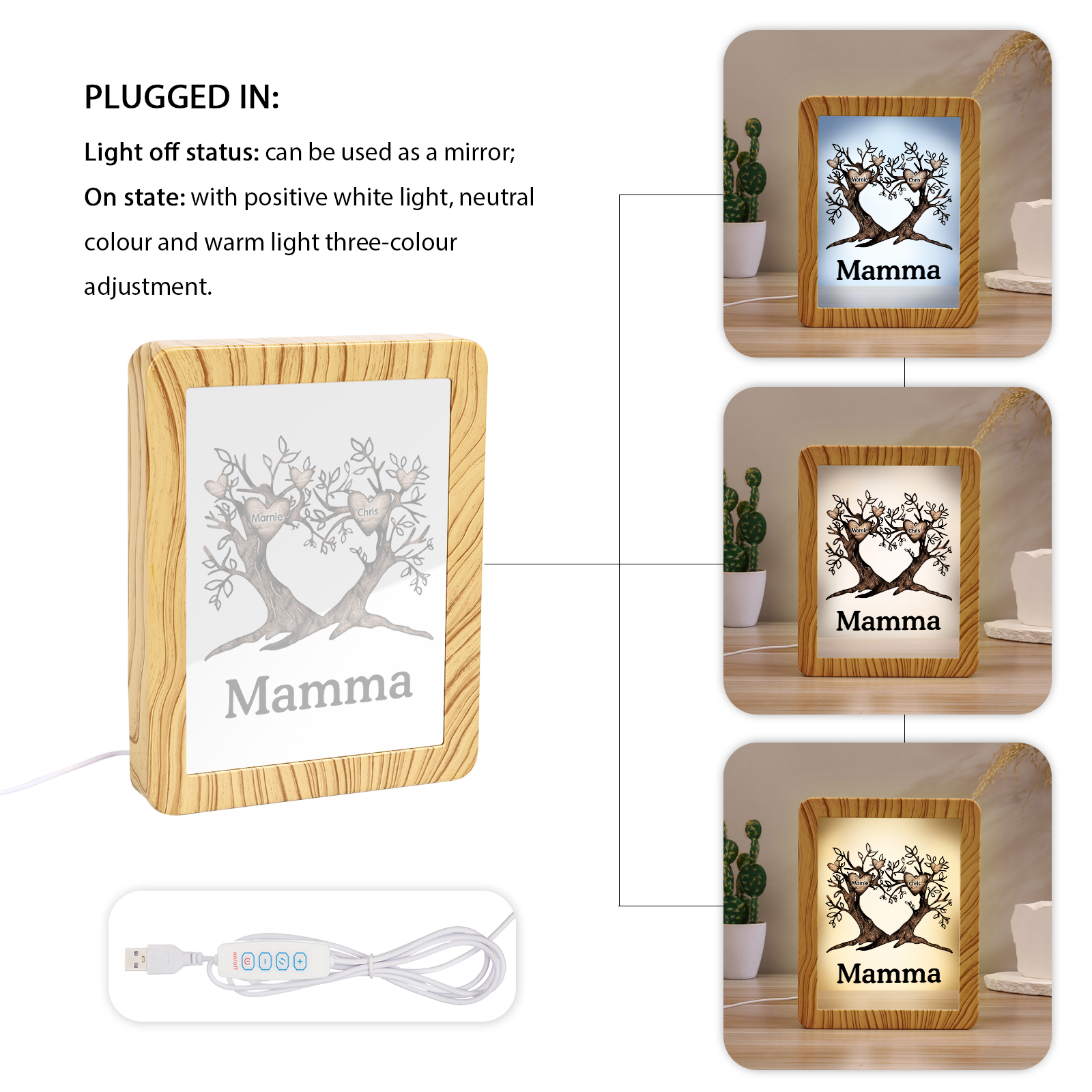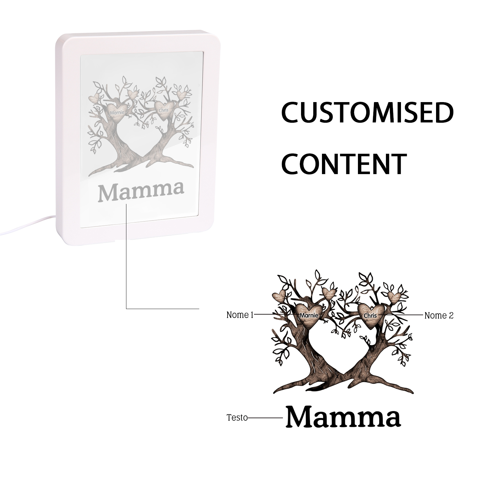 Cornice albero a cuore con LED luce a tre colori 2 nomi e 1 testo personalizzati anche usati come specchio regalo per mamma/nonna