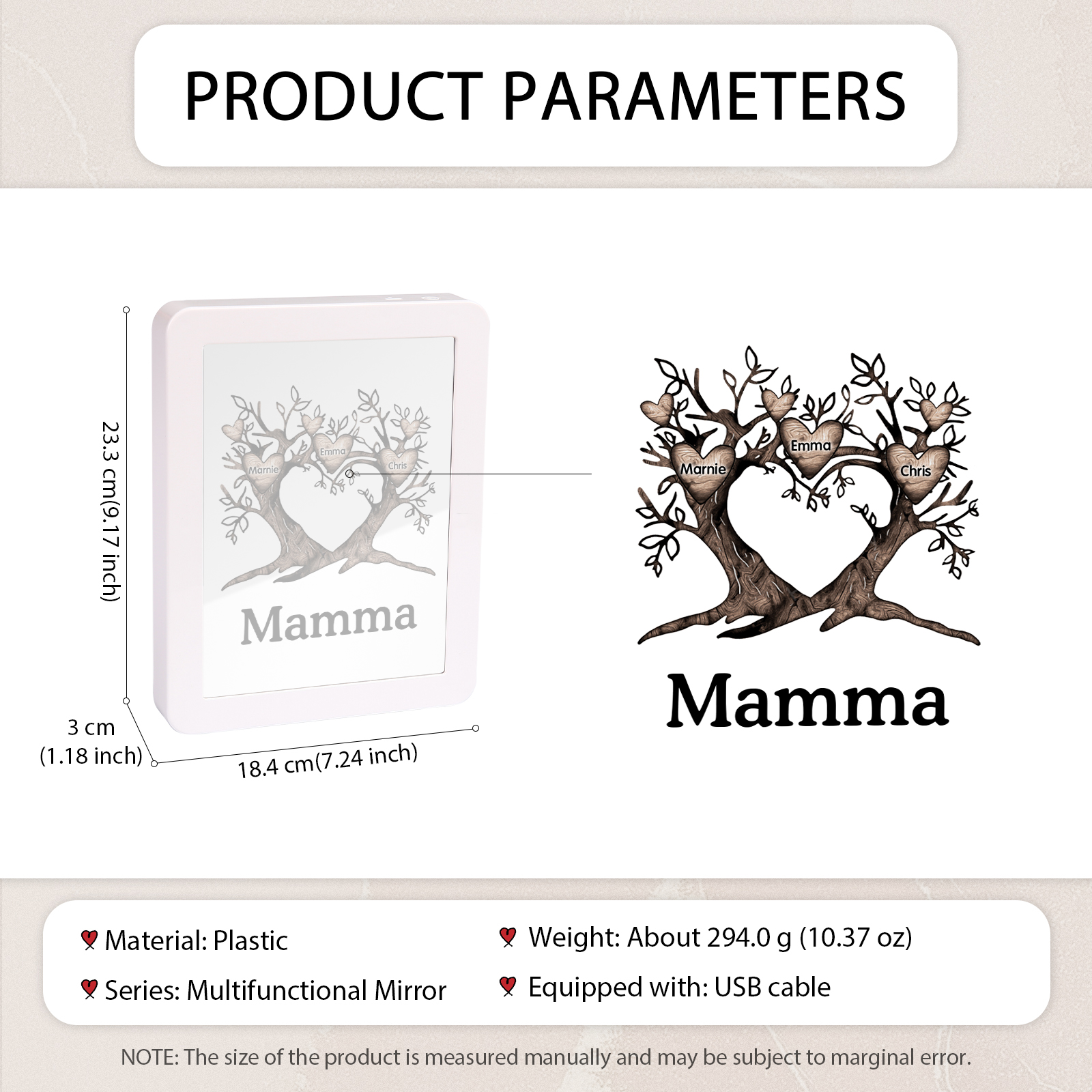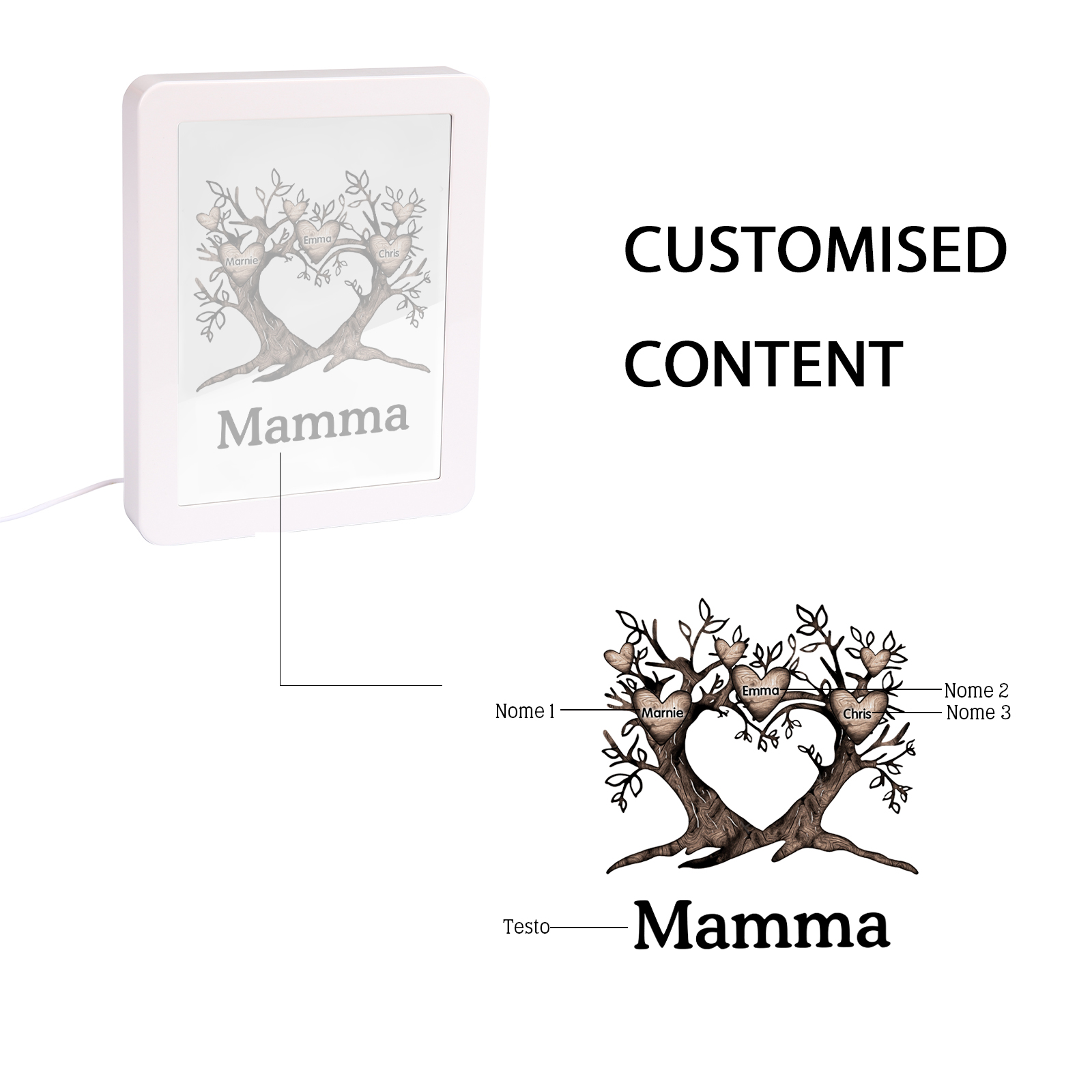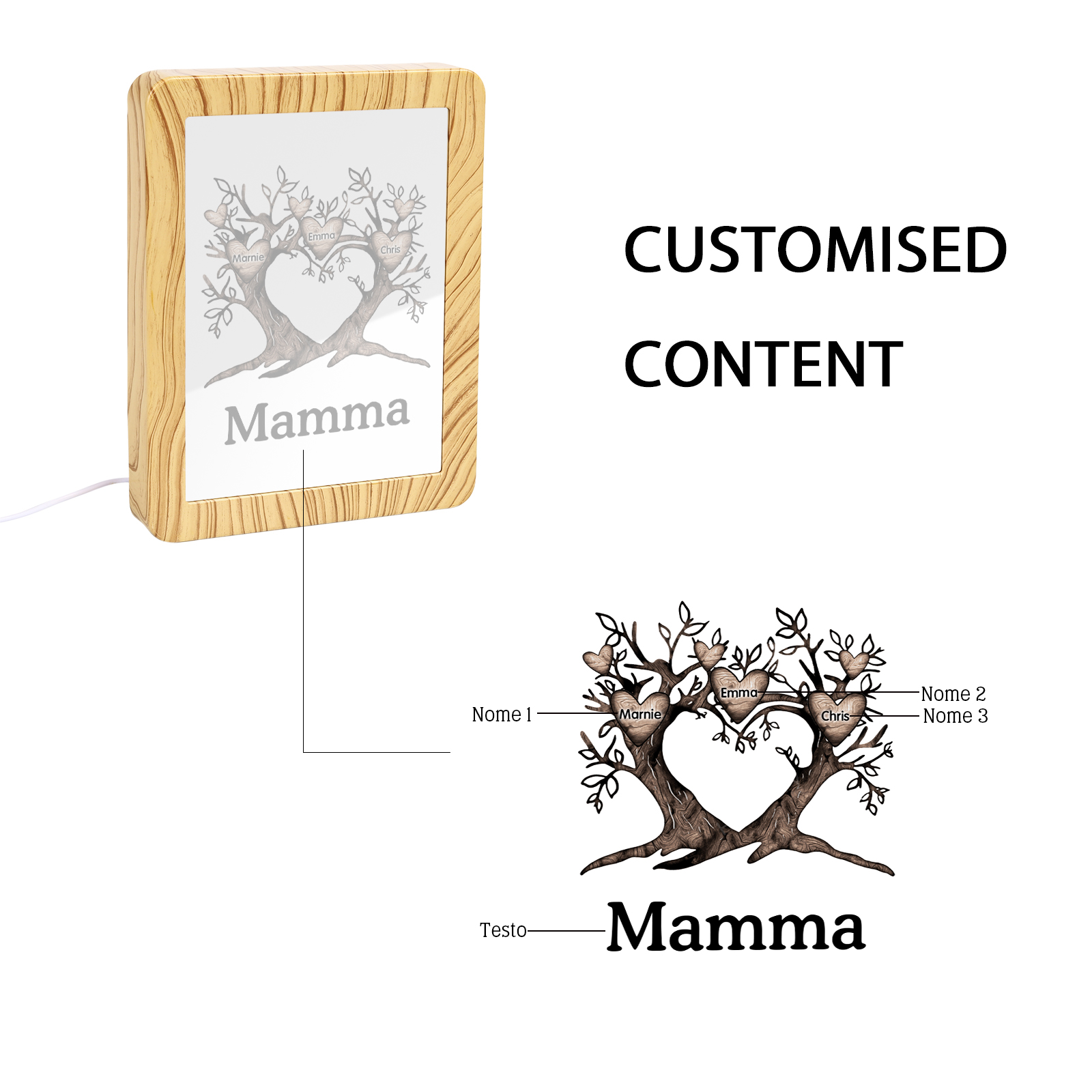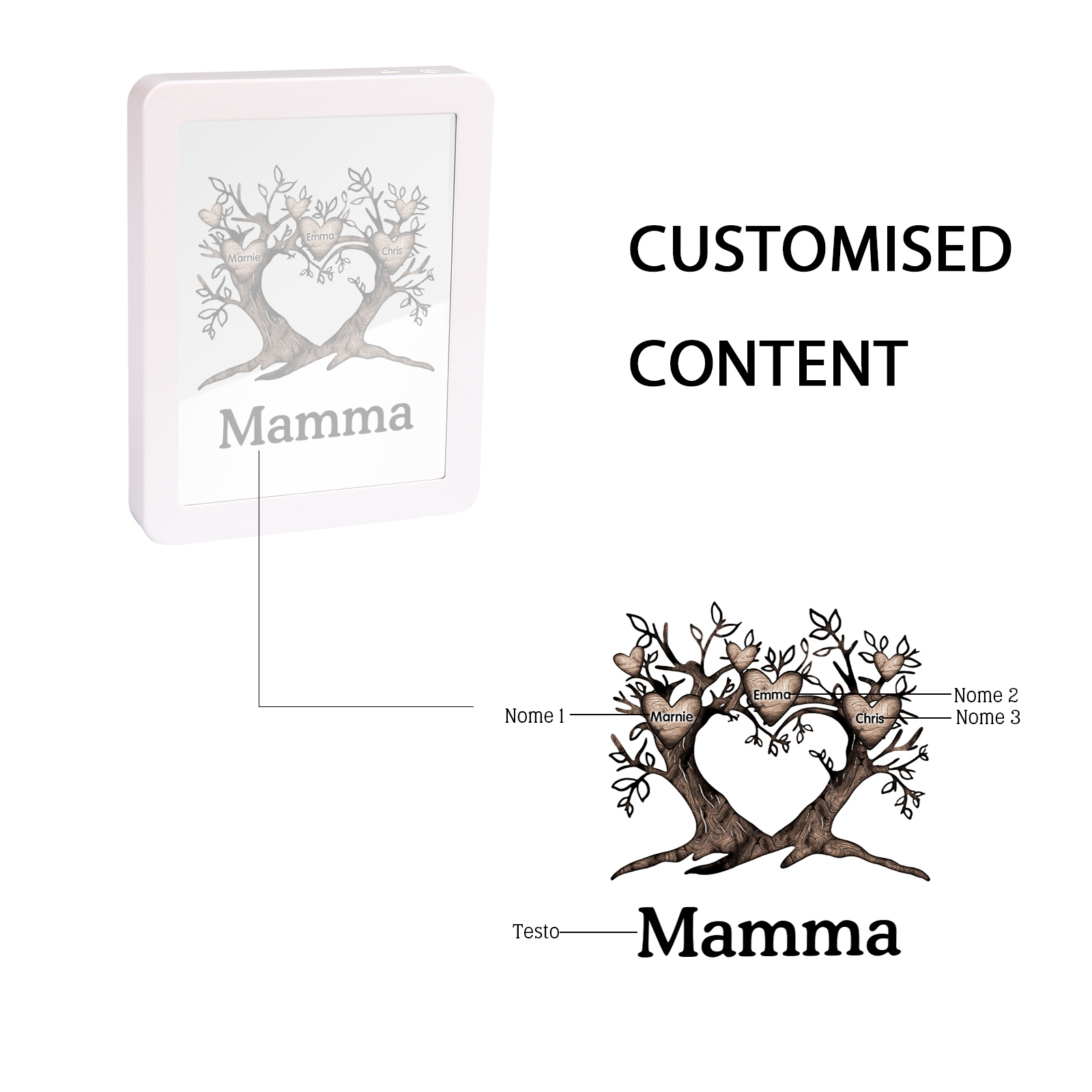 Cornice albero a cuore con LED luce a tre colori 3 nomi e 1 testo personalizzati anche usati come specchio regalo per mamma/nonna