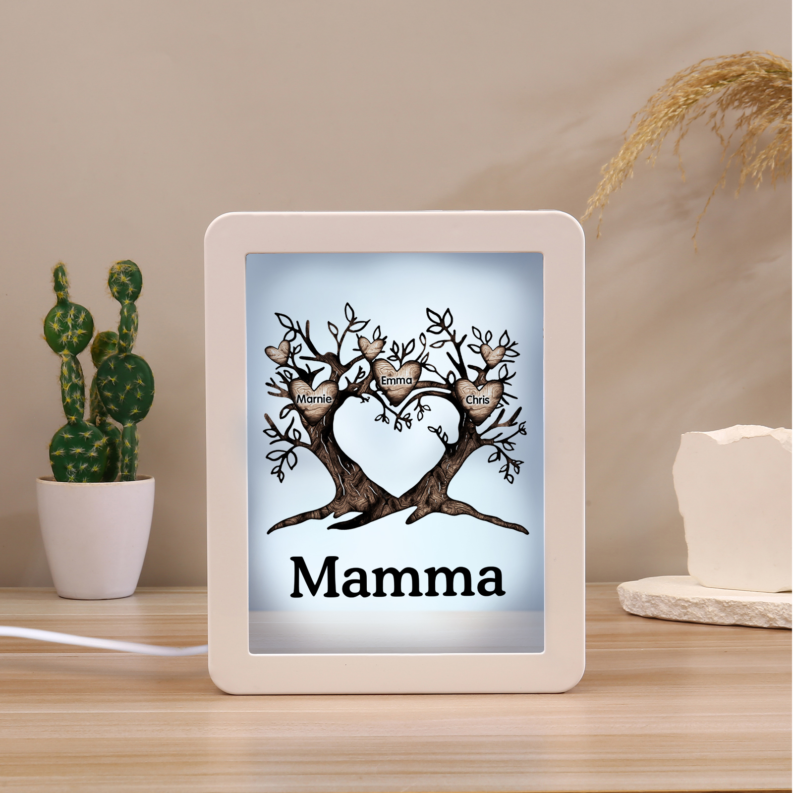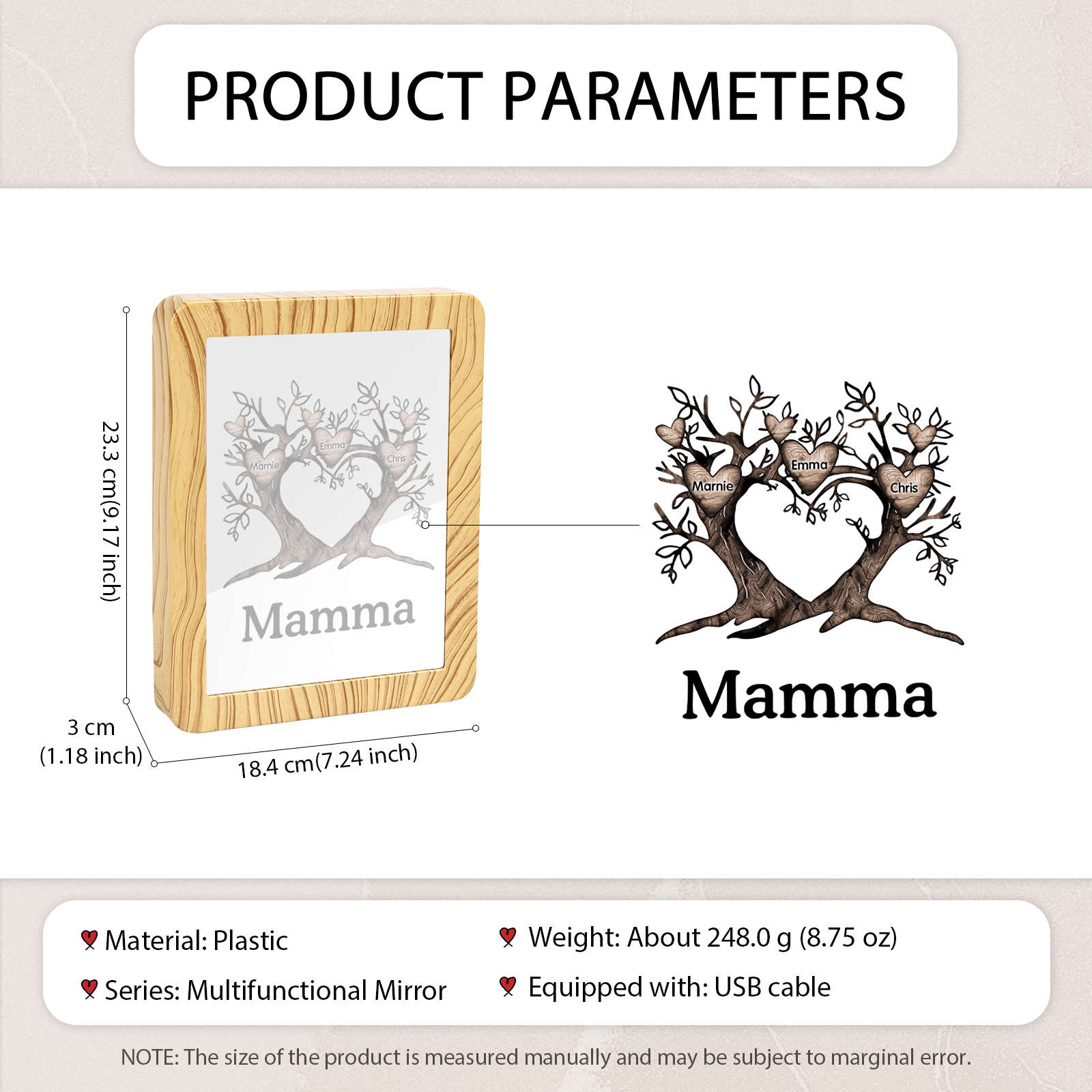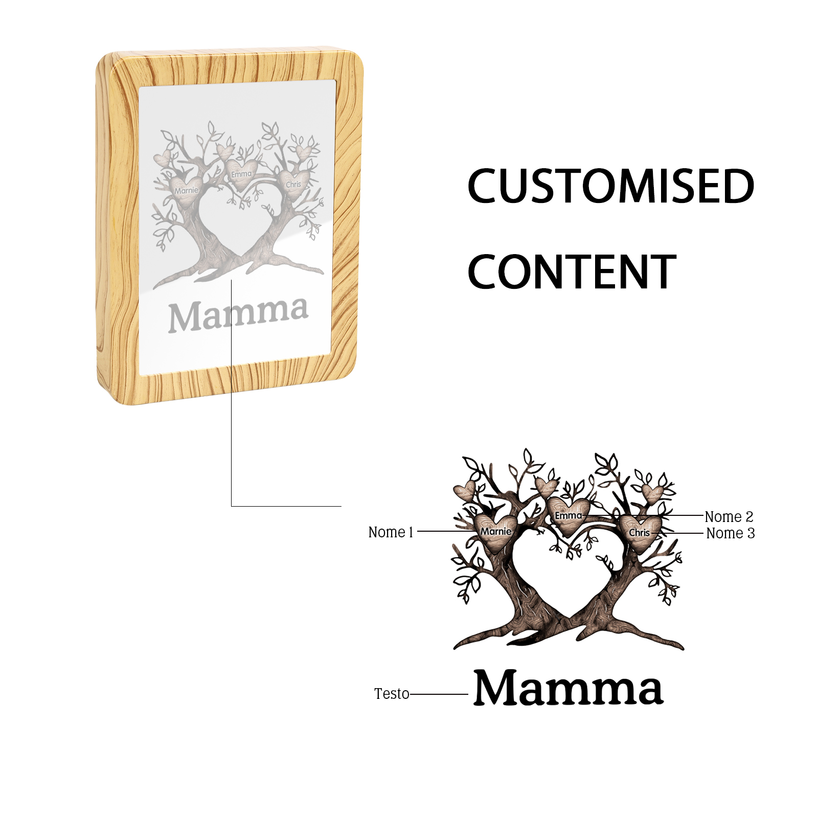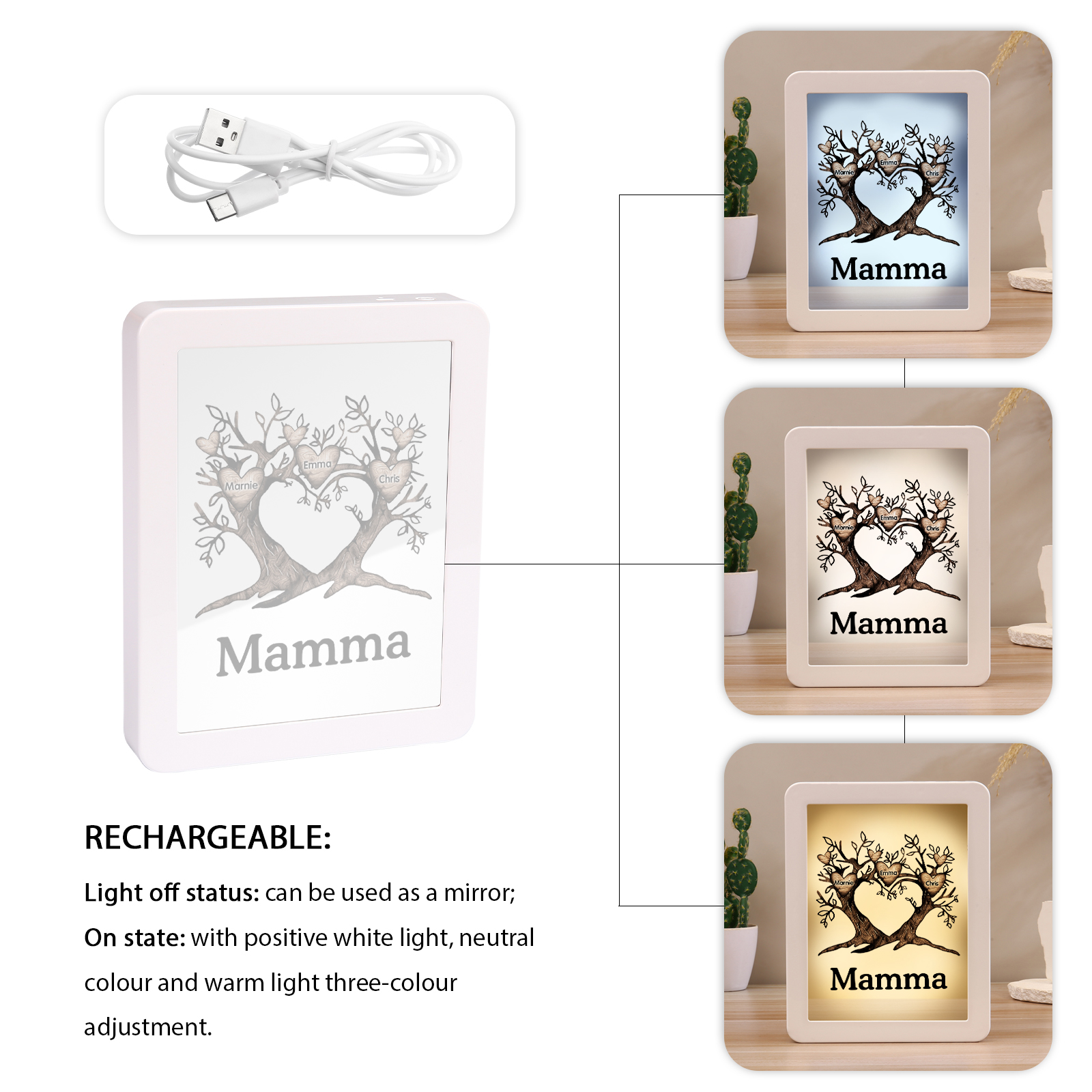 Cornice albero a cuore con LED luce a tre colori 3 nomi e 1 testo personalizzati anche usati come specchio regalo per mamma/nonna