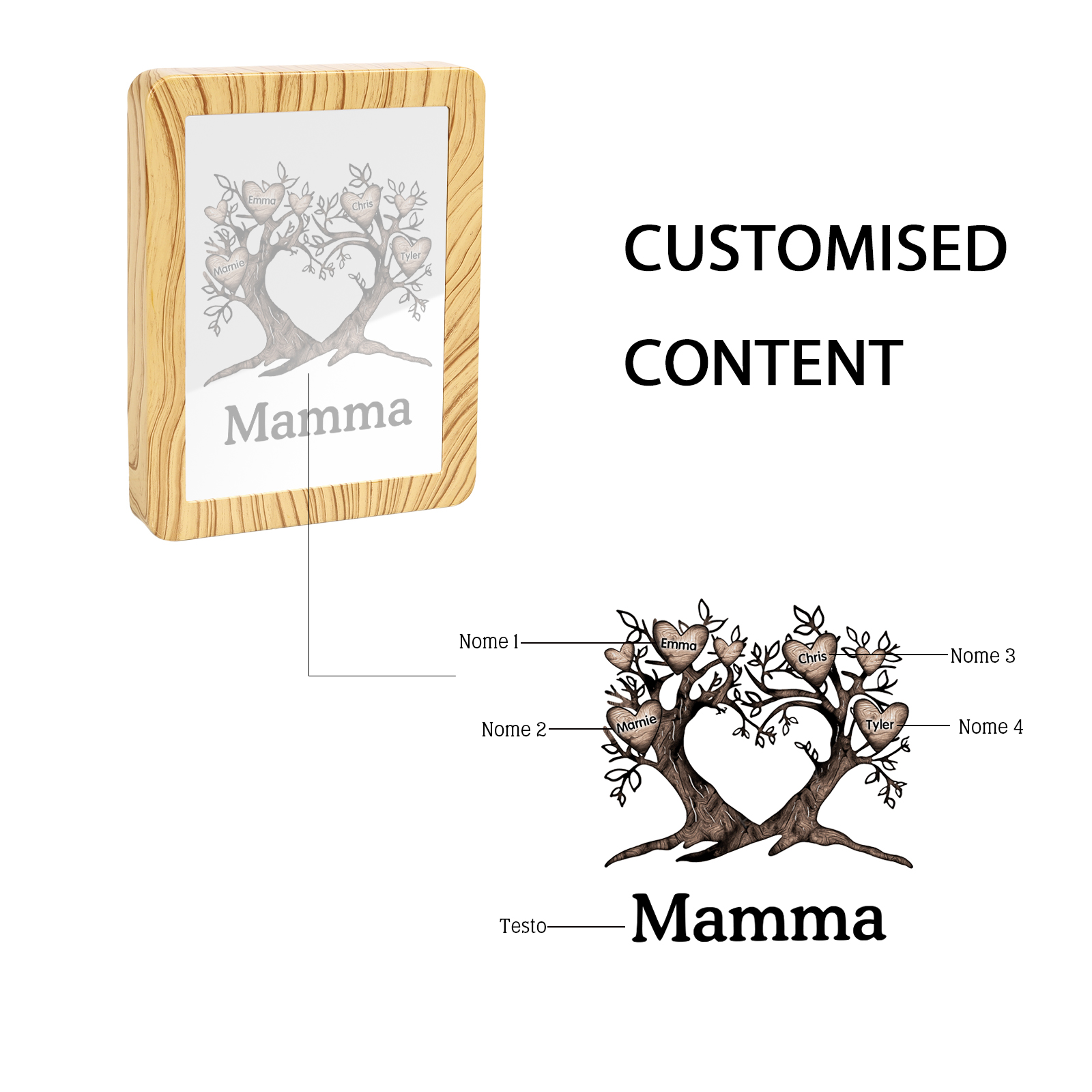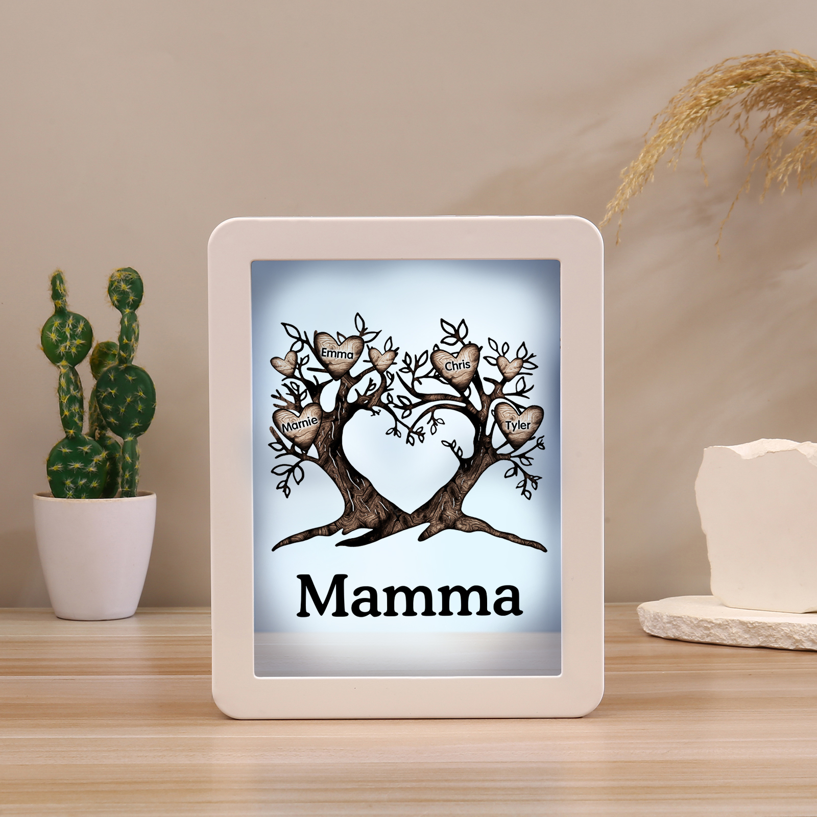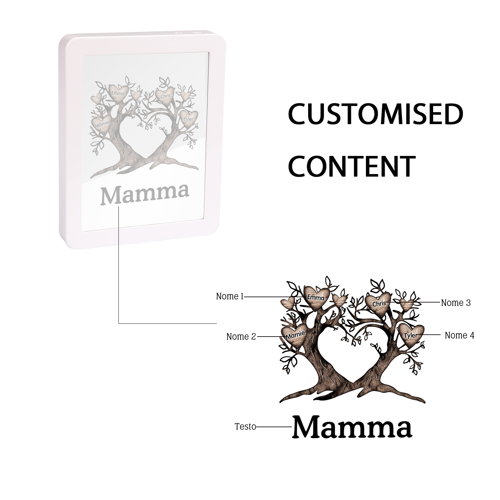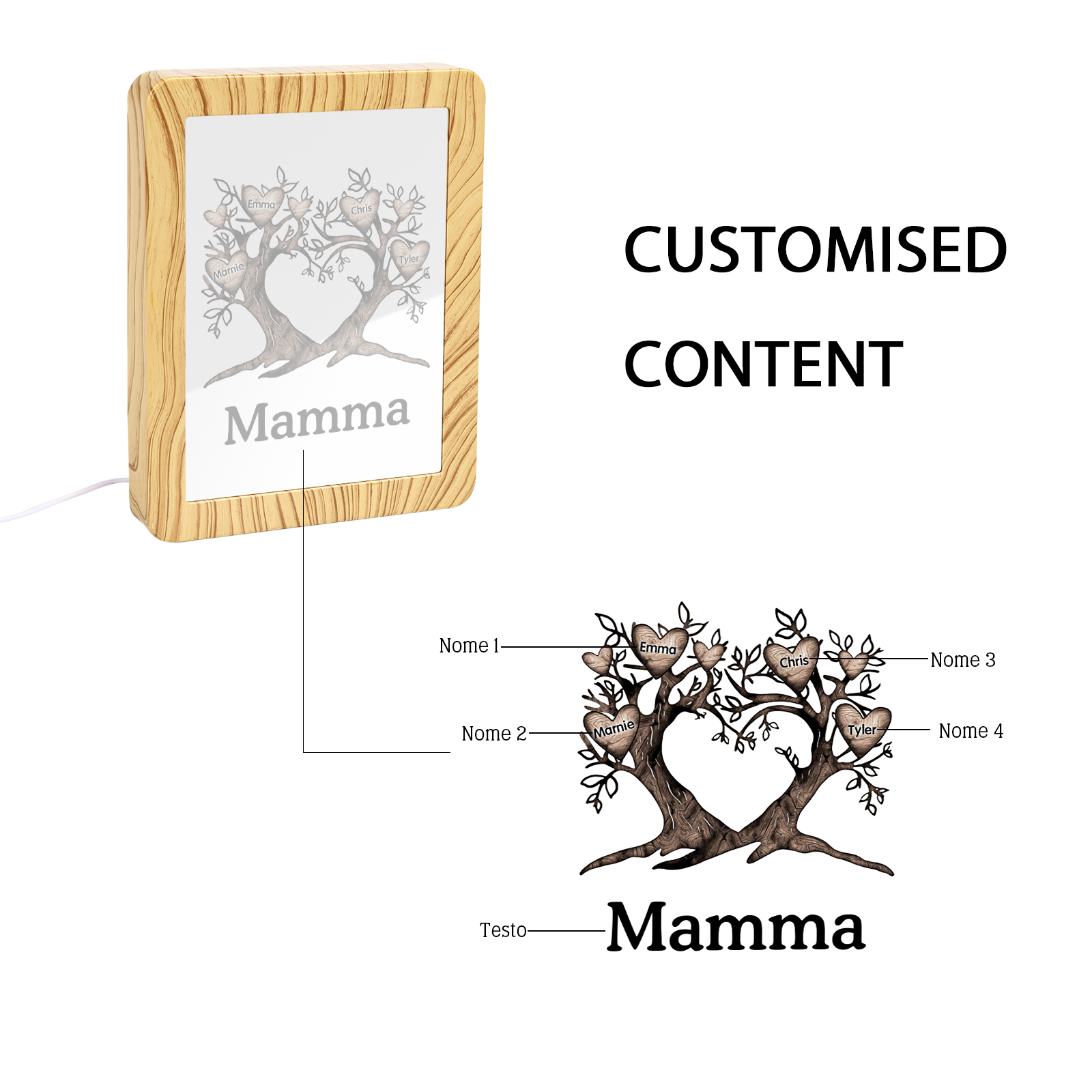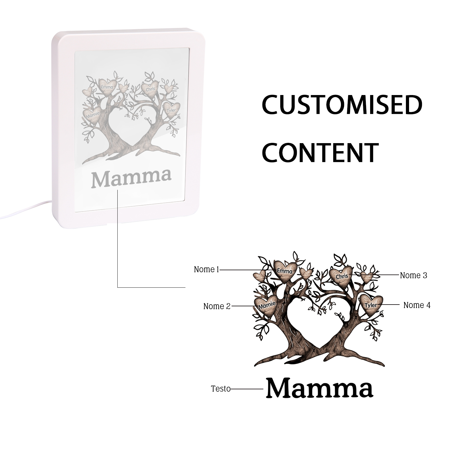 Cornice albero a cuore con LED luce a tre colori 4 nomi e 1 testo personalizzati anche usati come specchio regalo per mamma/nonna