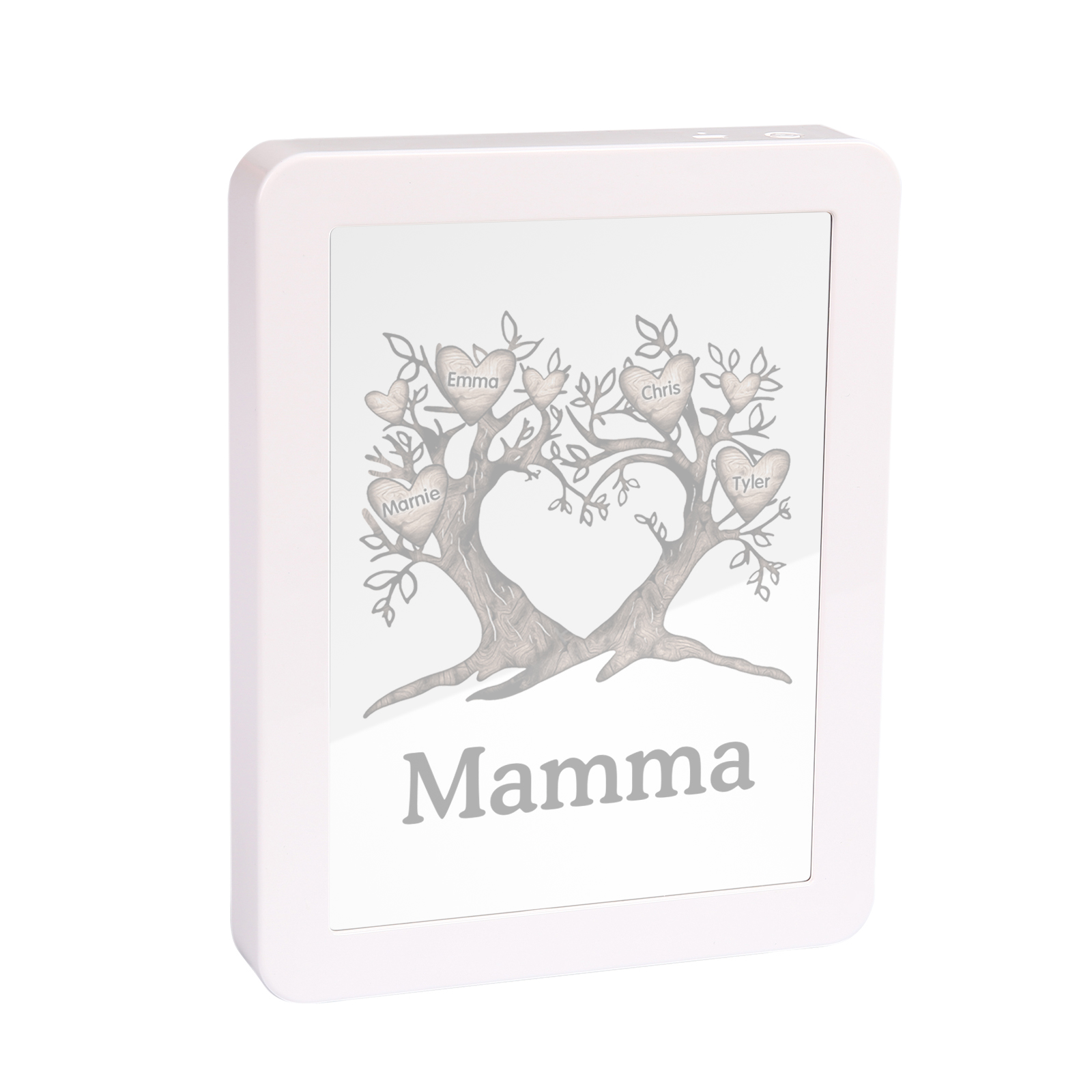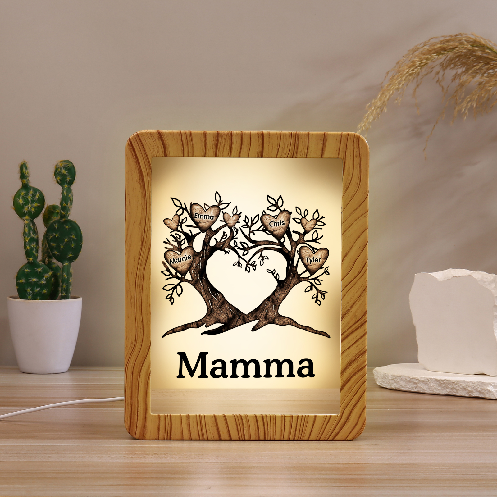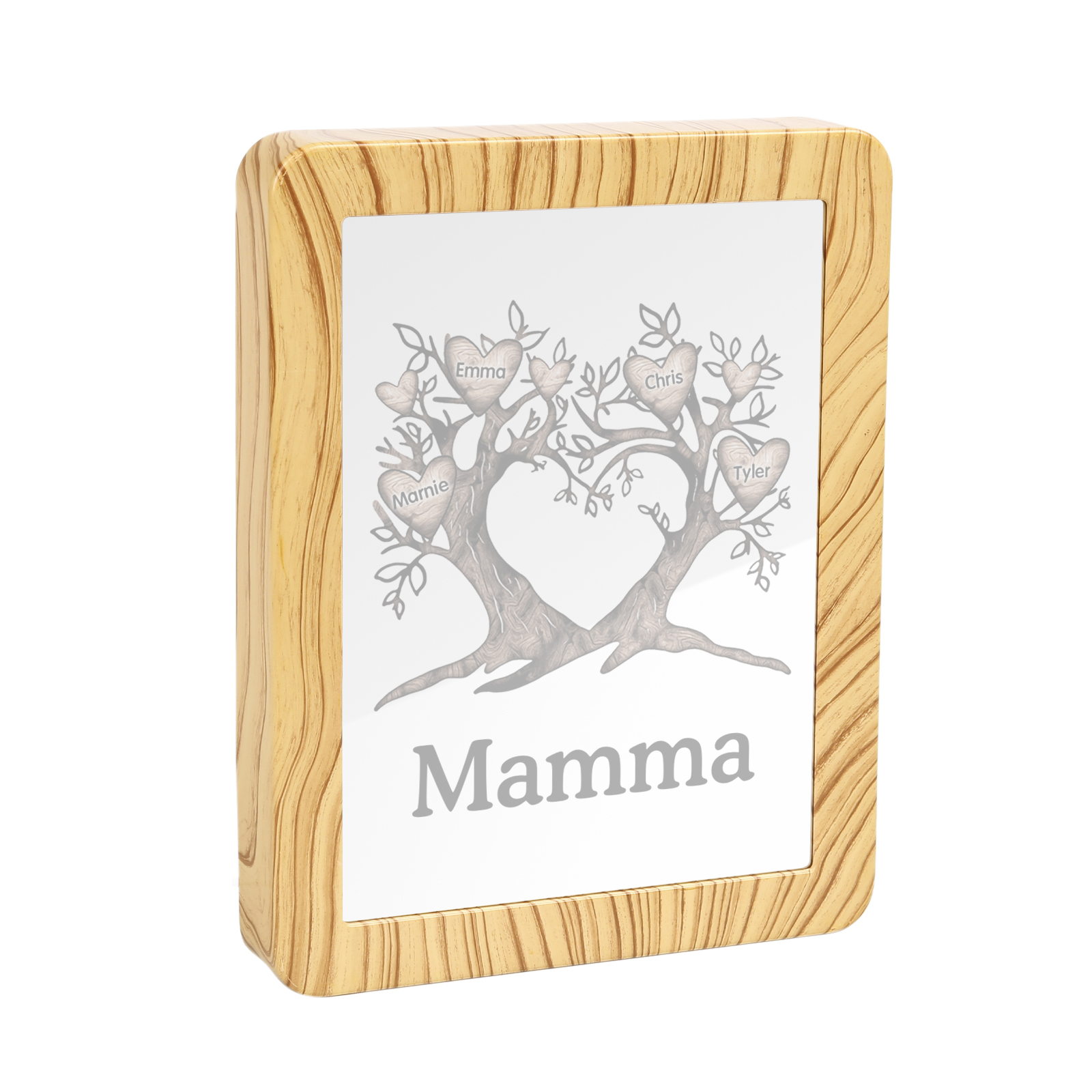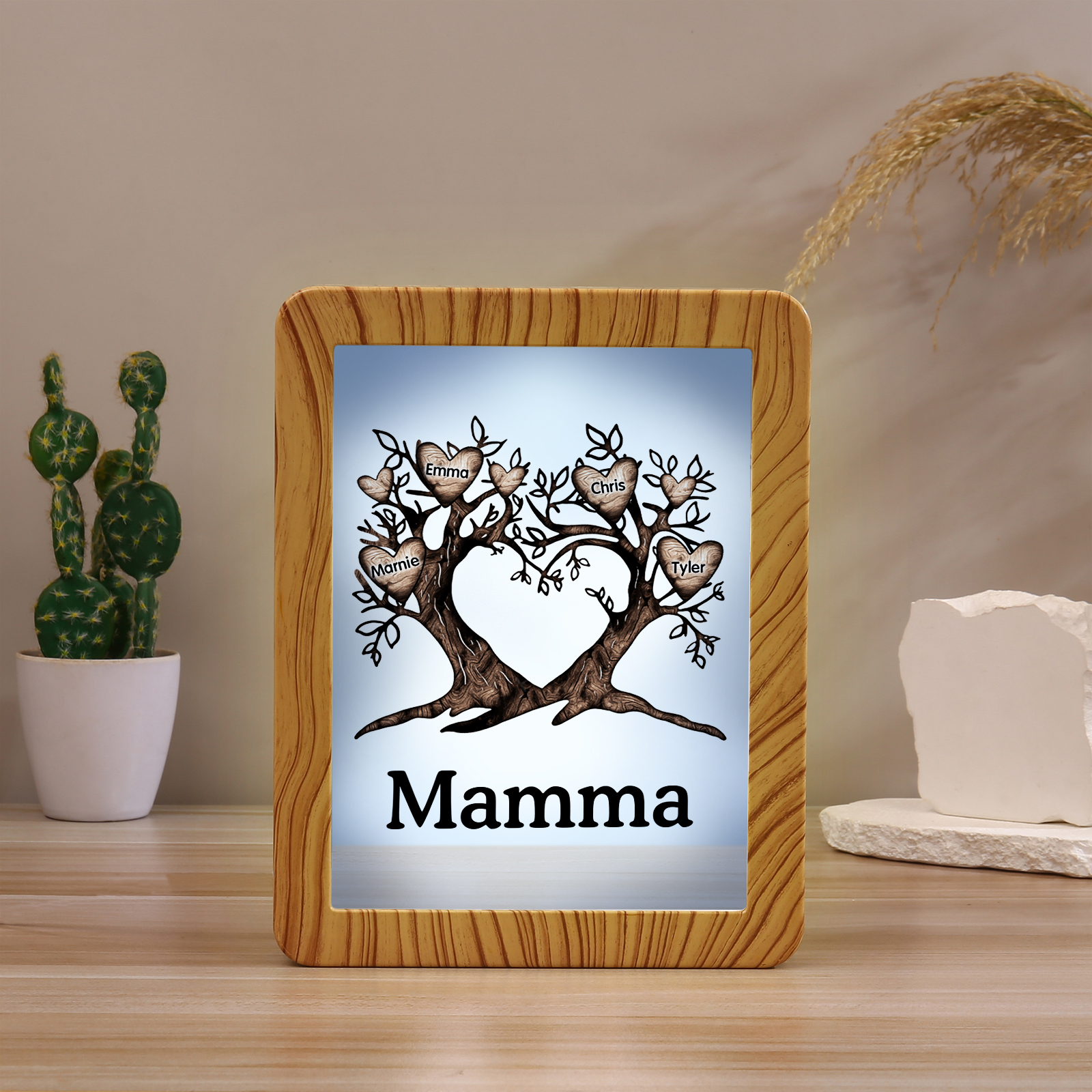 Cornice albero a cuore con LED luce a tre colori 4 nomi e 1 testo personalizzati anche usati come specchio regalo per mamma/nonna