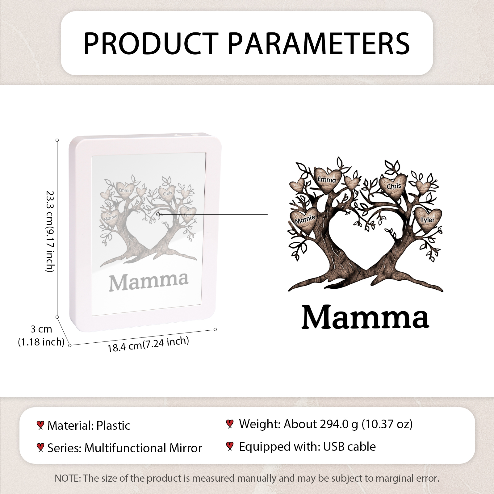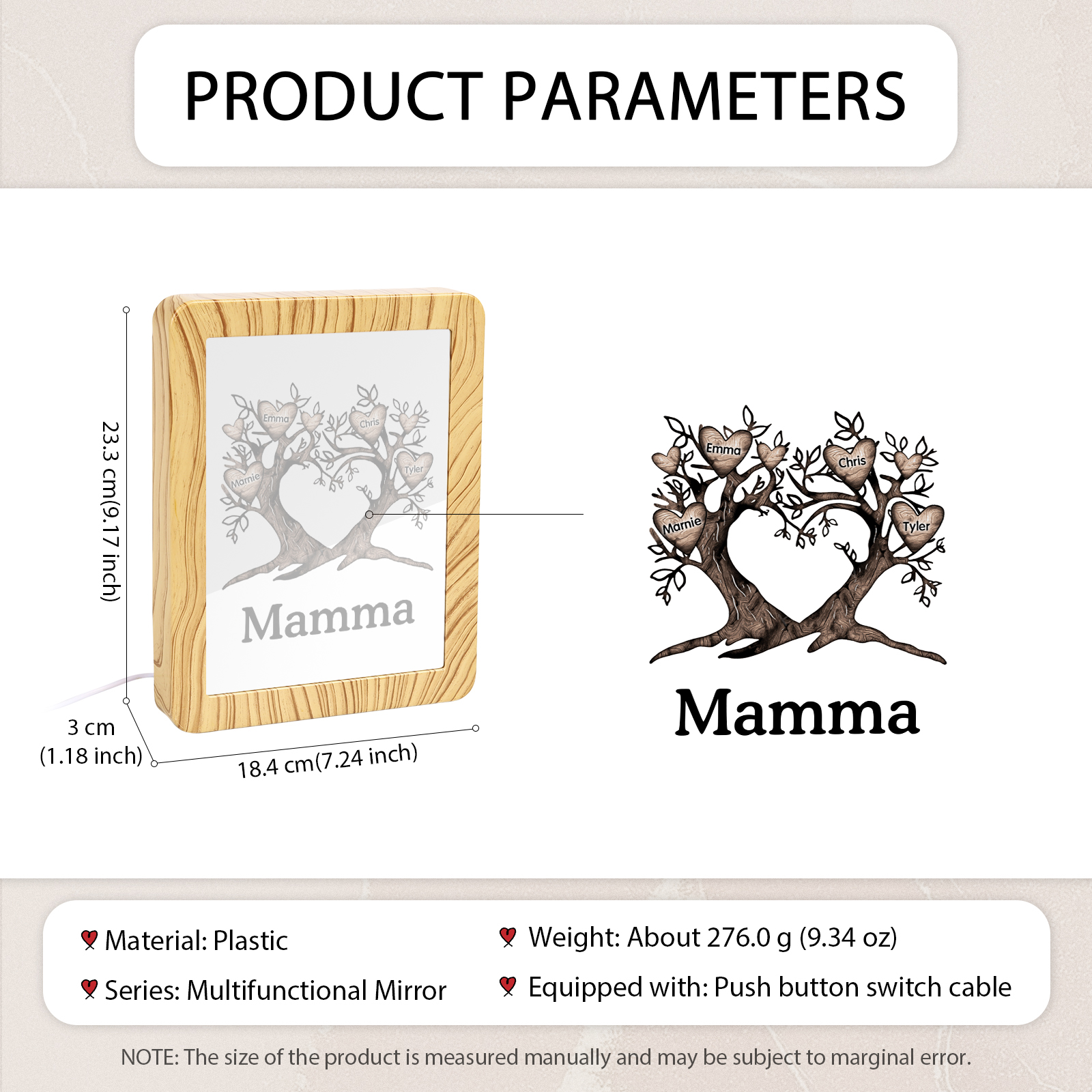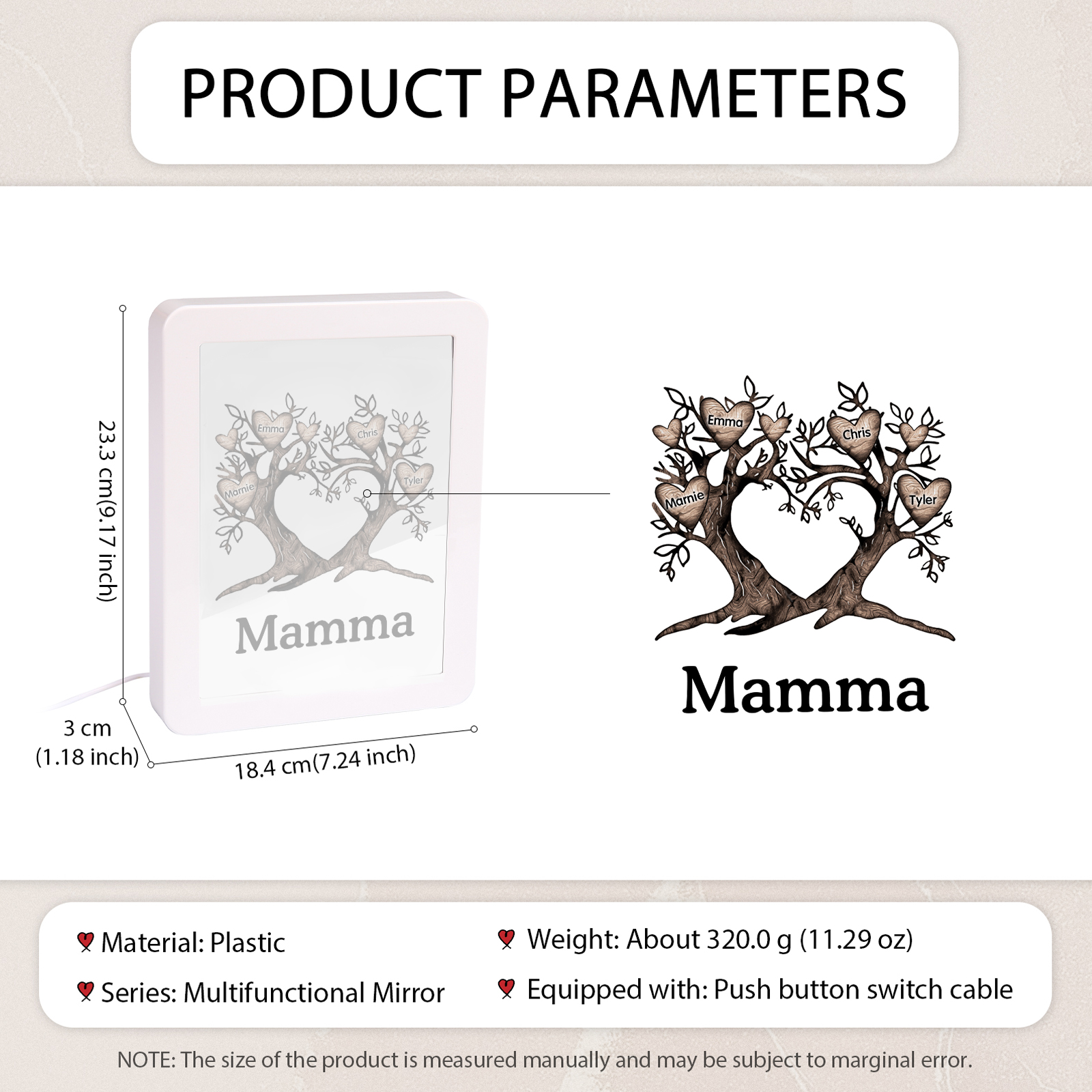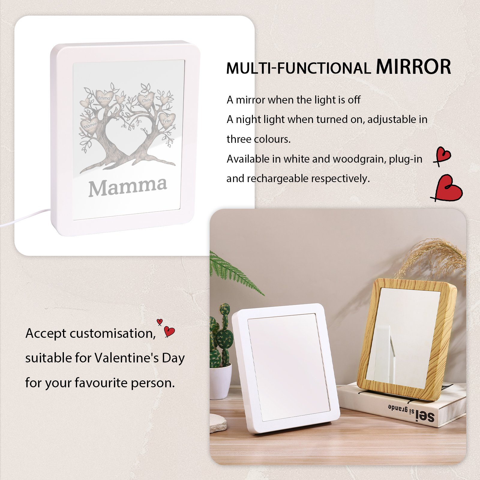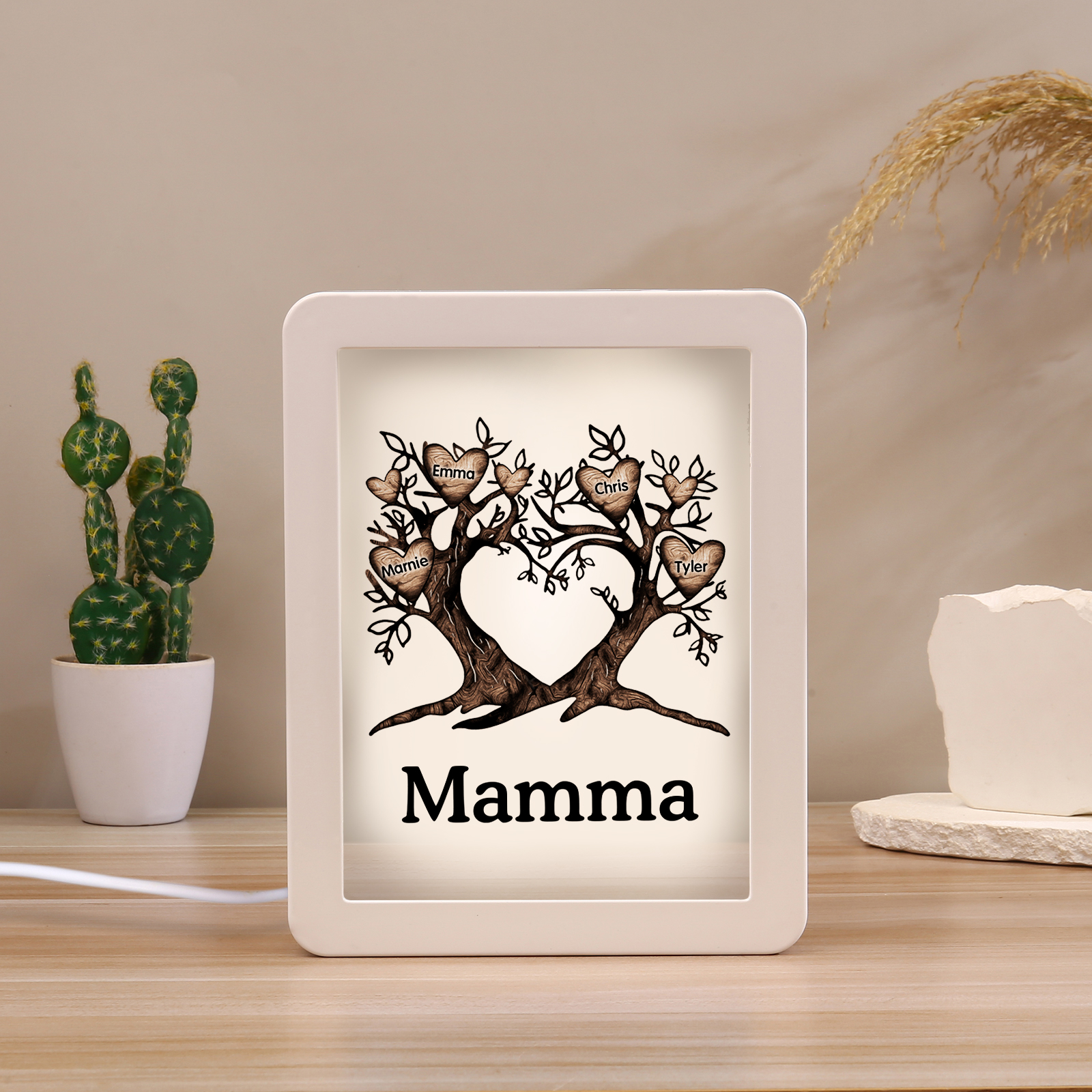 Cornice albero a cuore con LED luce a tre colori 4 nomi e 1 testo personalizzati anche usati come specchio regalo per mamma/nonna