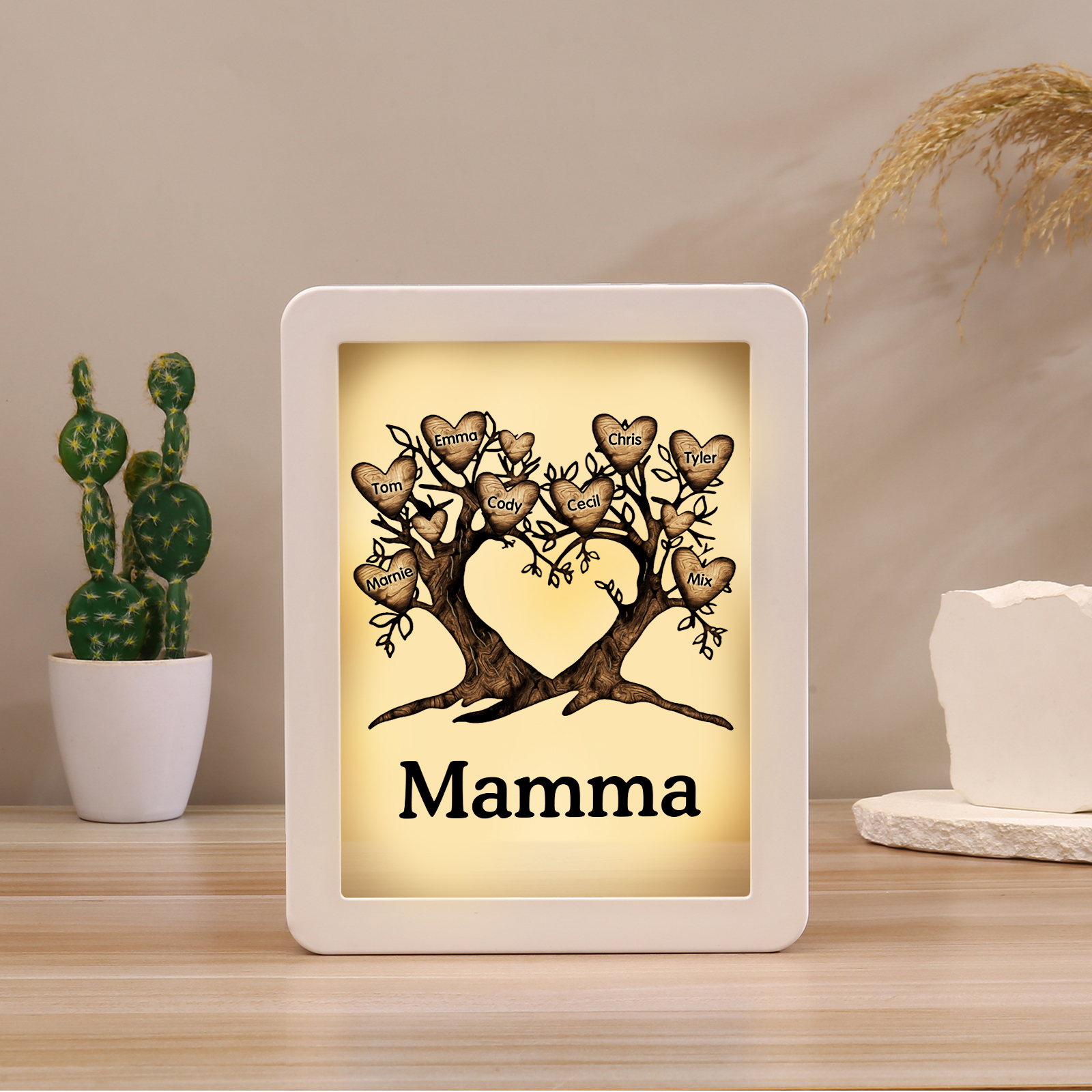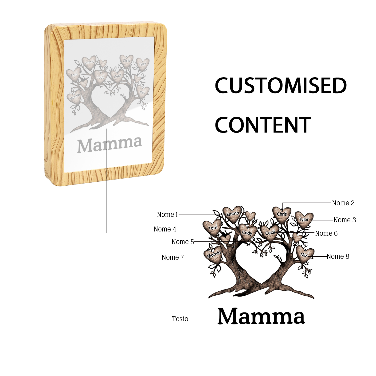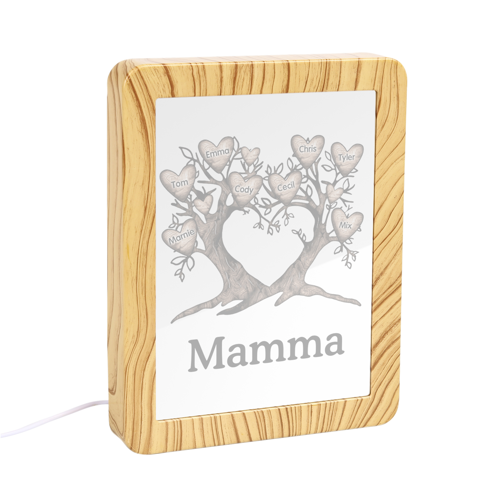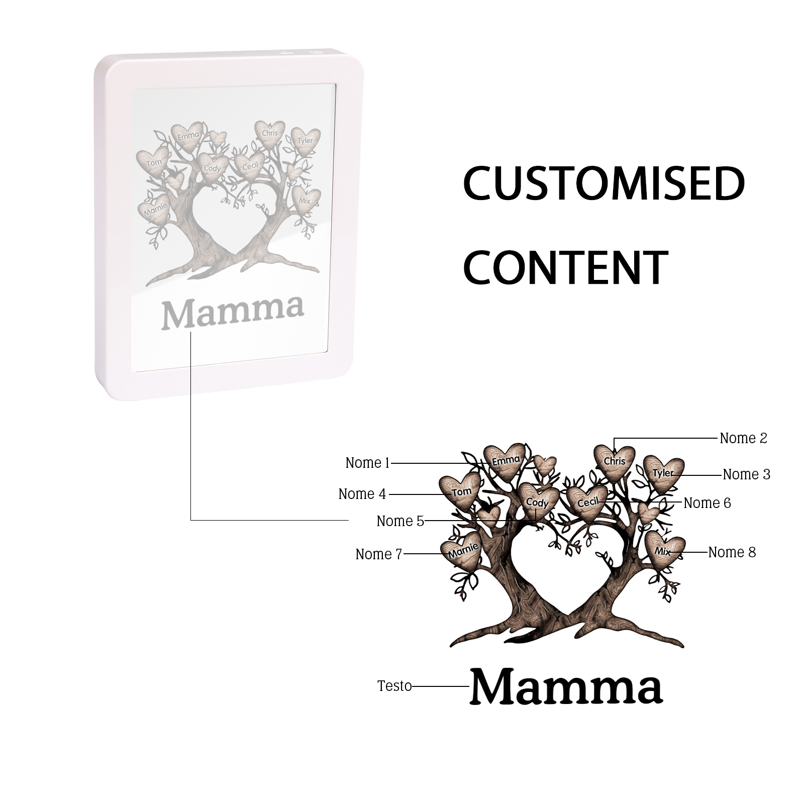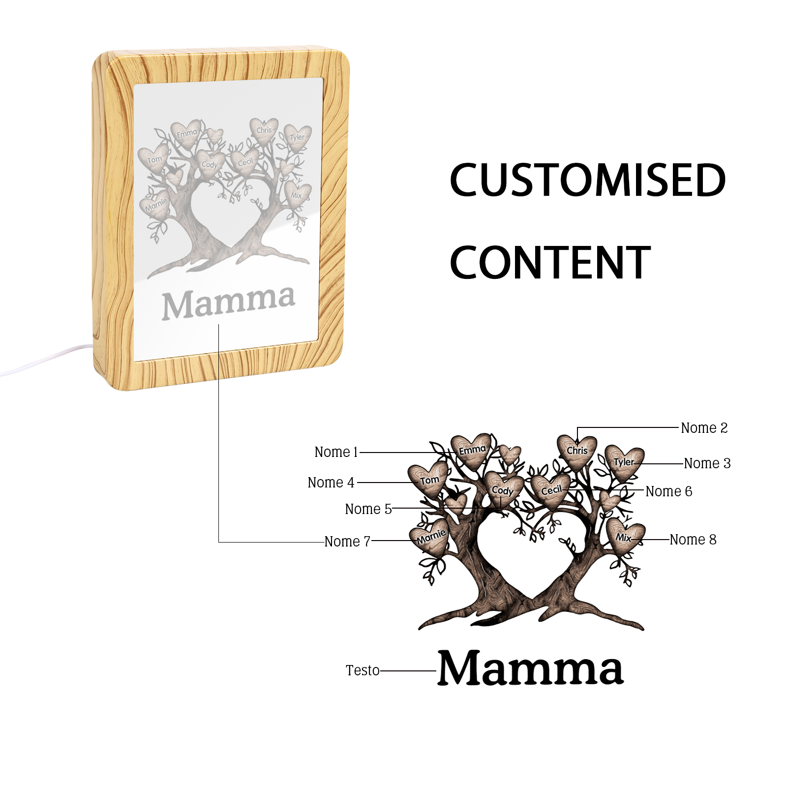 Cornice albero a cuore con LED luce a tre colori 8 nomi e 1 testo personalizzati anche usati come specchio regalo per mamma/nonna