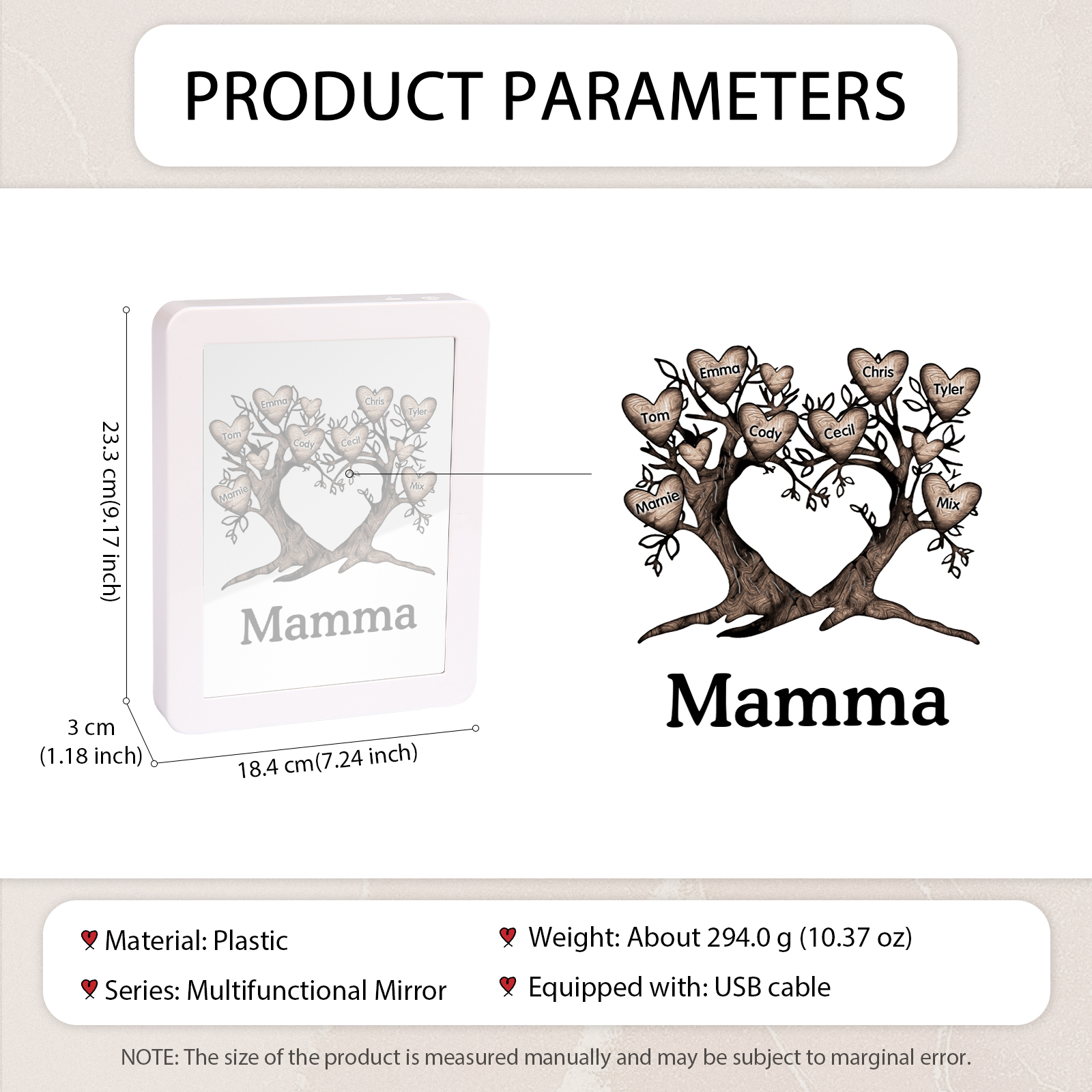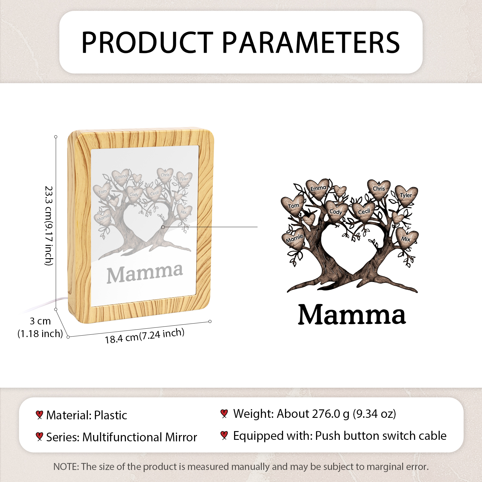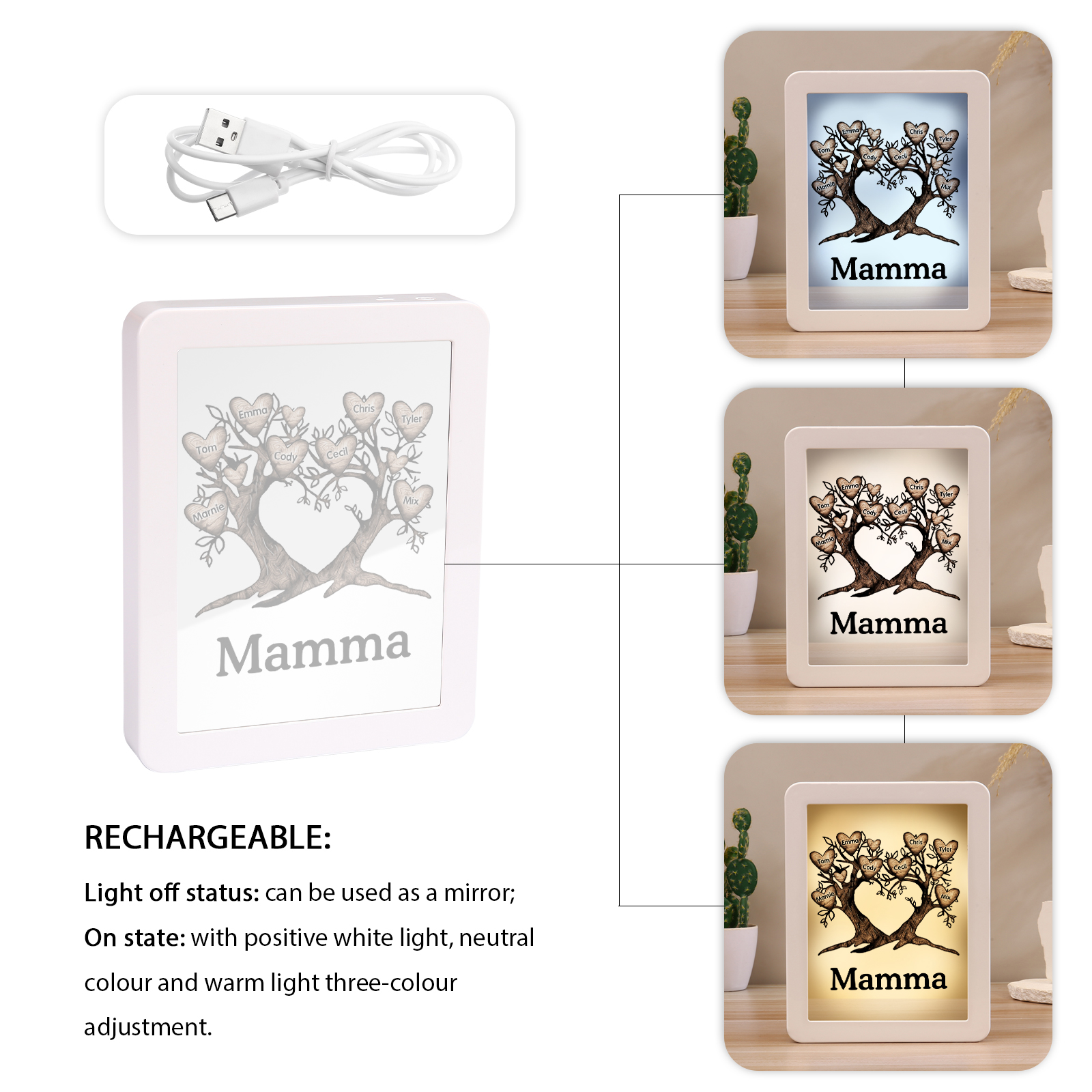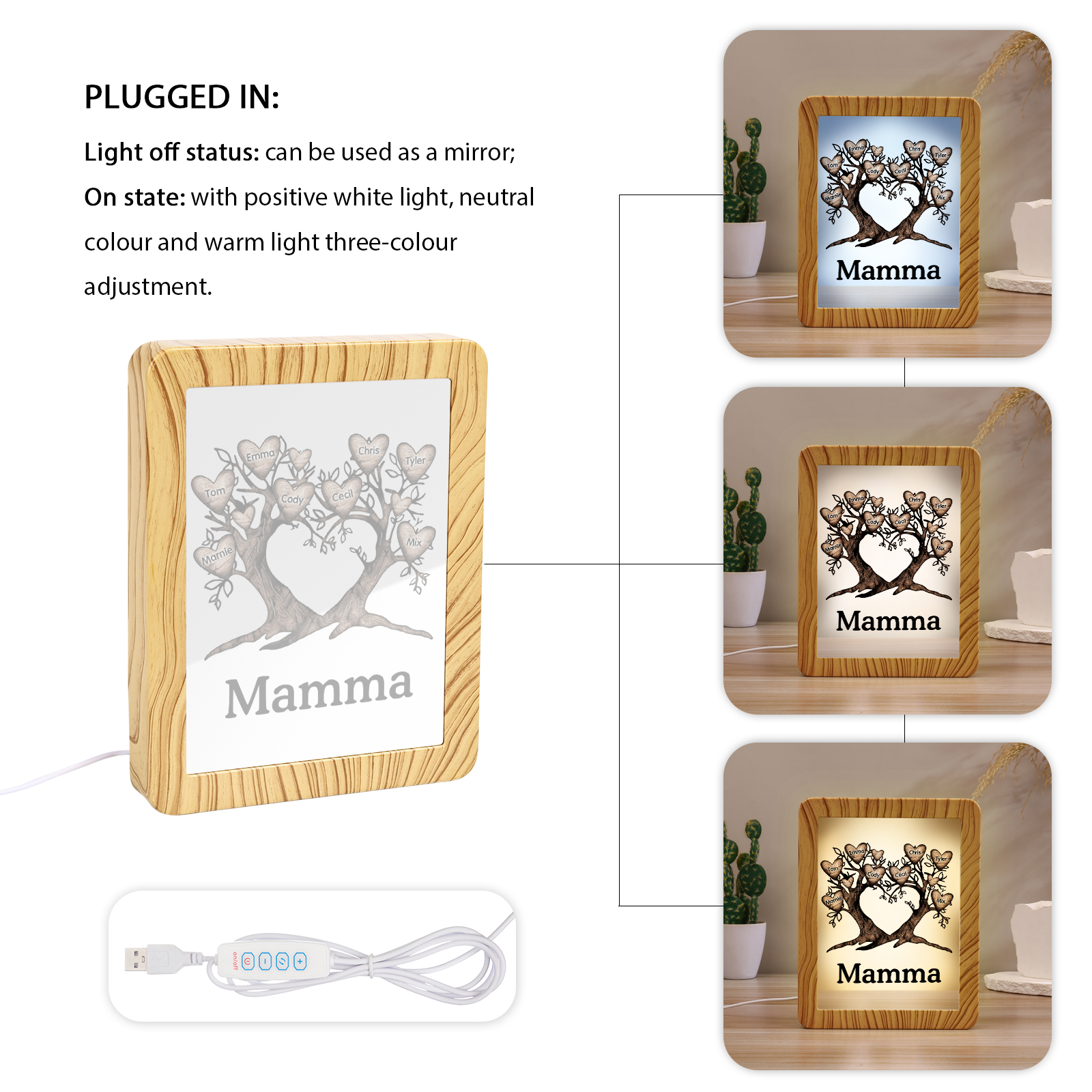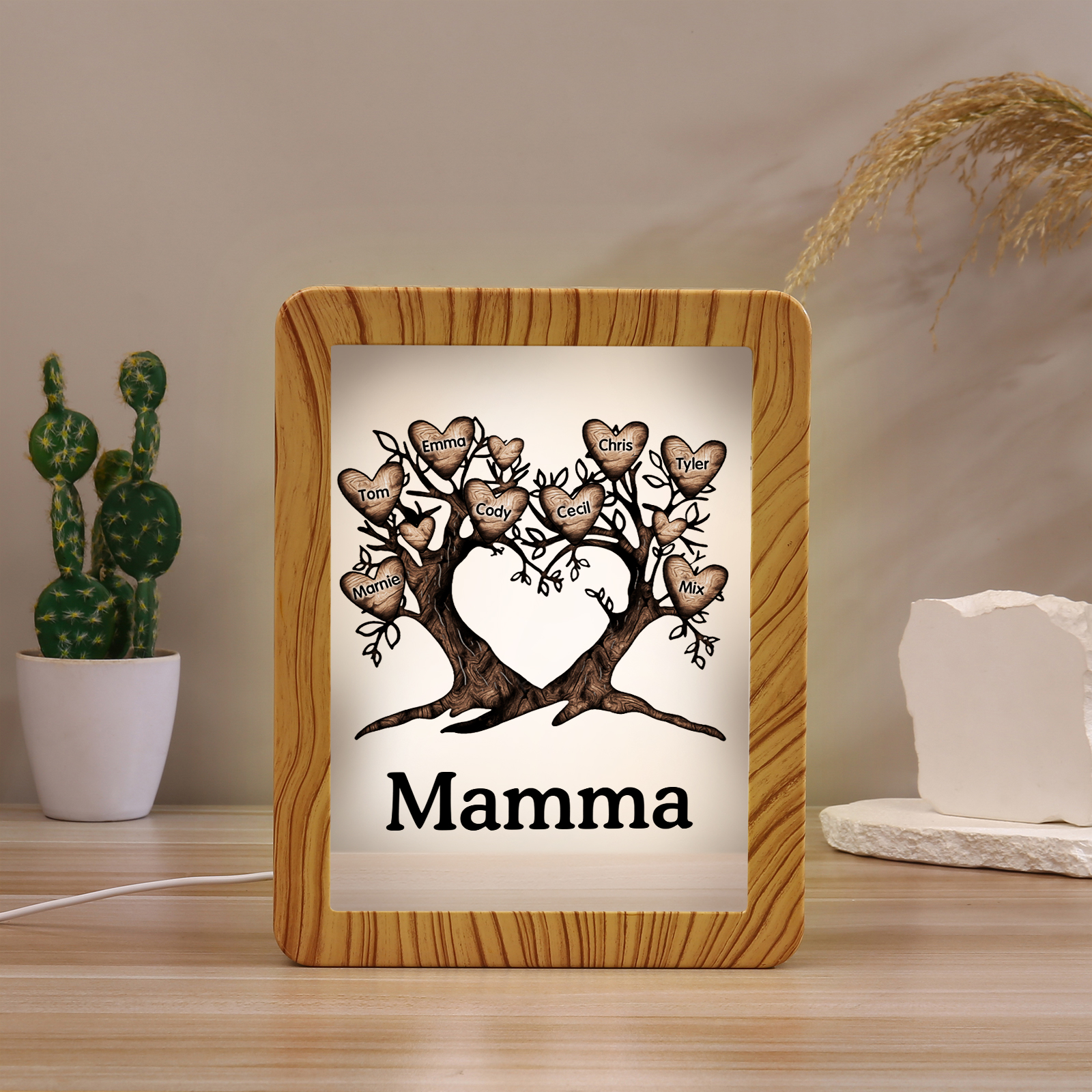 Cornice albero a cuore con LED luce a tre colori 8 nomi e 1 testo personalizzati anche usati come specchio regalo per mamma/nonna