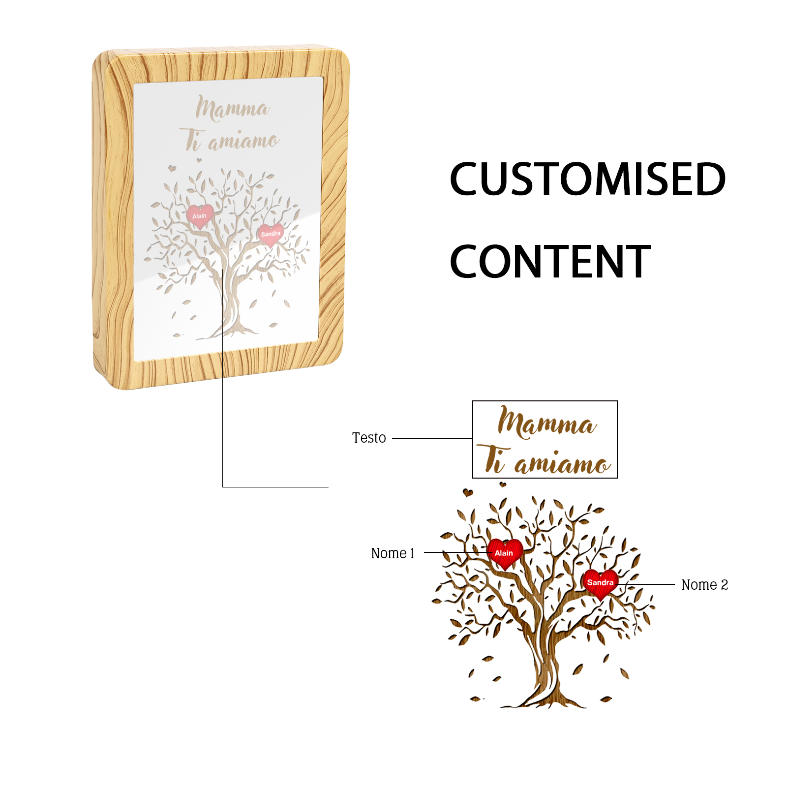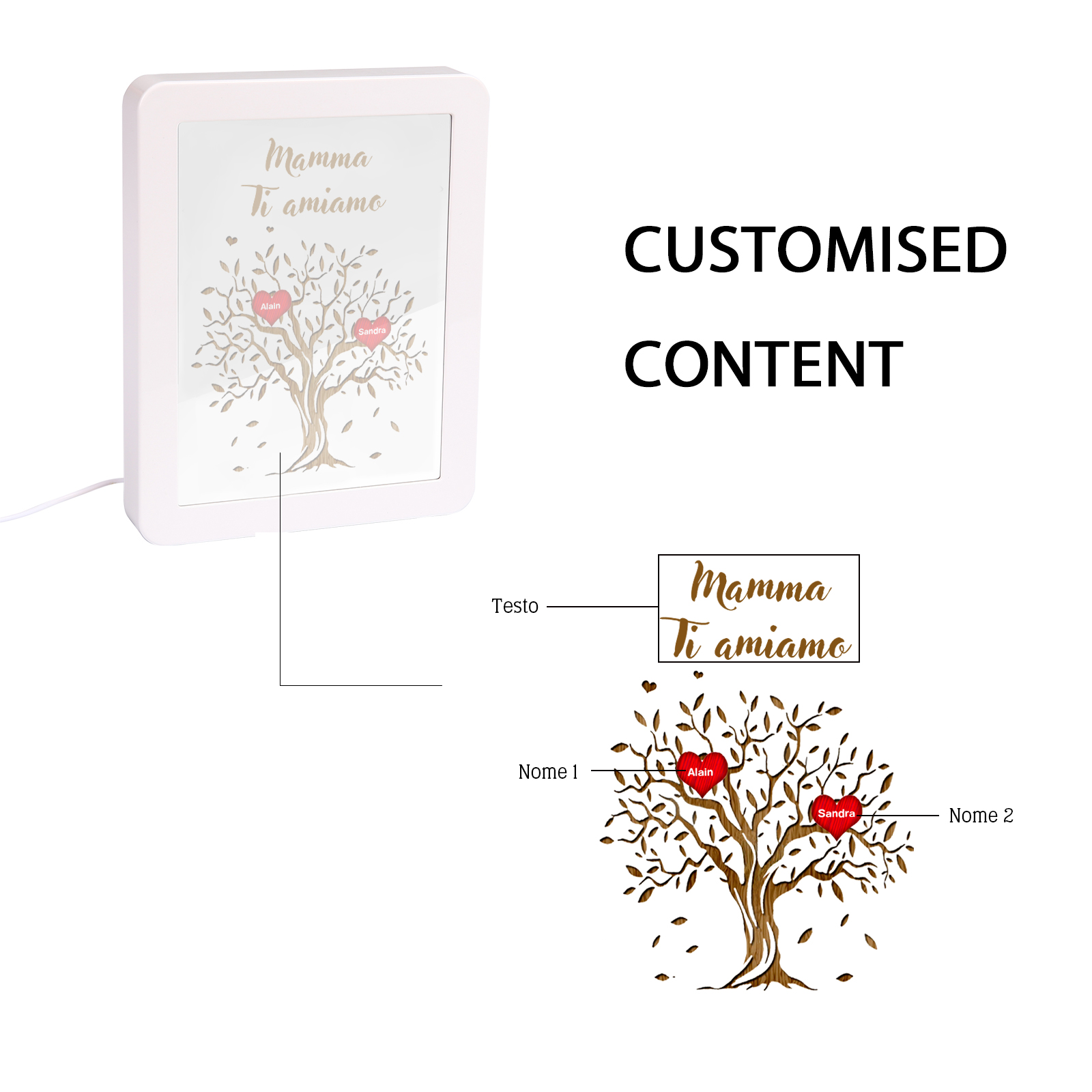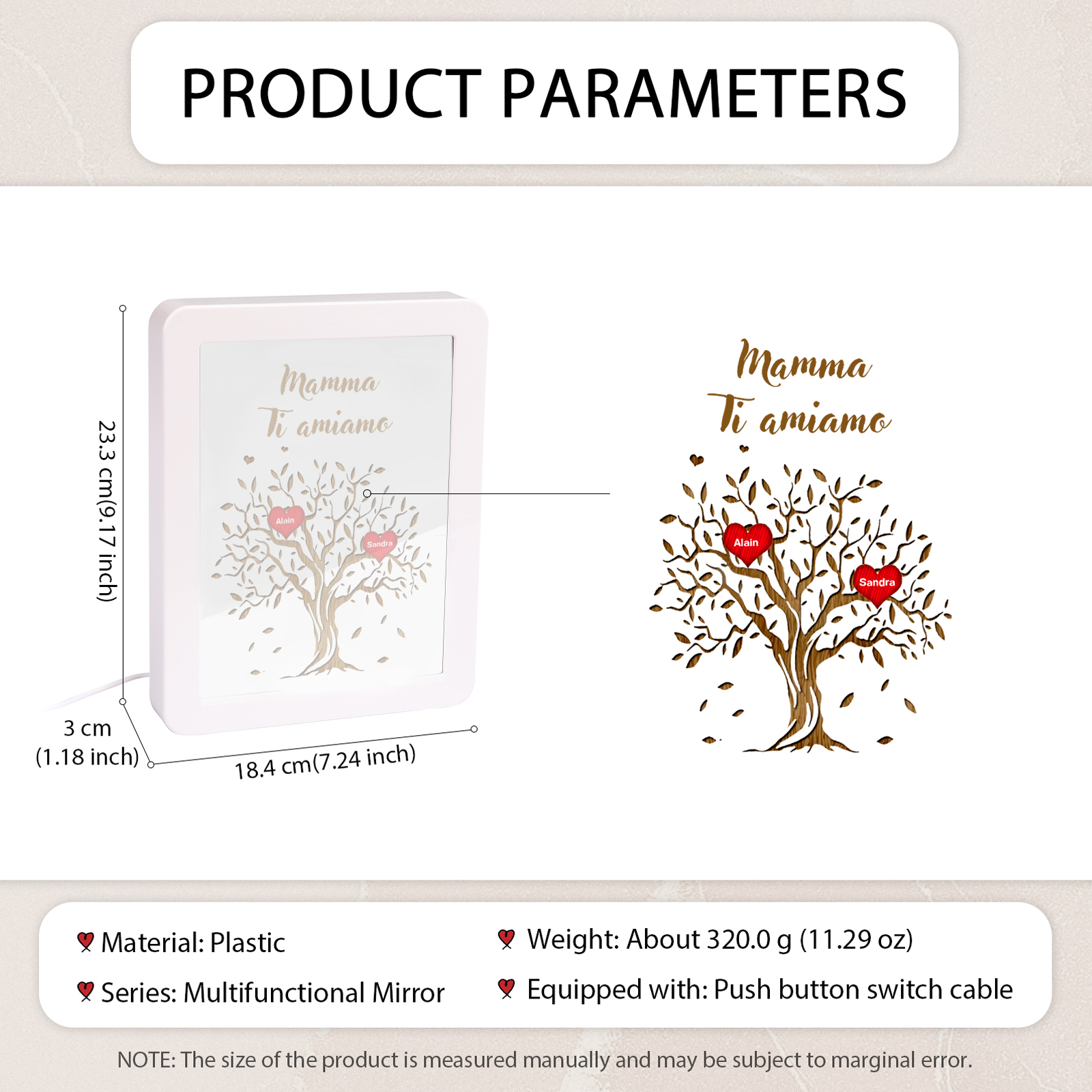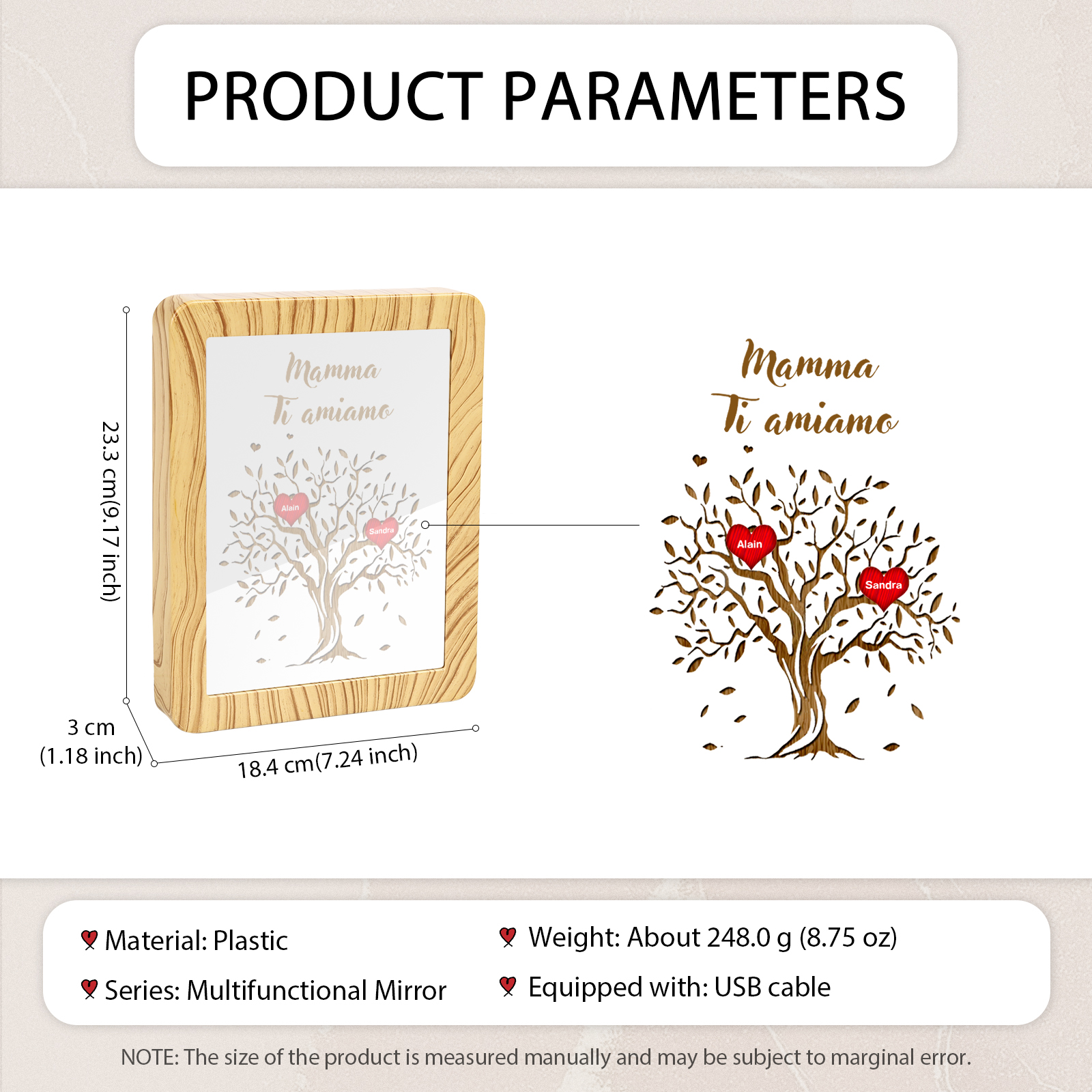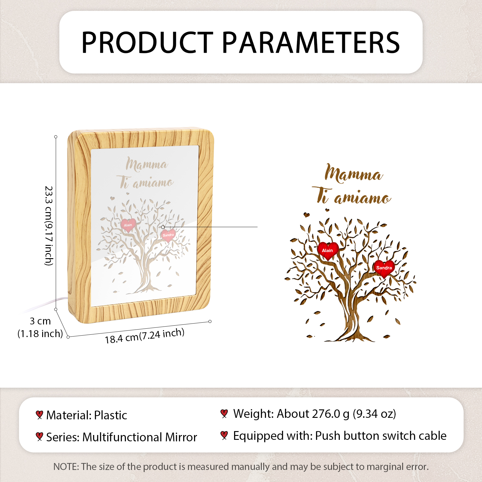 Cornice albero di cuore rosso con LED luce a tre colori 2 nomi e 1 testo personalizzati anche usati come specchio regalo per mamma/nonna