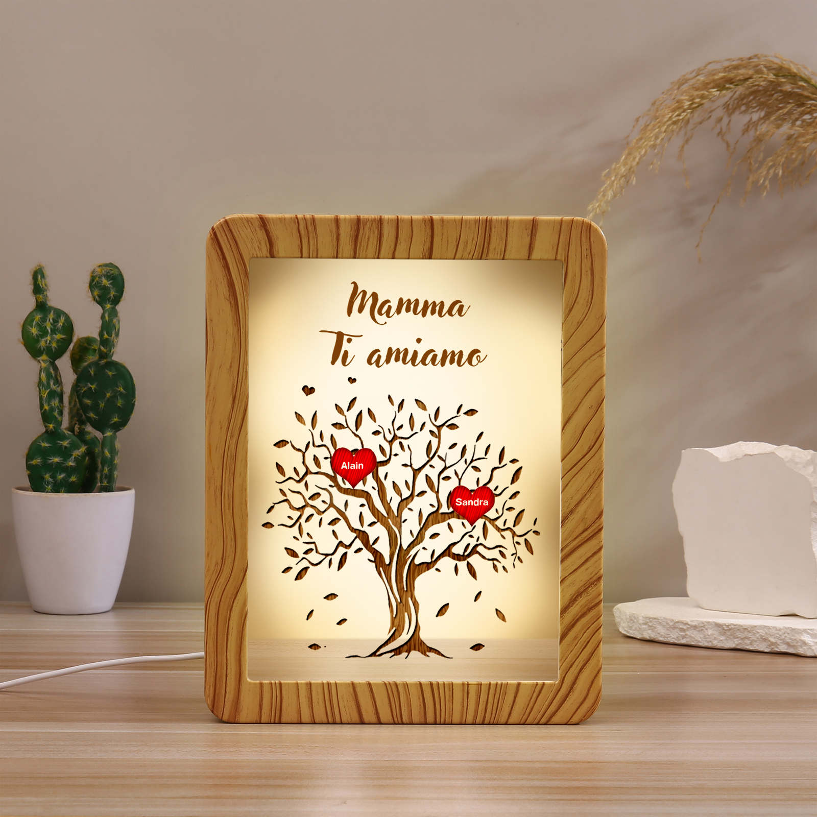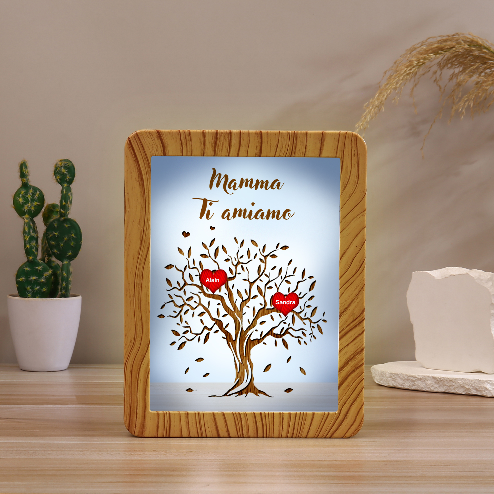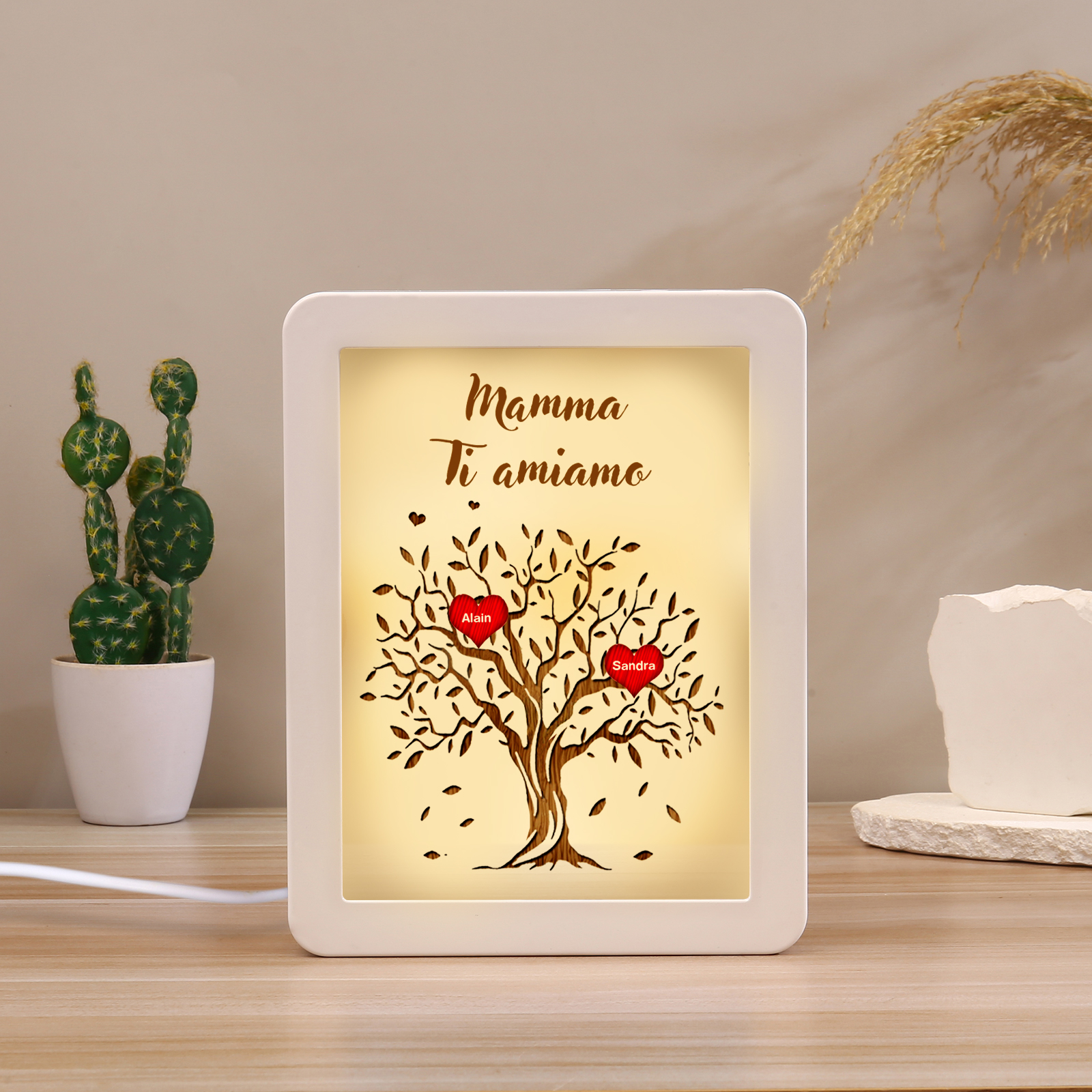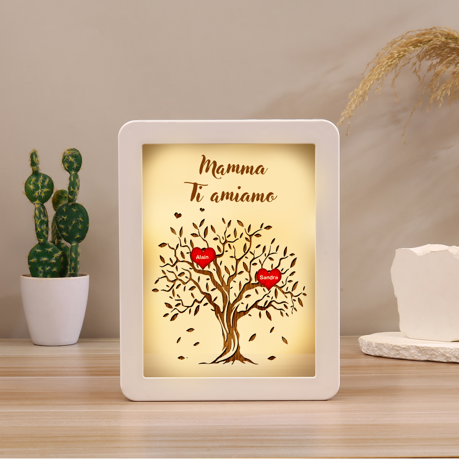 Cornice albero di cuore rosso con LED luce a tre colori 2 nomi e 1 testo personalizzati anche usati come specchio regalo per mamma/nonna