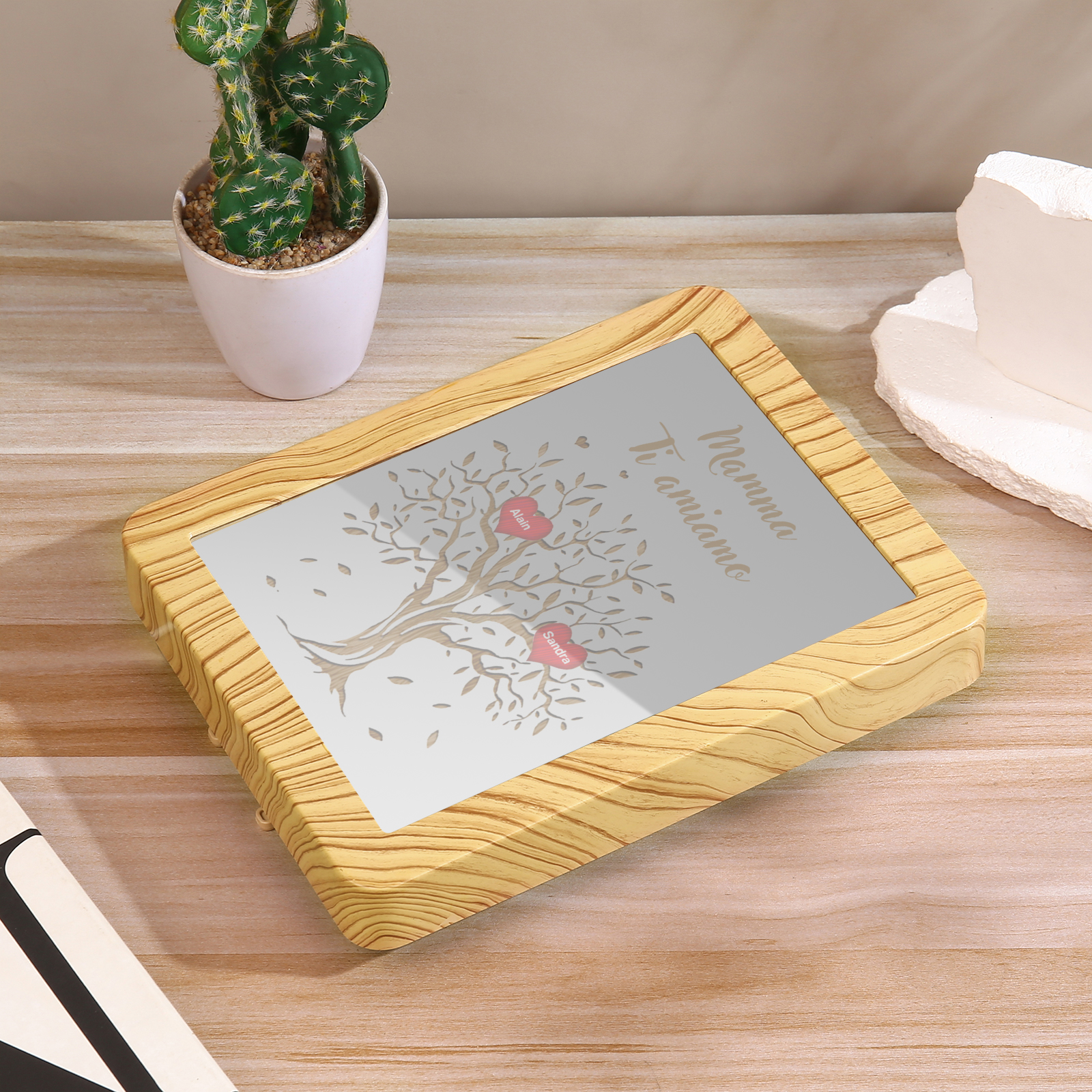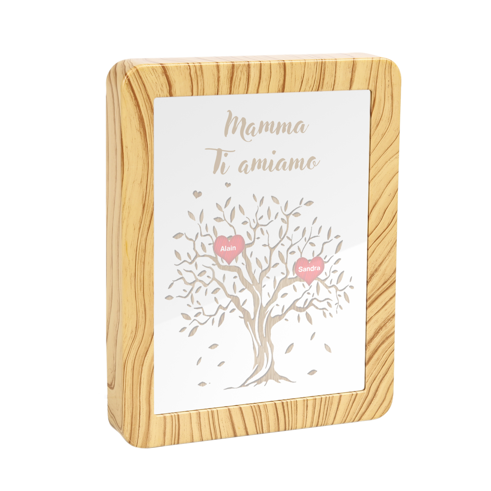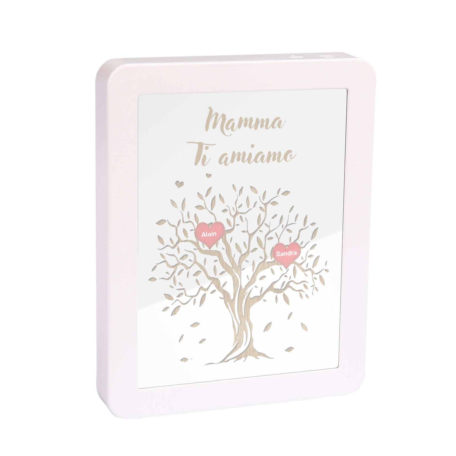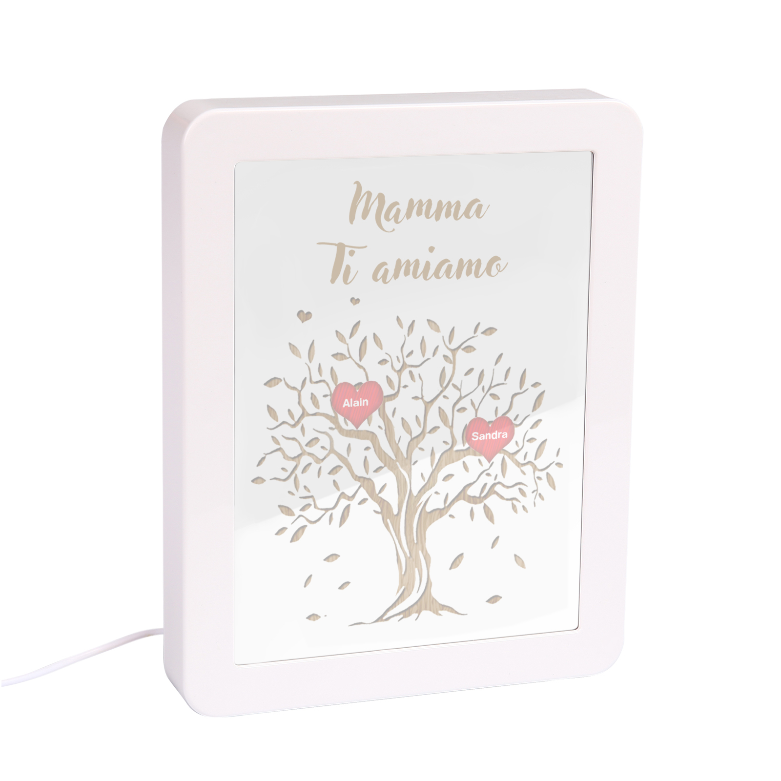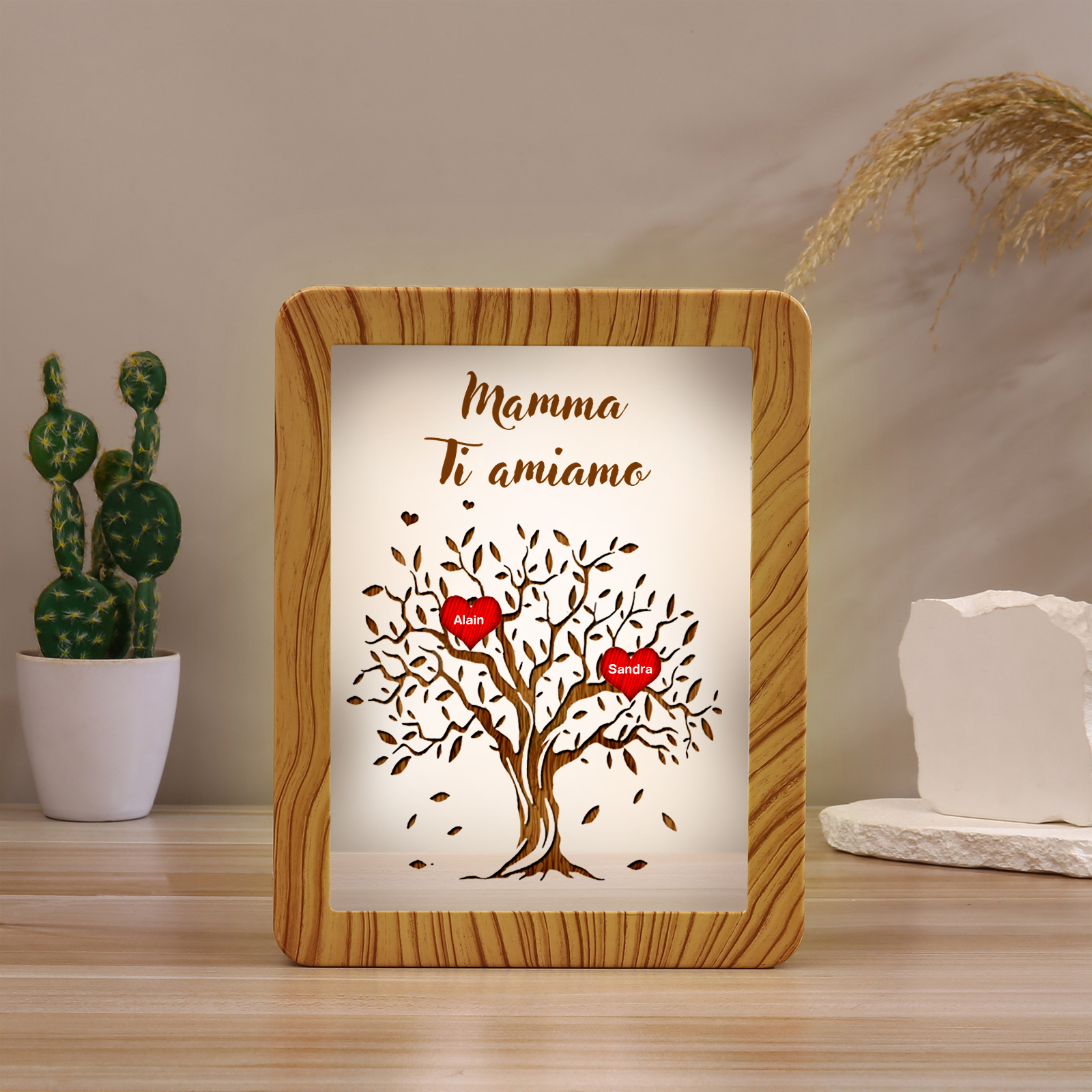 Cornice albero di cuore rosso con LED luce a tre colori 2 nomi e 1 testo personalizzati anche usati come specchio regalo per mamma/nonna