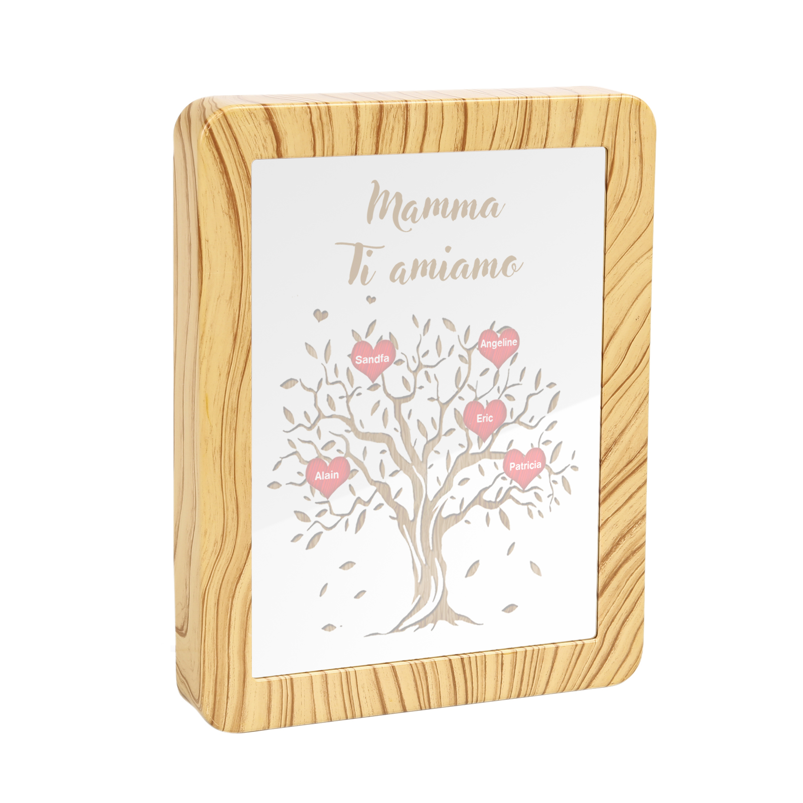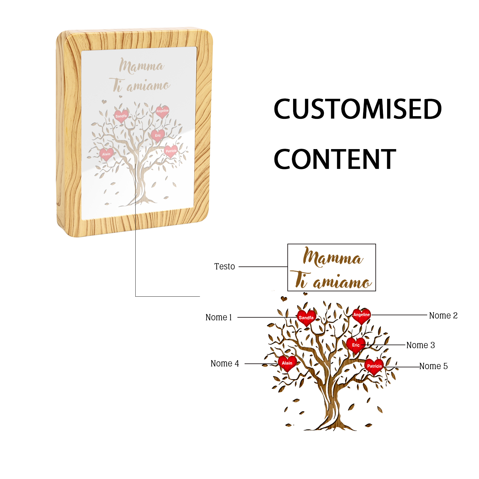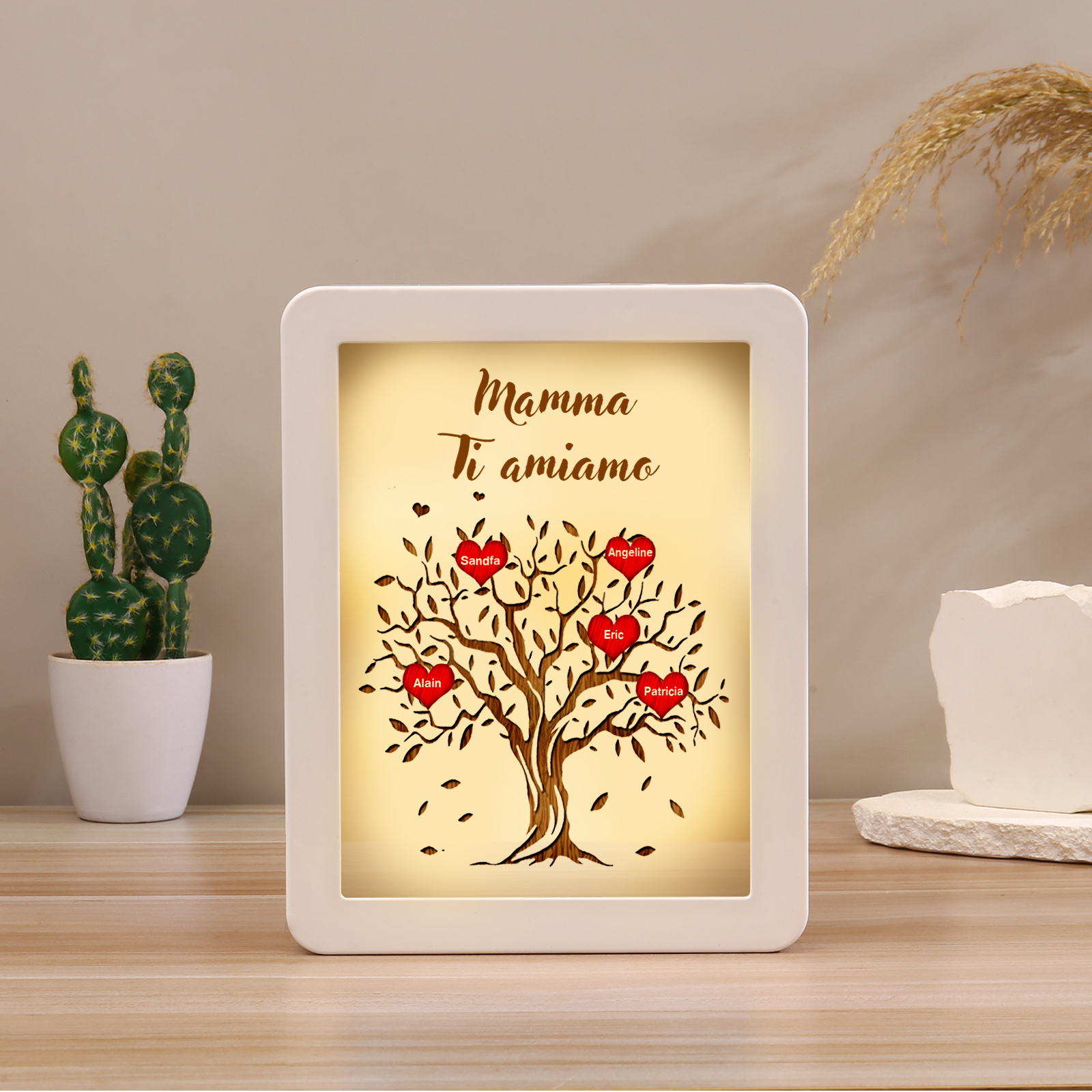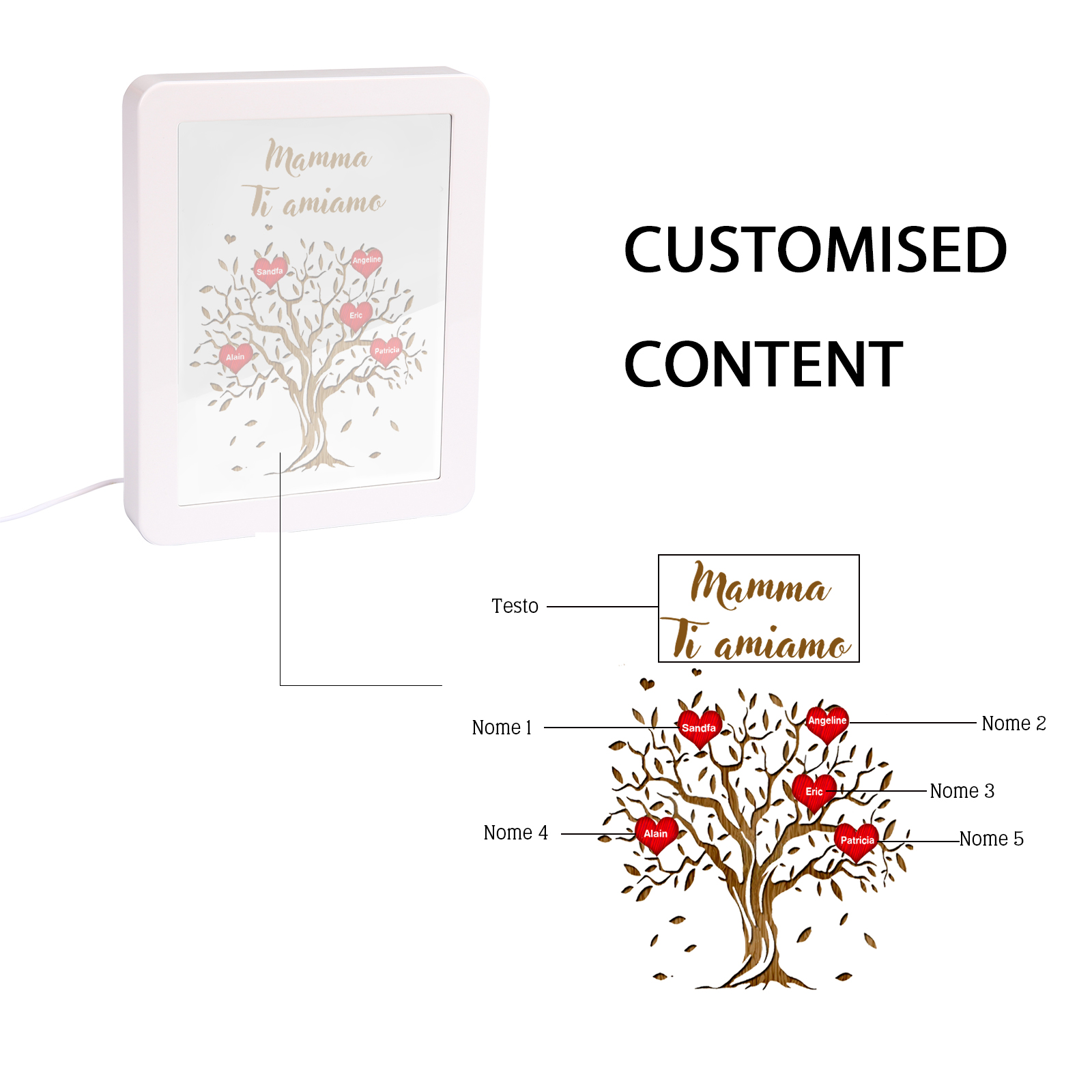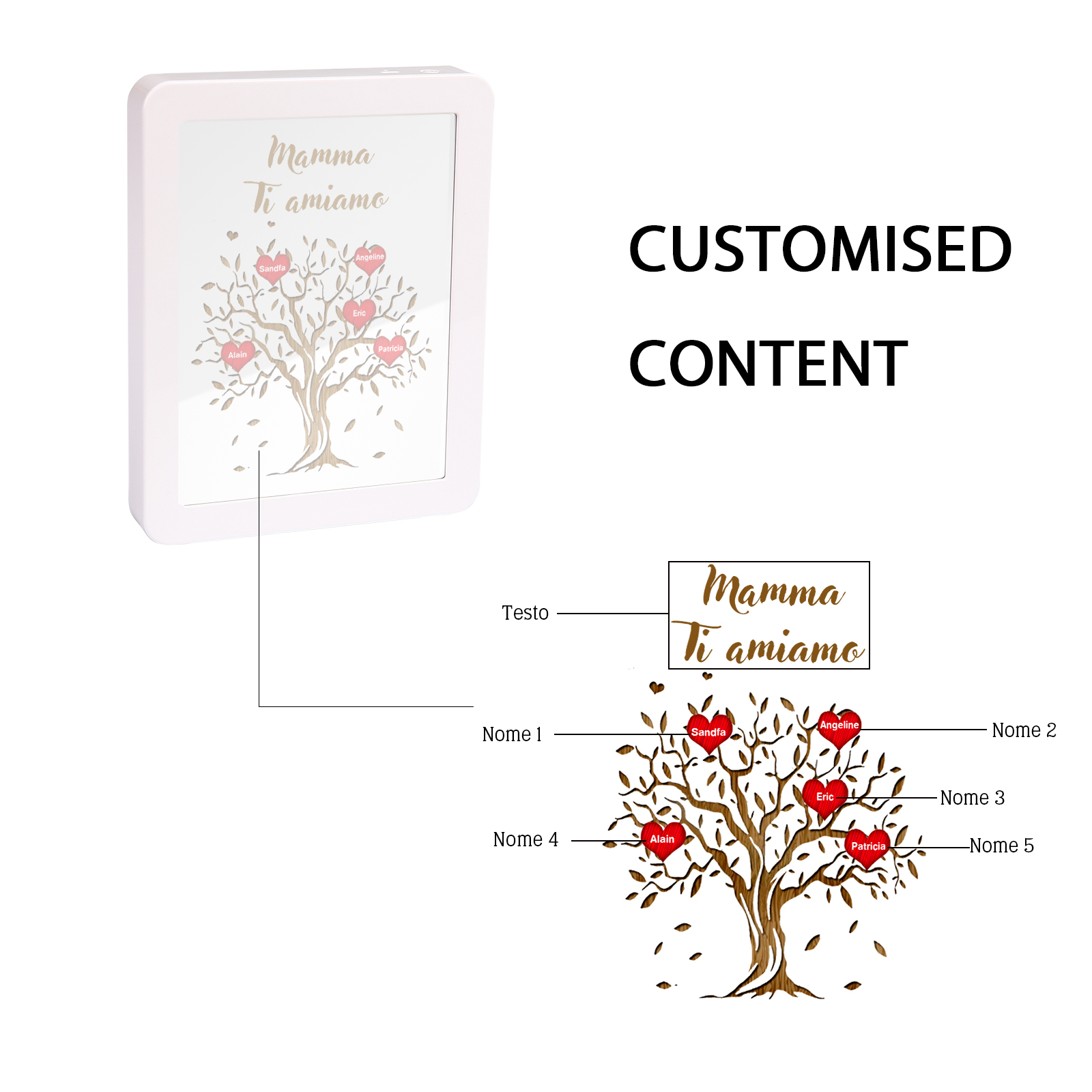Cornice albero di cuore rosso con LED luce a tre colori 5 nomi e 1 testo personalizzati anche usati come specchio regalo per mamma/nonna