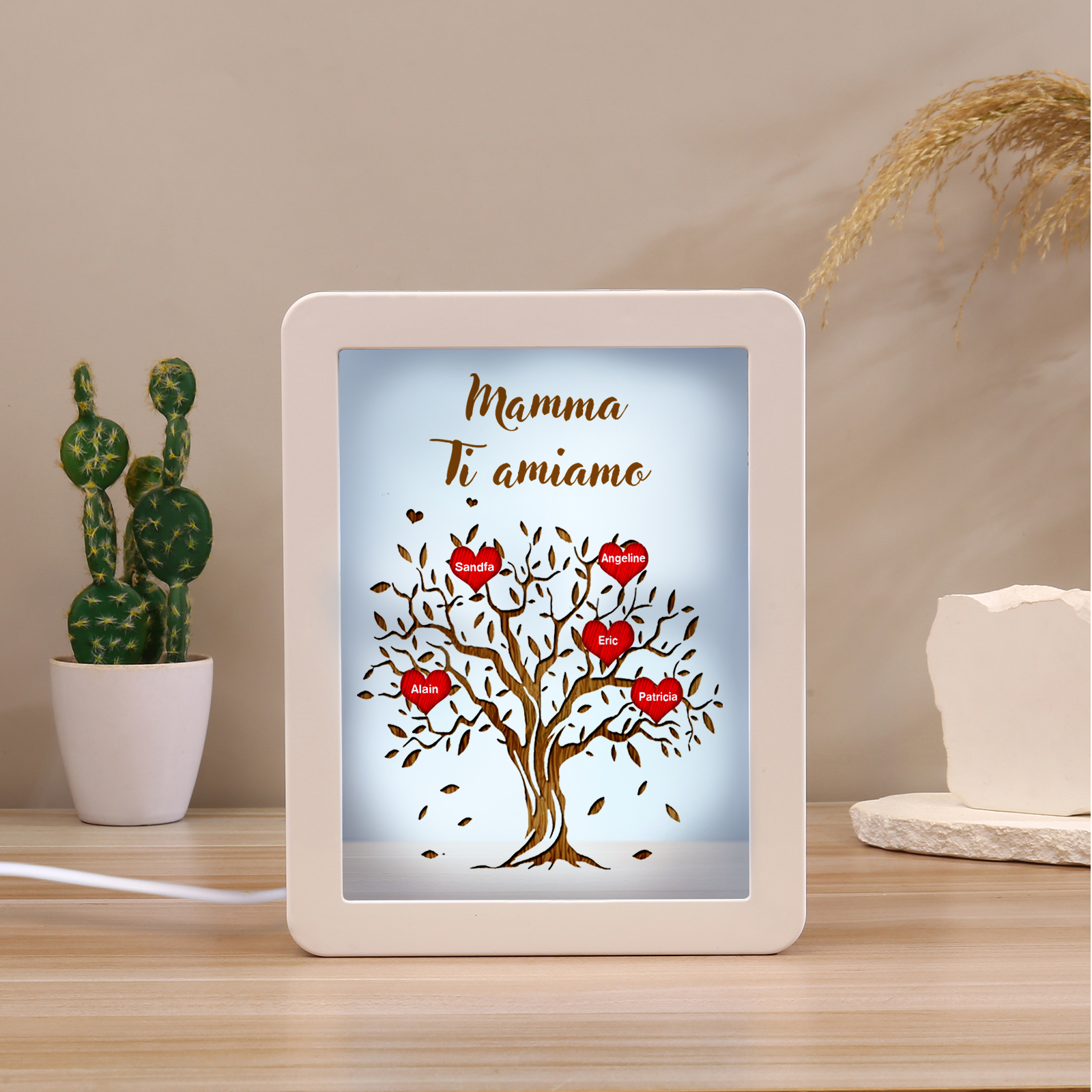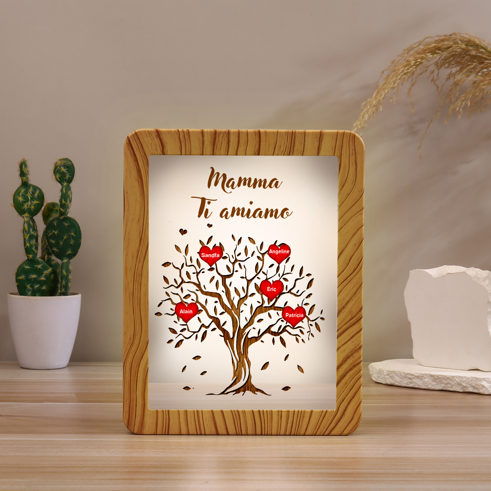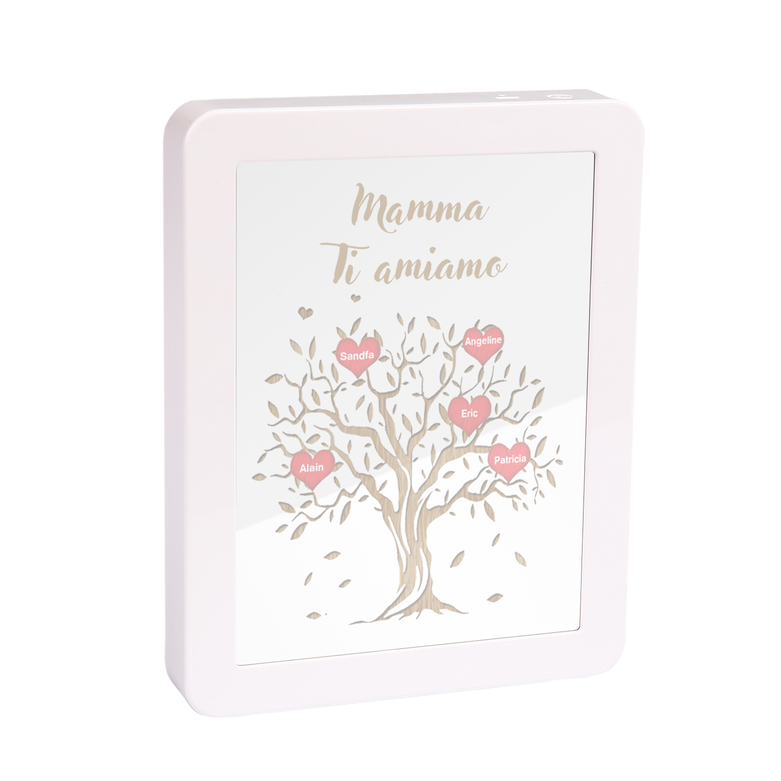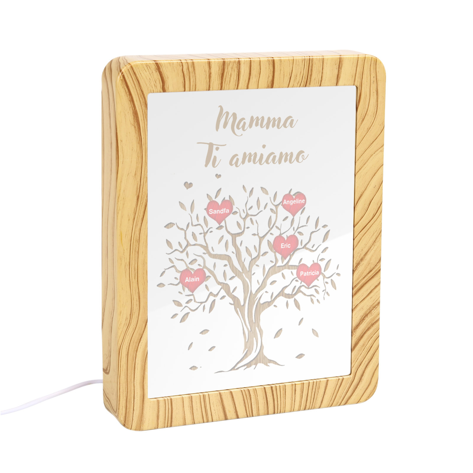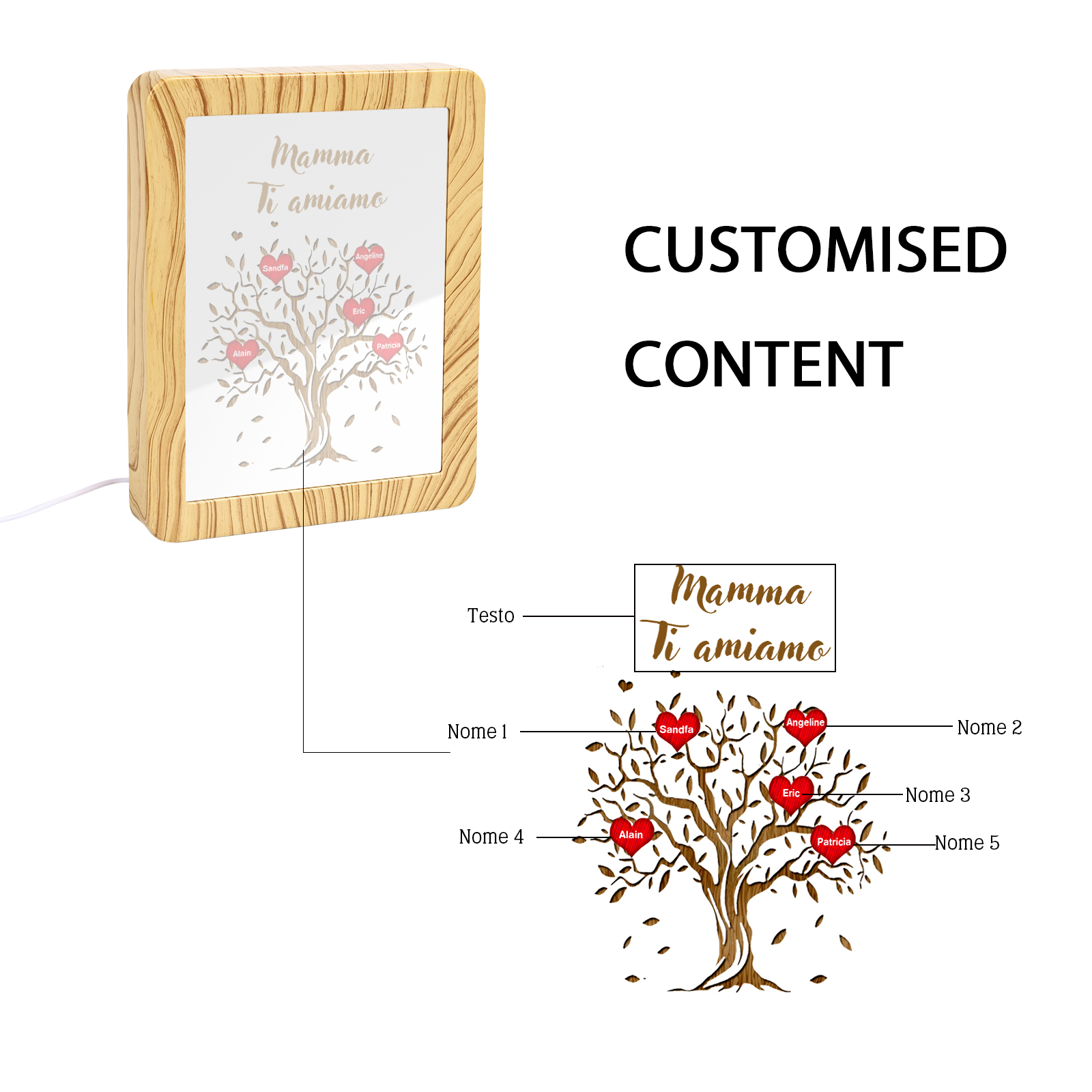 Cornice albero di cuore rosso con LED luce a tre colori 5 nomi e 1 testo personalizzati anche usati come specchio regalo per mamma/nonna