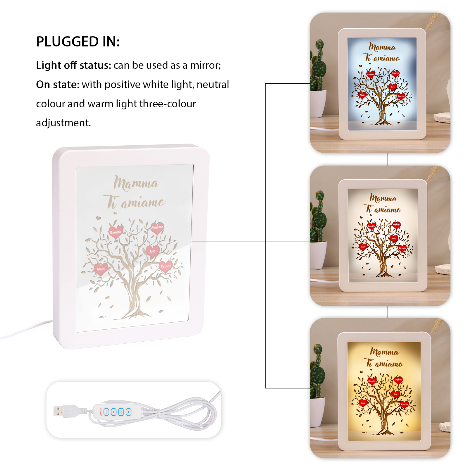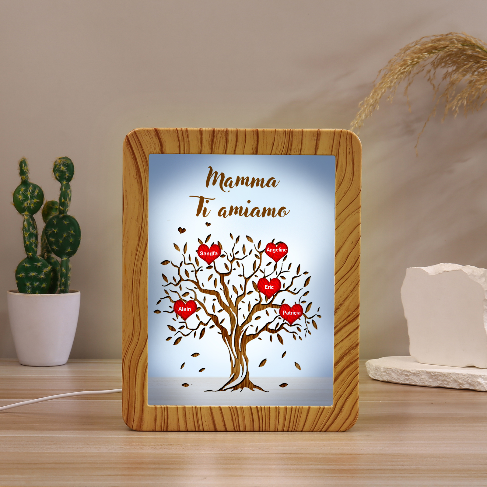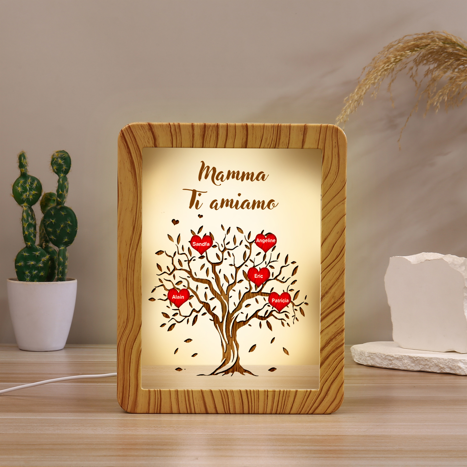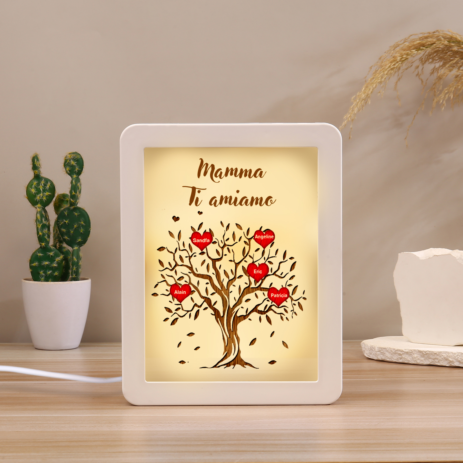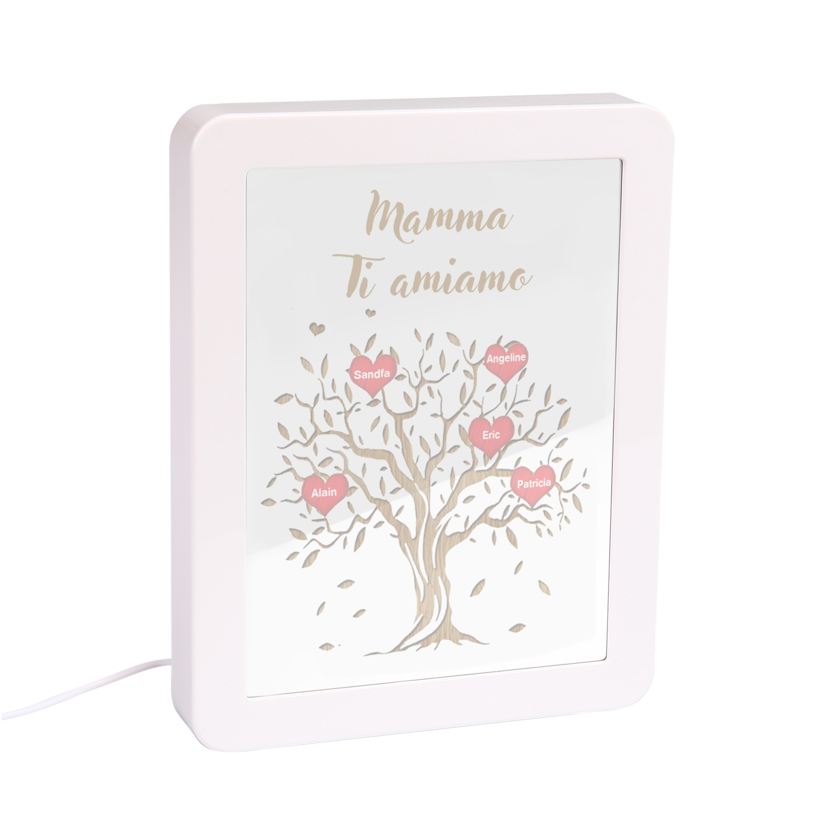 Cornice albero di cuore rosso con LED luce a tre colori 5 nomi e 1 testo personalizzati anche usati come specchio regalo per mamma/nonna