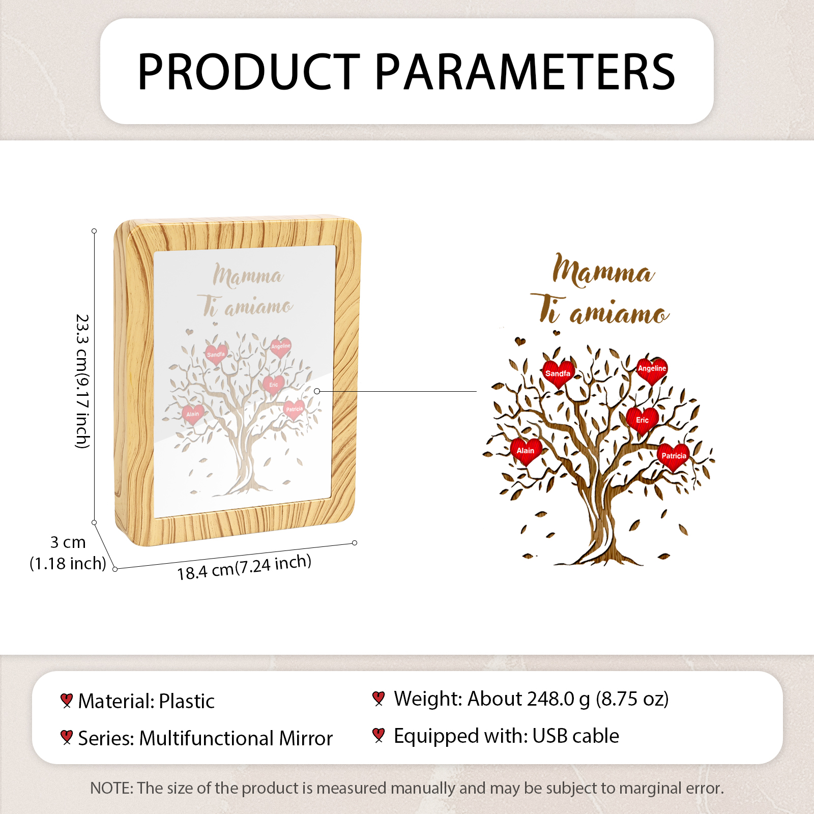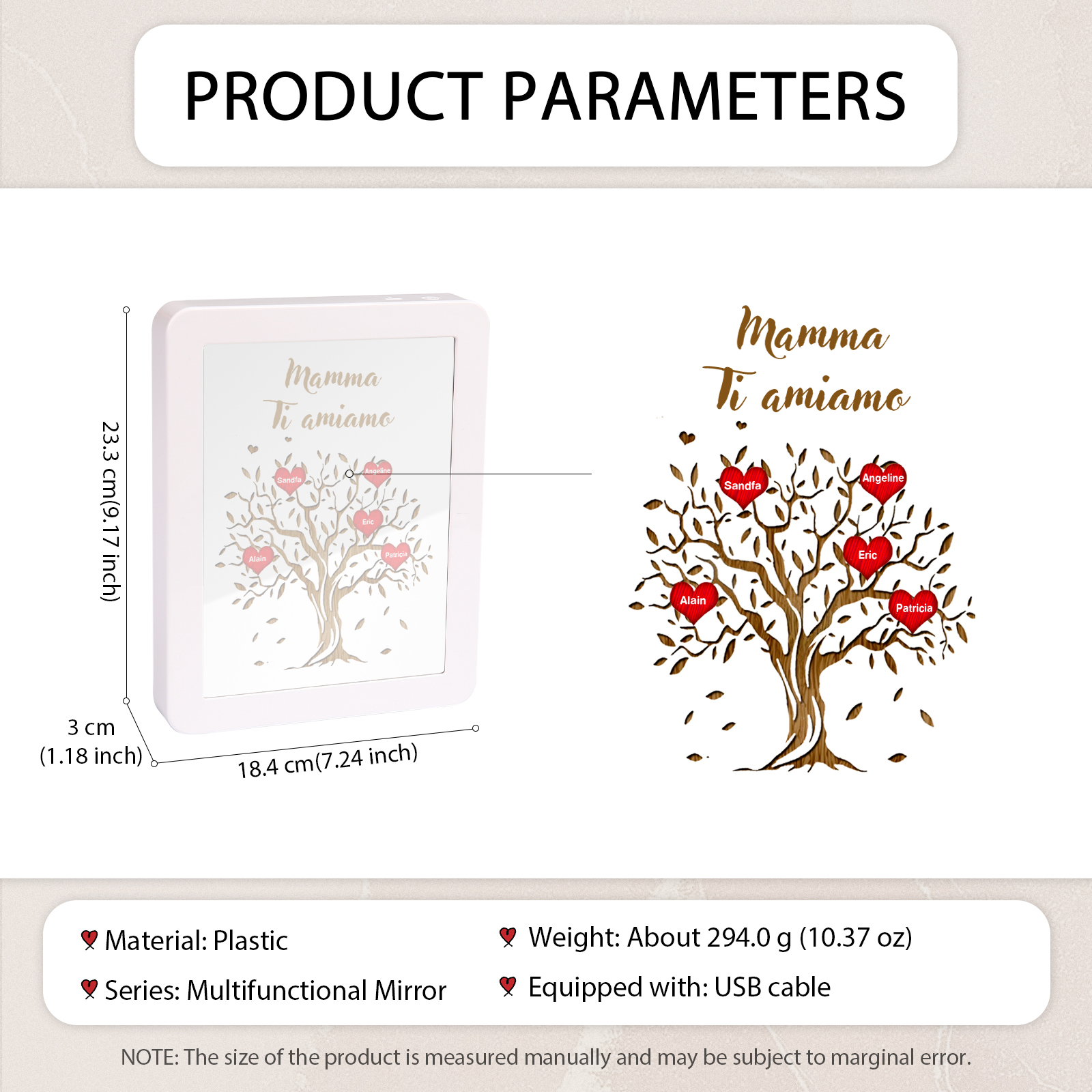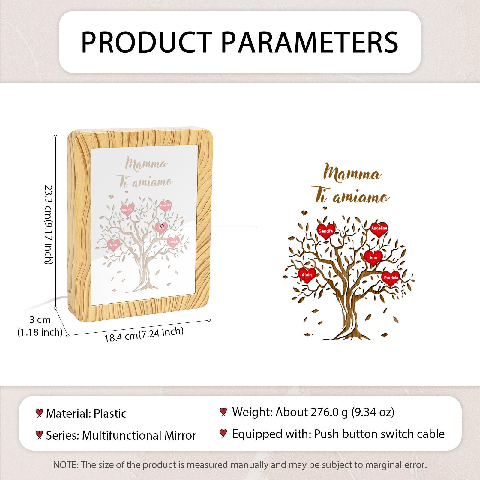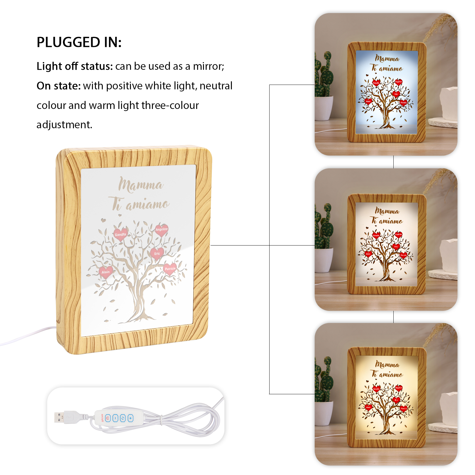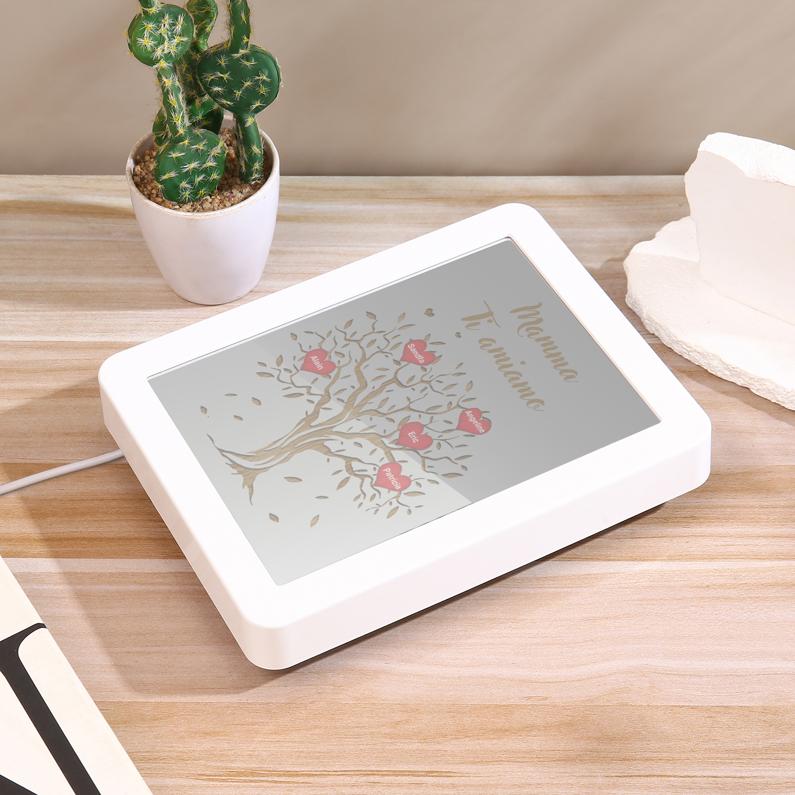 Cornice albero di cuore rosso con LED luce a tre colori 5 nomi e 1 testo personalizzati anche usati come specchio regalo per mamma/nonna