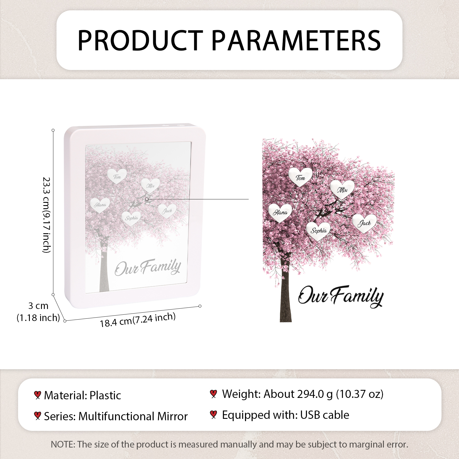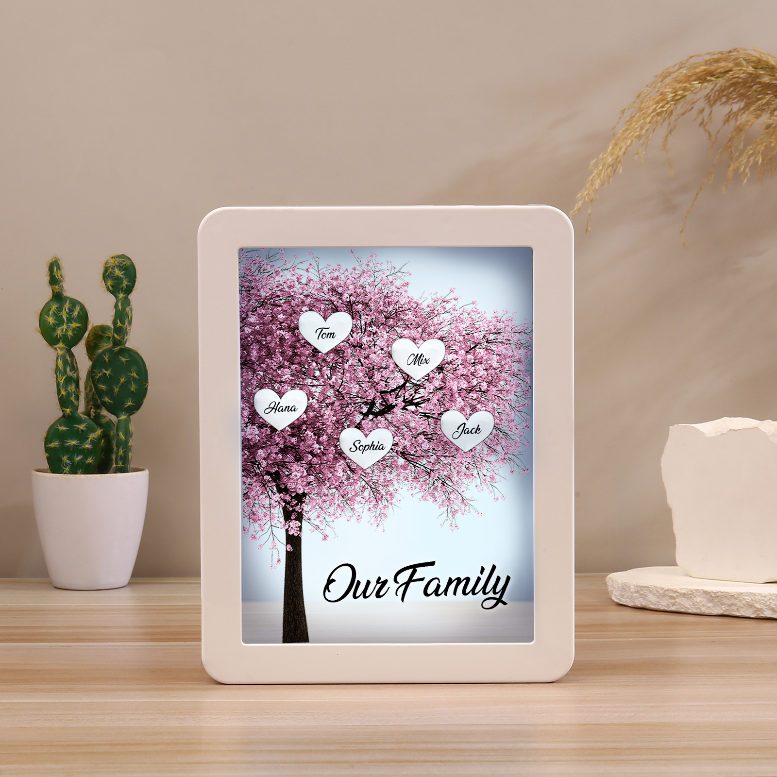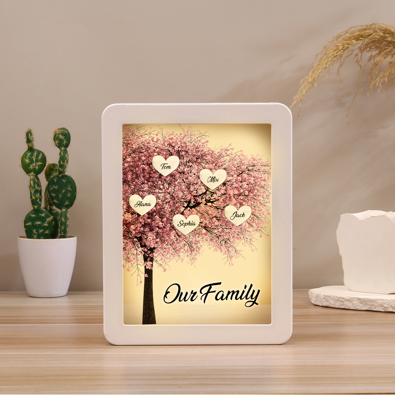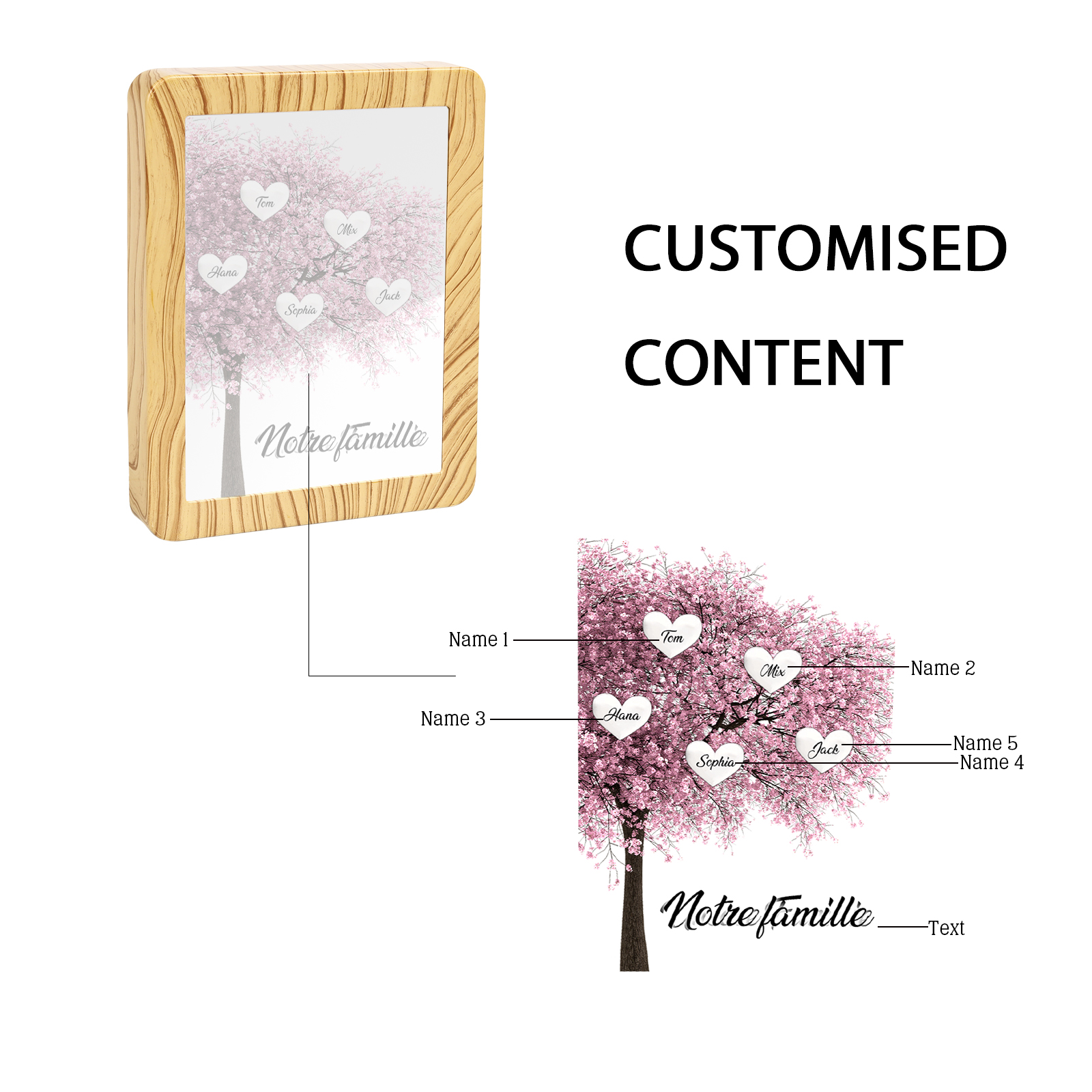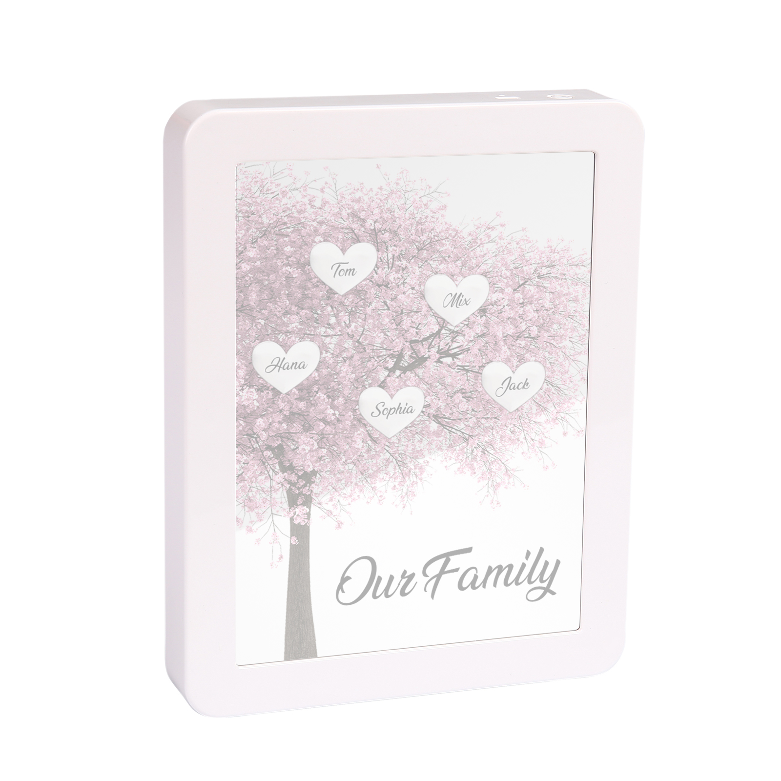 Cornice albero rosa di cuore con LED luce a tre colori 5 nomi e 1 testo personalizzati anche usato come specchio regalo per mamma/nonna