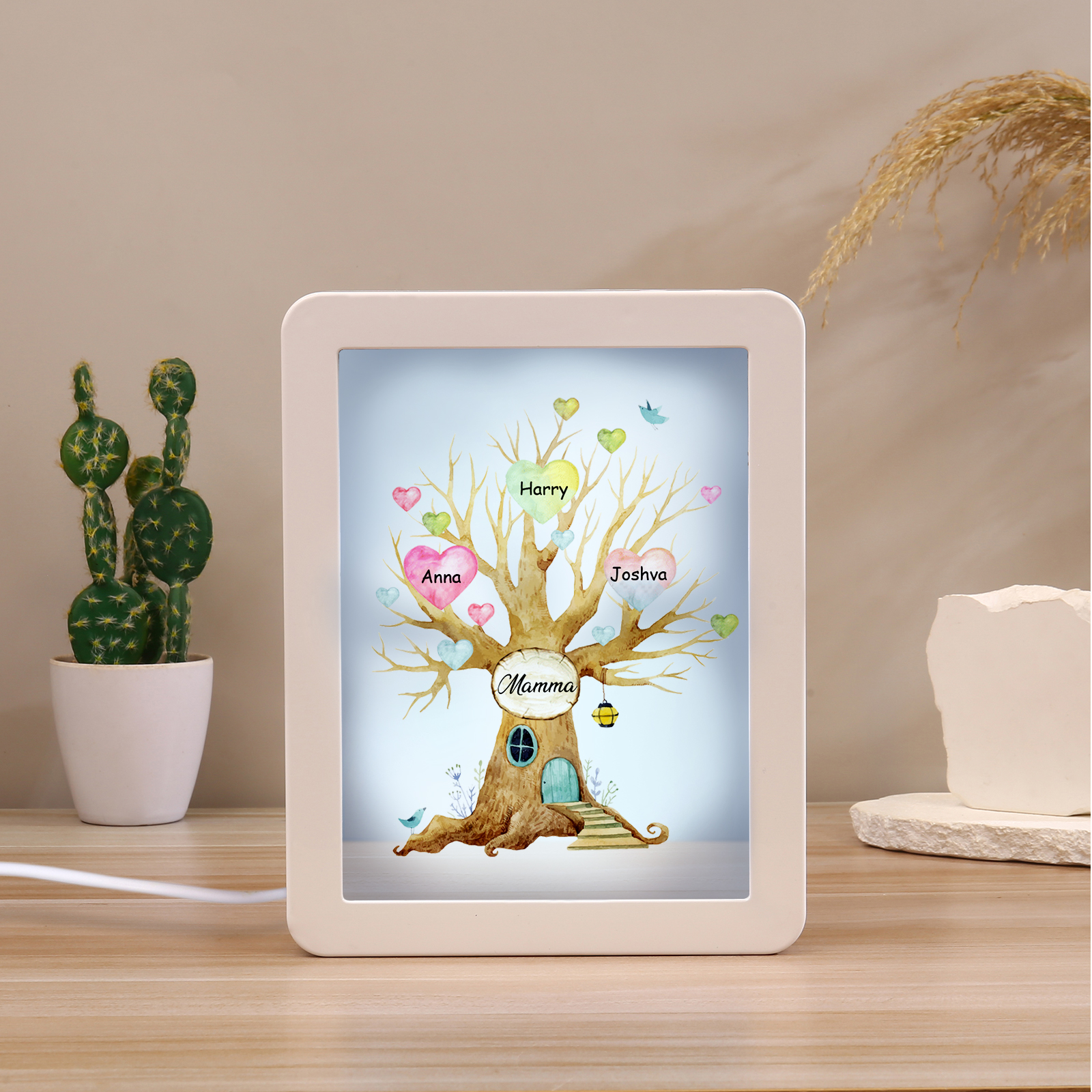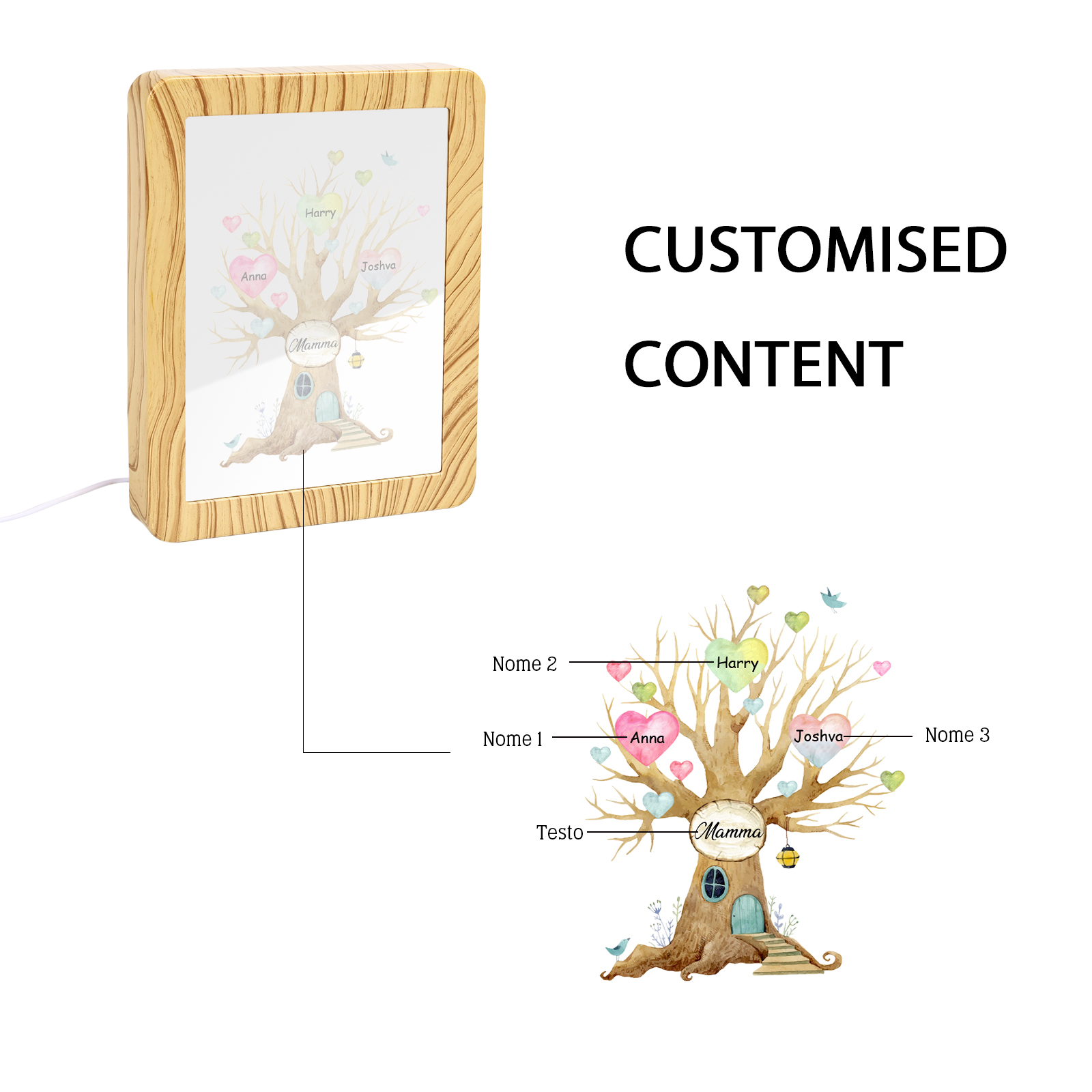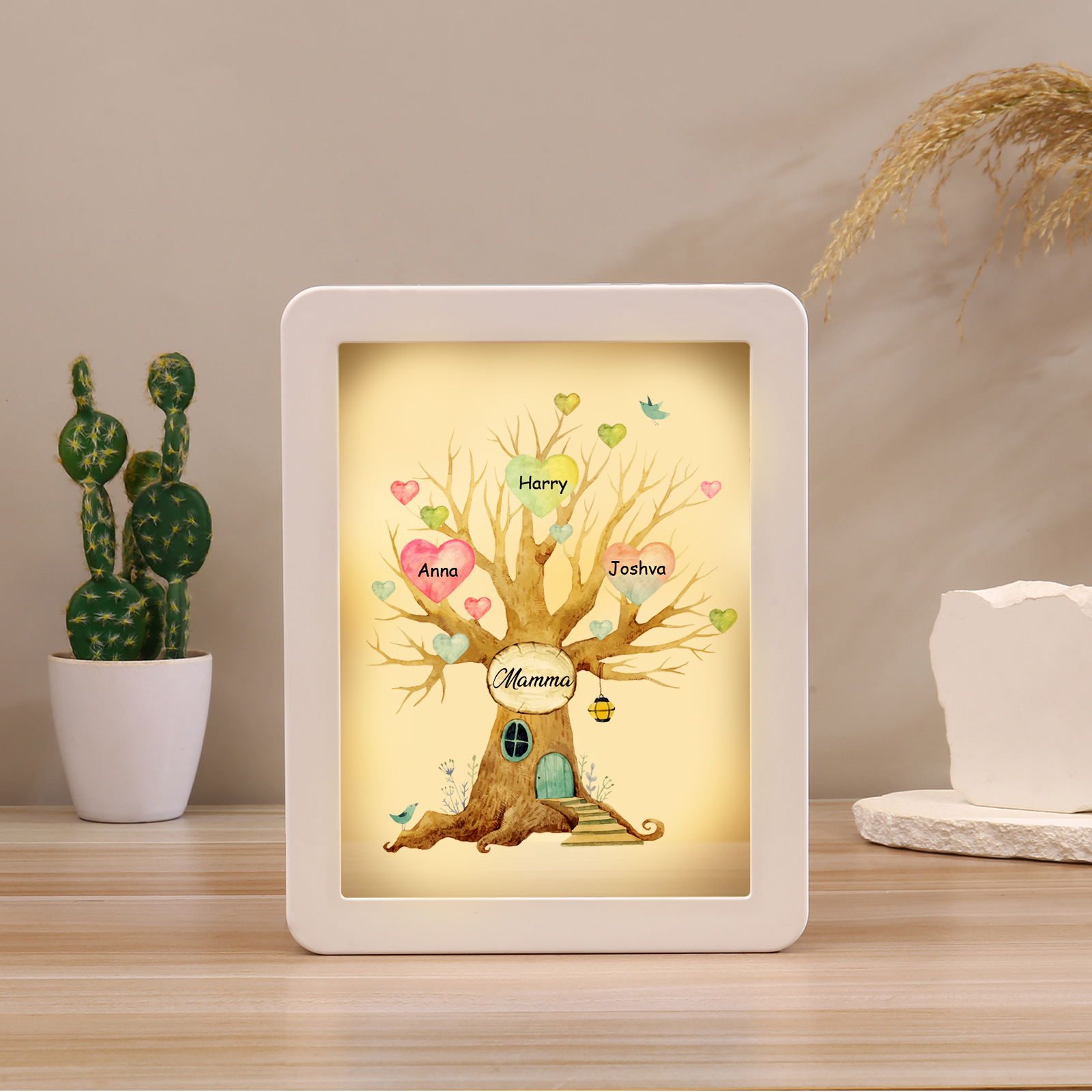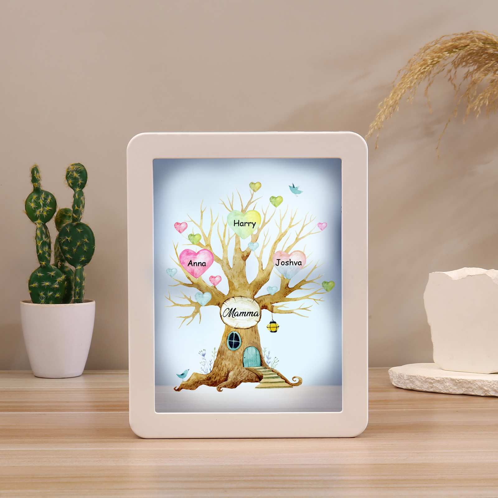 Cornice casa d'albero con LED luce a tre colori 3 nomi e 1 testo personalizzati anche usati come specchio regalo per mamma/nonna