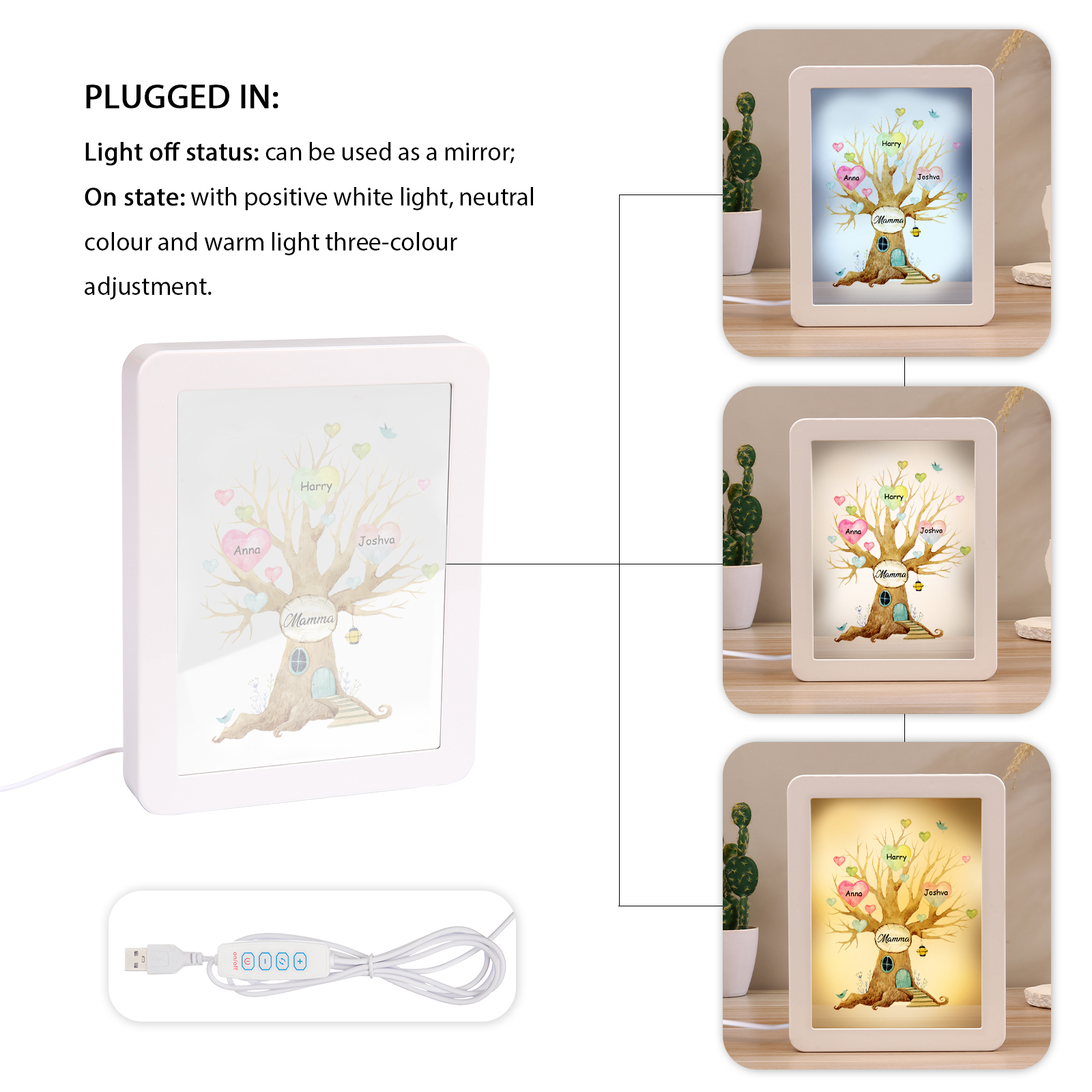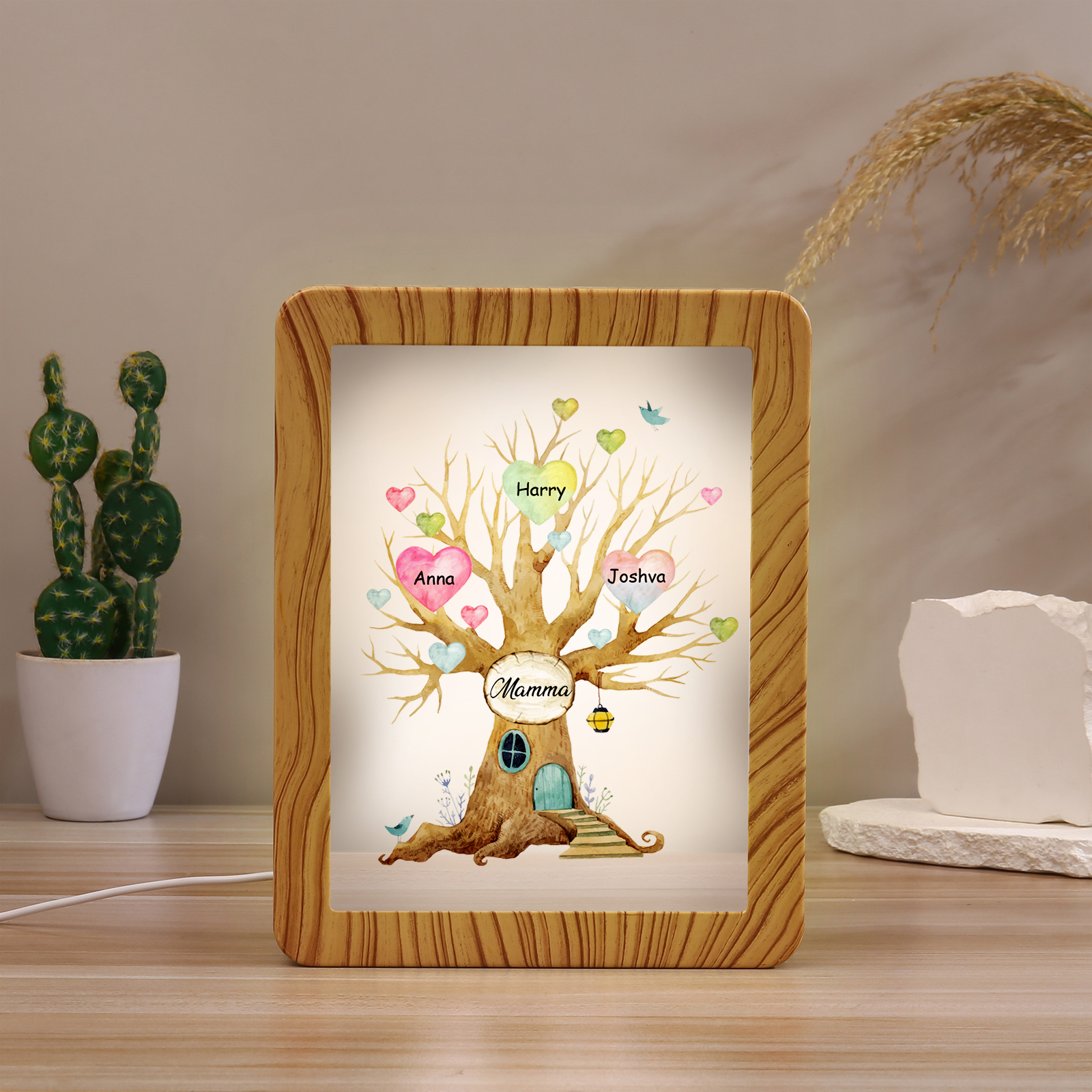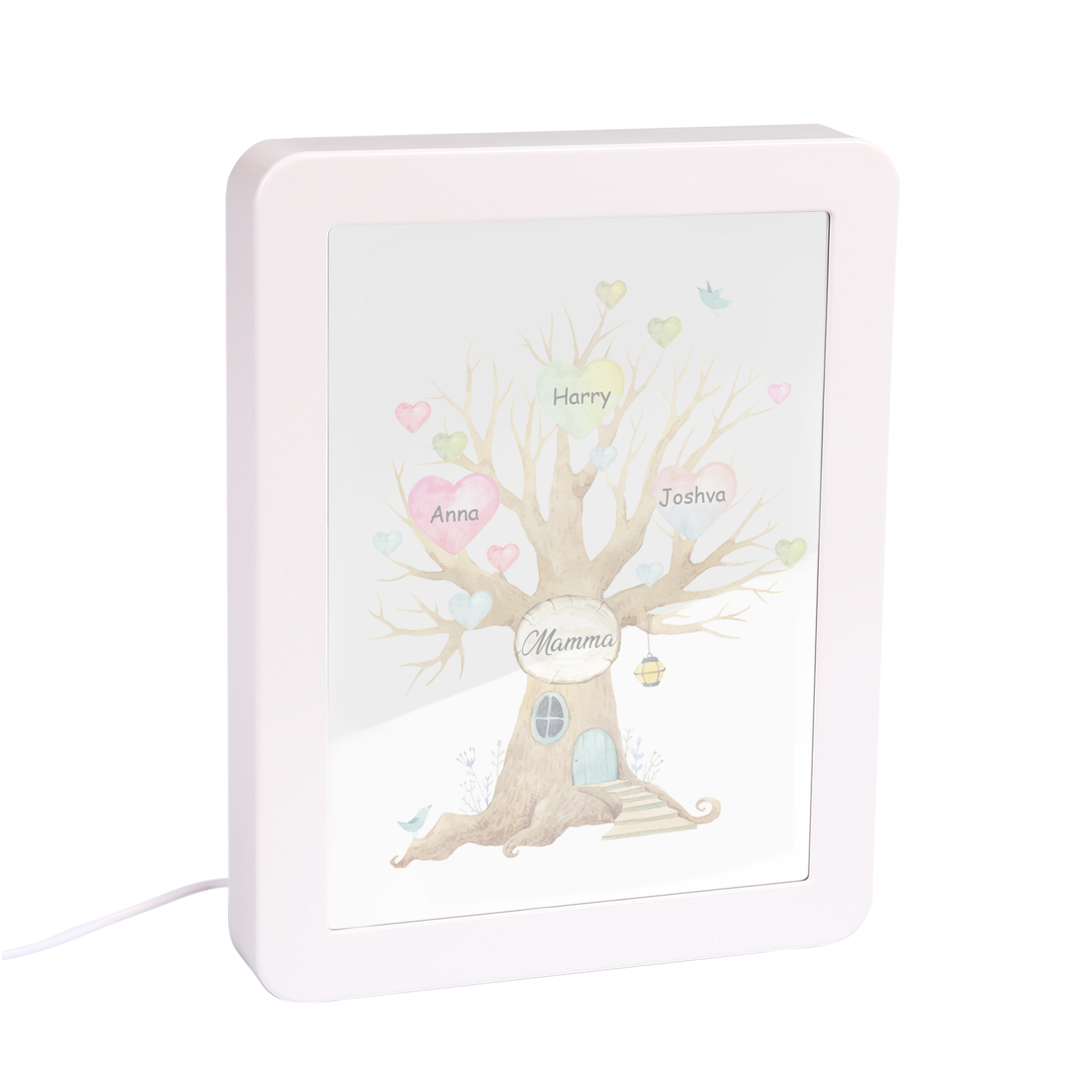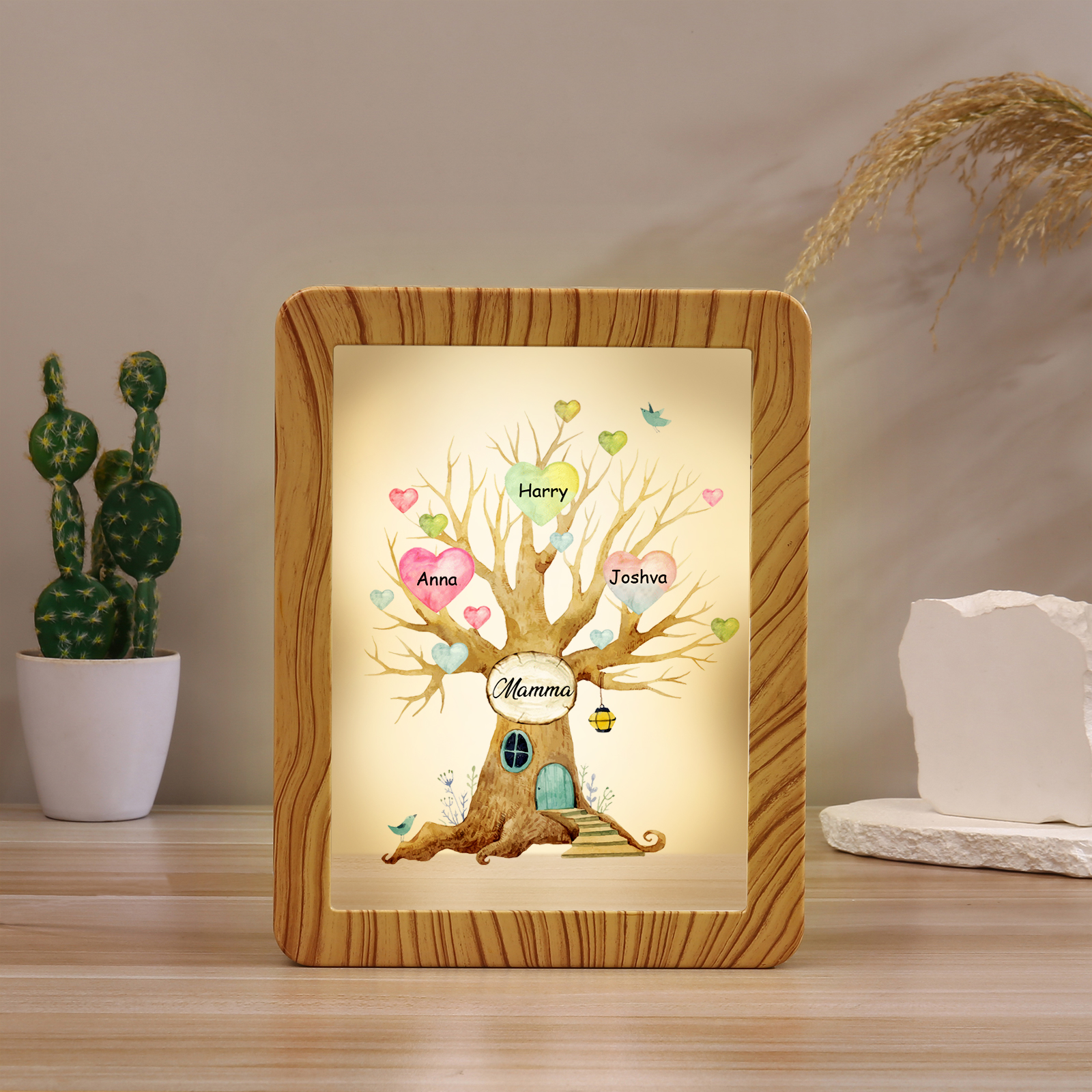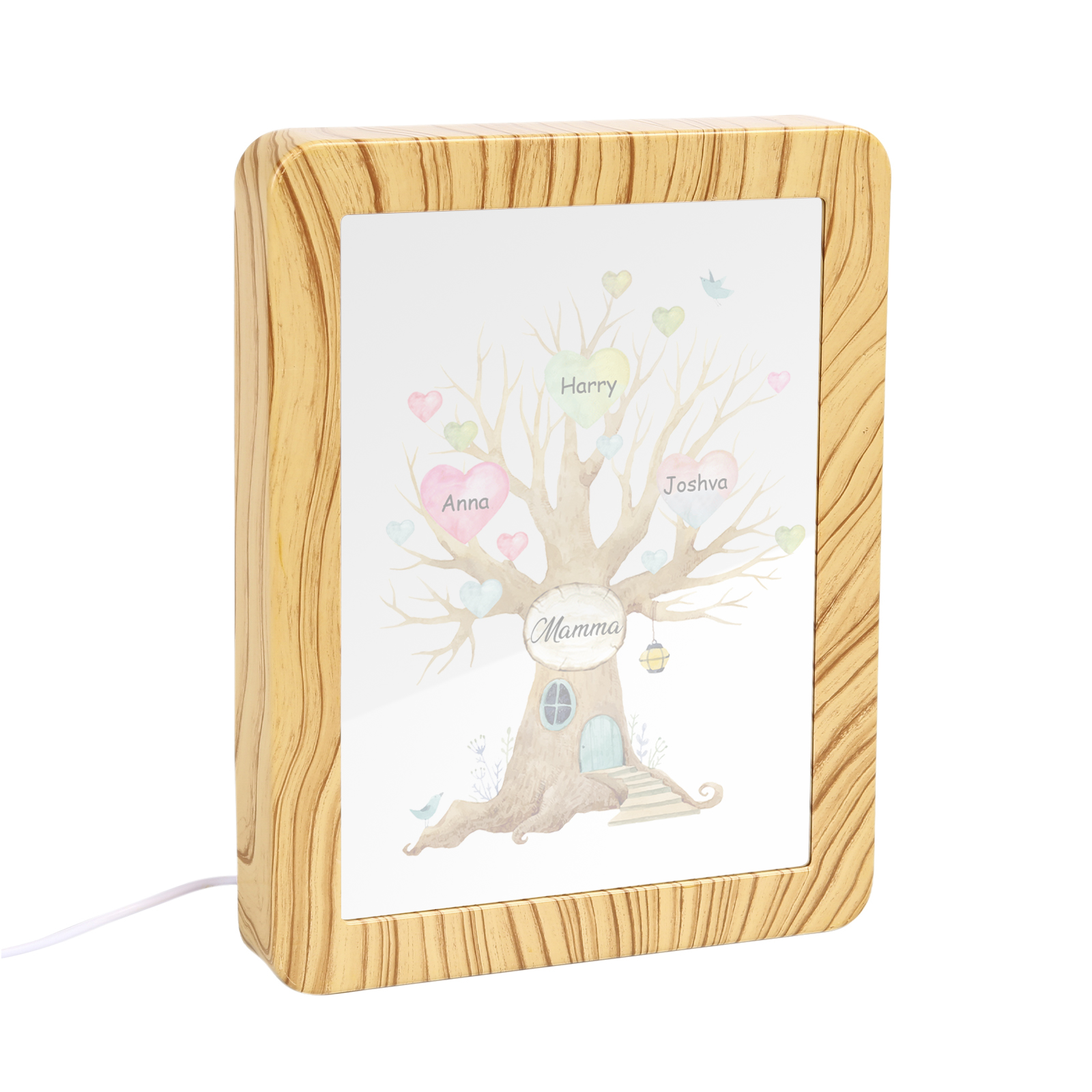 Cornice casa d'albero con LED luce a tre colori 3 nomi e 1 testo personalizzati anche usati come specchio regalo per mamma/nonna