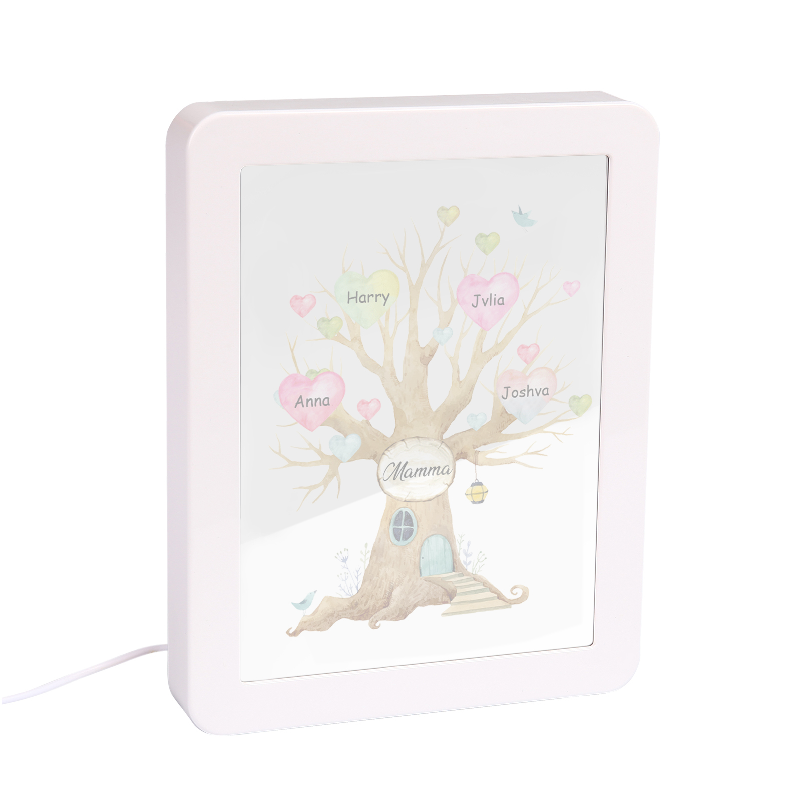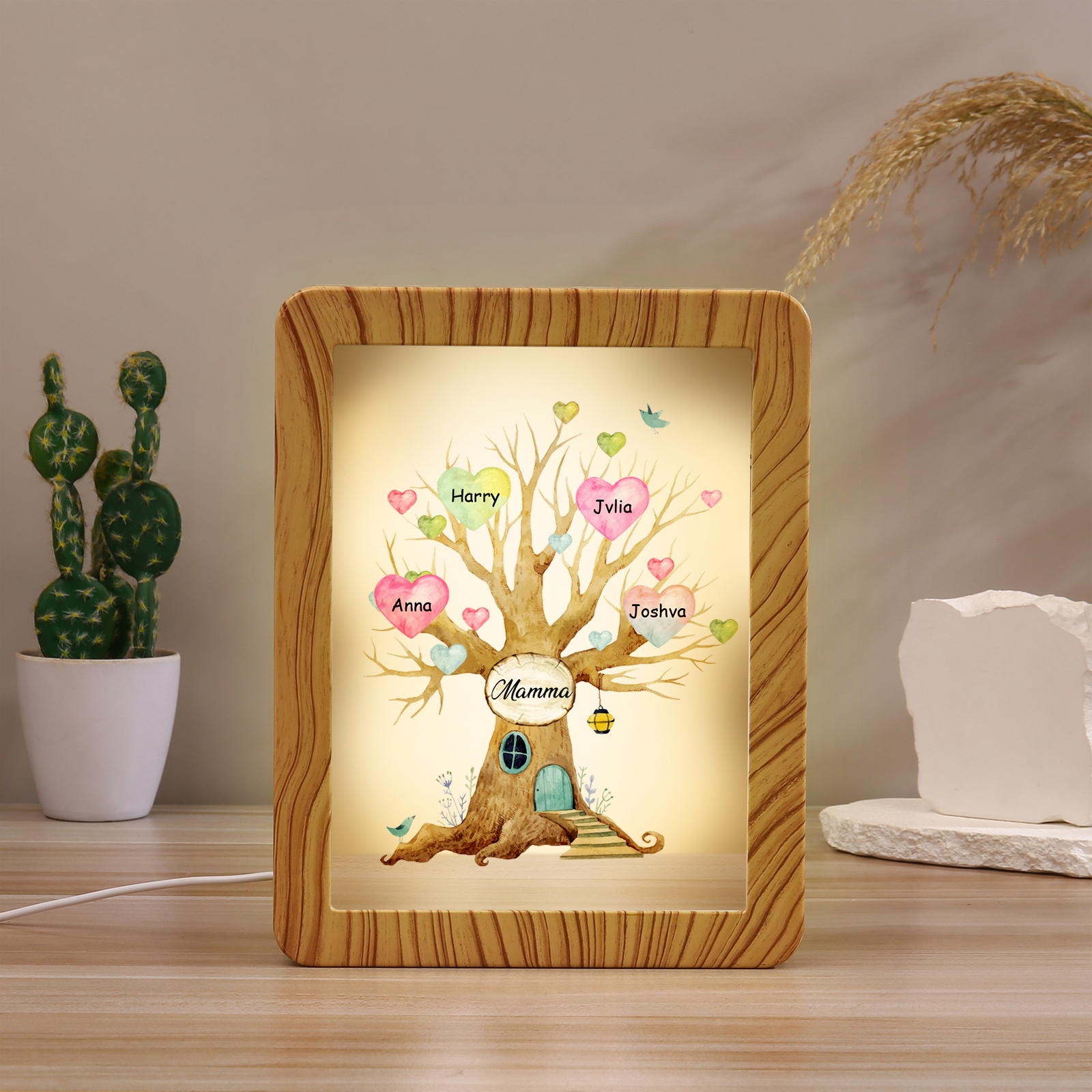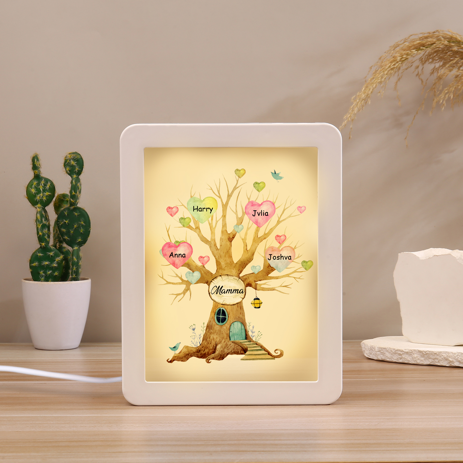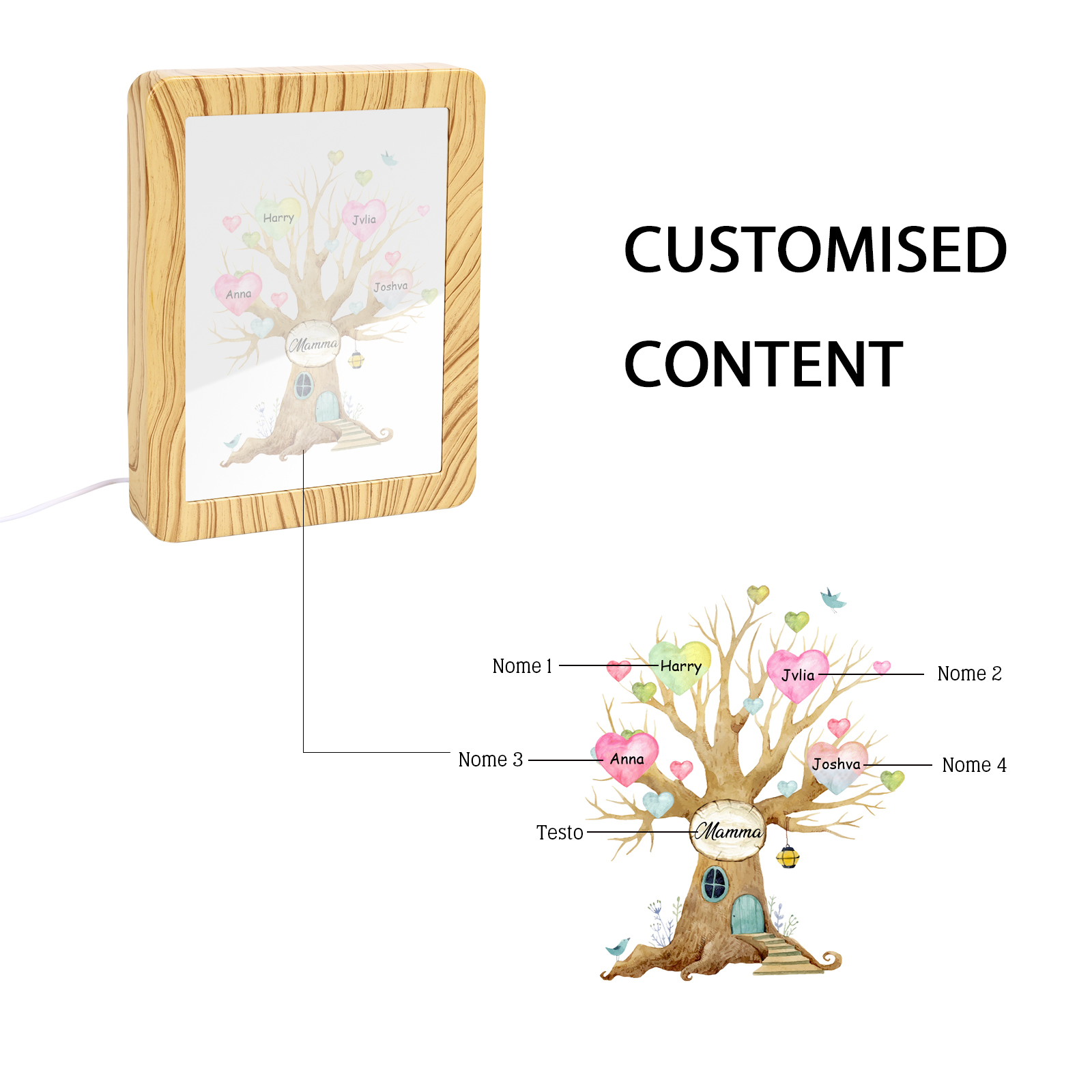 Cornice casa d'albero con LED luce a tre colori 4 nomi e 1 testo personalizzati anche usati come specchio regalo per mamma/nonna