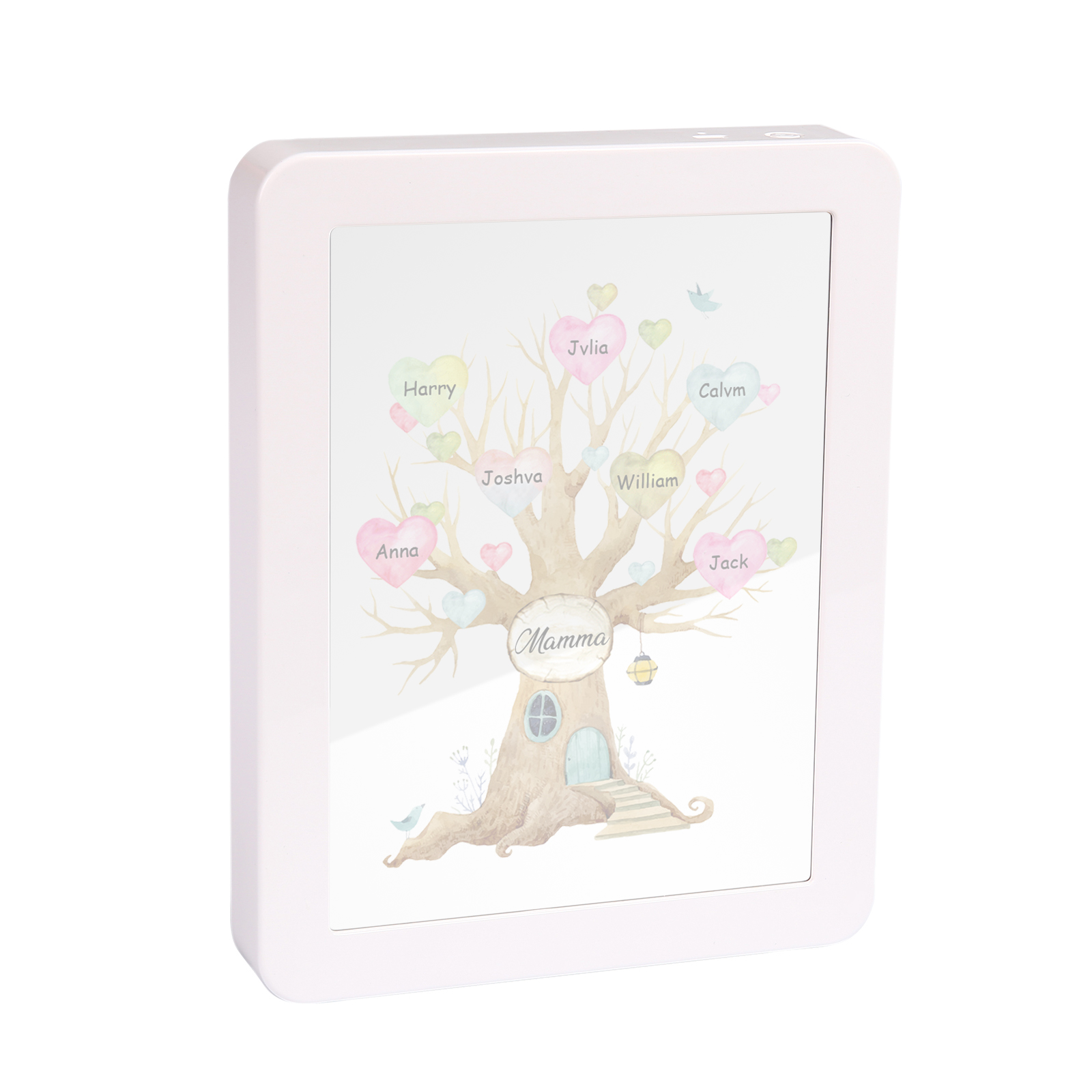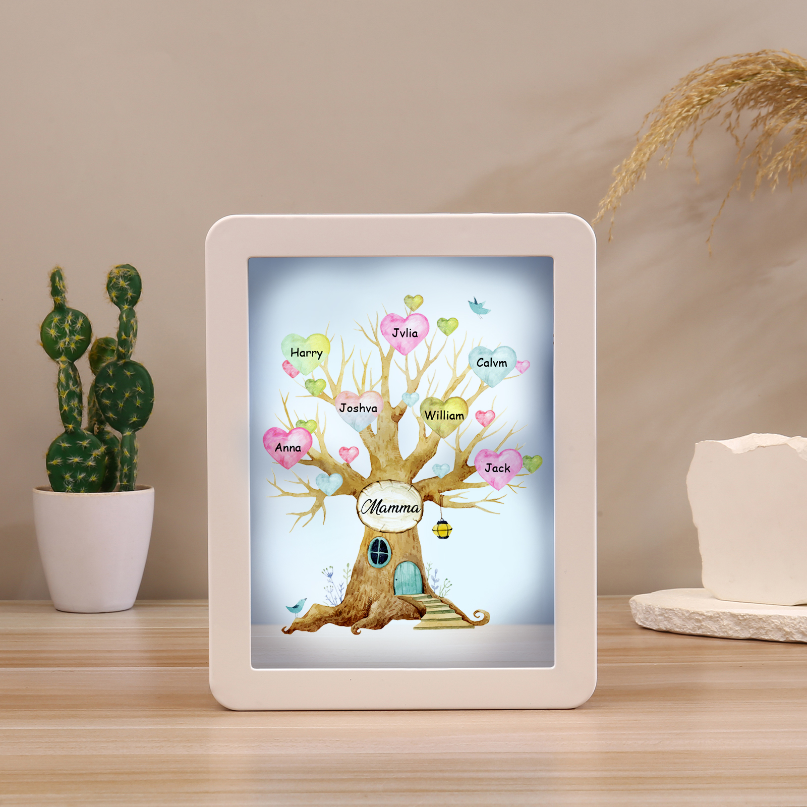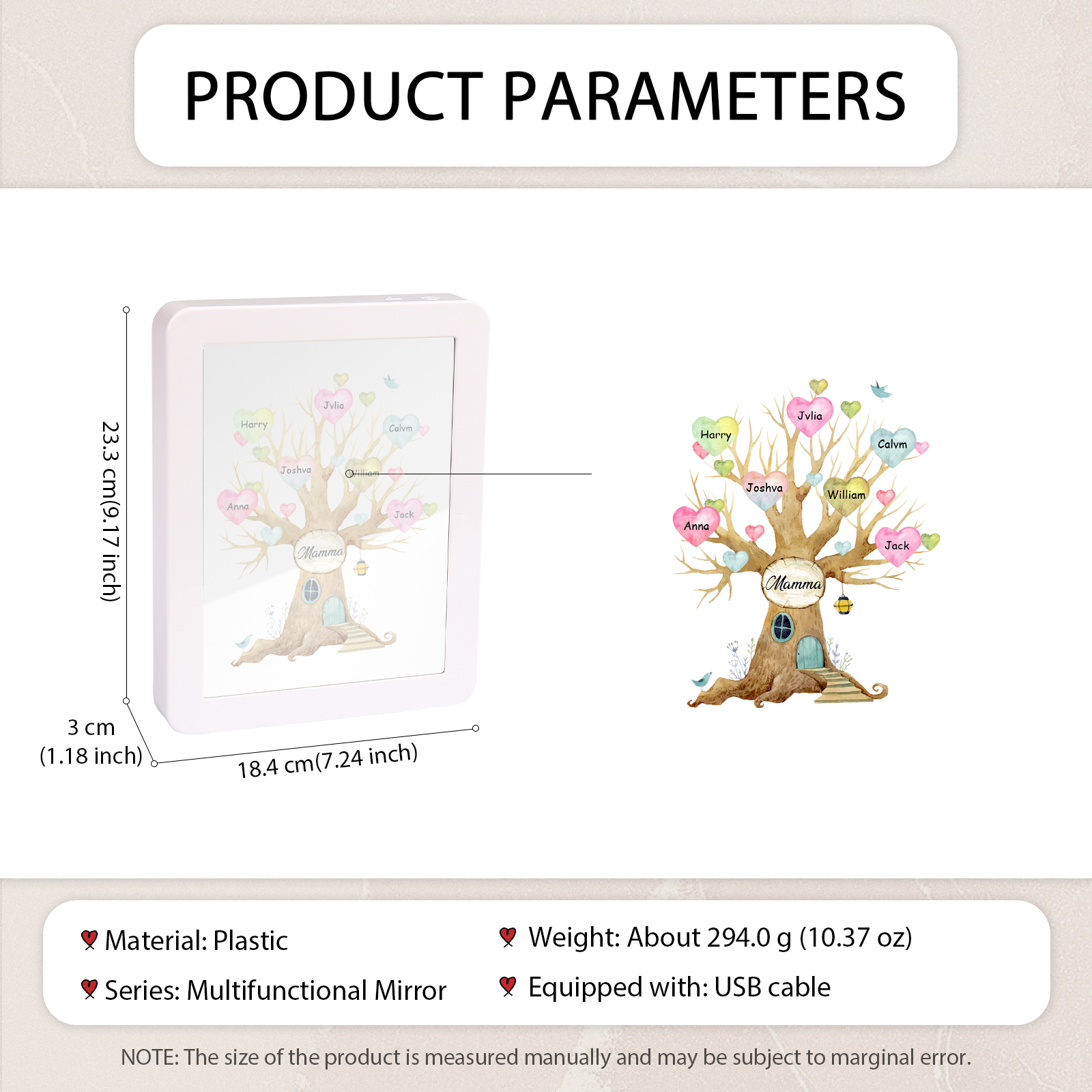 Cornice casa d'albero con LED luce a tre colori 7 nomi e 1 testo personalizzati anche usati come specchio regalo per mamma/nonna