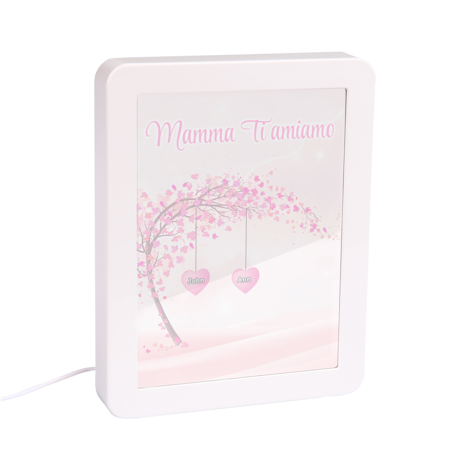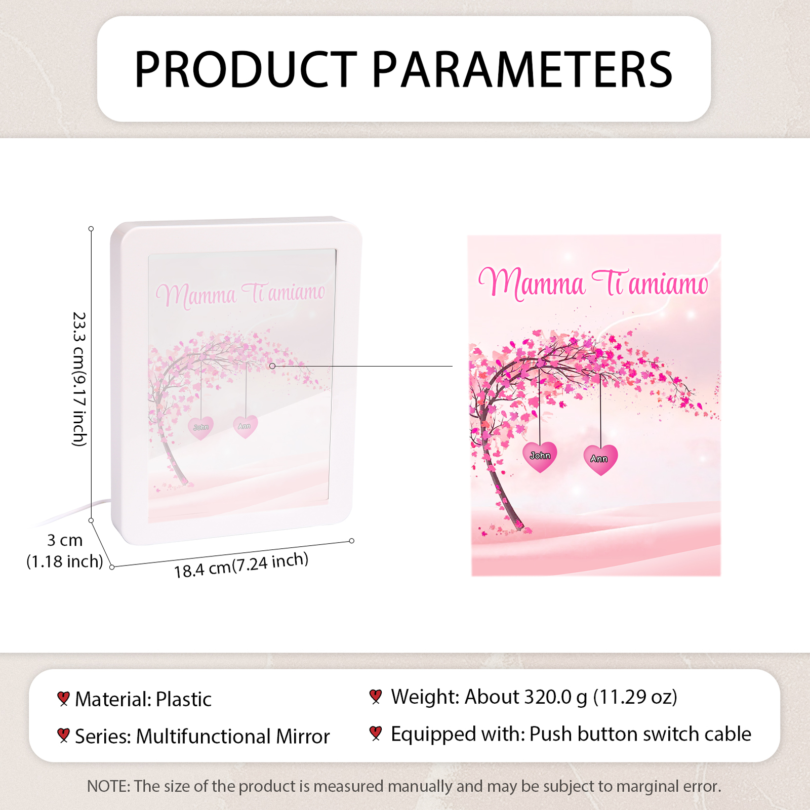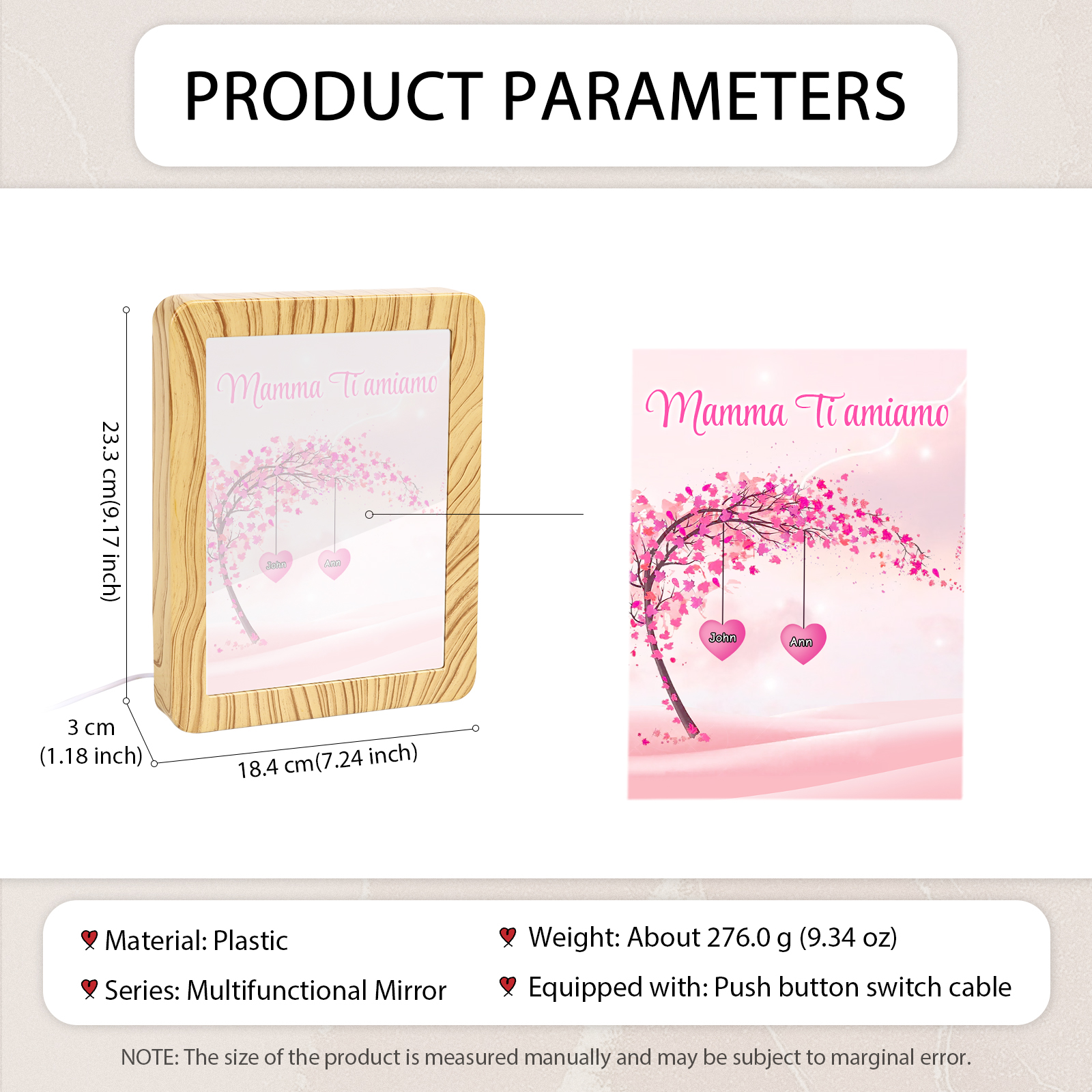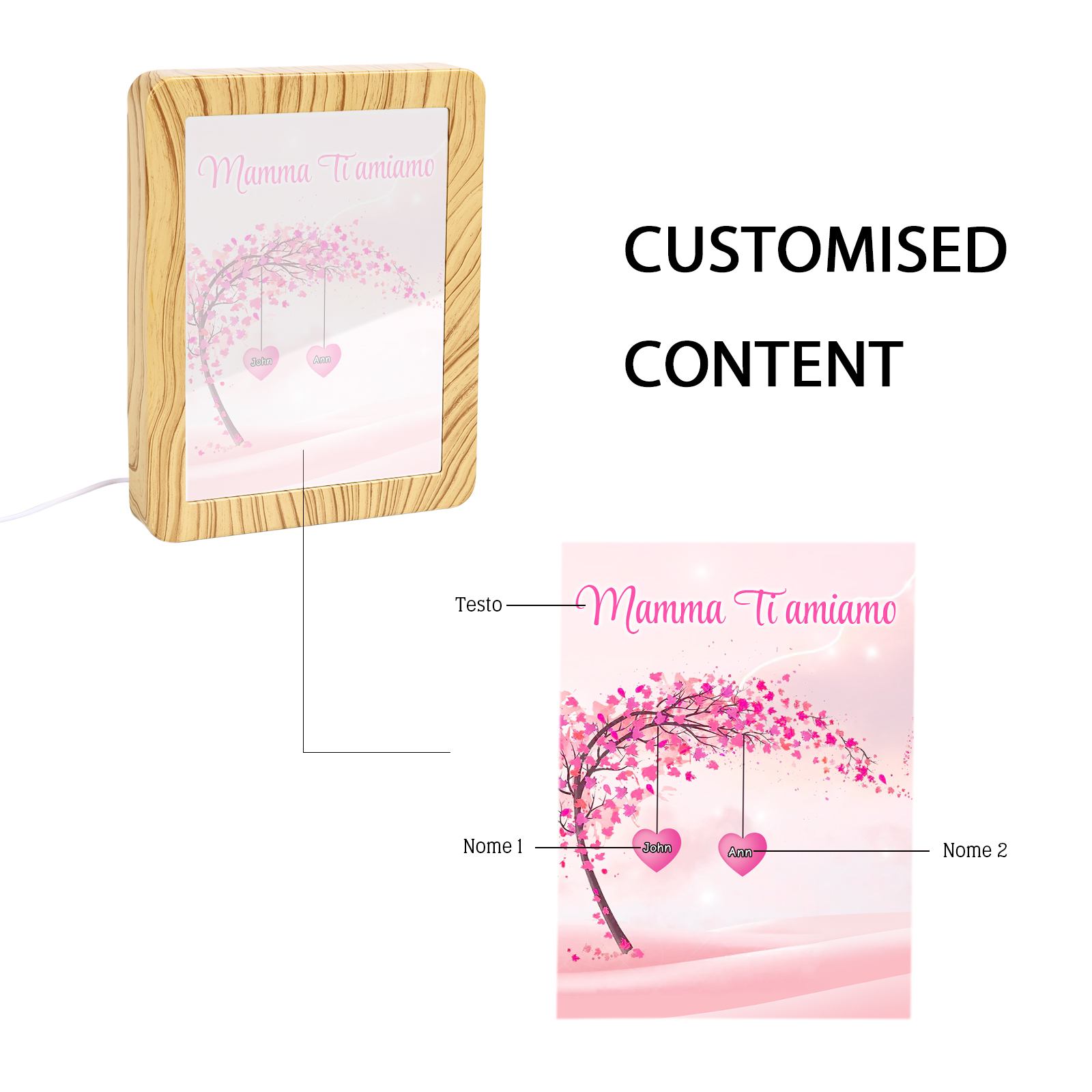 Cornice primavera albero rosa di cuore con LED luce a tre colori 2 nomi e 1 testo personalizzati anche usati come specchio regalo per mamma/nonna