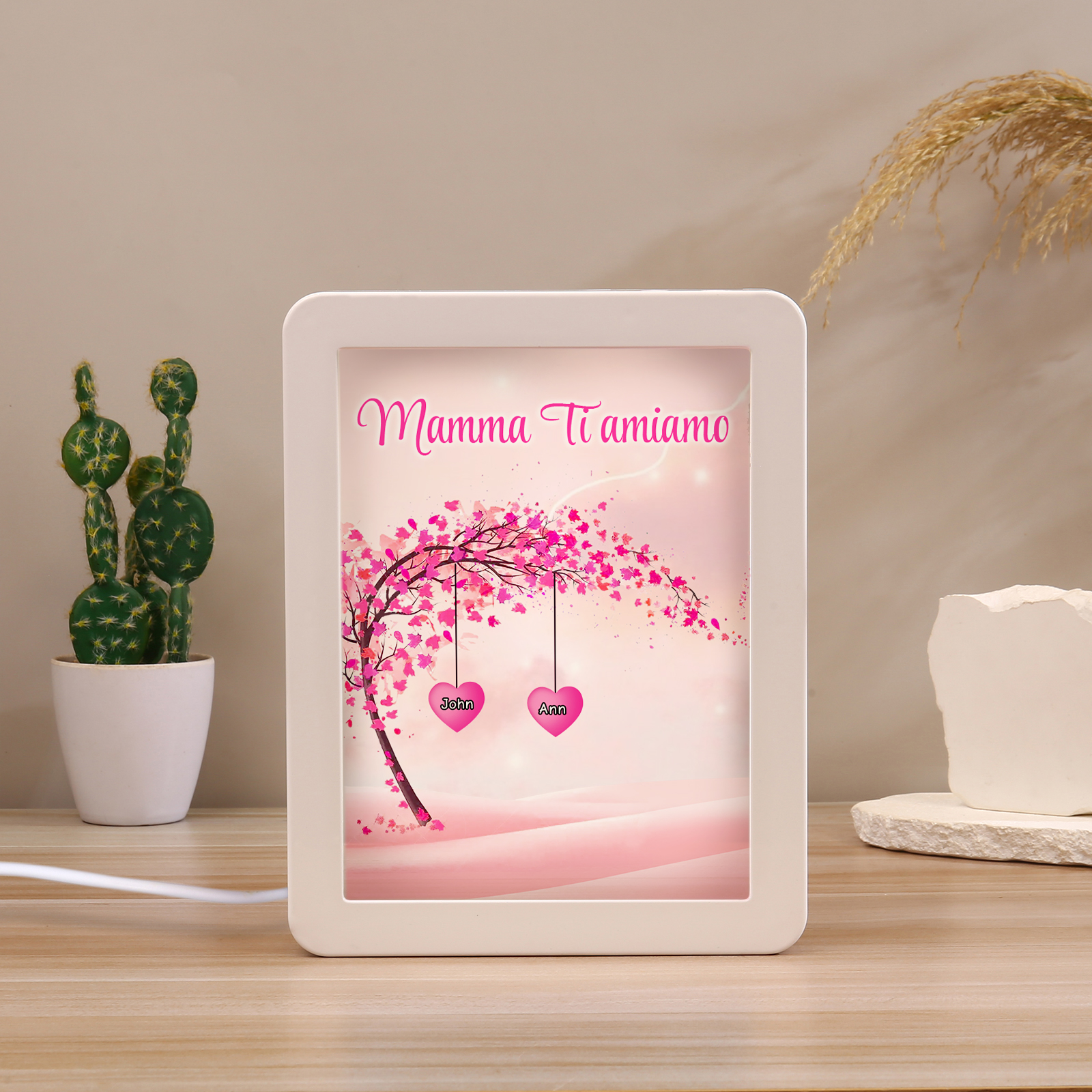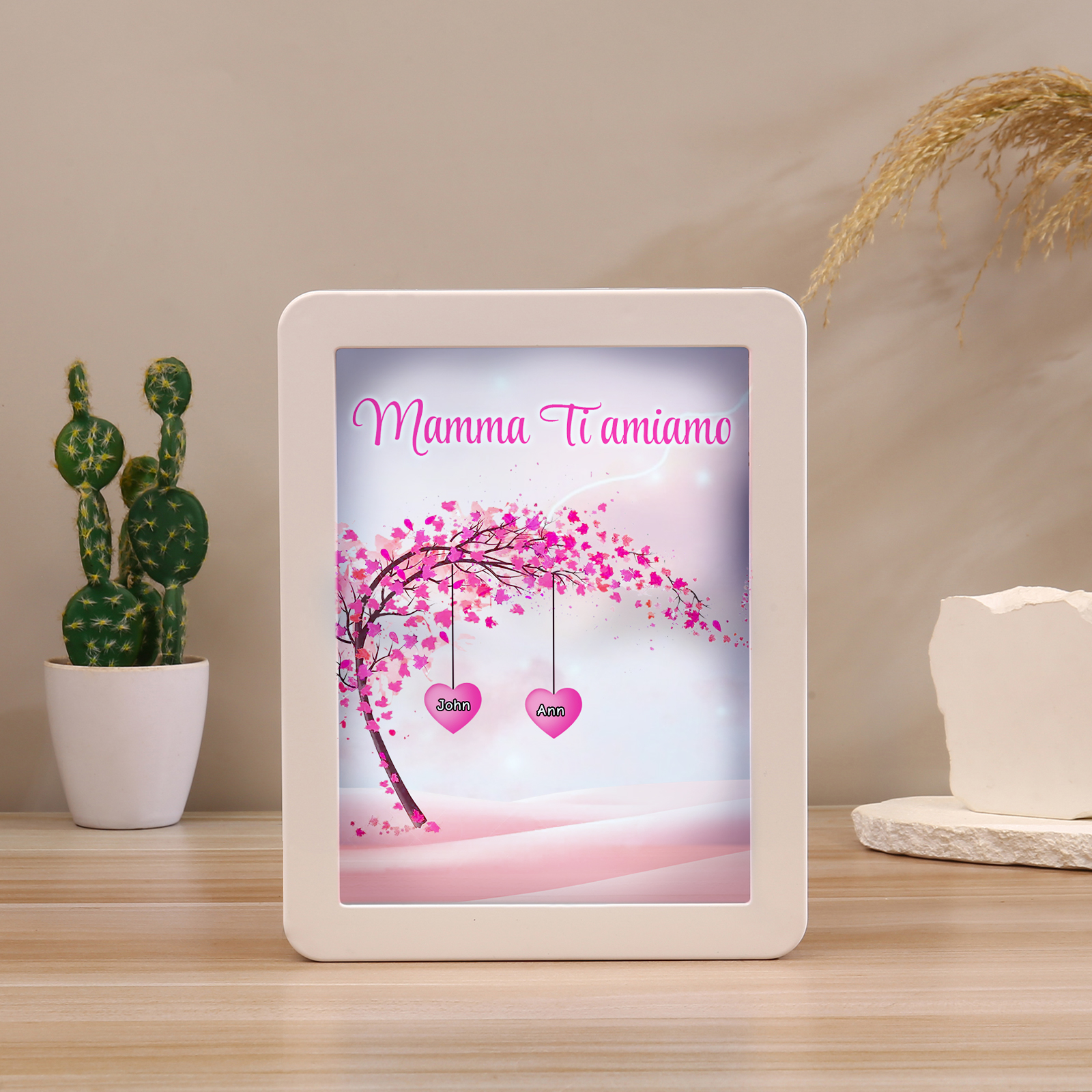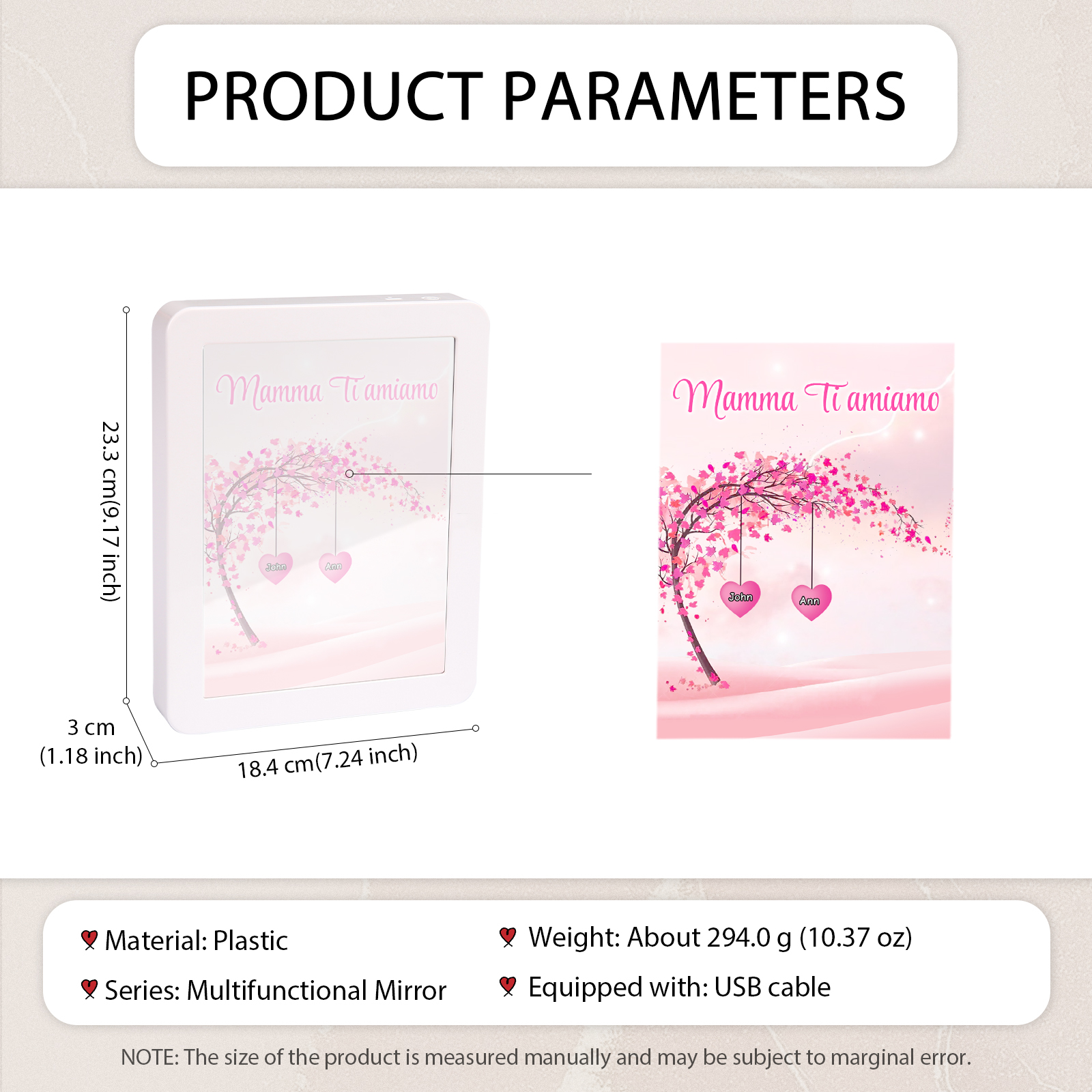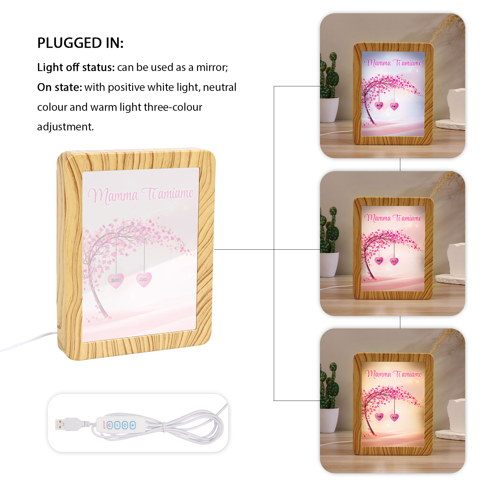 Cornice primavera albero rosa di cuore con LED luce a tre colori 2 nomi e 1 testo personalizzati anche usati come specchio regalo per mamma/nonna