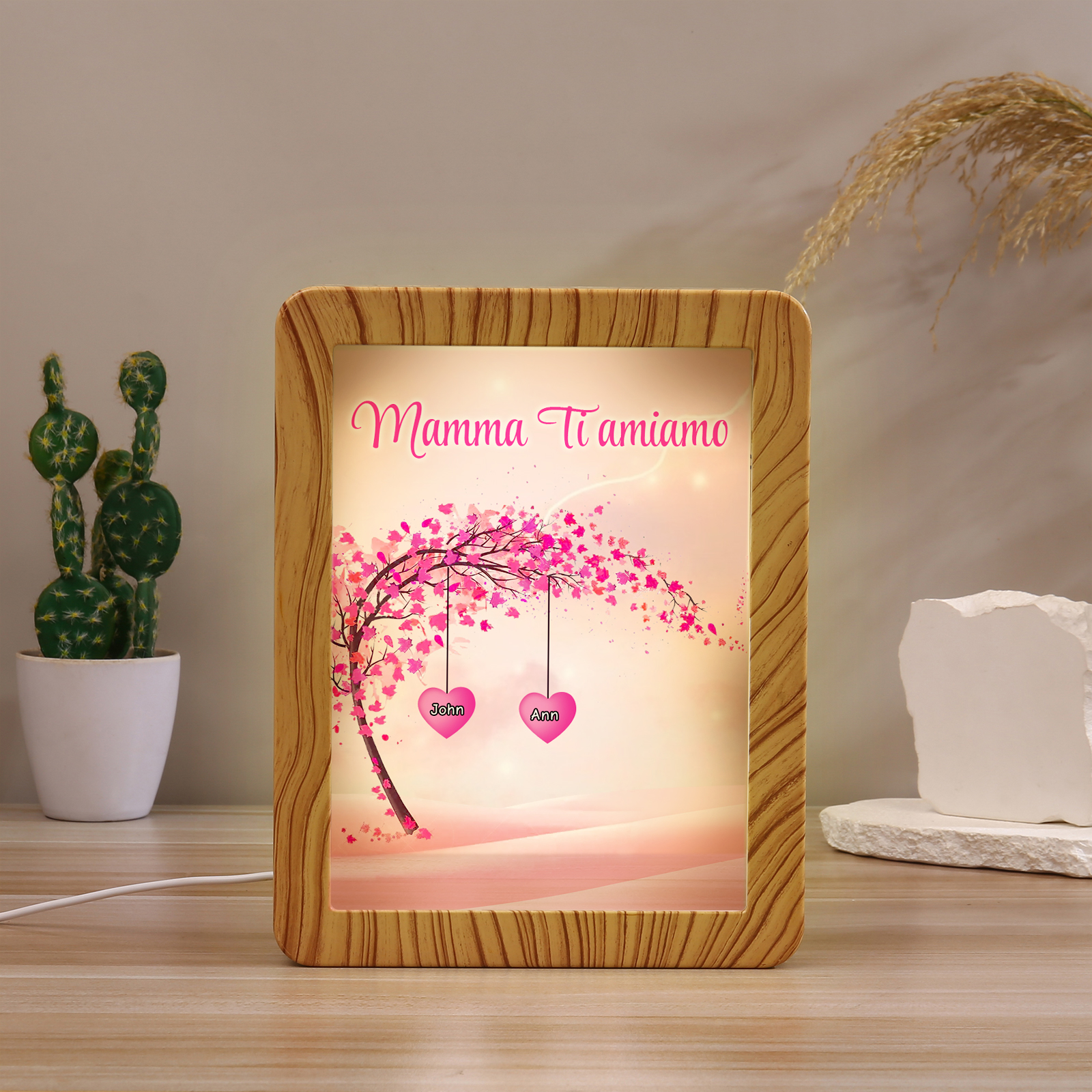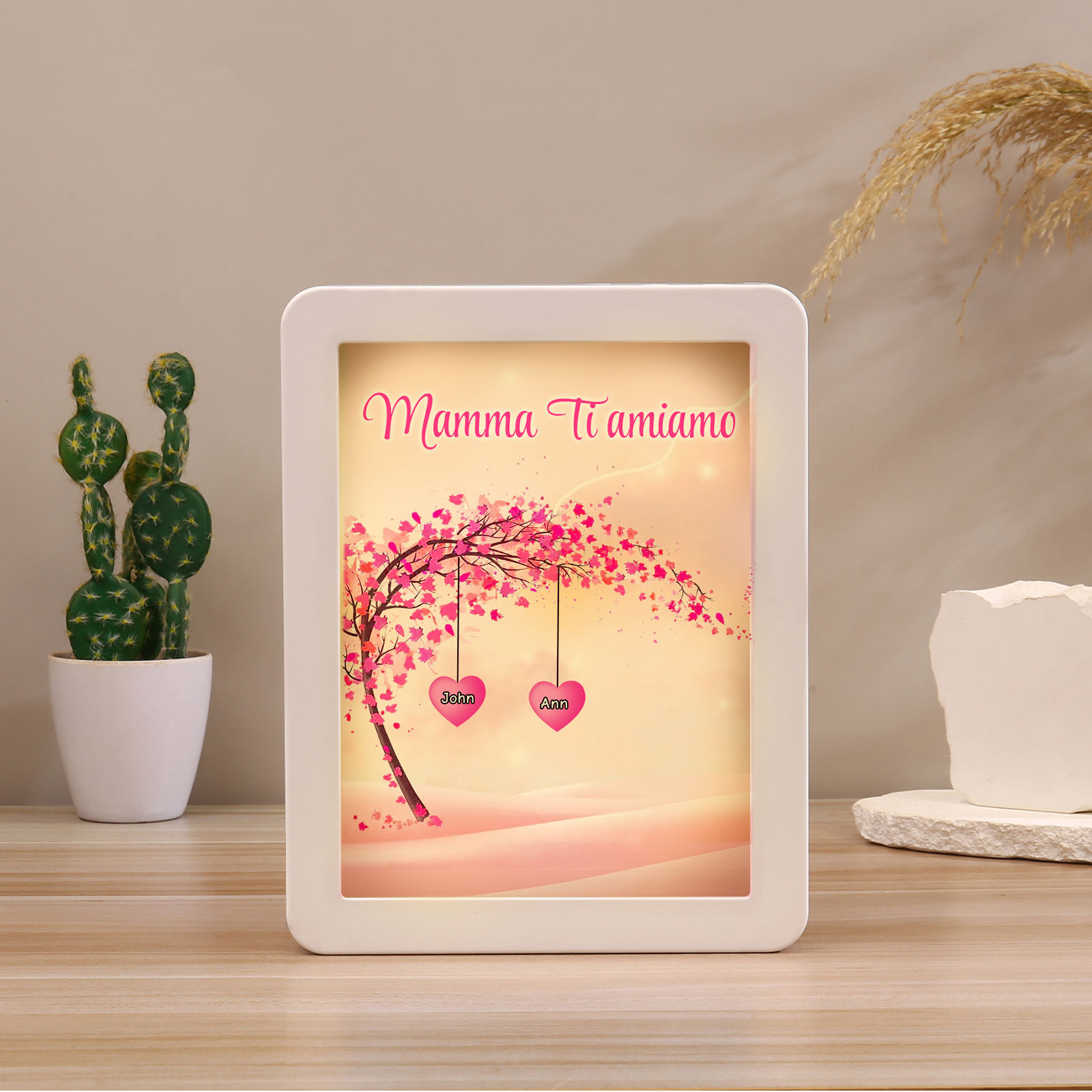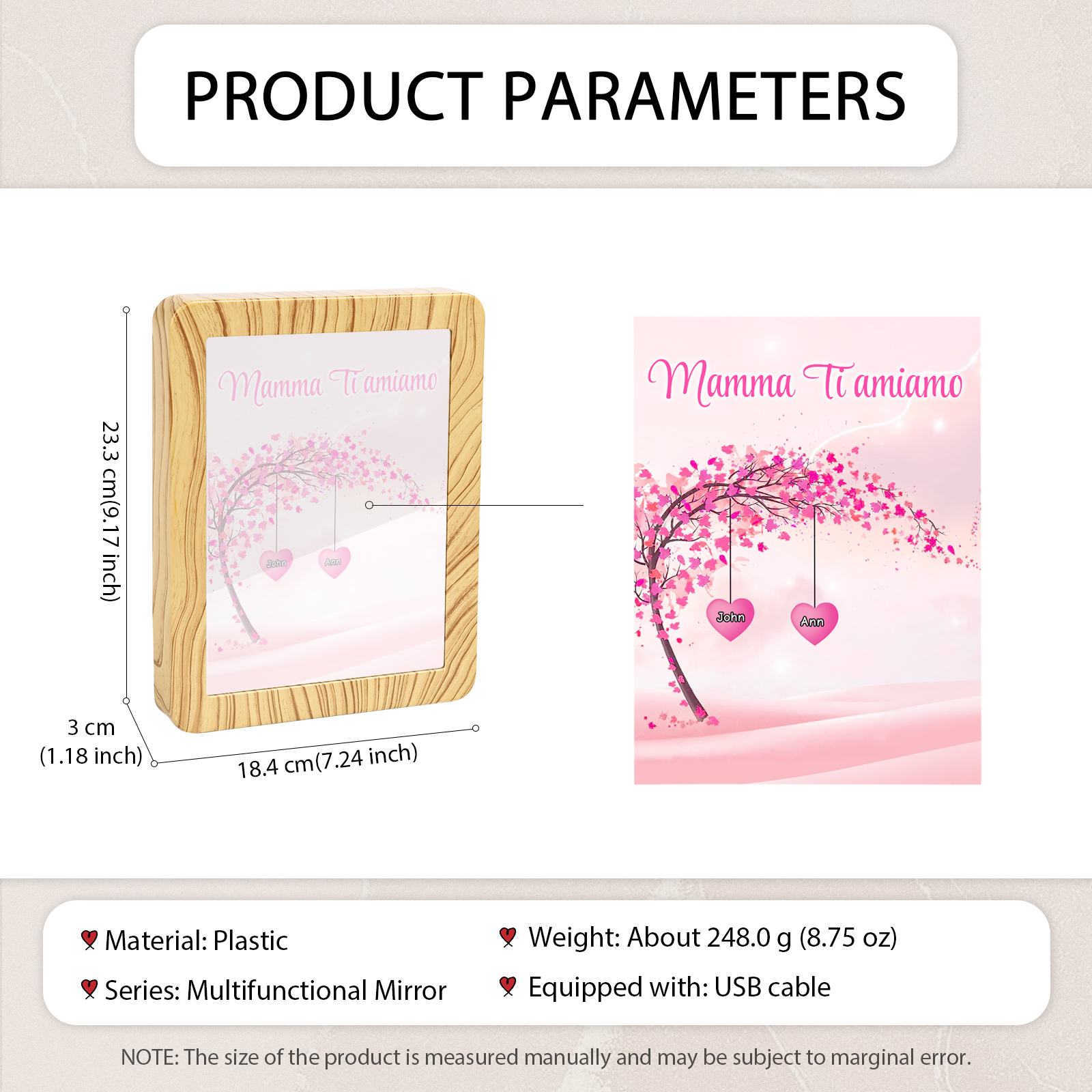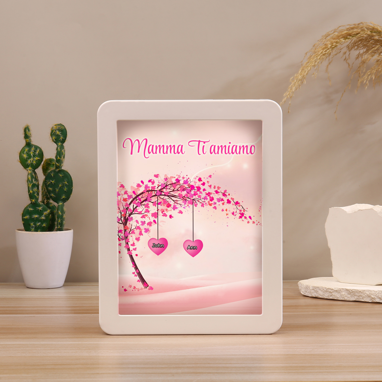 Cornice primavera albero rosa di cuore con LED luce a tre colori 2 nomi e 1 testo personalizzati anche usati come specchio regalo per mamma/nonna