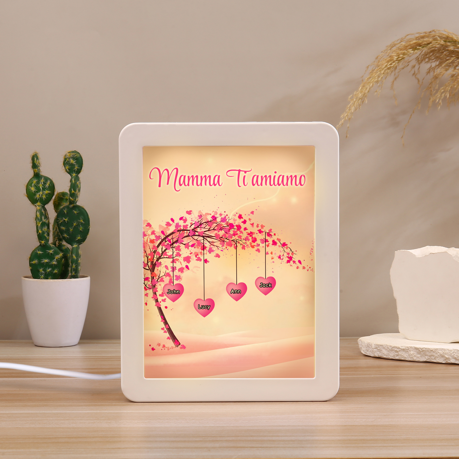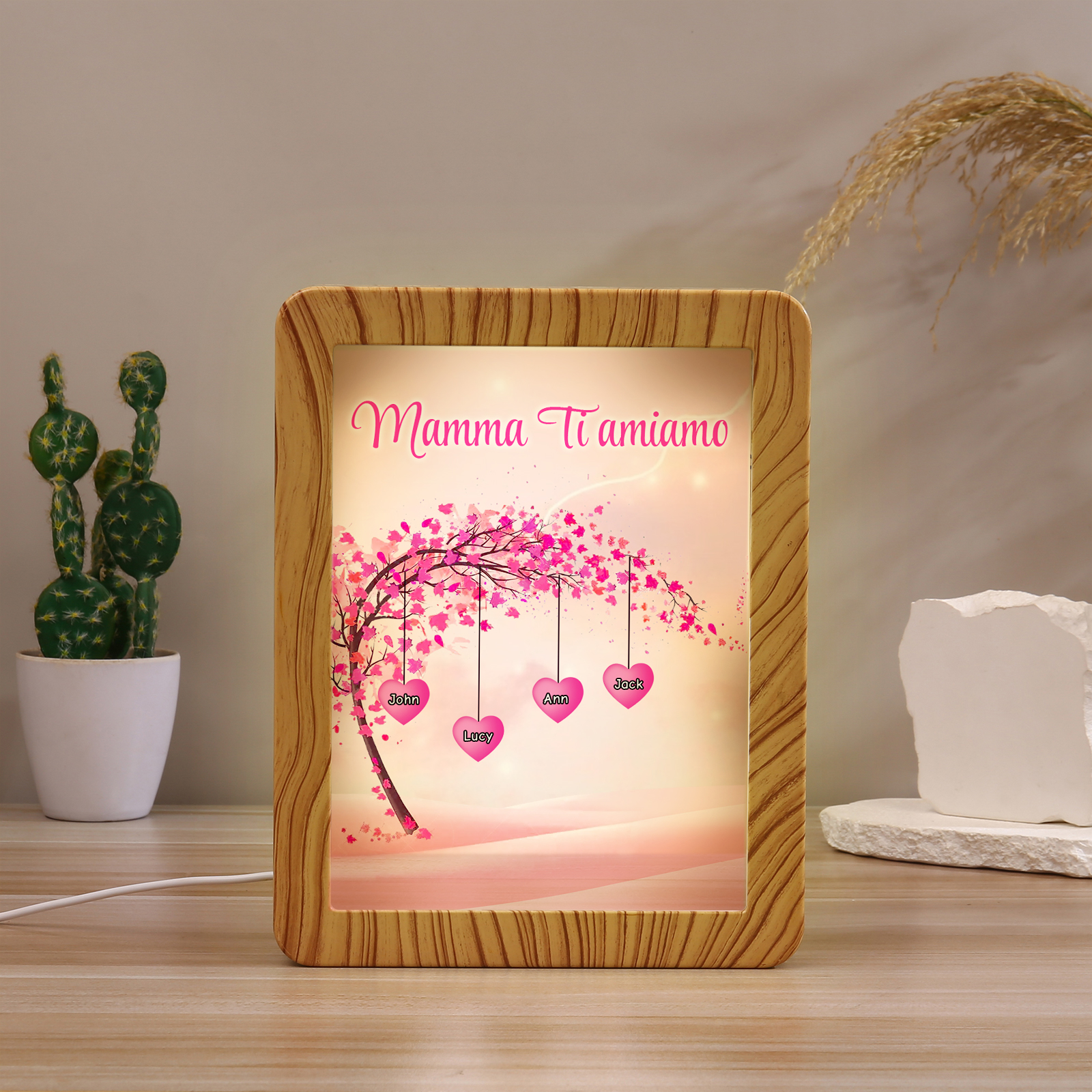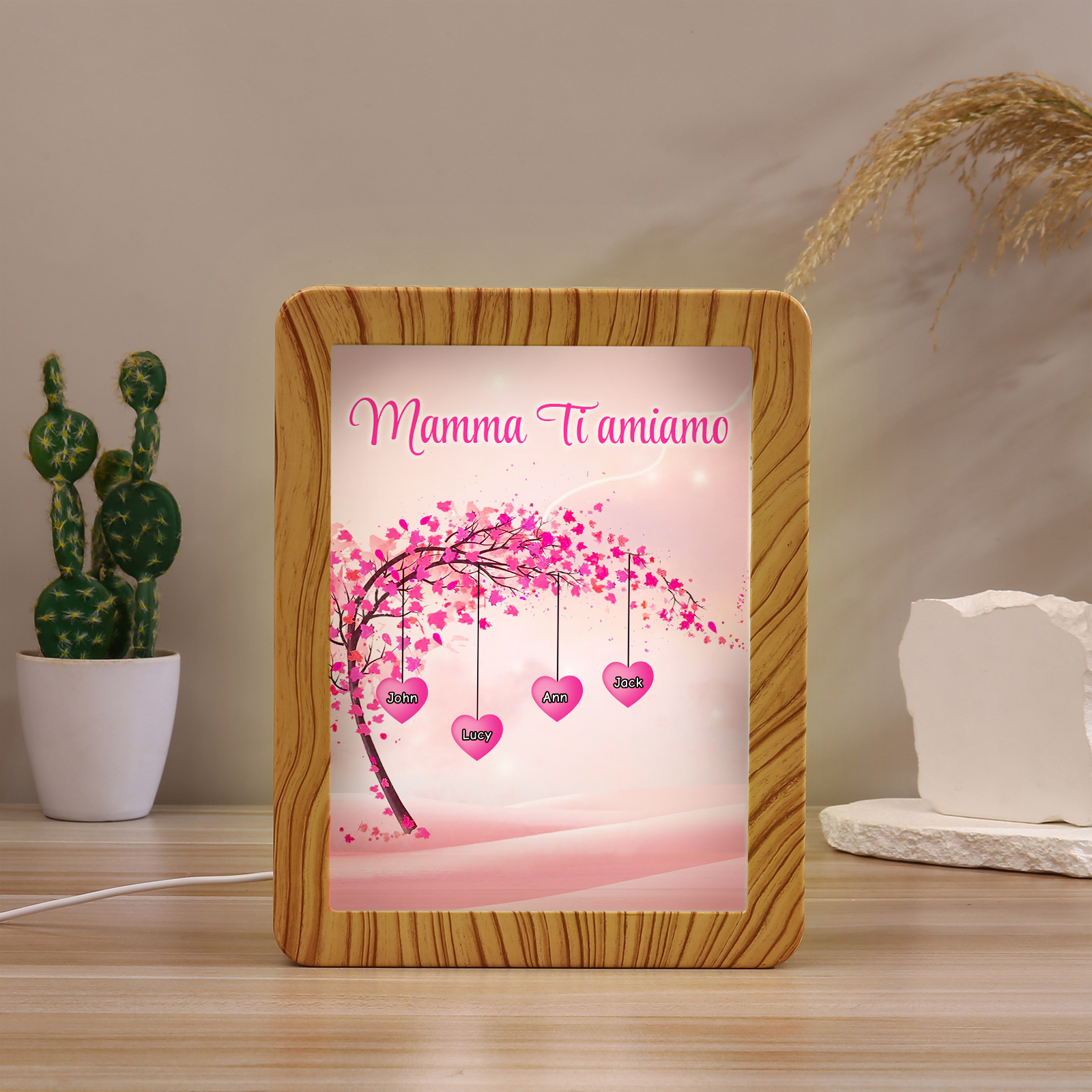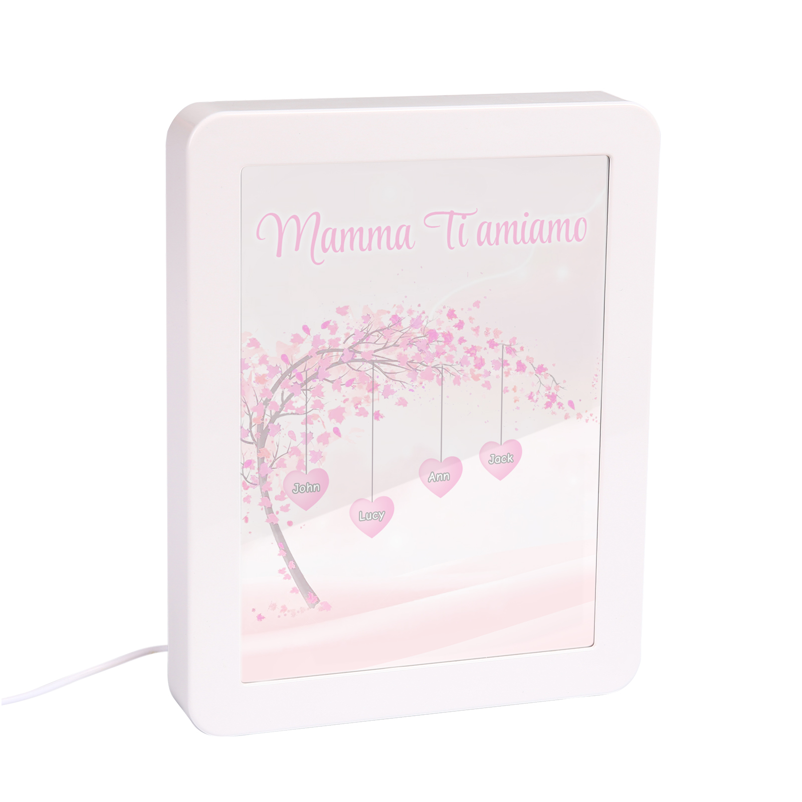 Cornice primavera albero rosa di cuore con LED luce a tre colori 4 nomi e 1 testo personalizzati anche usati come specchio regalo per mamma/nonna