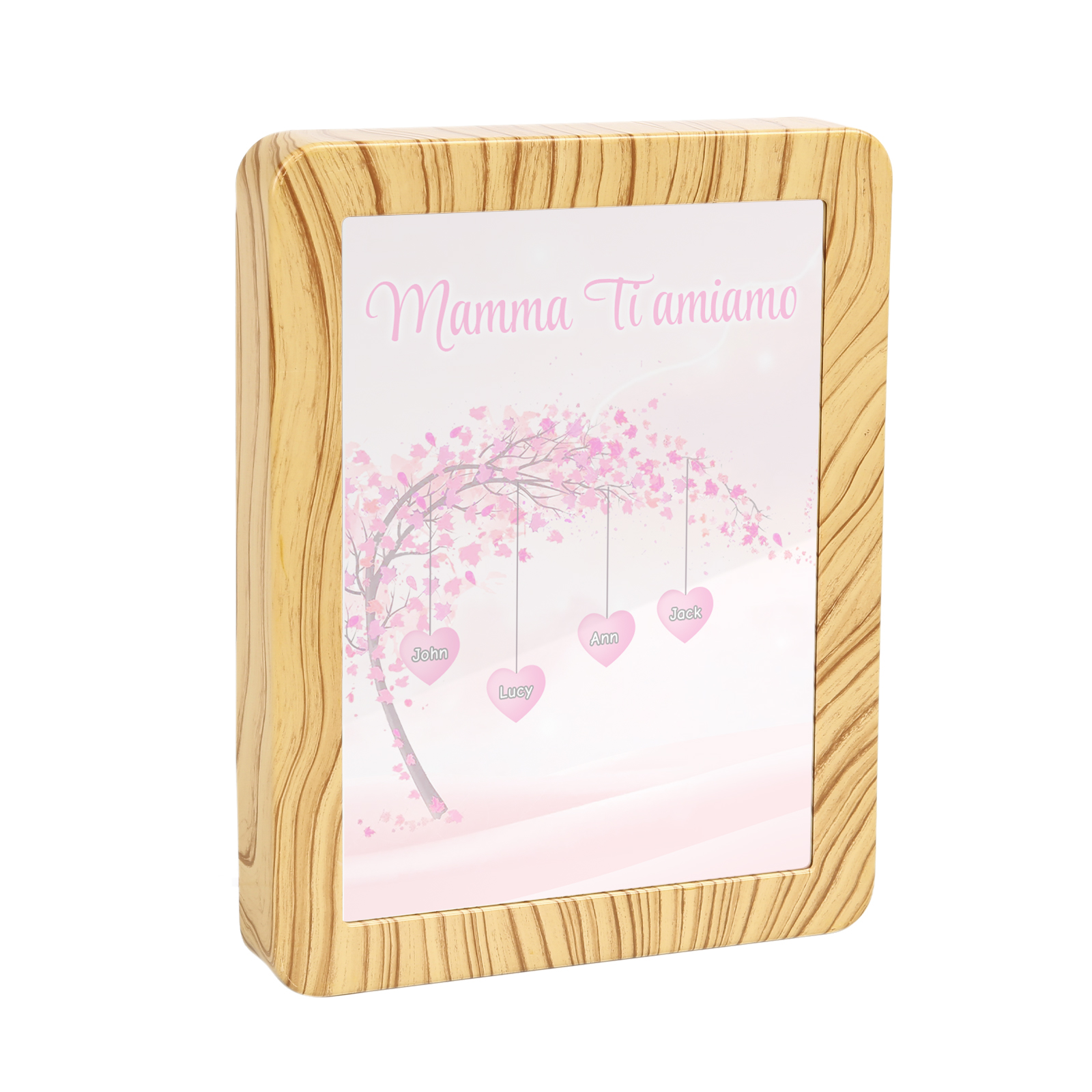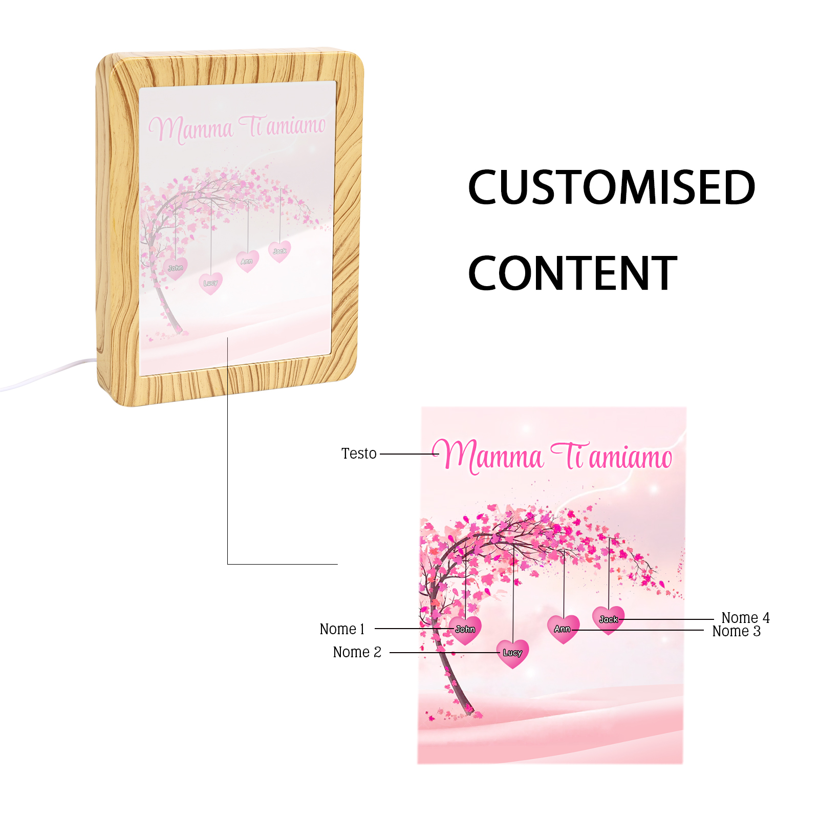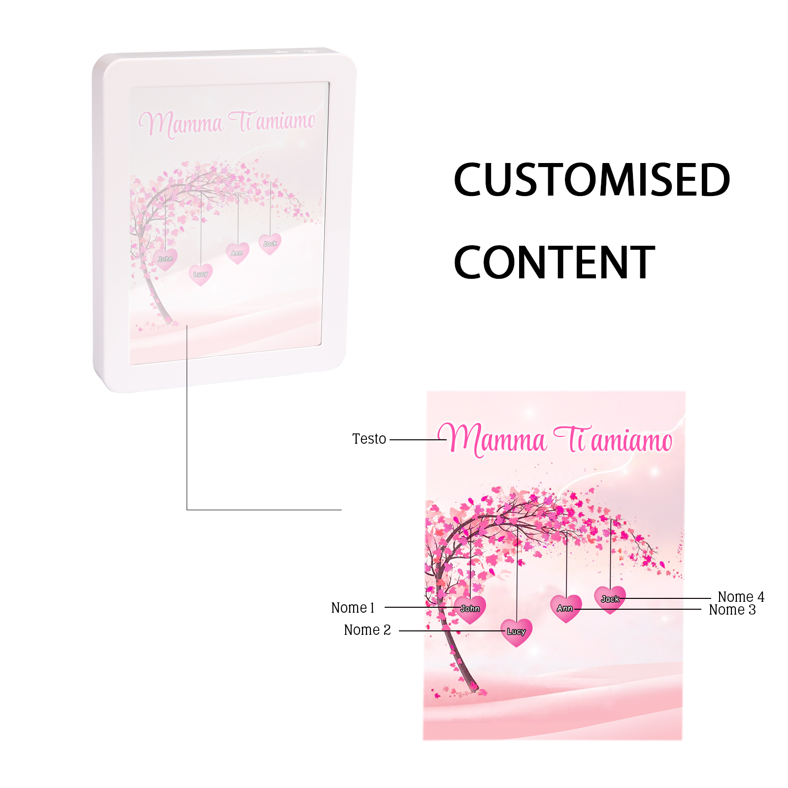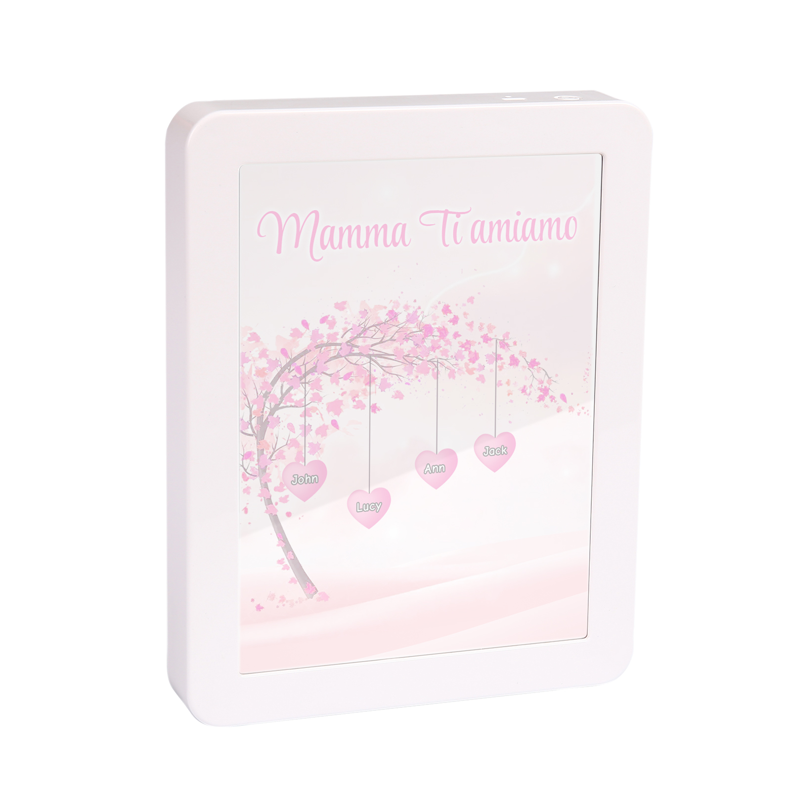 Cornice primavera albero rosa di cuore con LED luce a tre colori 4 nomi e 1 testo personalizzati anche usati come specchio regalo per mamma/nonna