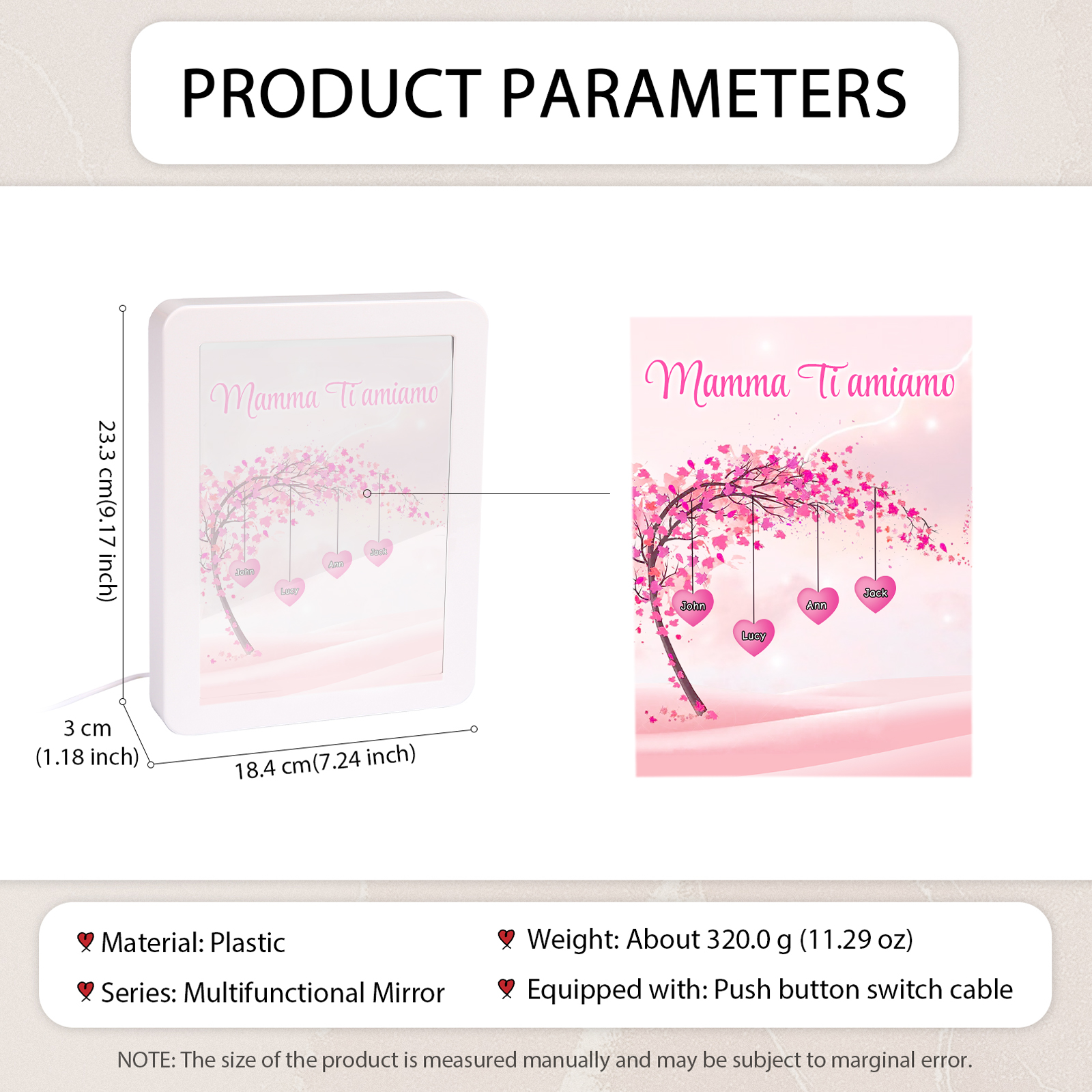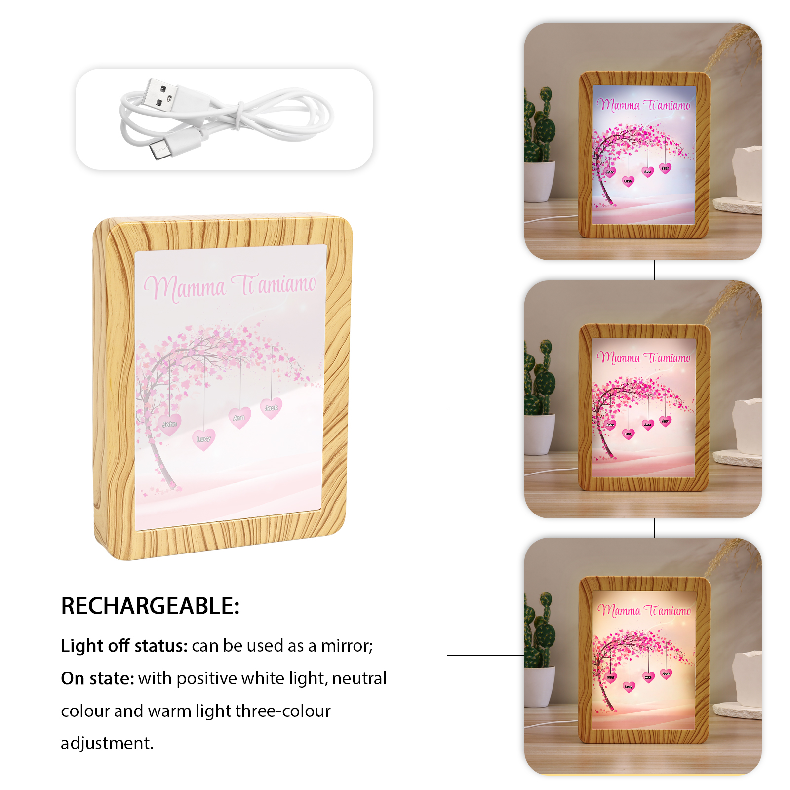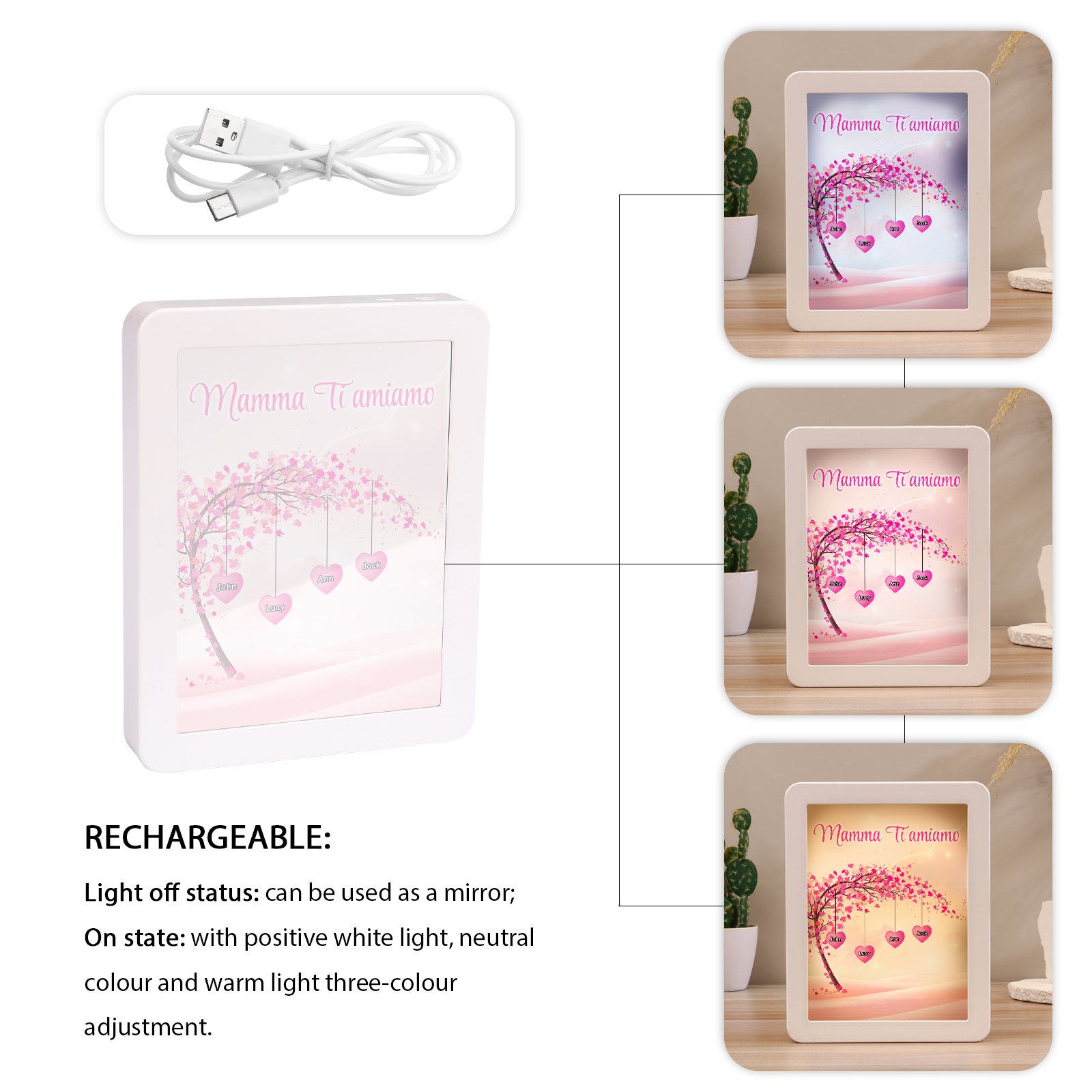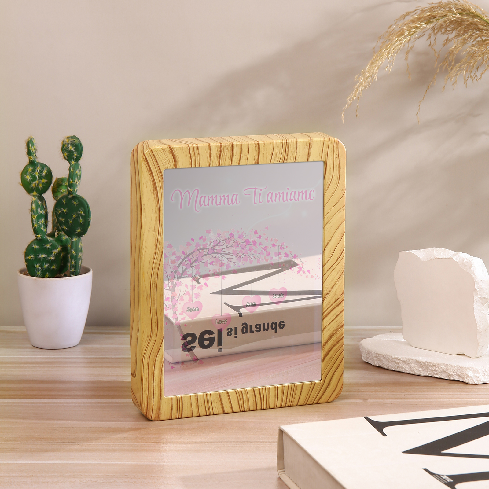 Cornice primavera albero rosa di cuore con LED luce a tre colori 4 nomi e 1 testo personalizzati anche usati come specchio regalo per mamma/nonna