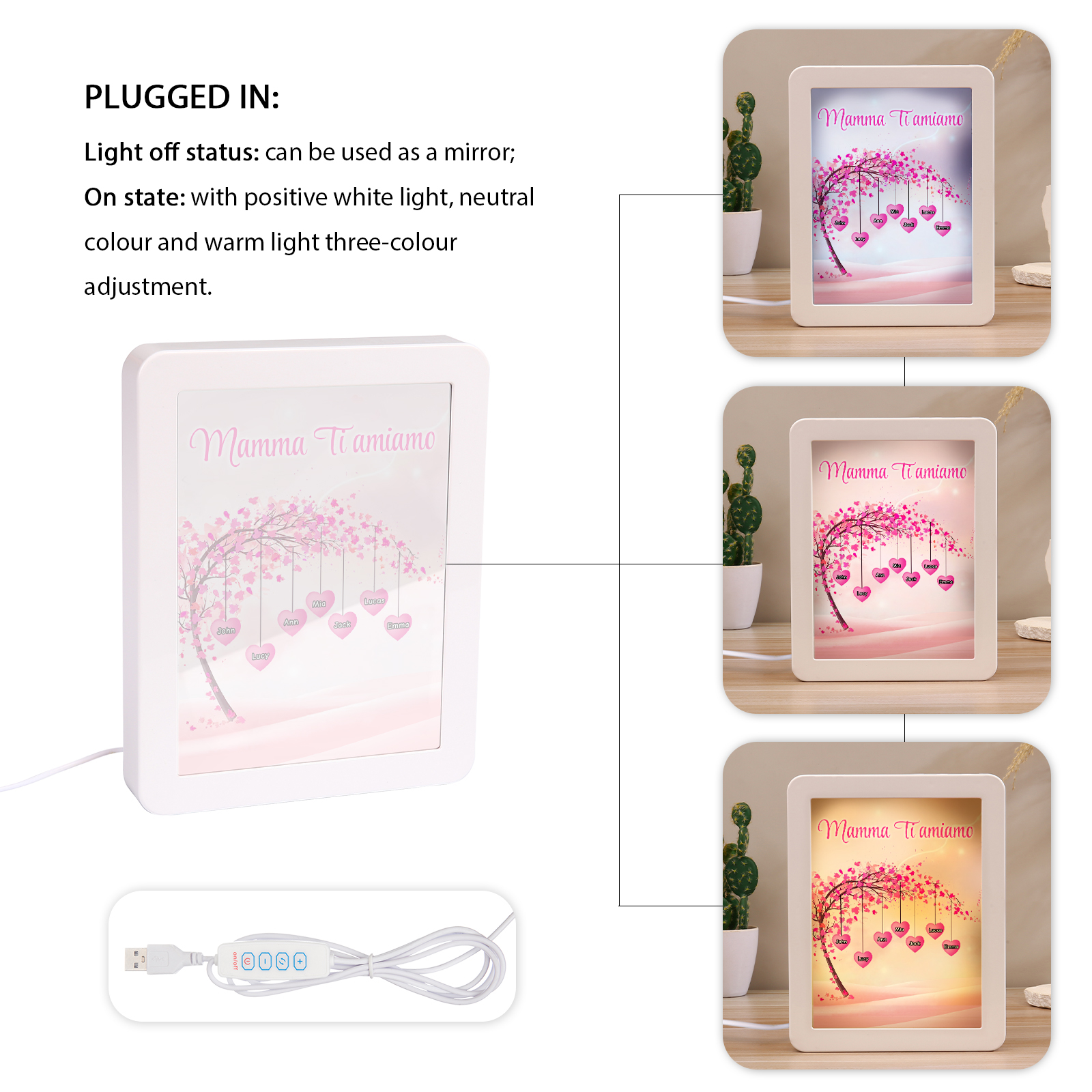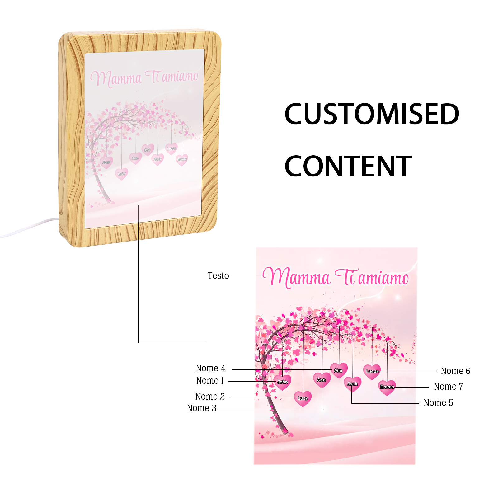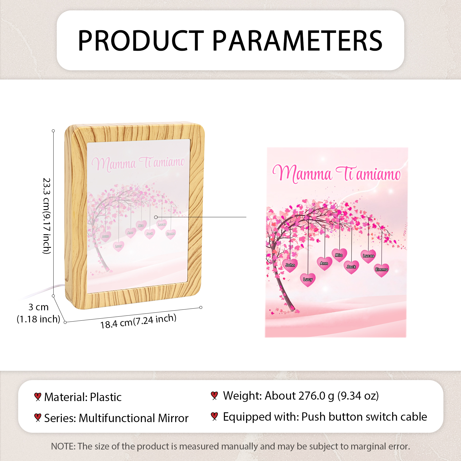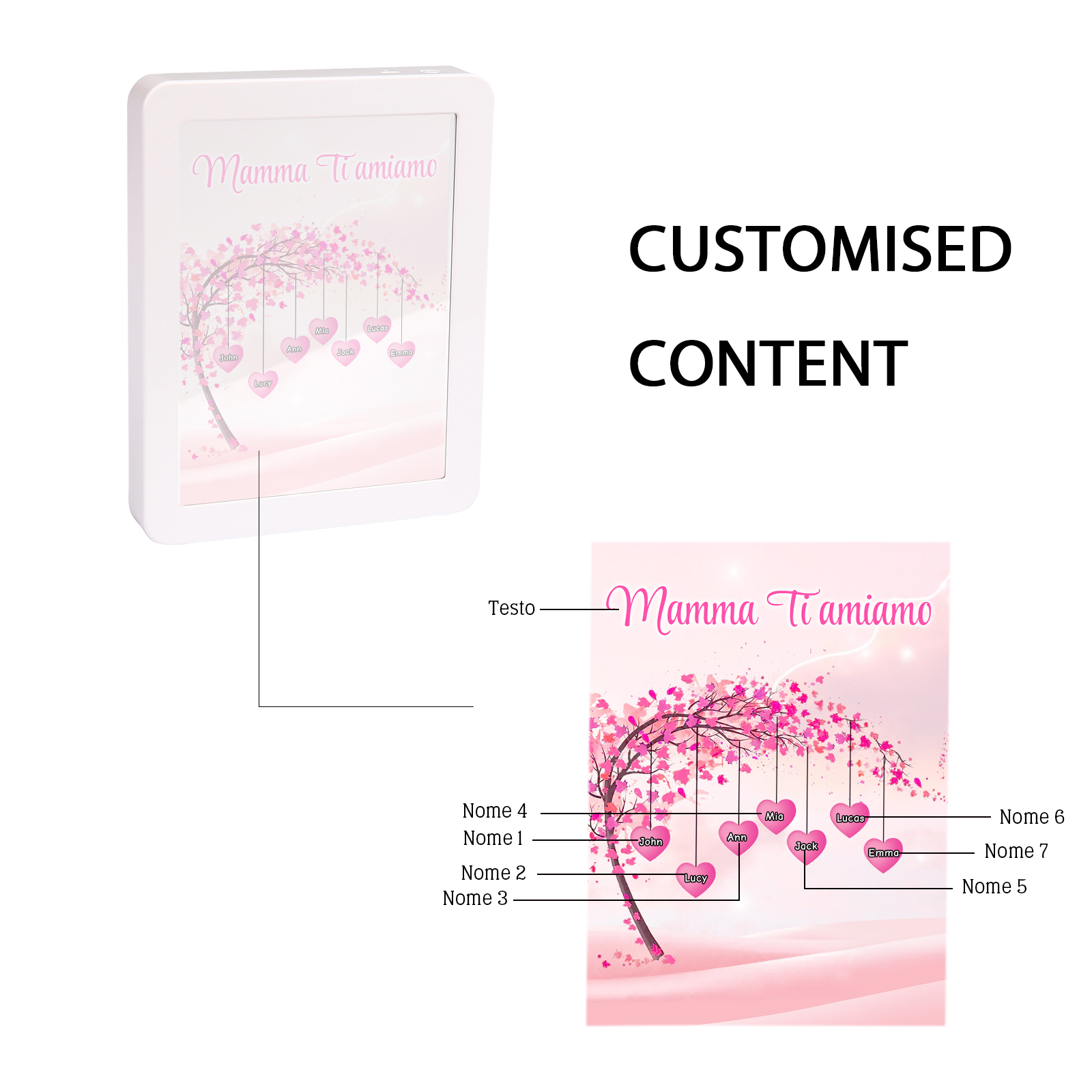 Cornice primavera albero rosa di cuore con LED luce a tre colori 7 nomi e 1 testo personalizzati anche usati come specchio regalo per mamma/nonna