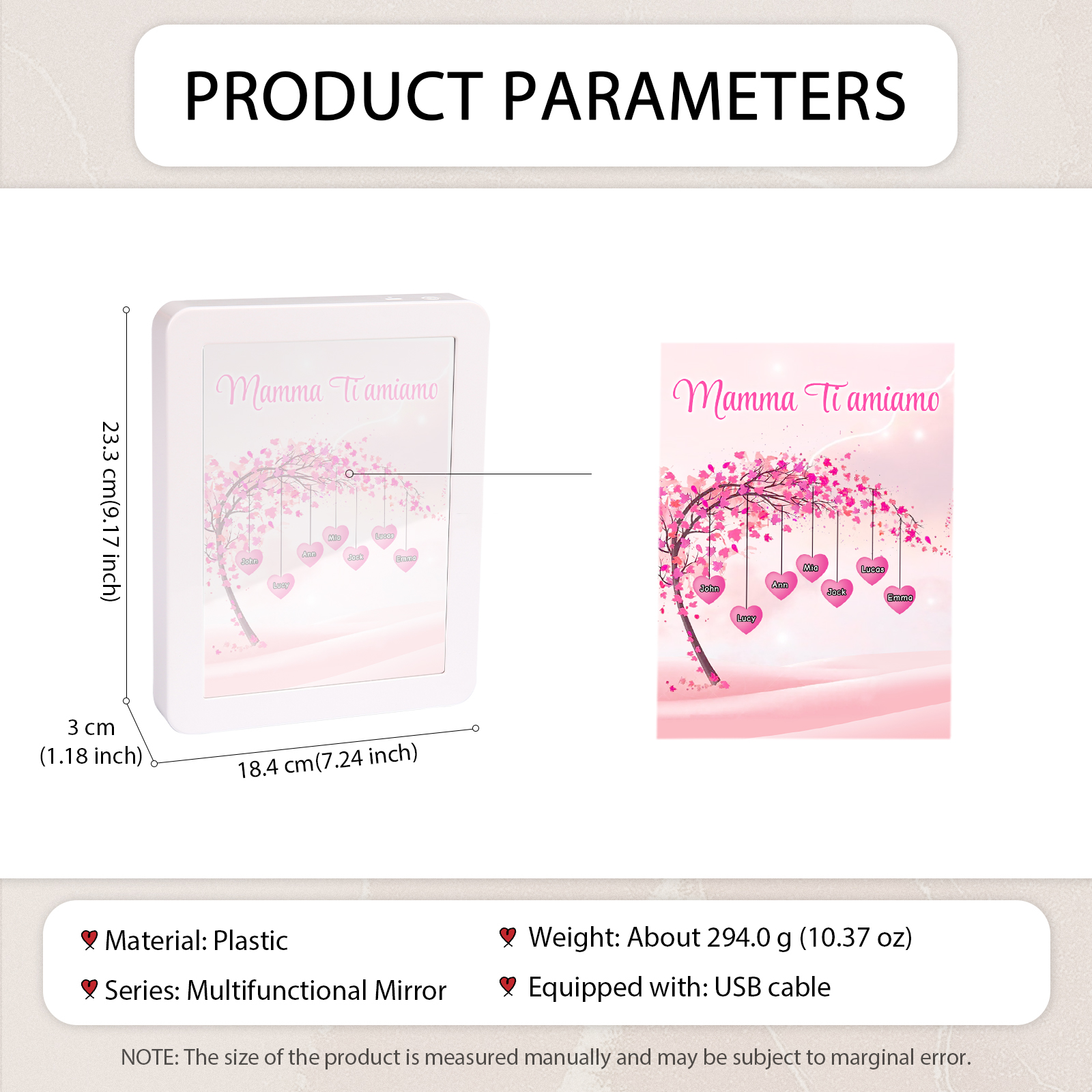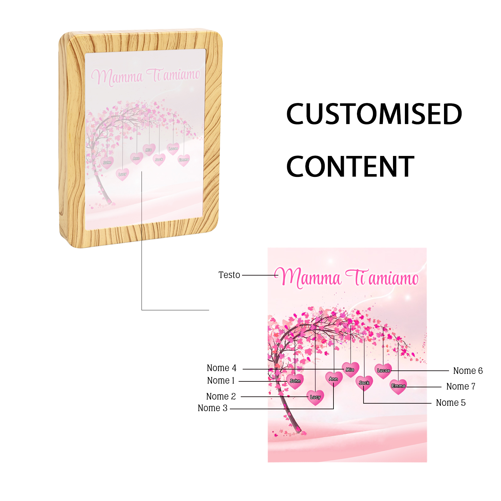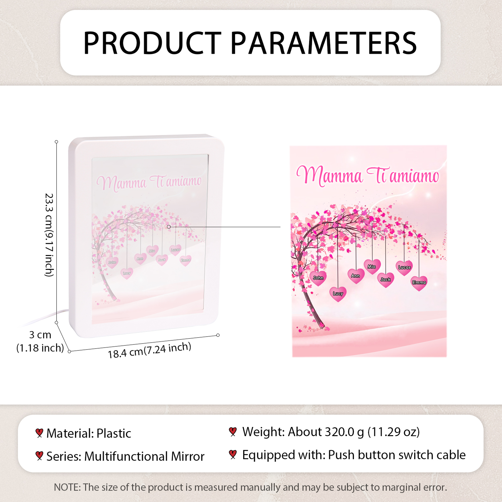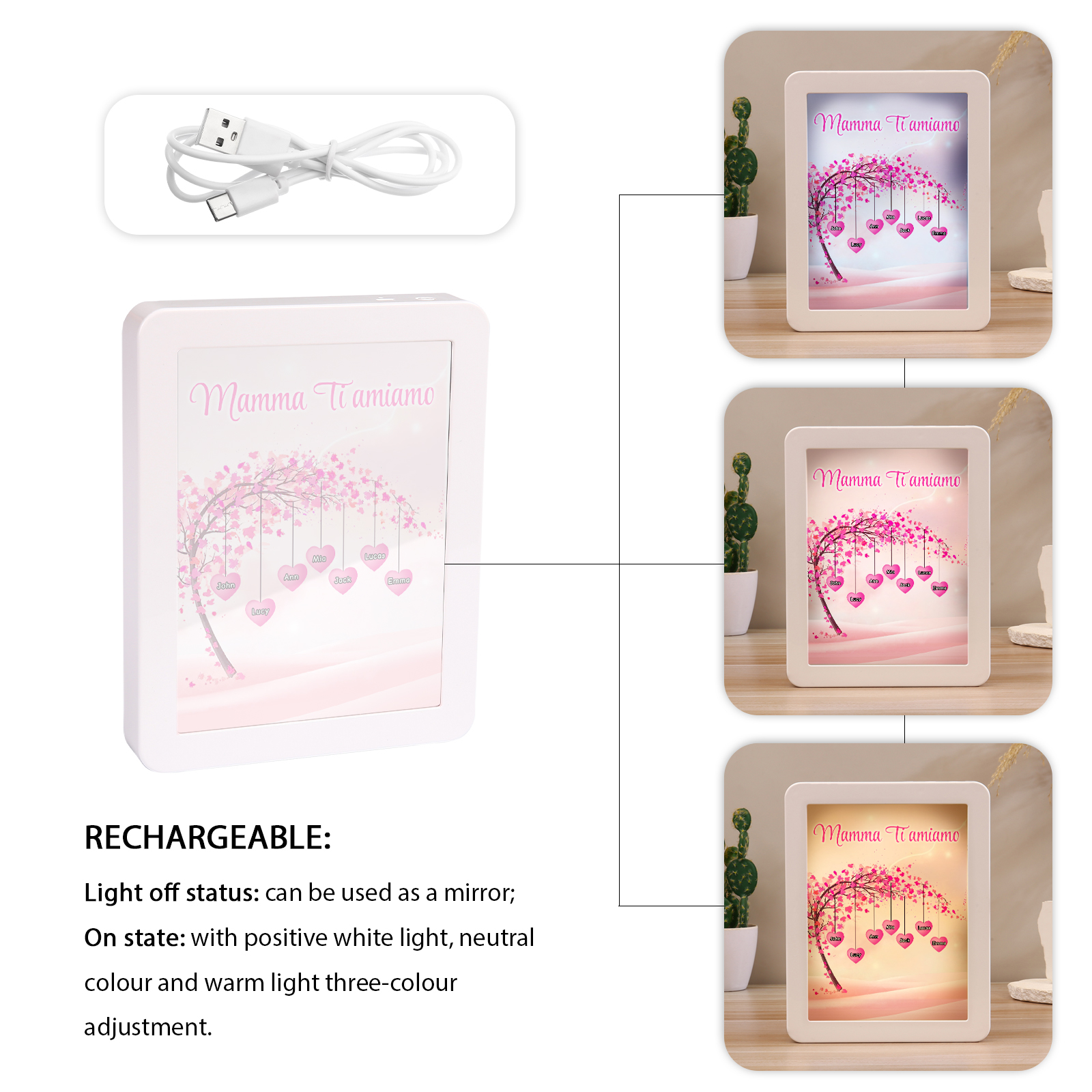 Cornice primavera albero rosa di cuore con LED luce a tre colori 7 nomi e 1 testo personalizzati anche usati come specchio regalo per mamma/nonna