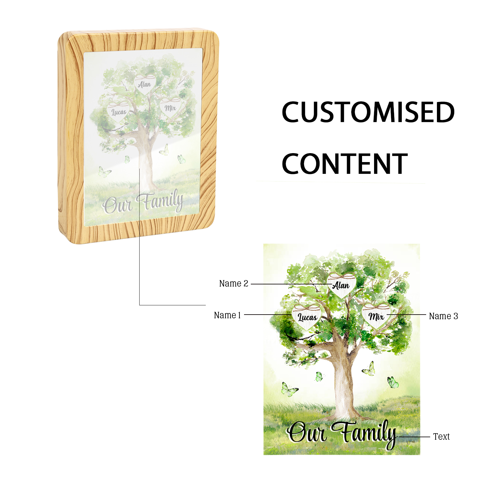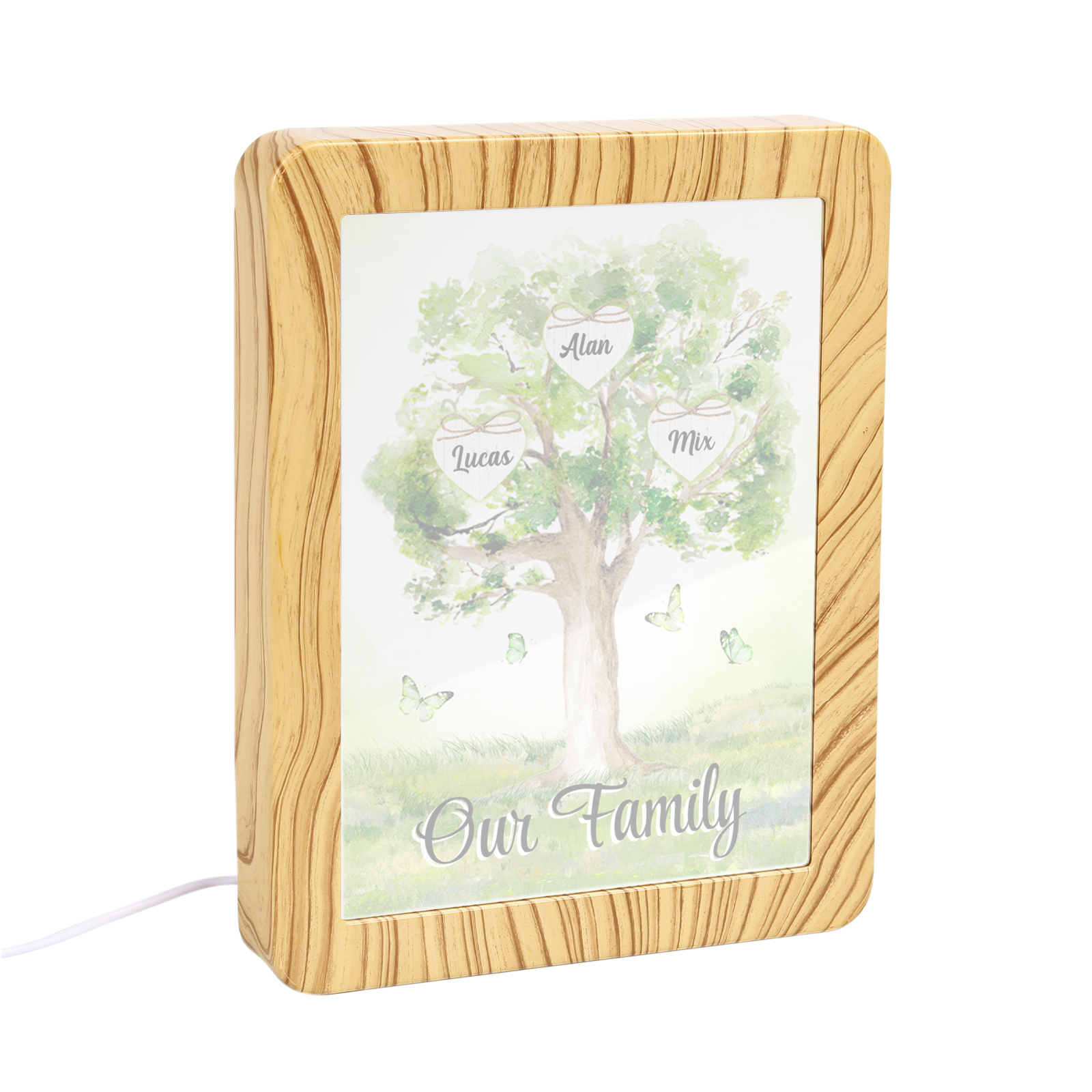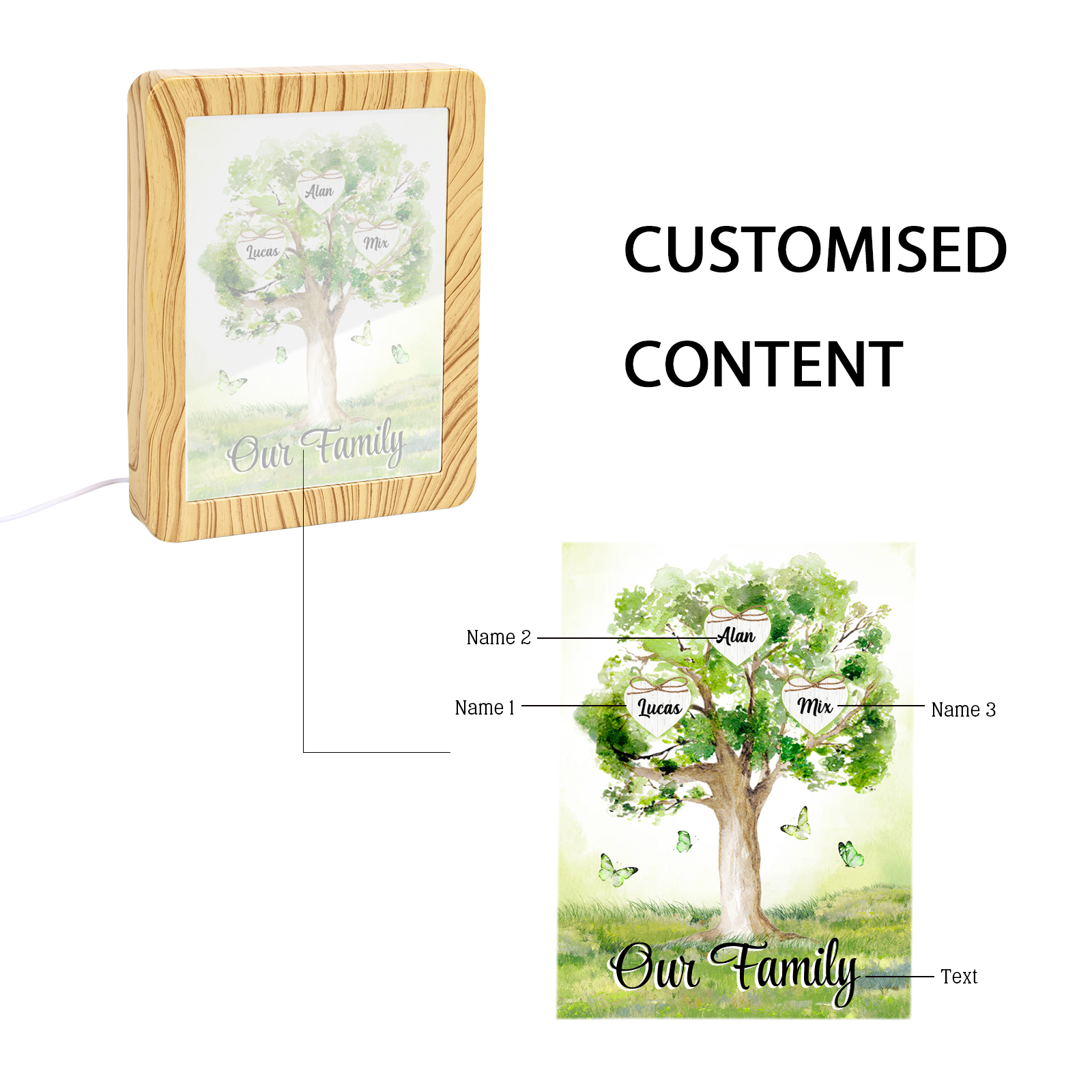 Cornice primavera albero verde di cuore con LED luce a tre colori 3 nomi e 1 testo personalizzati anche usato come specchio regalo per mamma/nonna