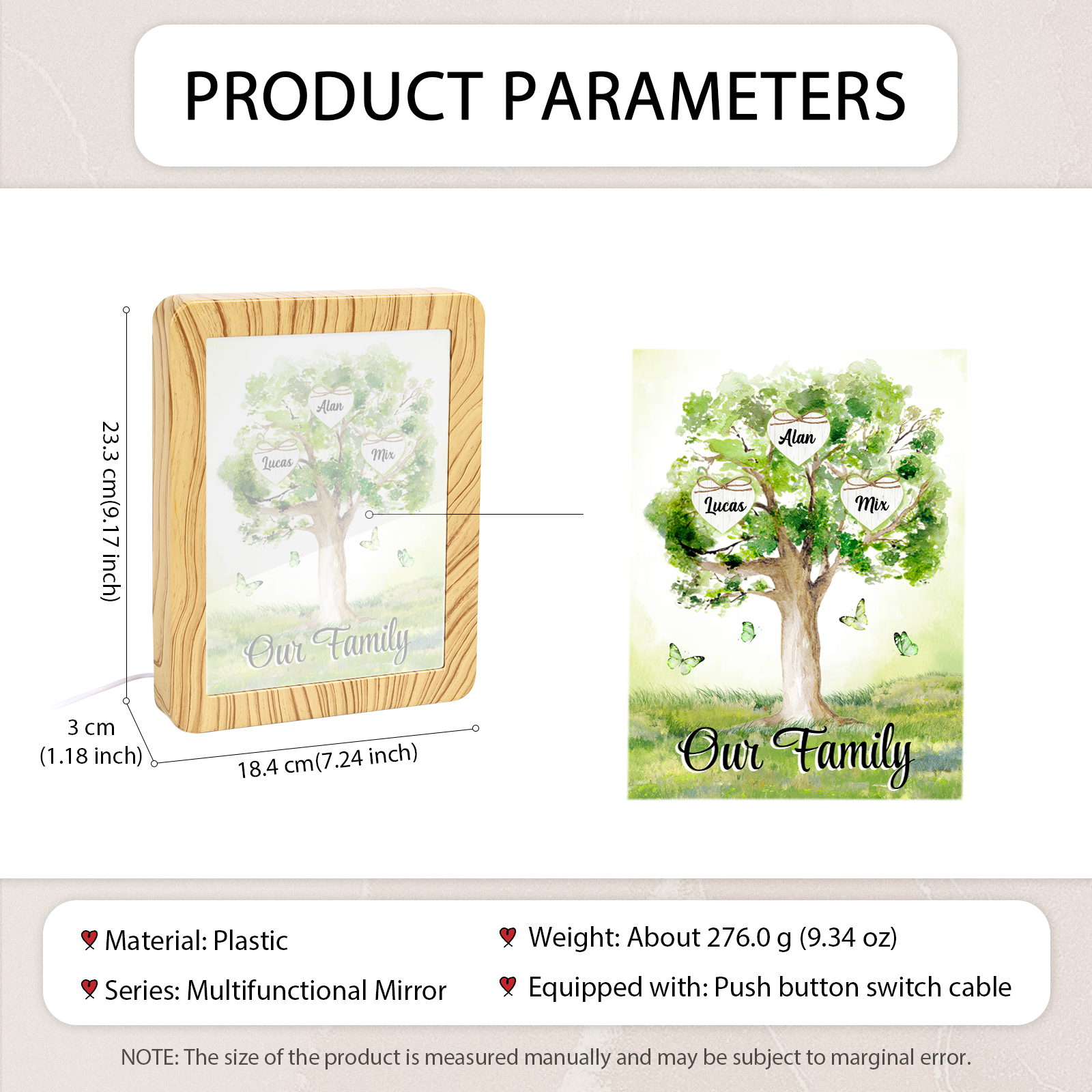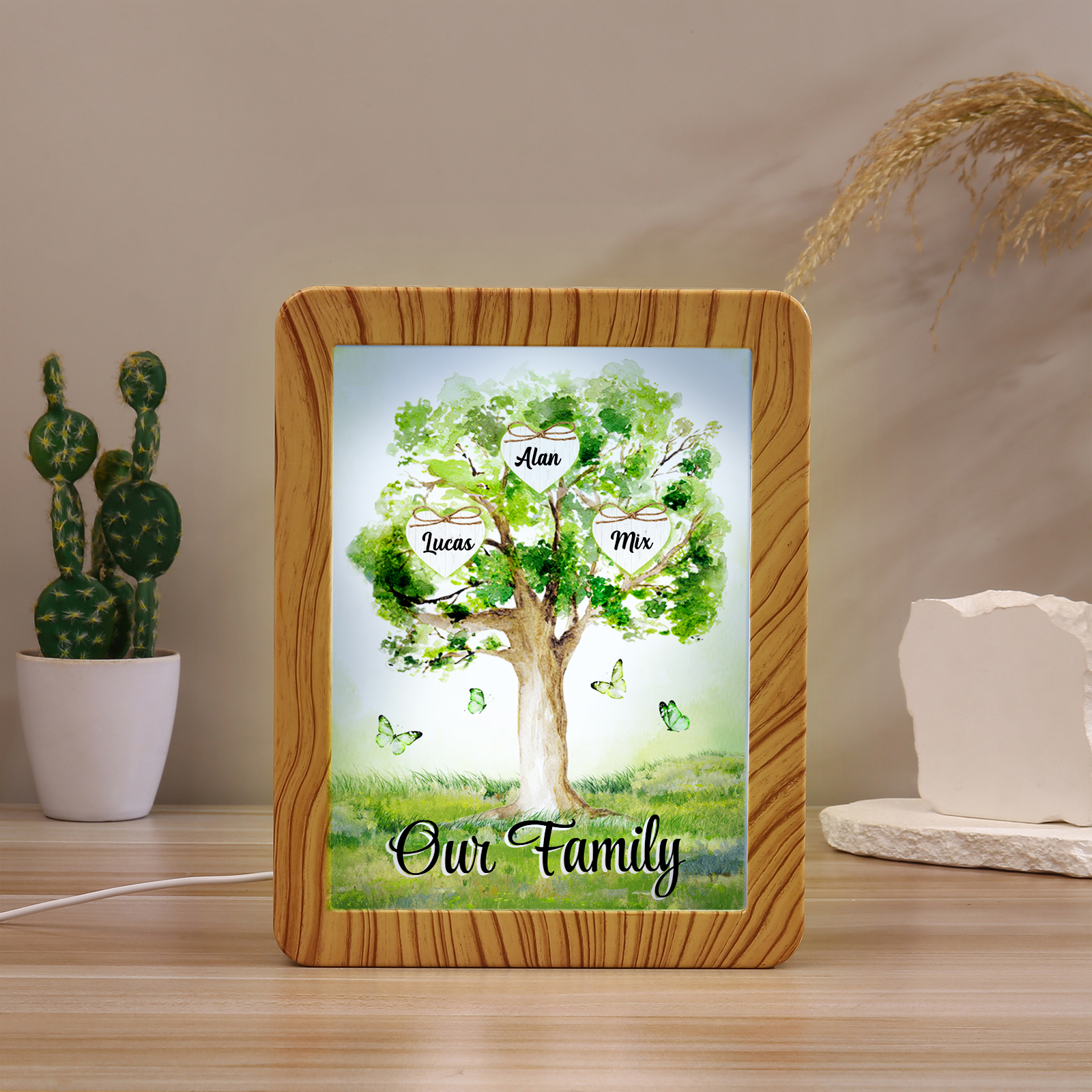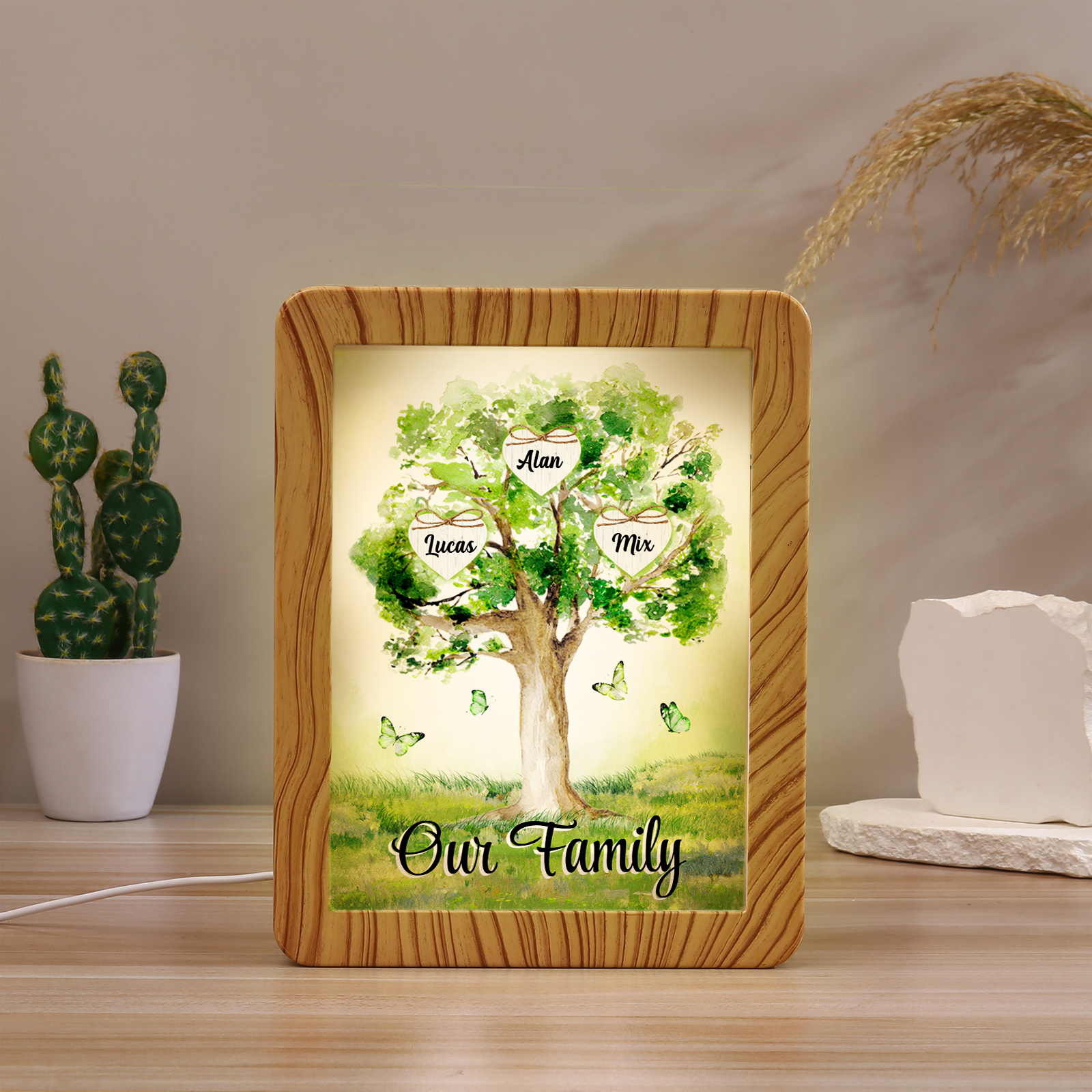 Cornice primavera albero verde di cuore con LED luce a tre colori 3 nomi e 1 testo personalizzati anche usato come specchio regalo per mamma/nonna
