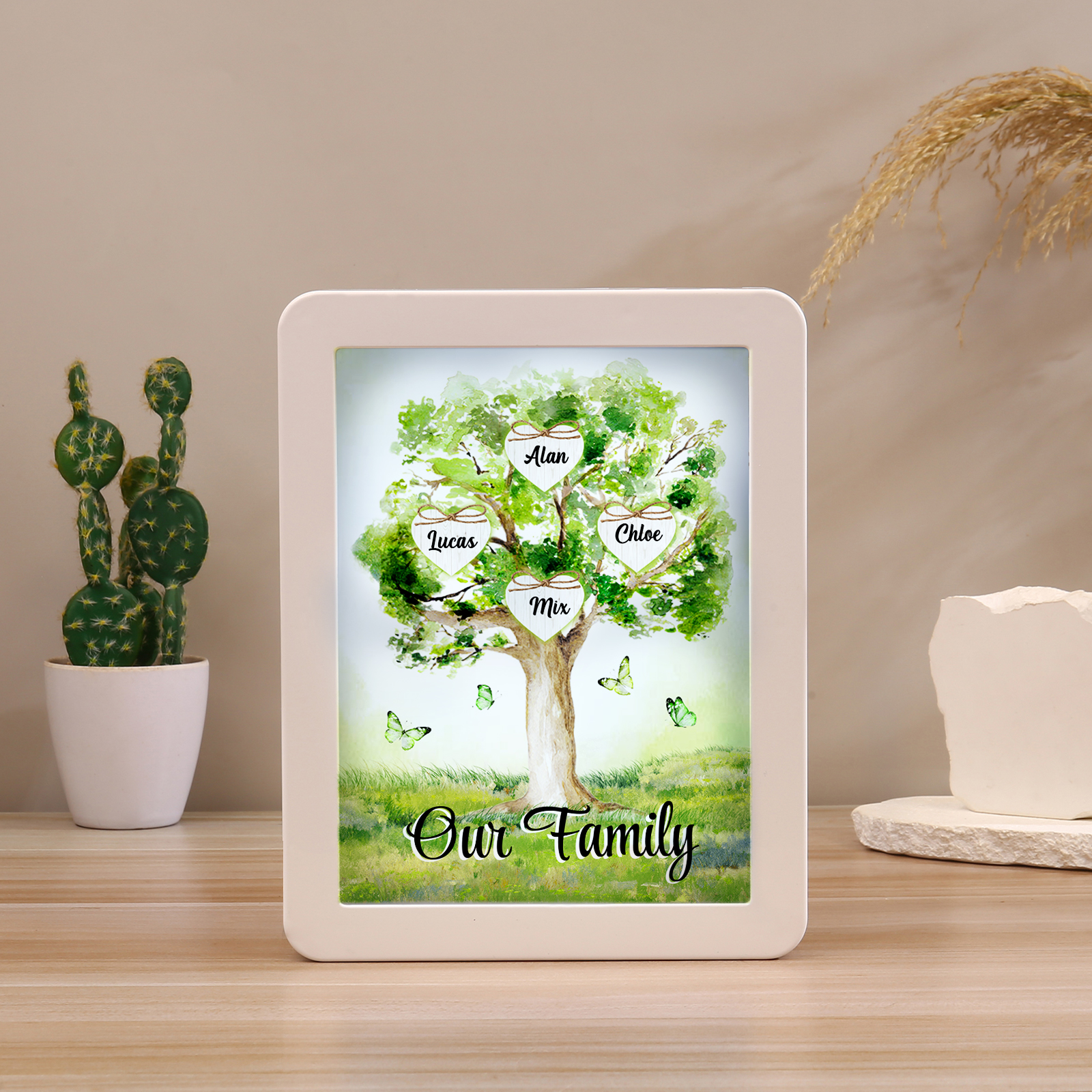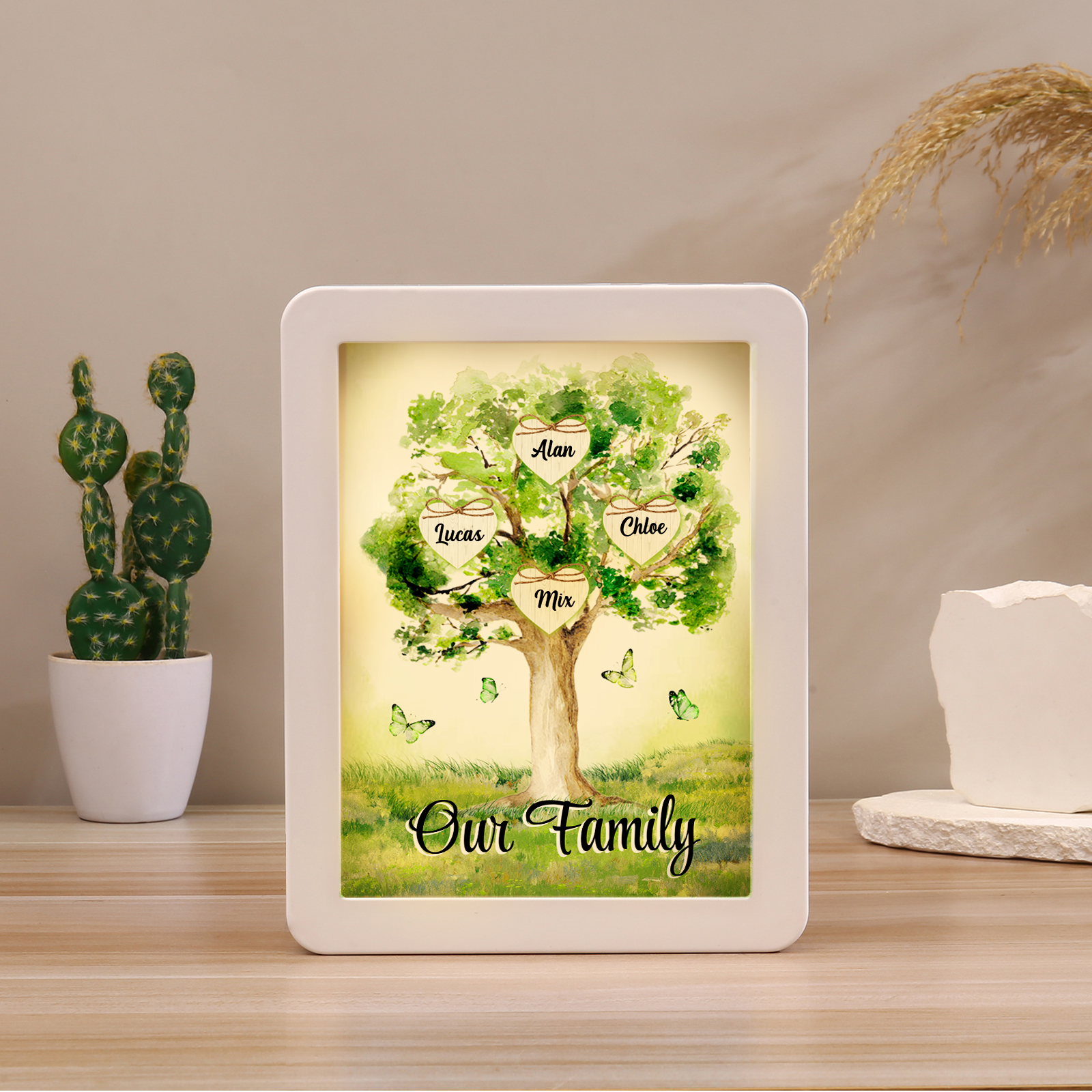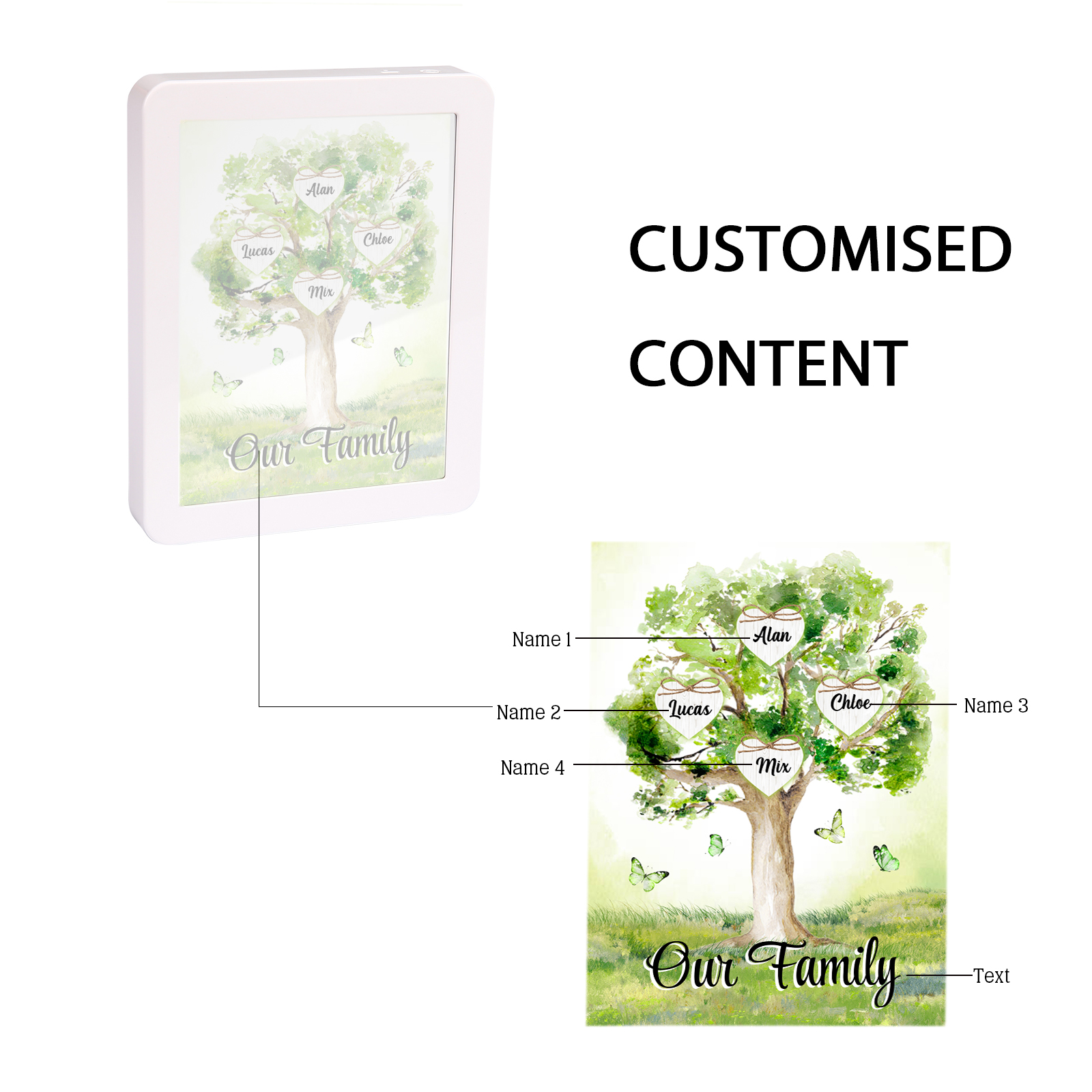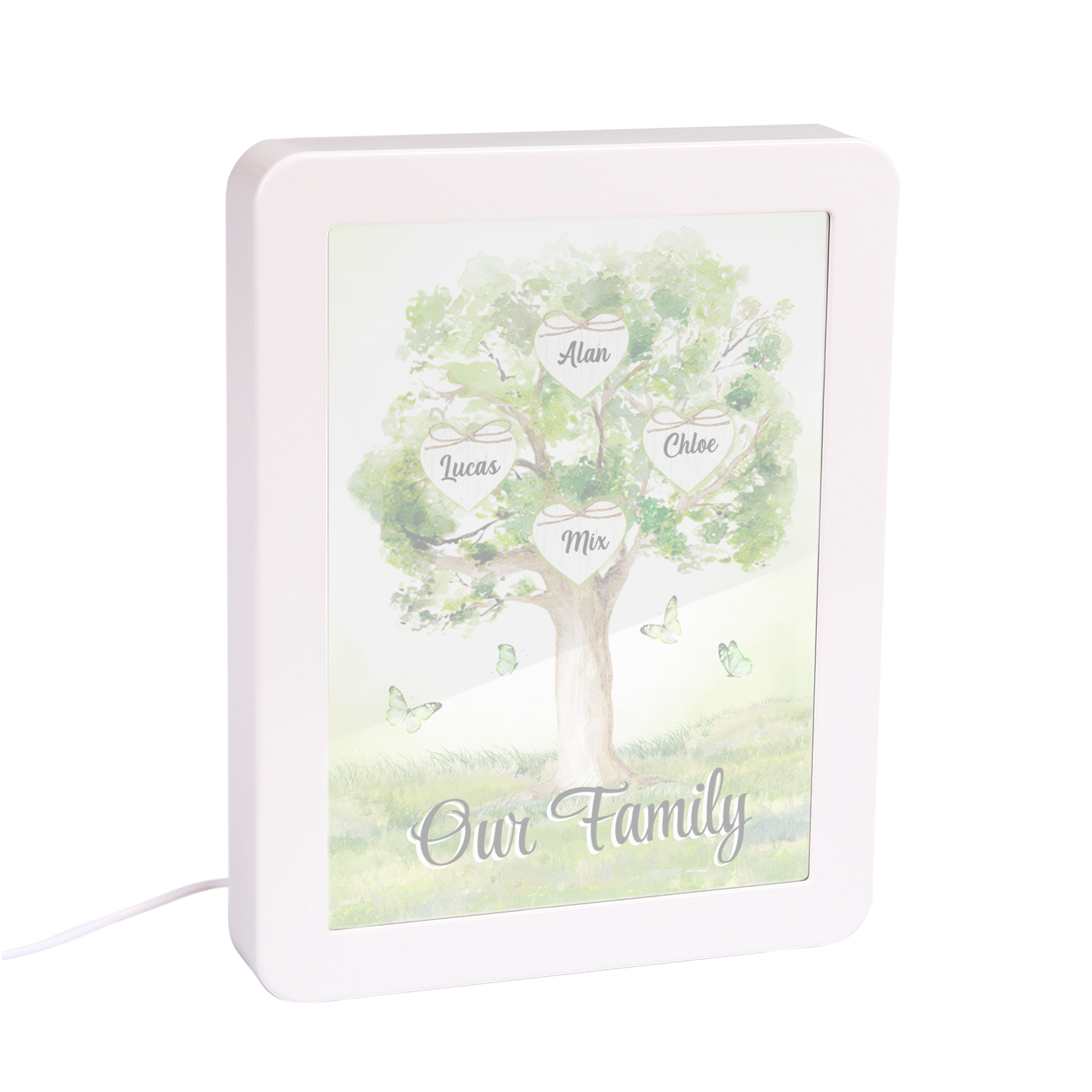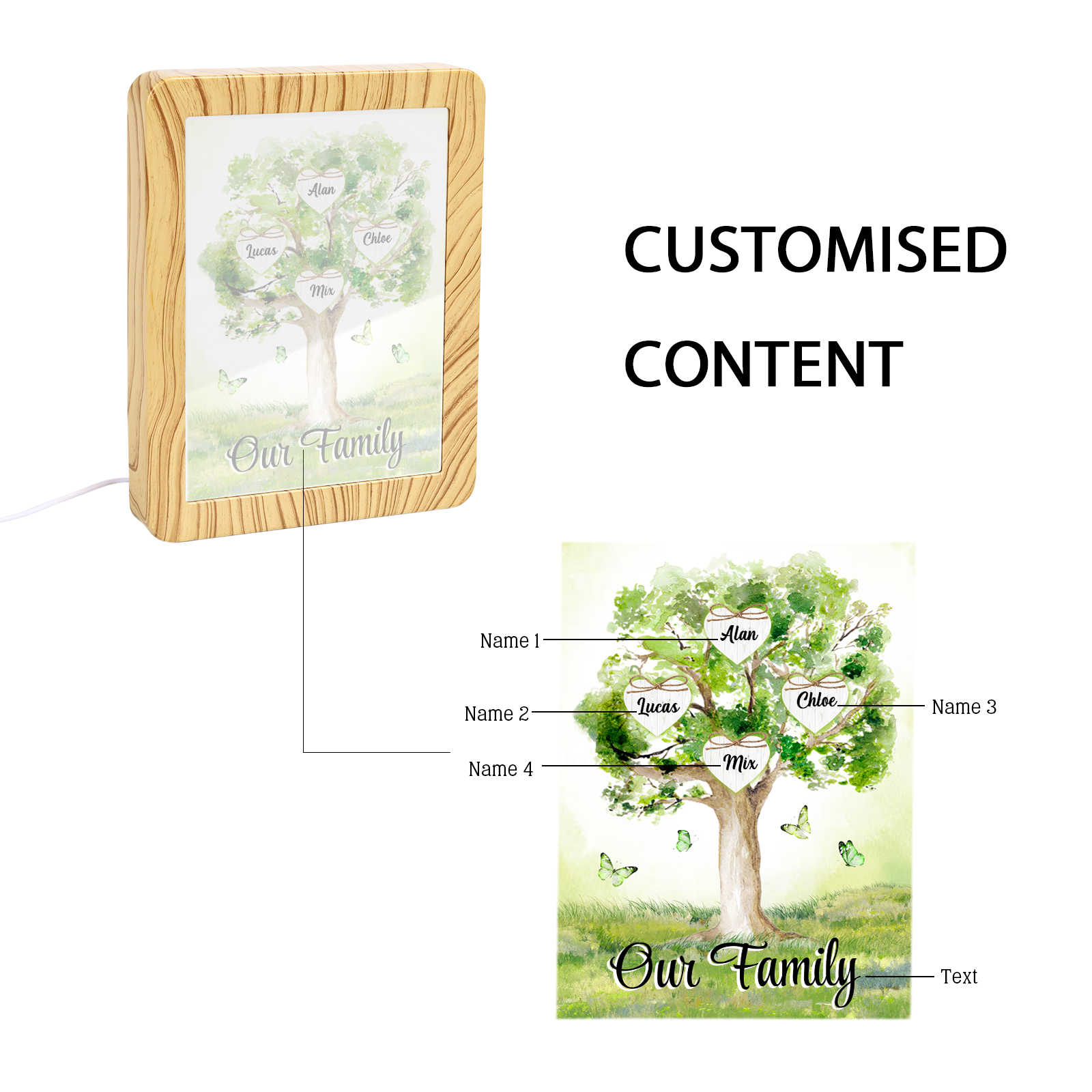 Cornice primavera albero verde di cuore con LED luce a tre colori 4 nomi e 1 testo personalizzati anche usato come specchio regalo per mamma/nonna