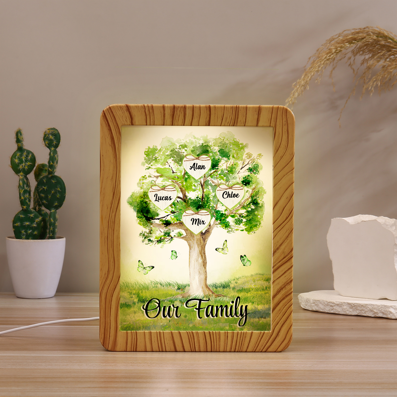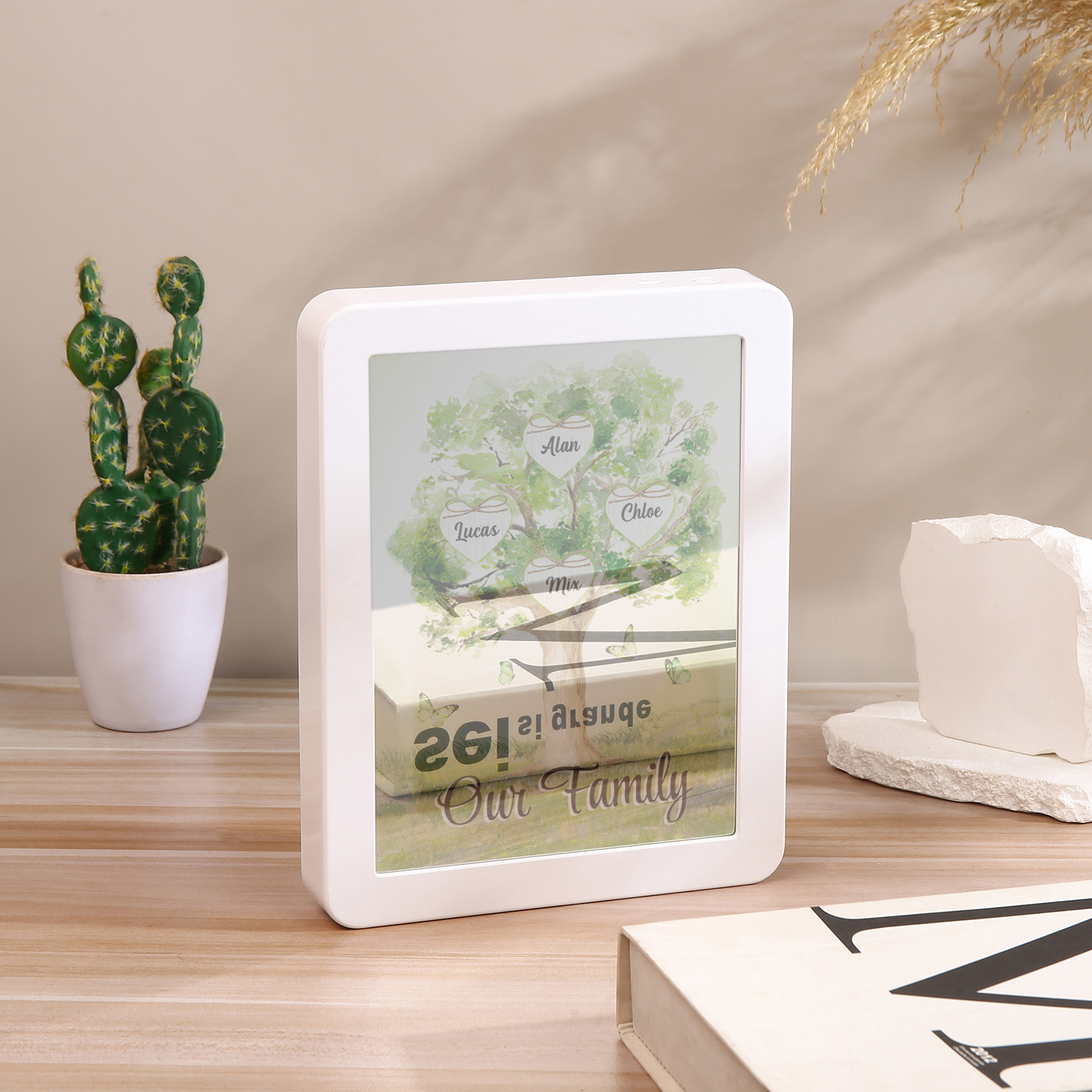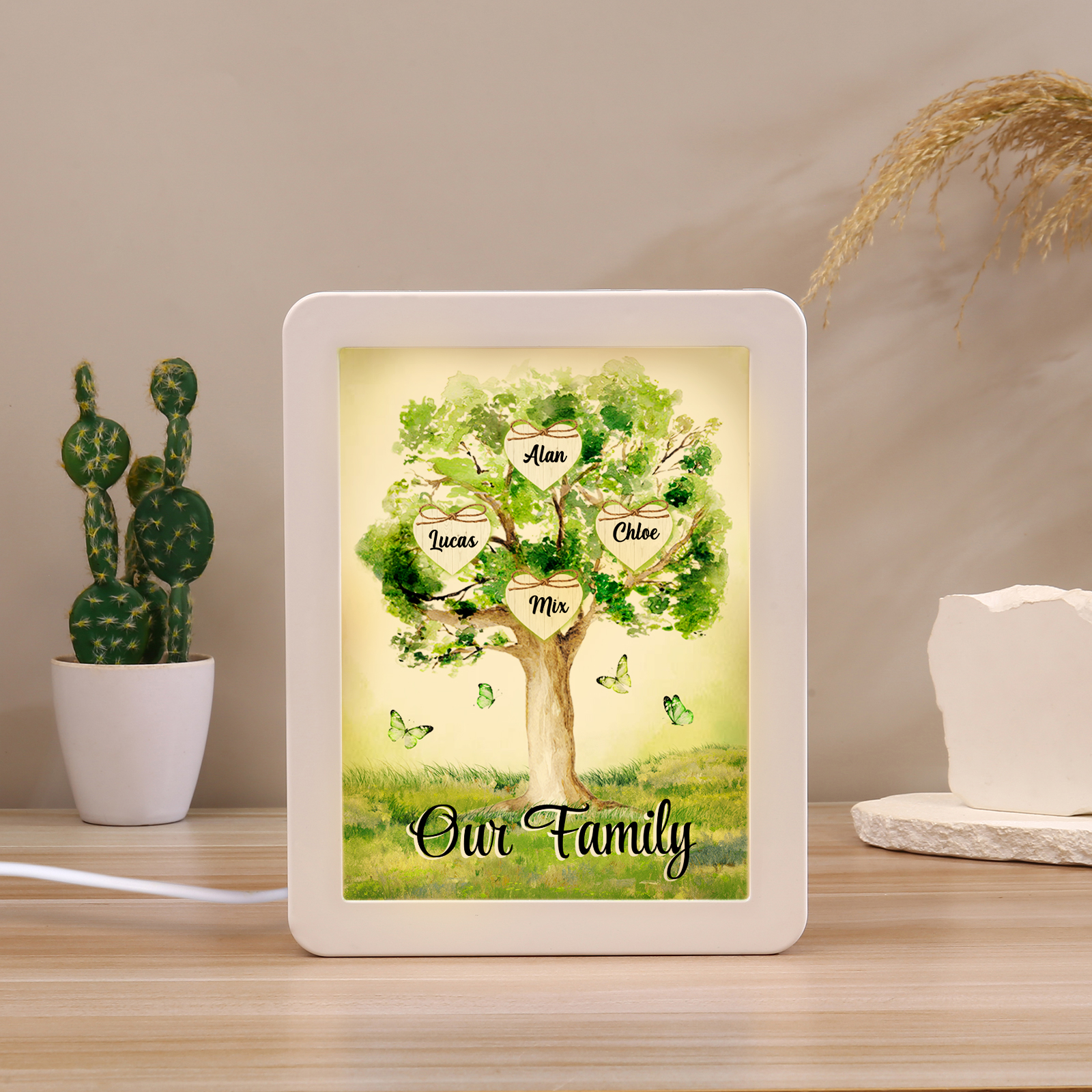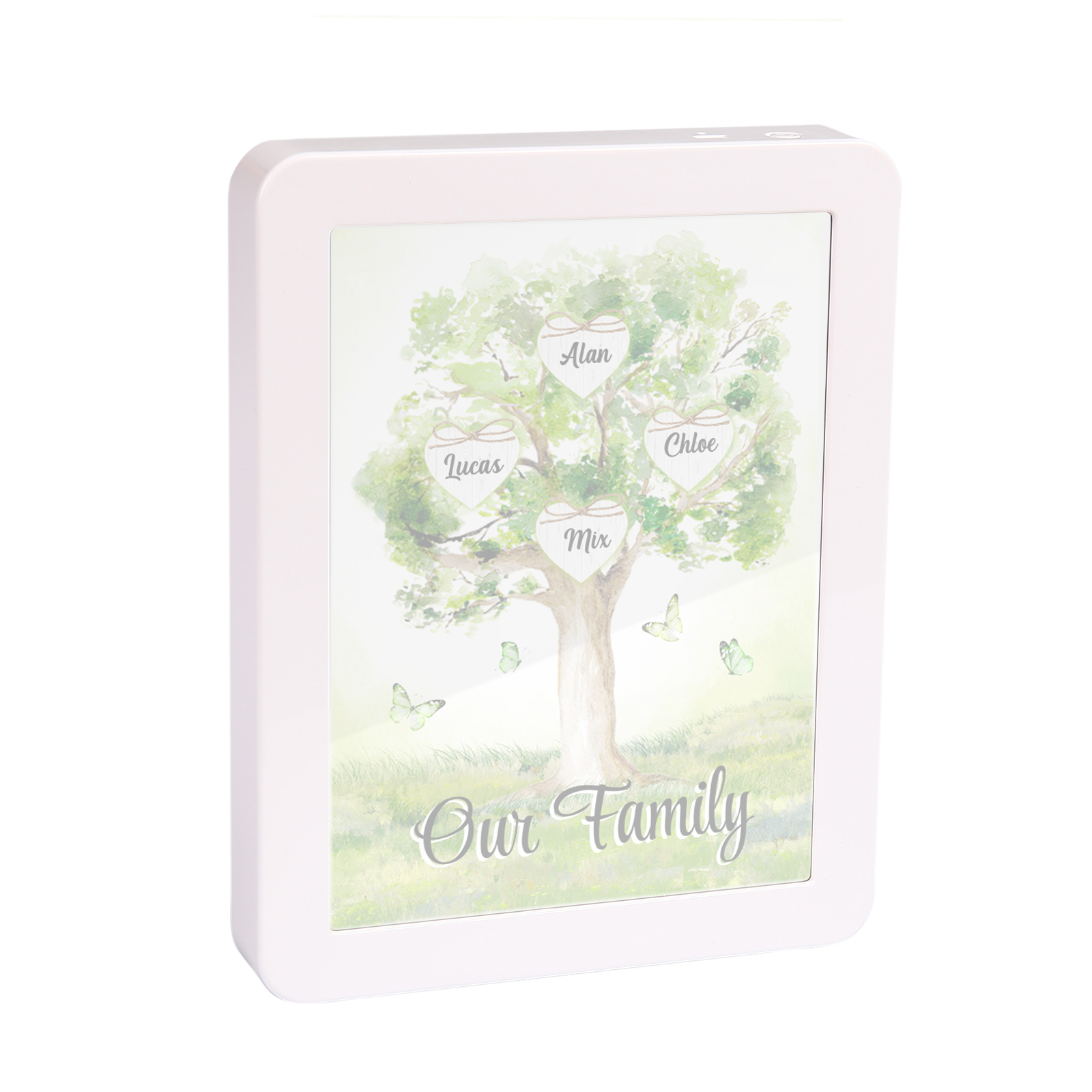 Cornice primavera albero verde di cuore con LED luce a tre colori 4 nomi e 1 testo personalizzati anche usato come specchio regalo per mamma/nonna