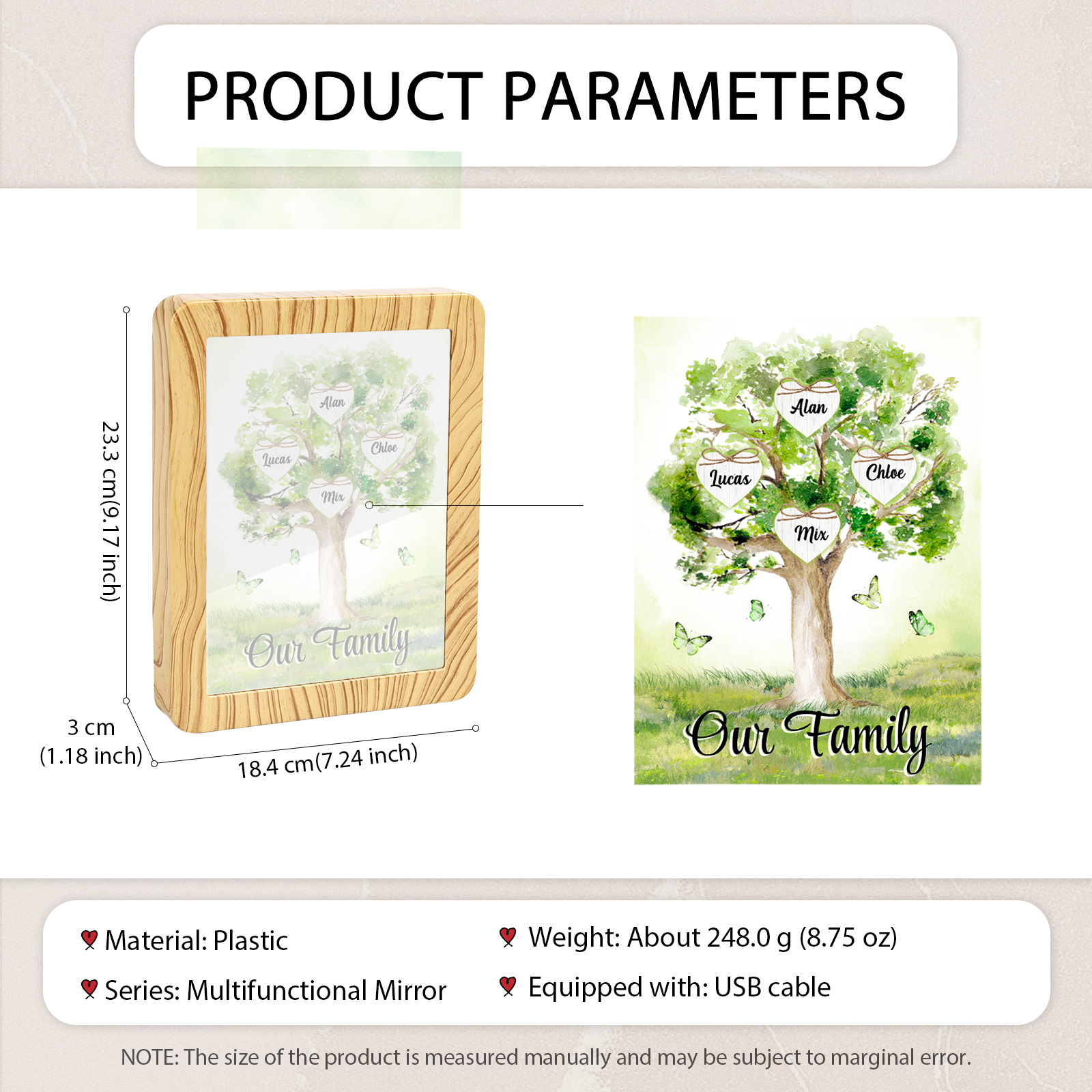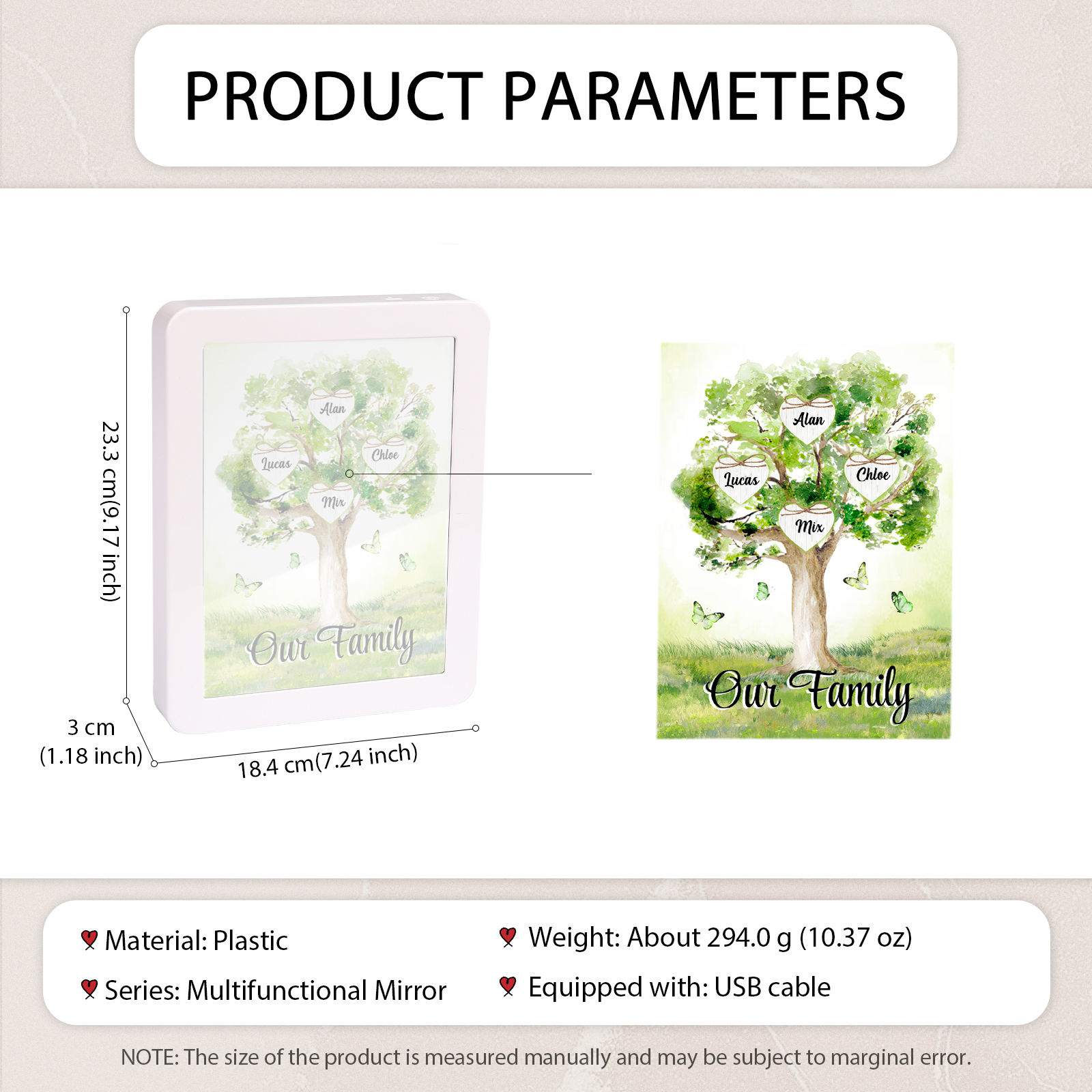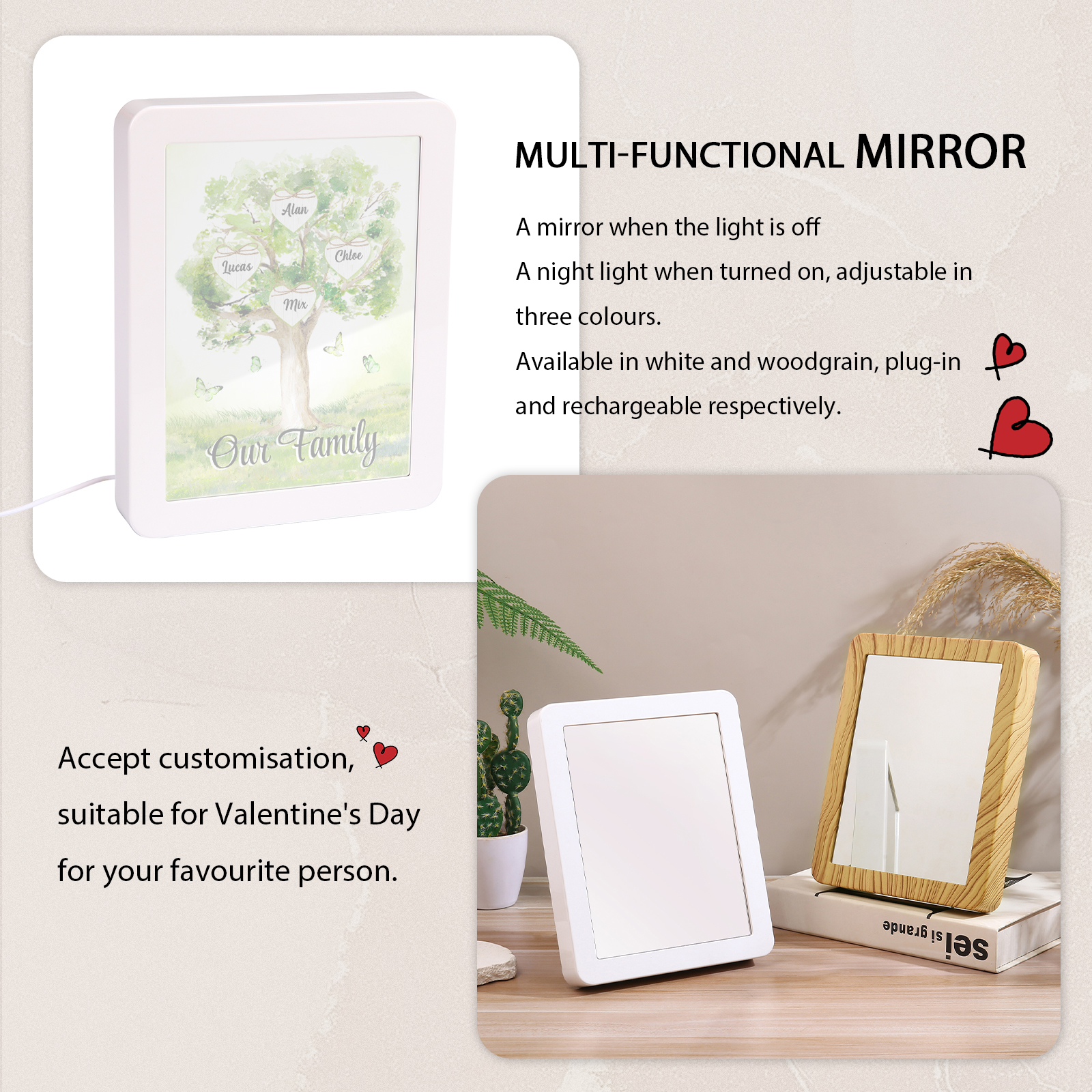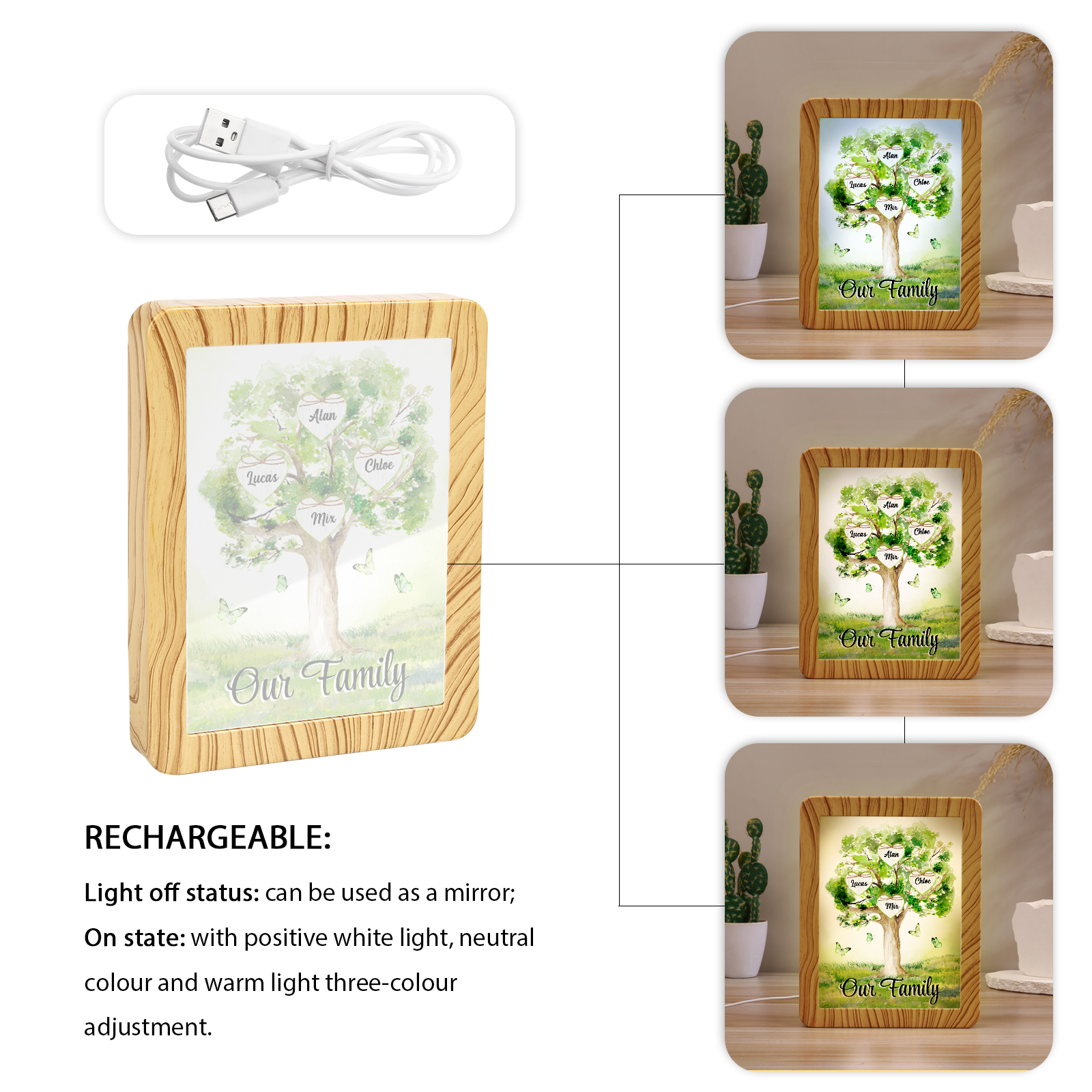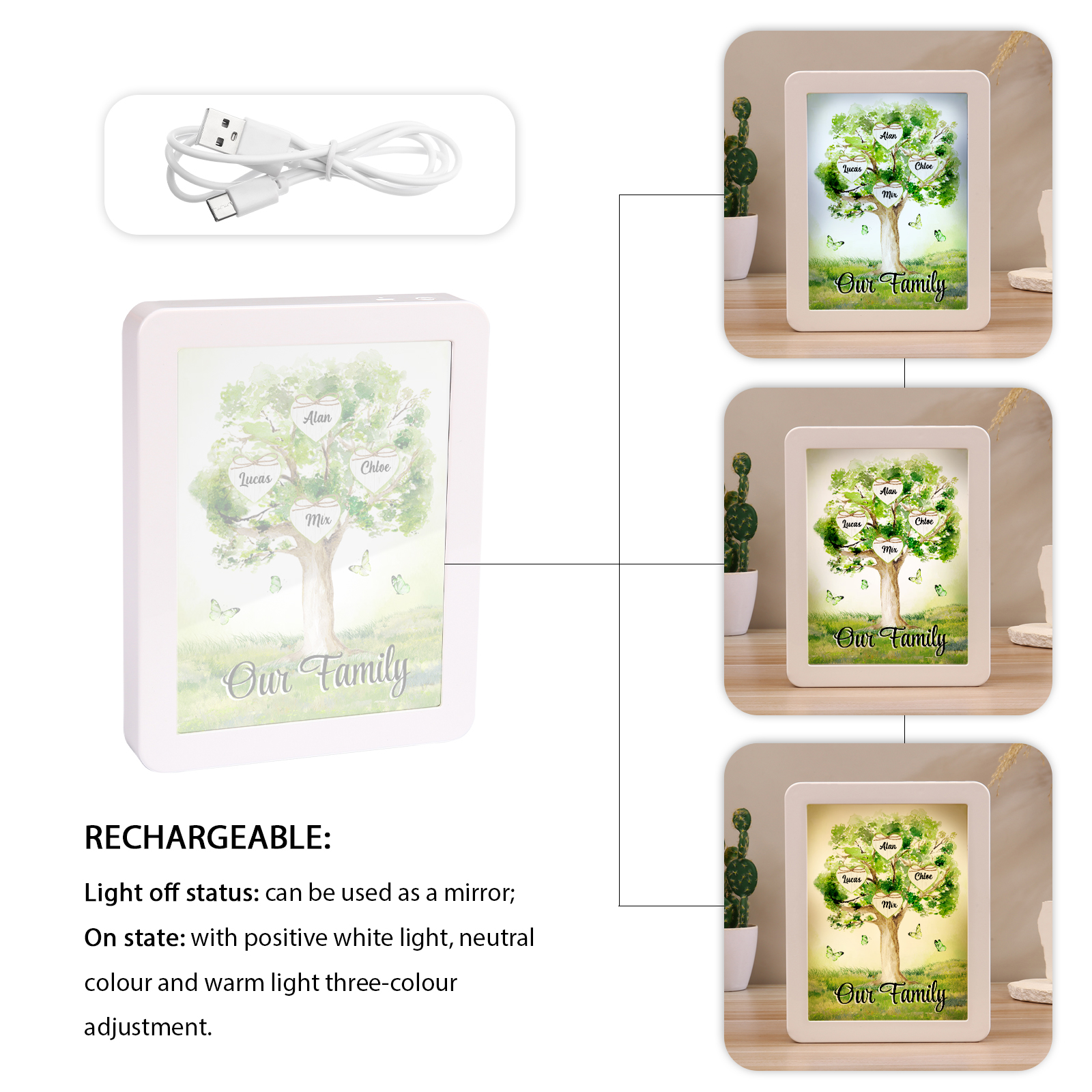 Cornice primavera albero verde di cuore con LED luce a tre colori 4 nomi e 1 testo personalizzati anche usato come specchio regalo per mamma/nonna