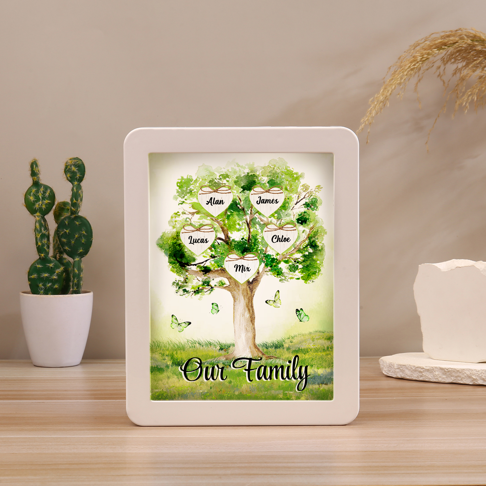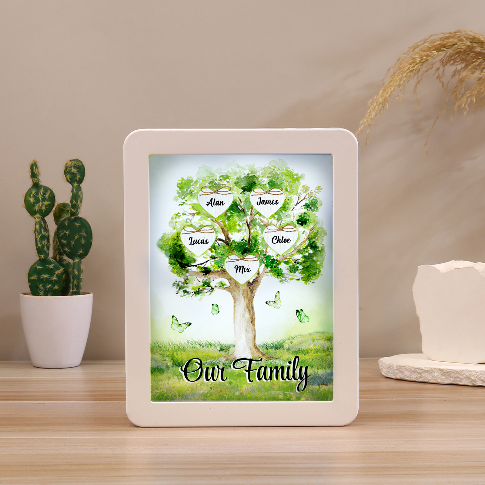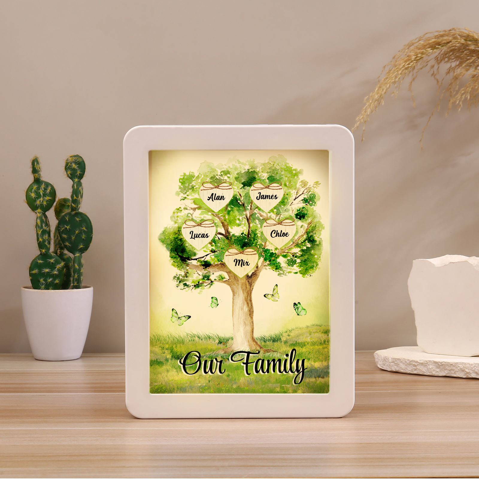 Cornice primavera albero verde di cuore con LED luce a tre colori 5 nomi e 1 testo personalizzati anche usato come specchio regalo per mamma/nonna
