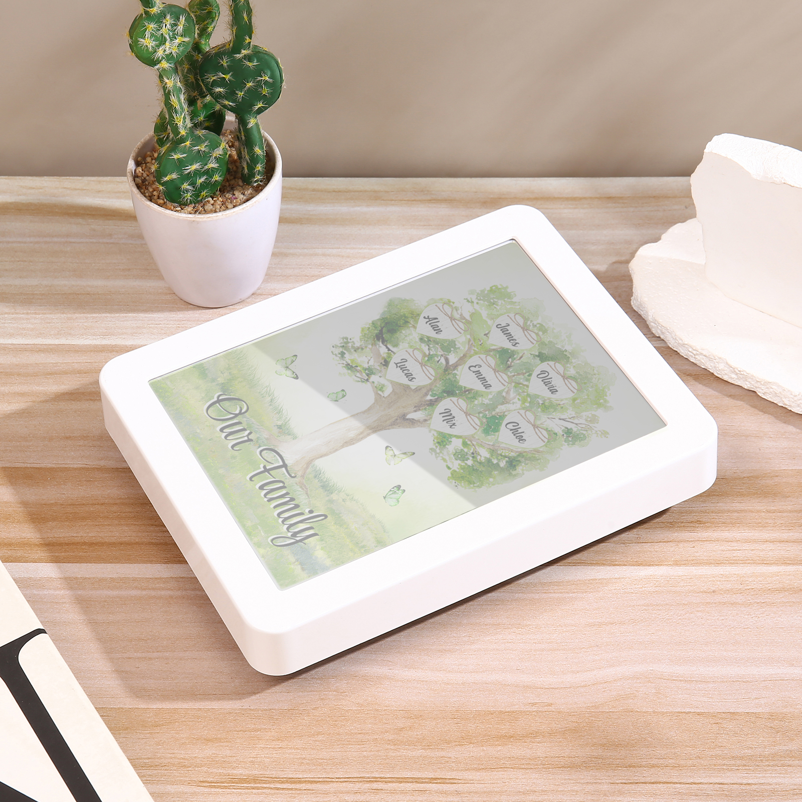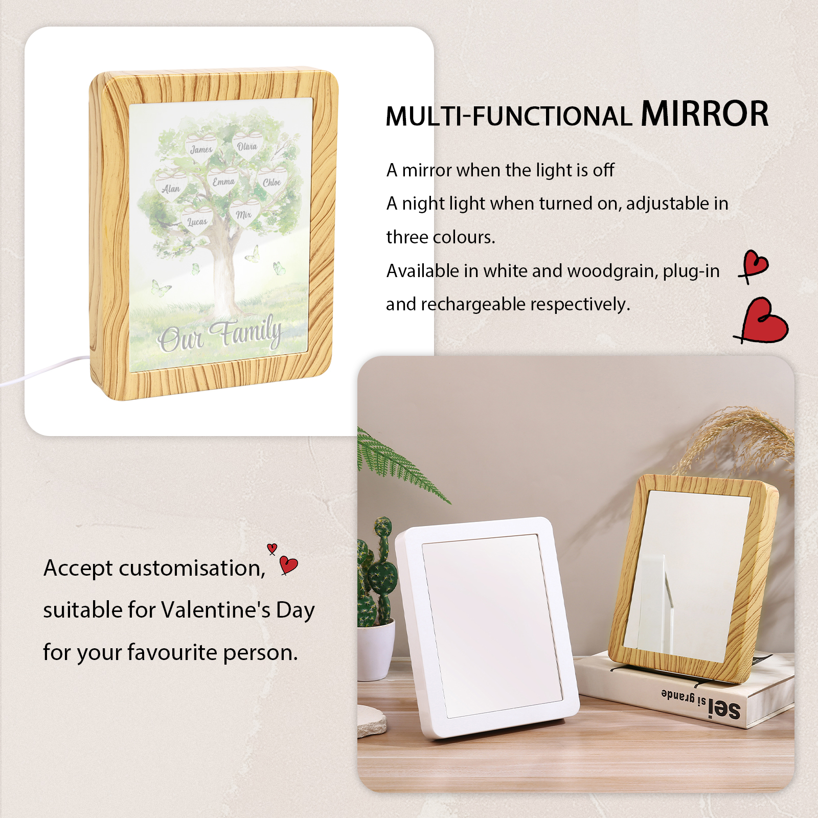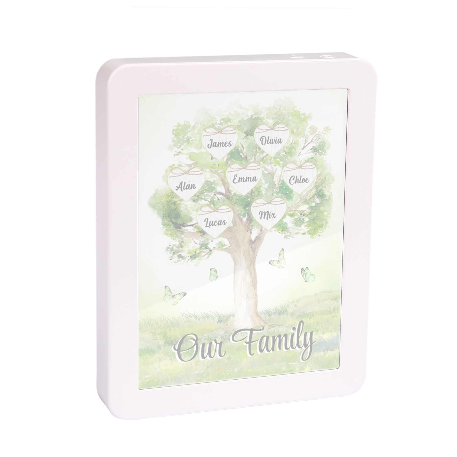 Cornice primavera albero verde di cuore con LED luce a tre colori 7 nomi e 1 testo personalizzati anche usato come specchio regalo per mamma/nonna