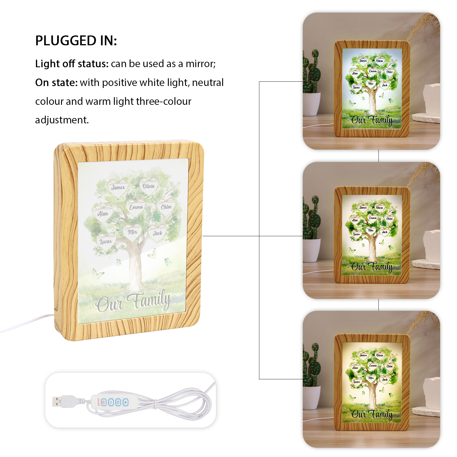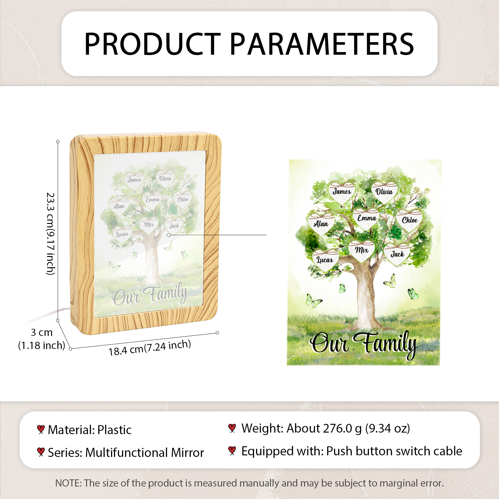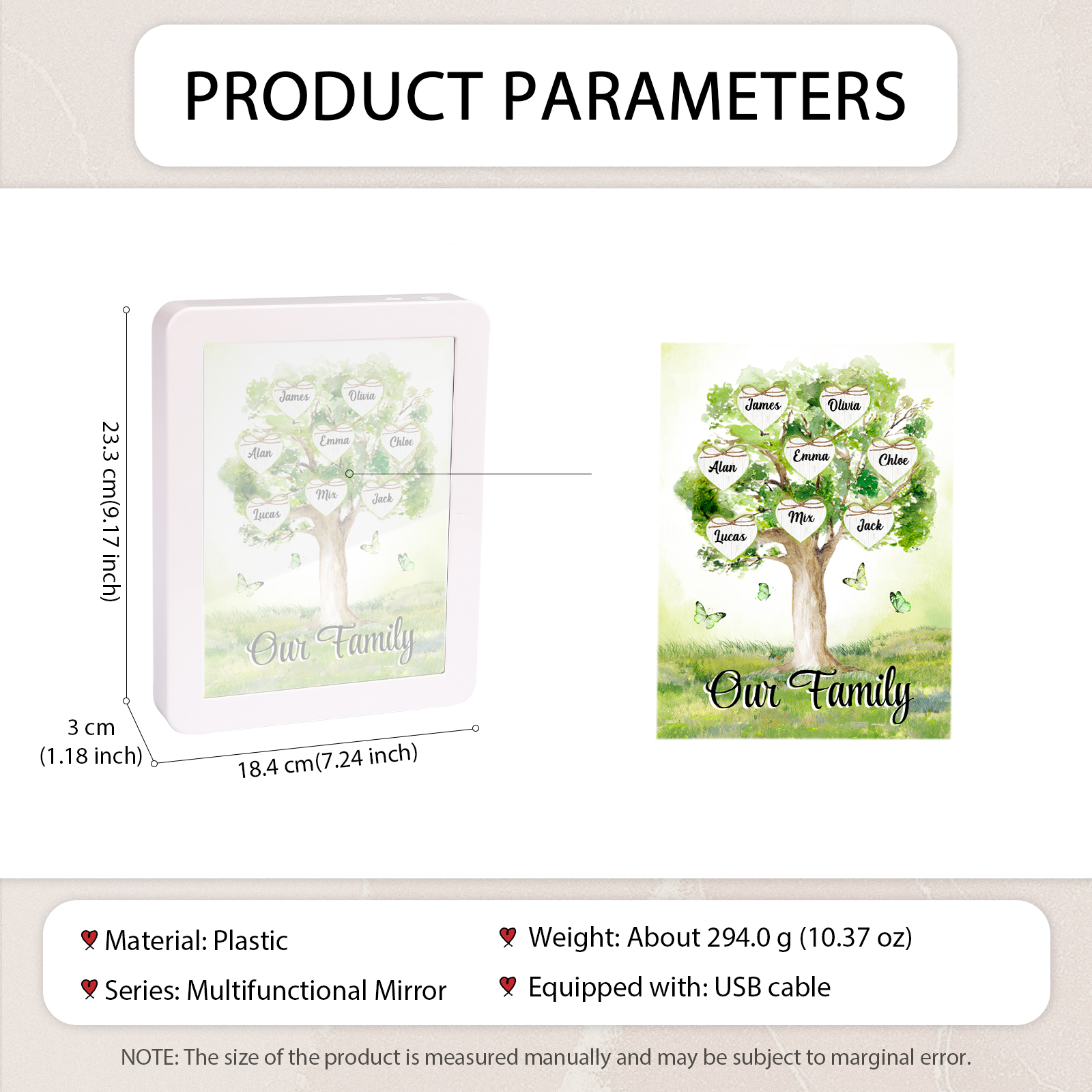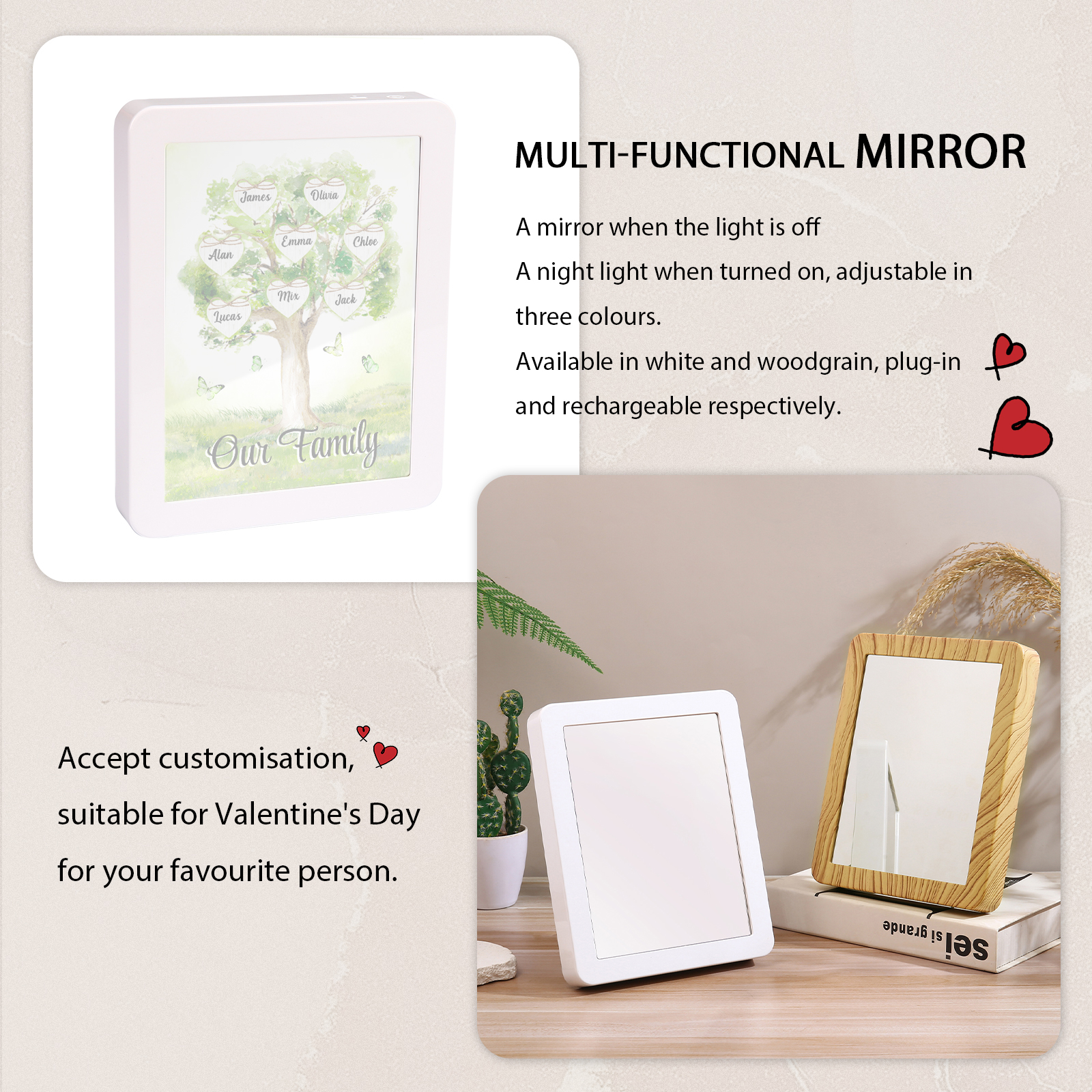 Cornice primavera albero verde di cuore con LED luce a tre colori 8 nomi e 1 testo personalizzati anche usato come specchio regalo per mamma/nonna