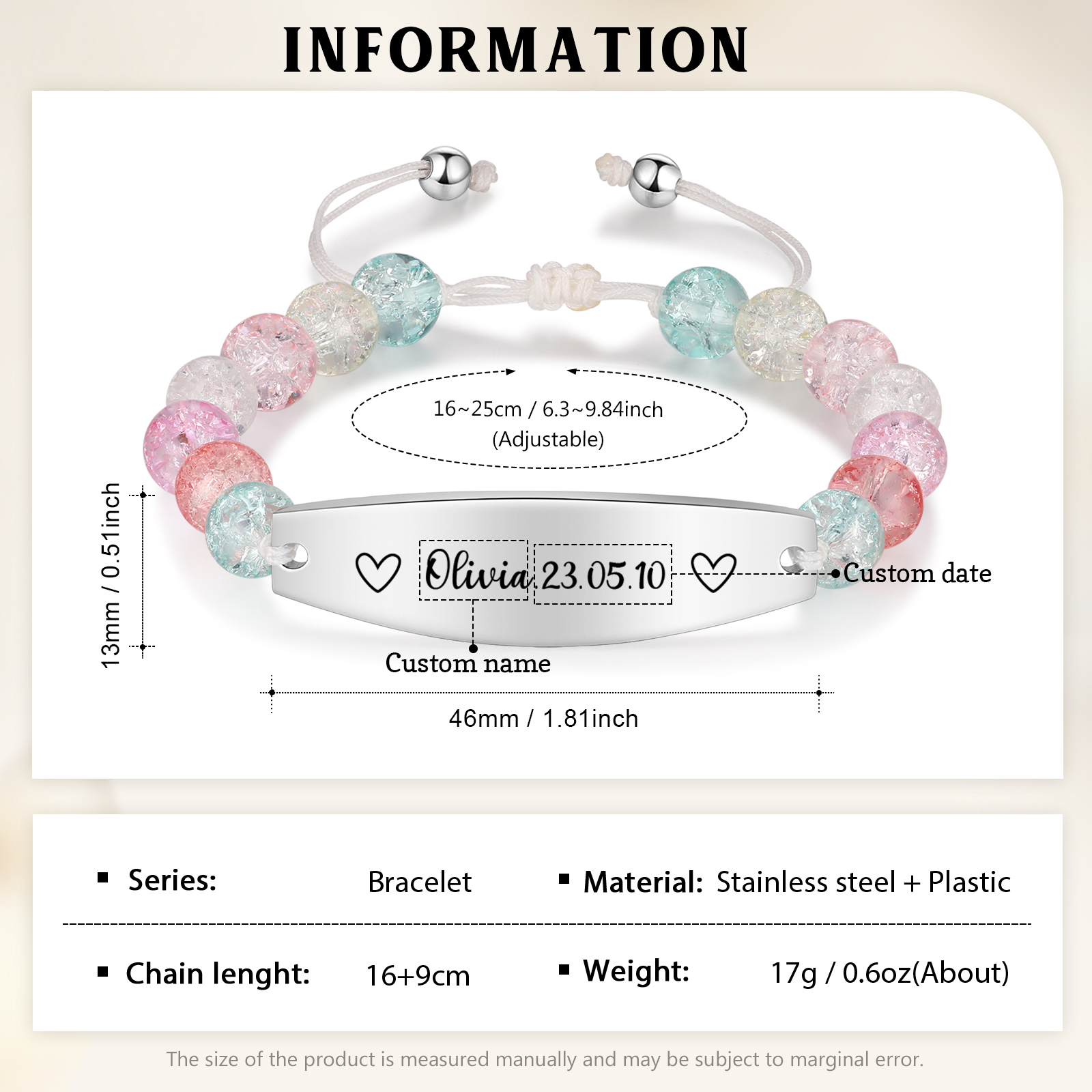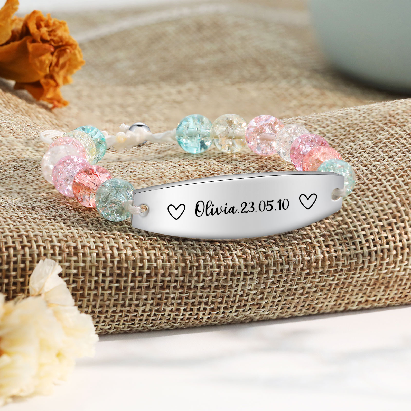 Cuore Braccialetto acciaio inox e plastica 1 nome e data personalizati per donna