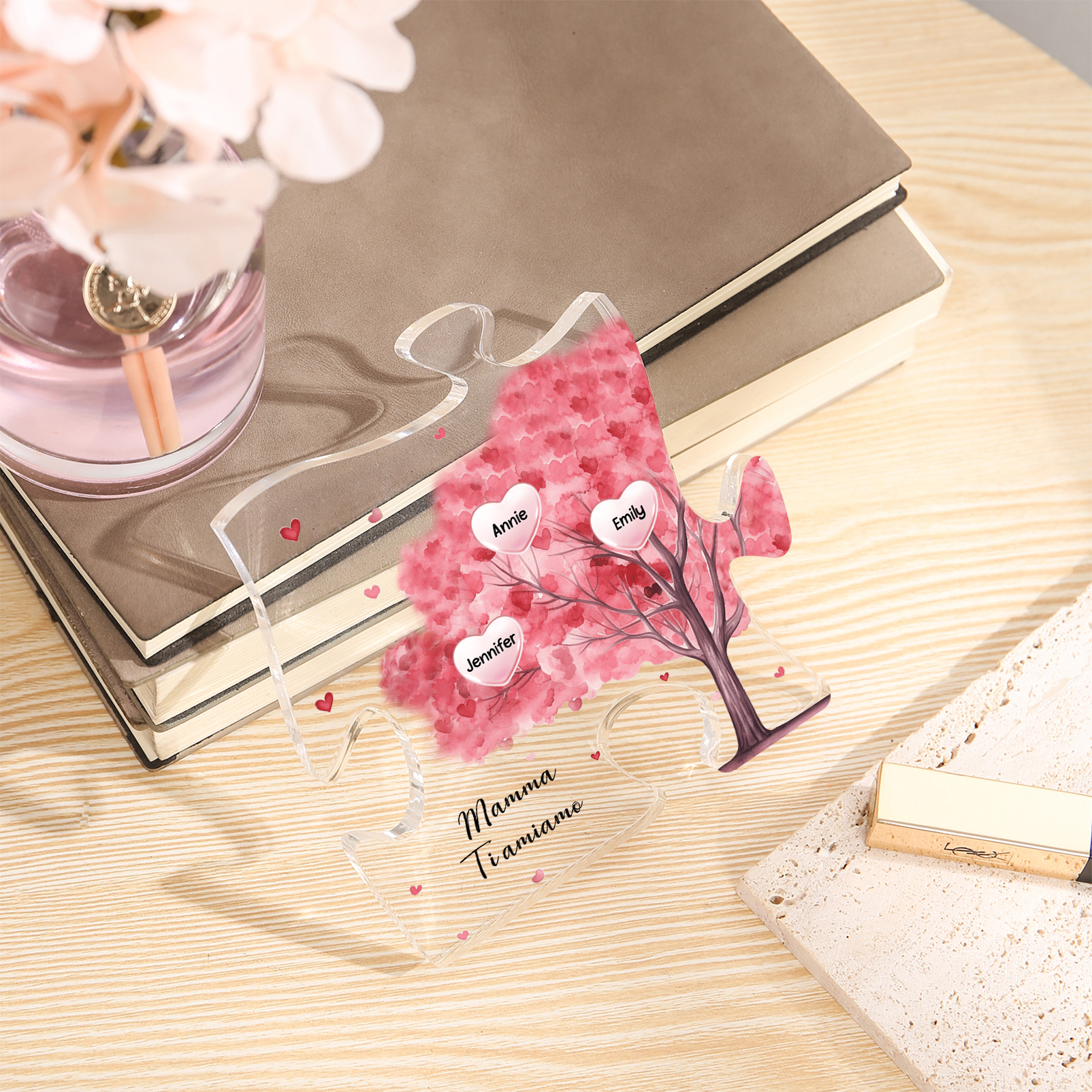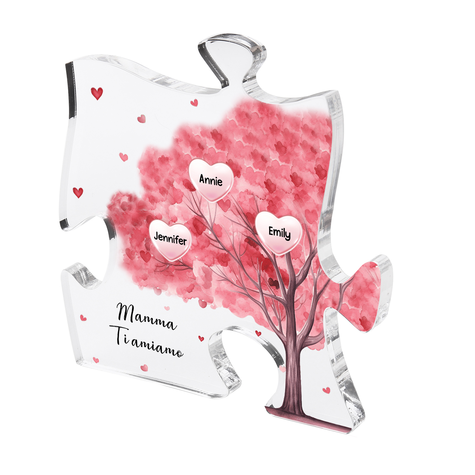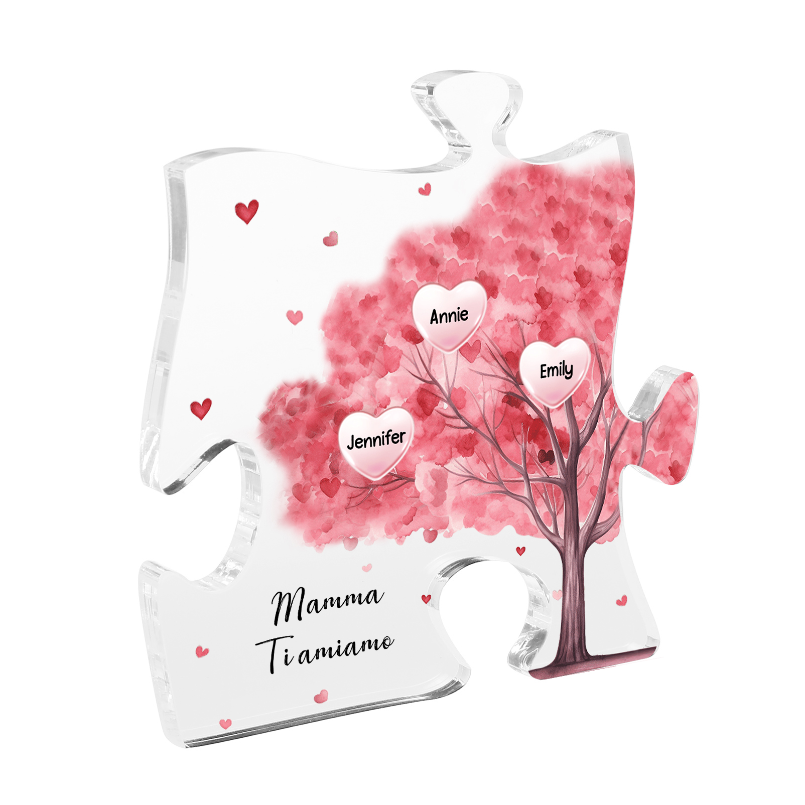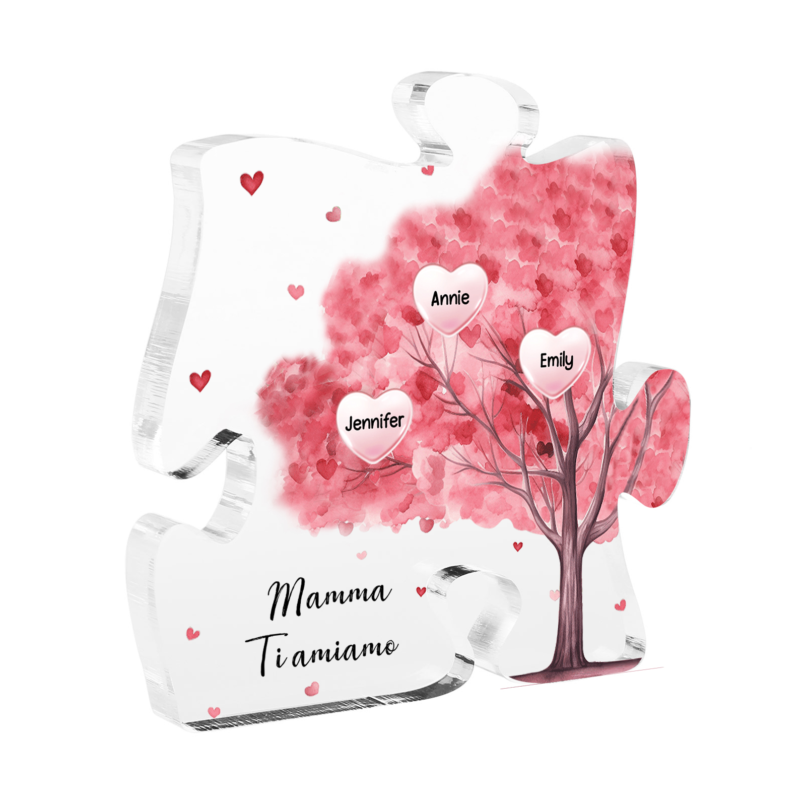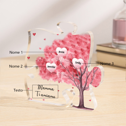 Decorazione acrilica a forma di puzzle con albero rosa e 3 nomi e 1 testo personalizzati per mamma/nonna
