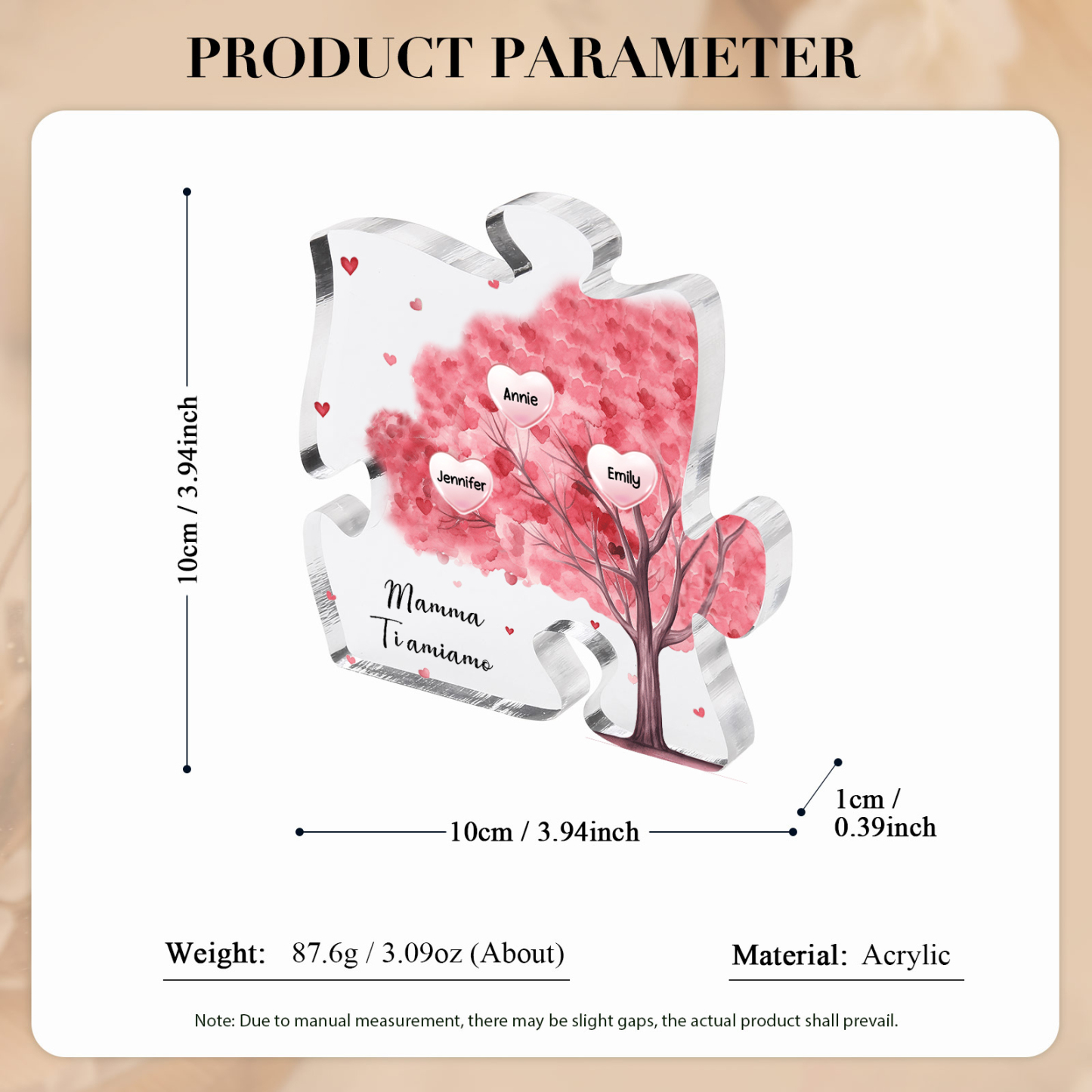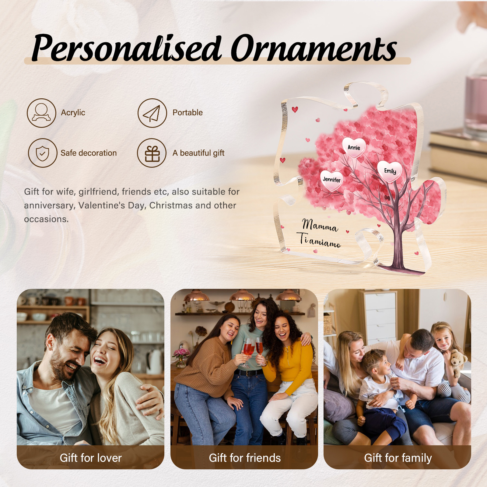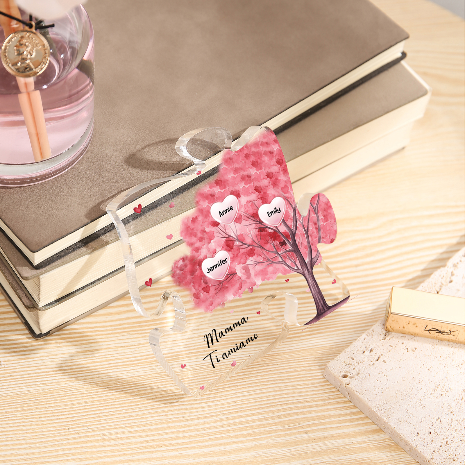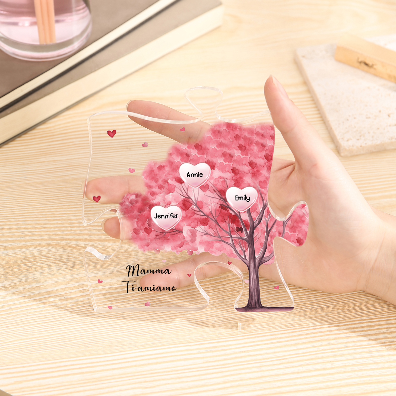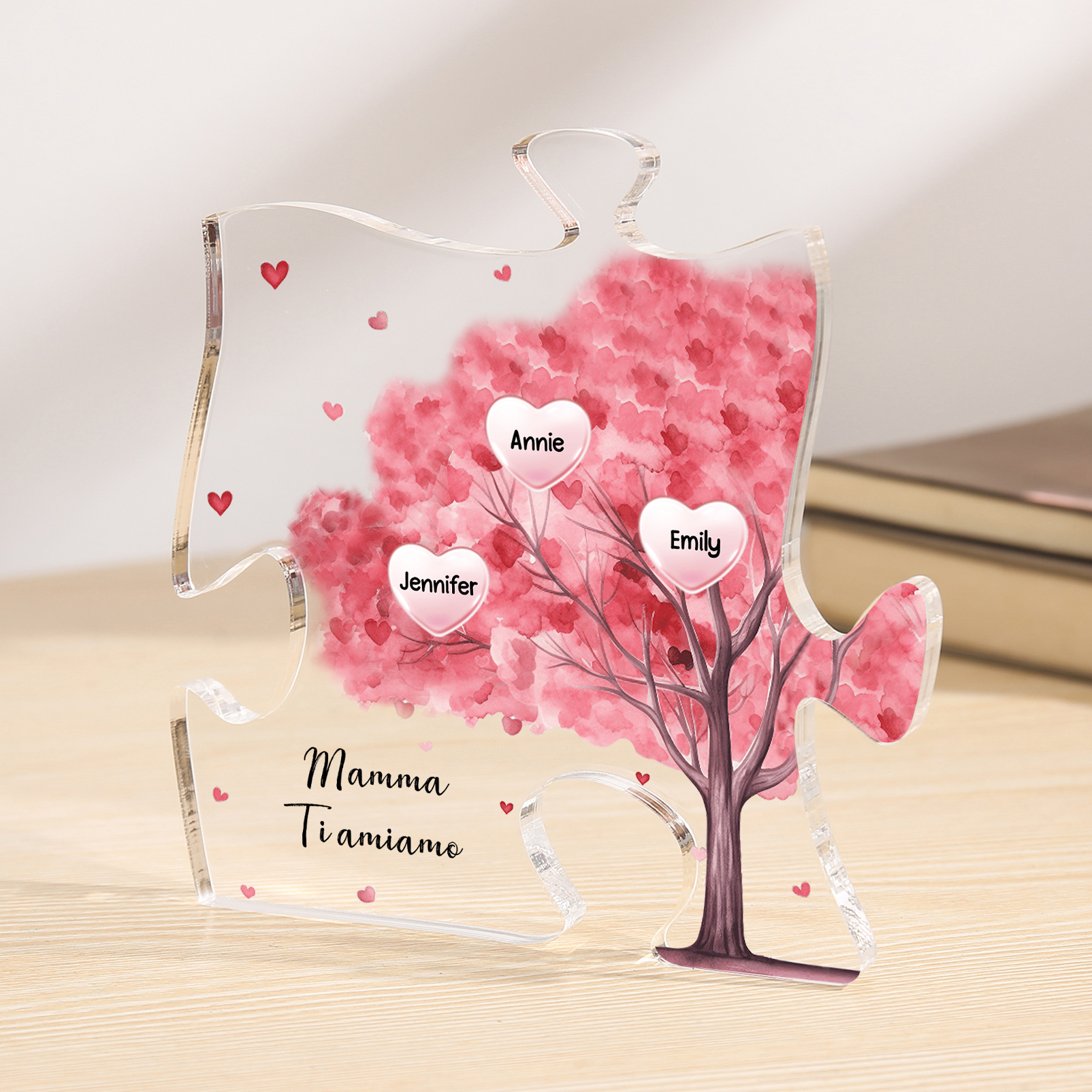 Decorazione acrilica a forma di puzzle con albero rosa e 3 nomi e 1 testo personalizzati per mamma/nonna