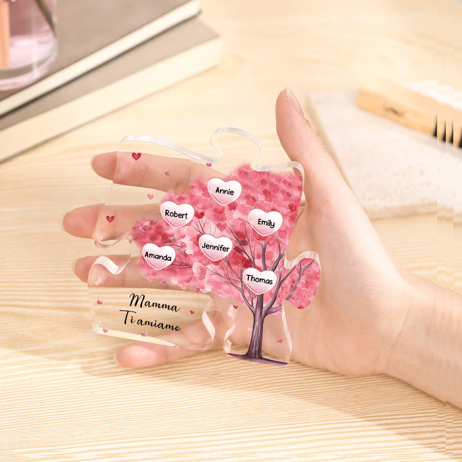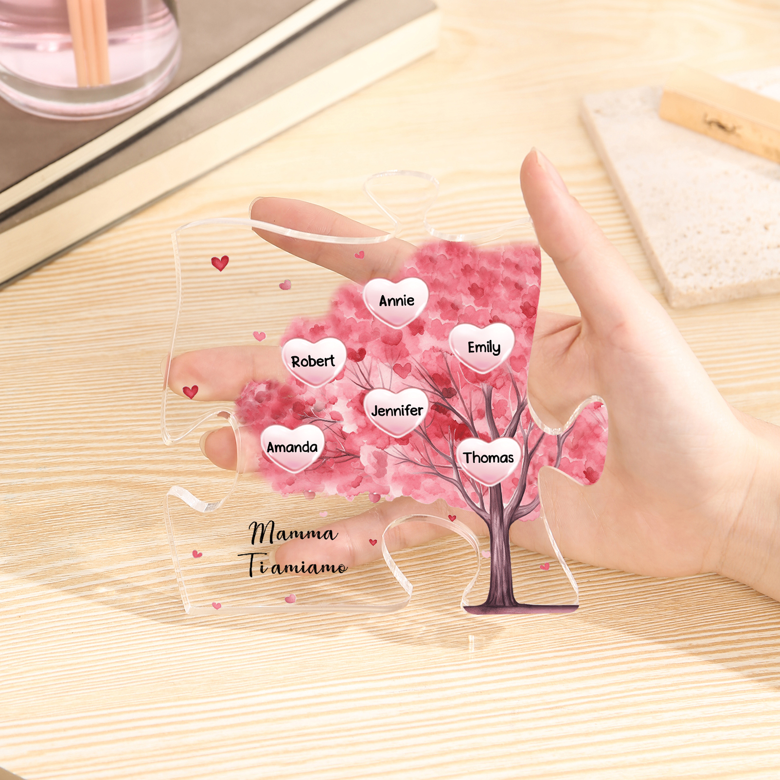 Decorazione acrilica a forma di puzzle con albero rosa e 6 nomi e 1 testo personalizzati per mamma/nonna